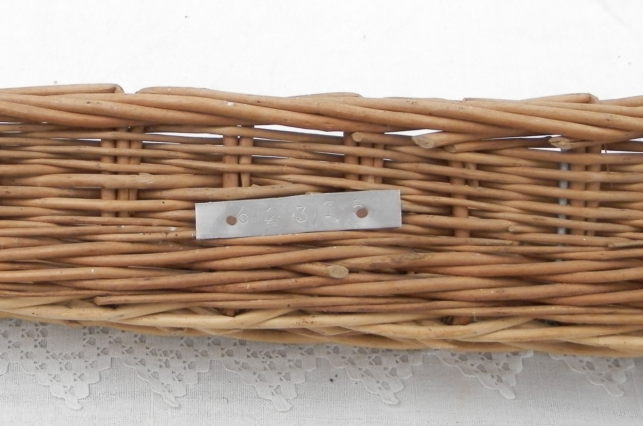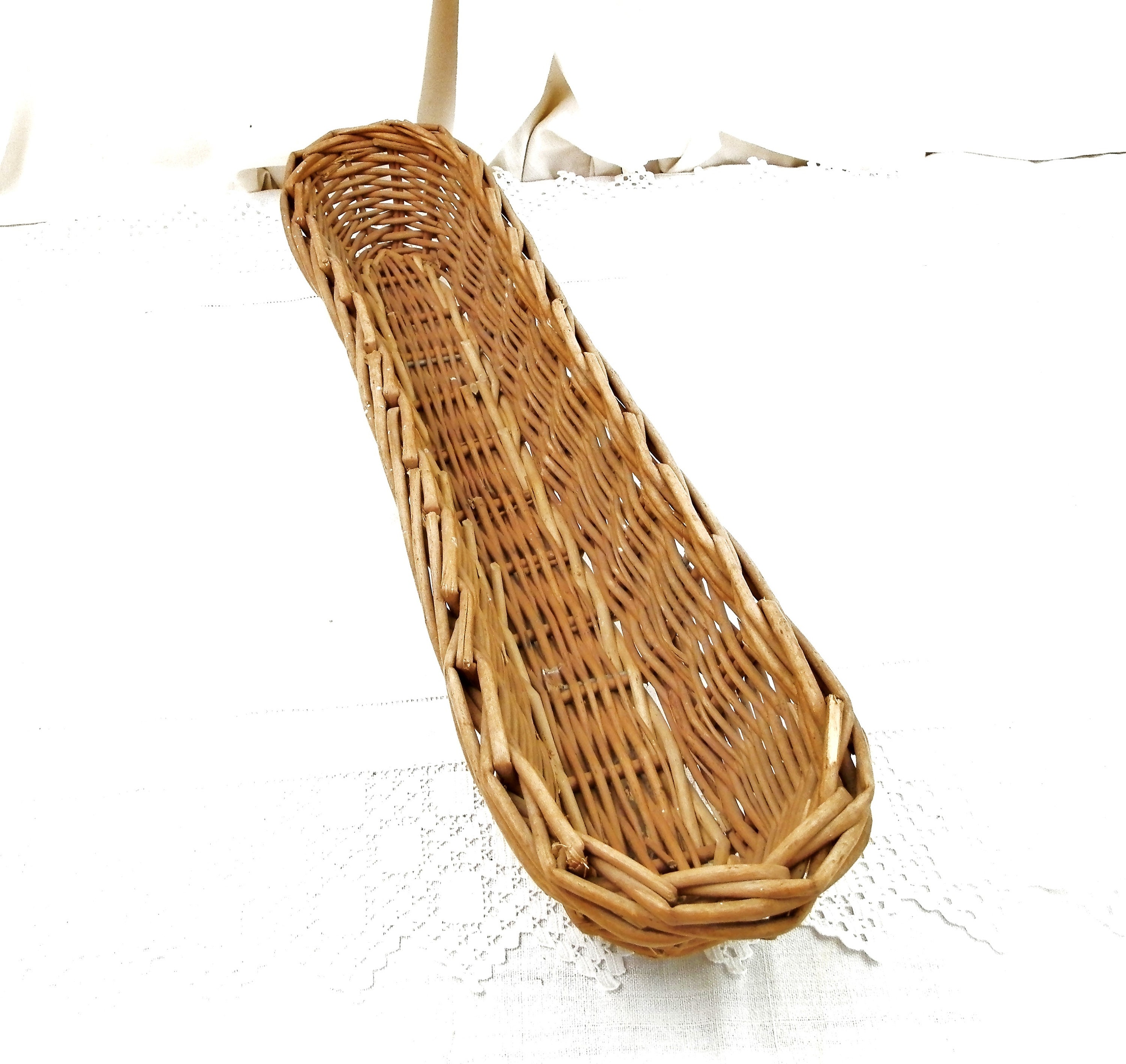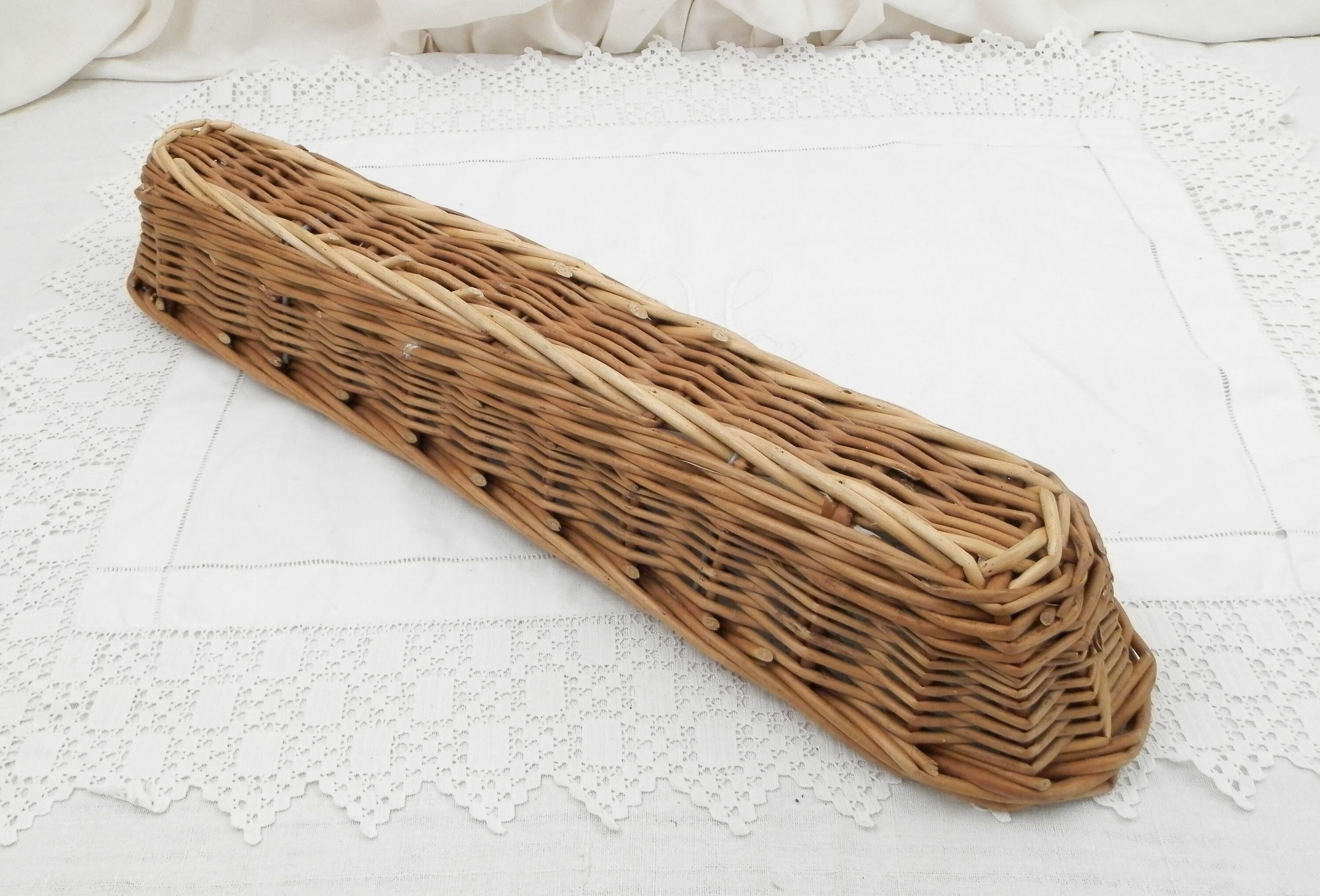 Vintage French woven wicker bread basket. These baskets are used by the boulangerie for the dough to rise and take the shape of a baguette, normally they have a fabric lining, which has been removed. Still with original metal plaque. Great to use as a bread serving basket or just decoratively.