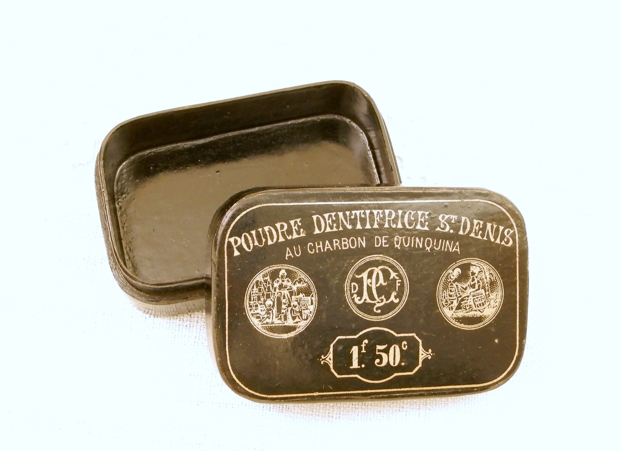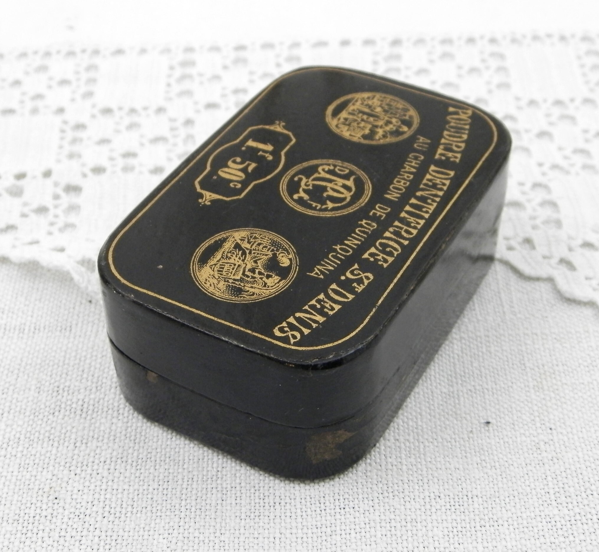 Small antique French black lacquer box made "carton boulli" with gold graphics, once contained toothpaste. Poudre dentifrice St Denis au charbon de quinquina = toothpaste powder from the town of St Denis ( in the suburbs of Paris) made from the charcoal of quinquina. A very rare find in this condition. Circa 1860s
