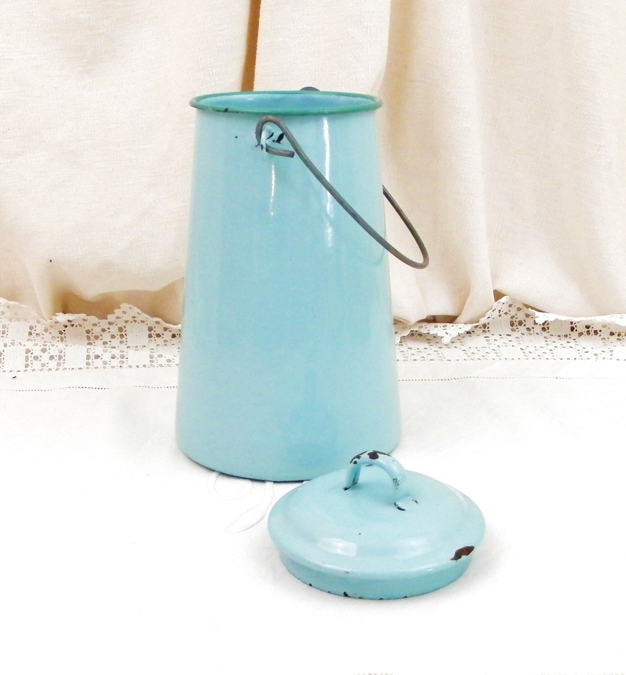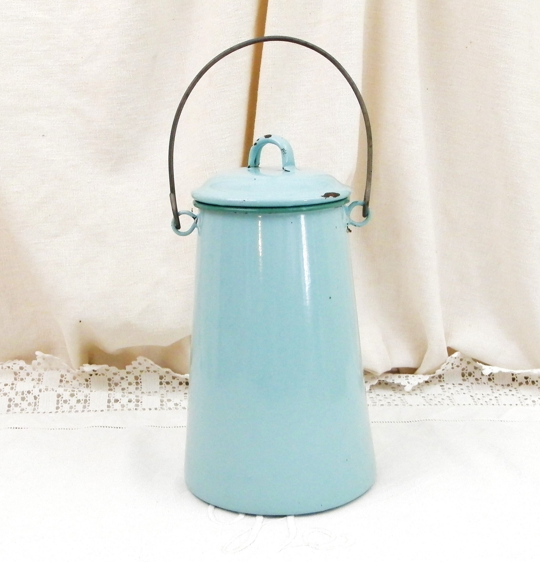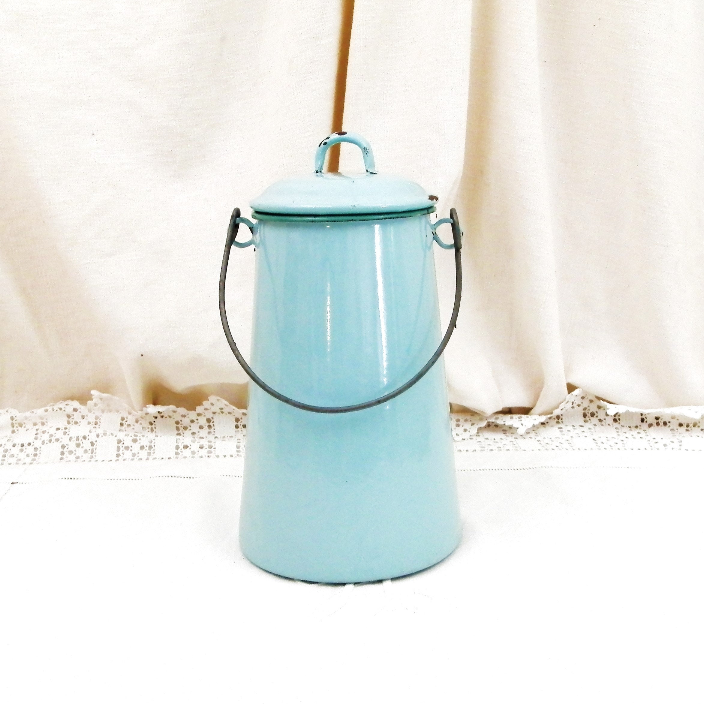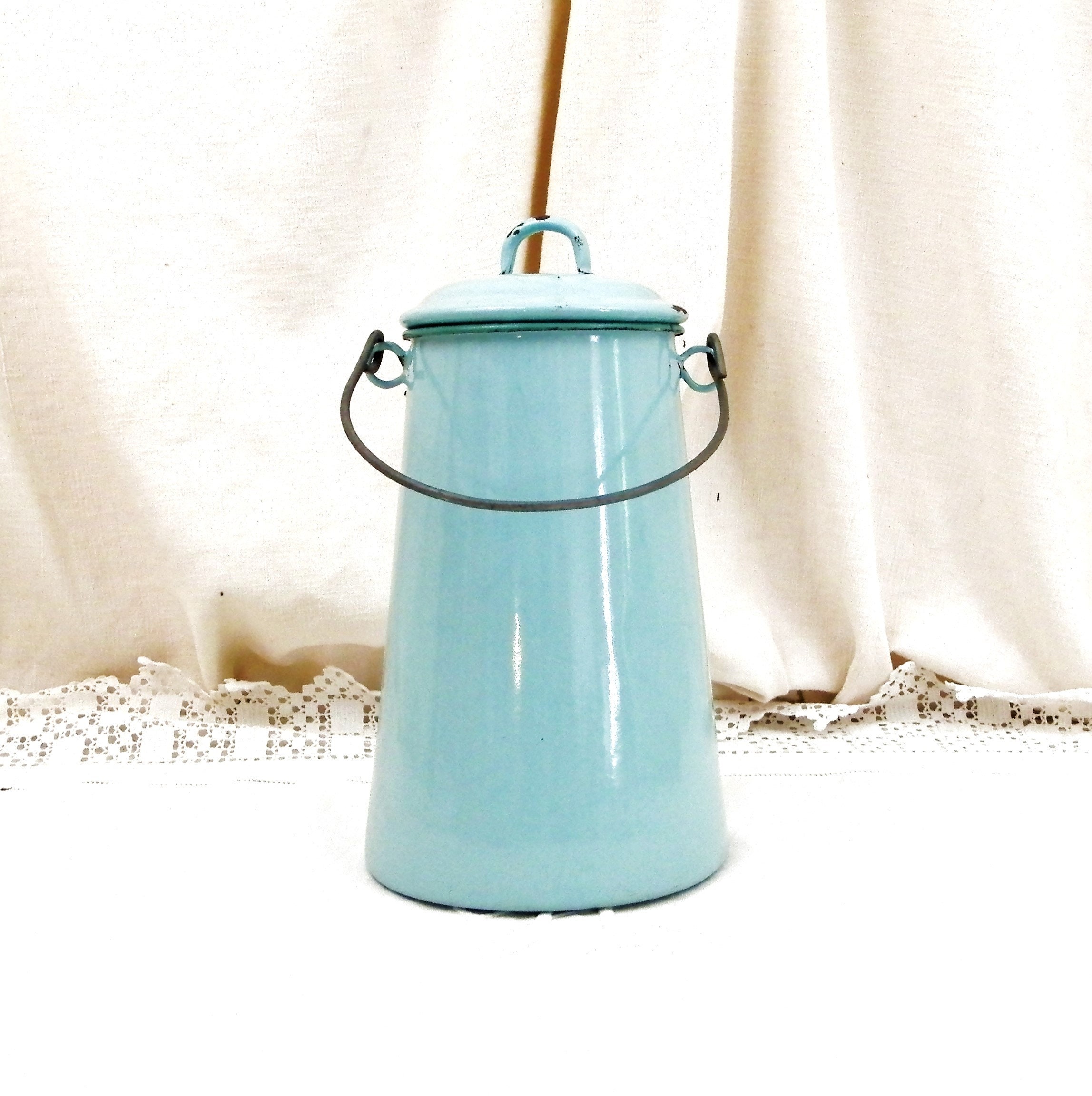 Antique French country farmhouse enamelware milk churn. Made of pale blue enamel on metal with a lid and wire handle. Traditionally used daily to fetch the milk from the farm. This particular churn is on the large size. Found at a fleamarket in Normandy France.