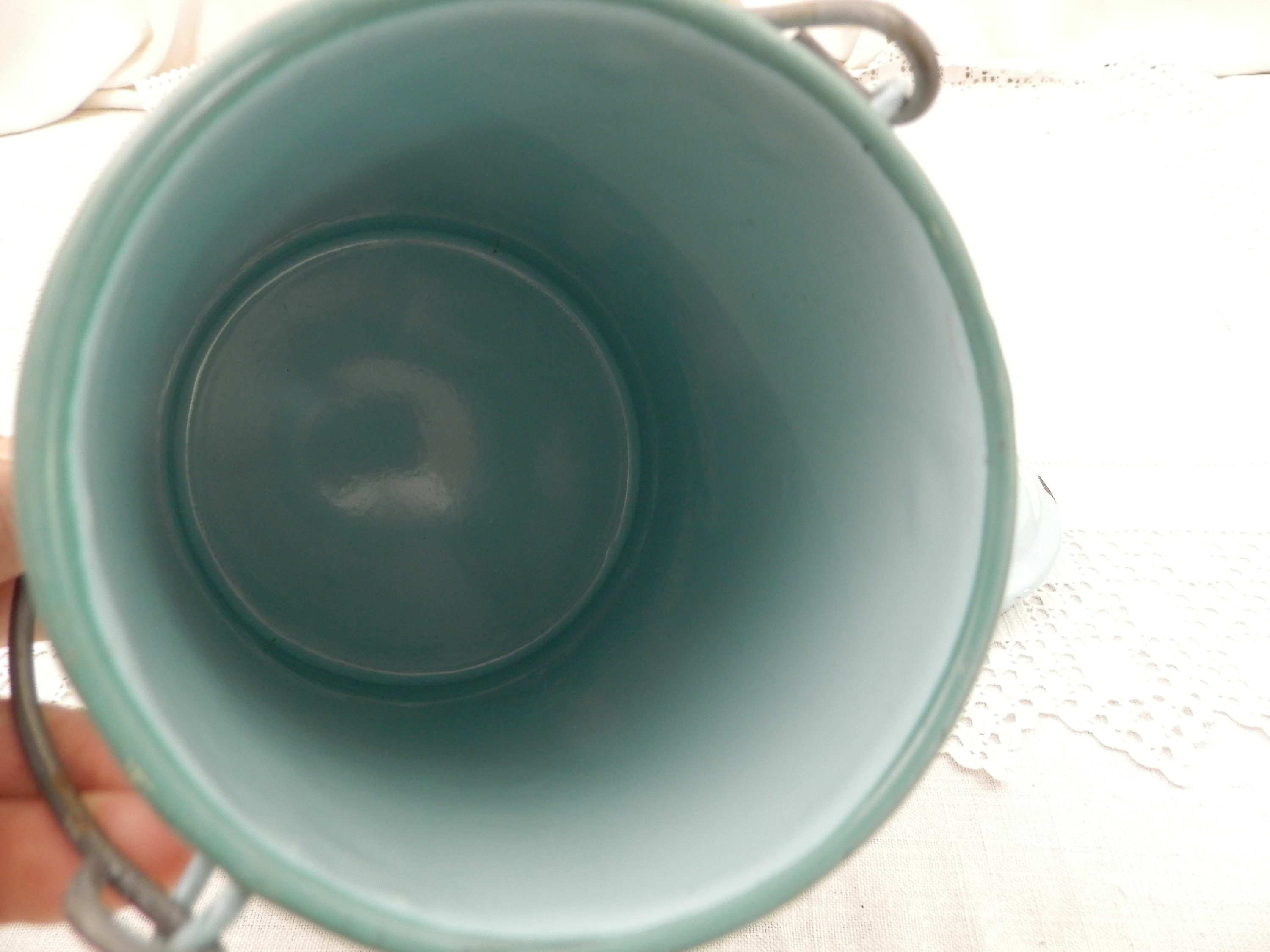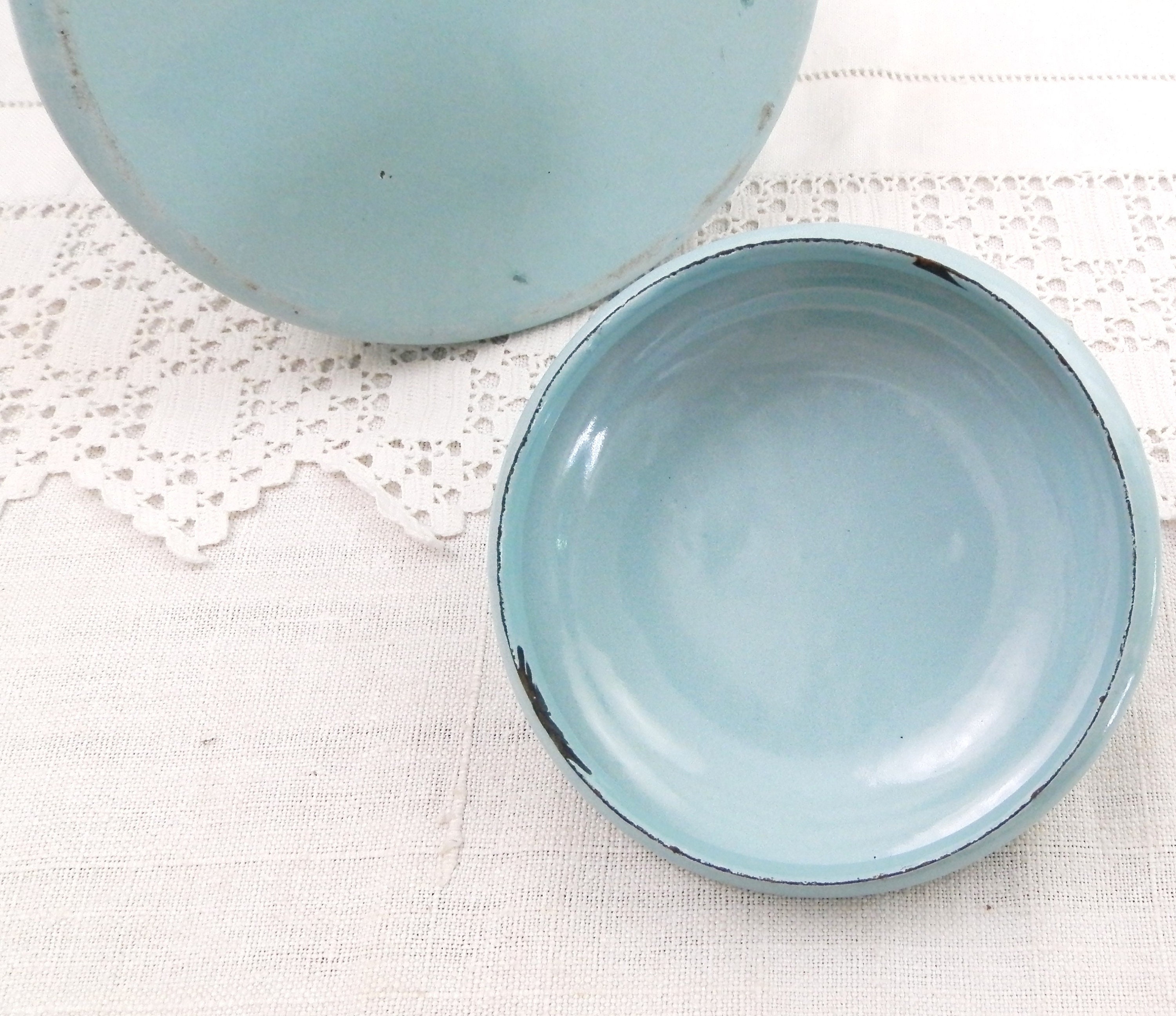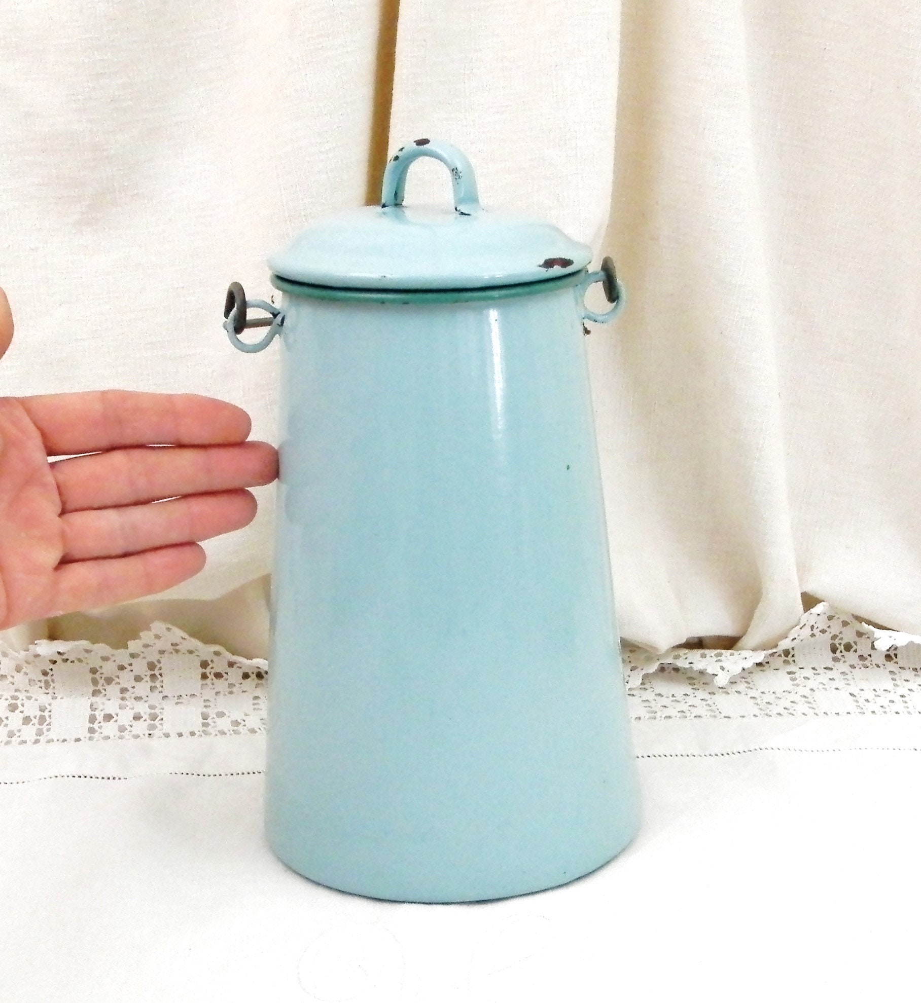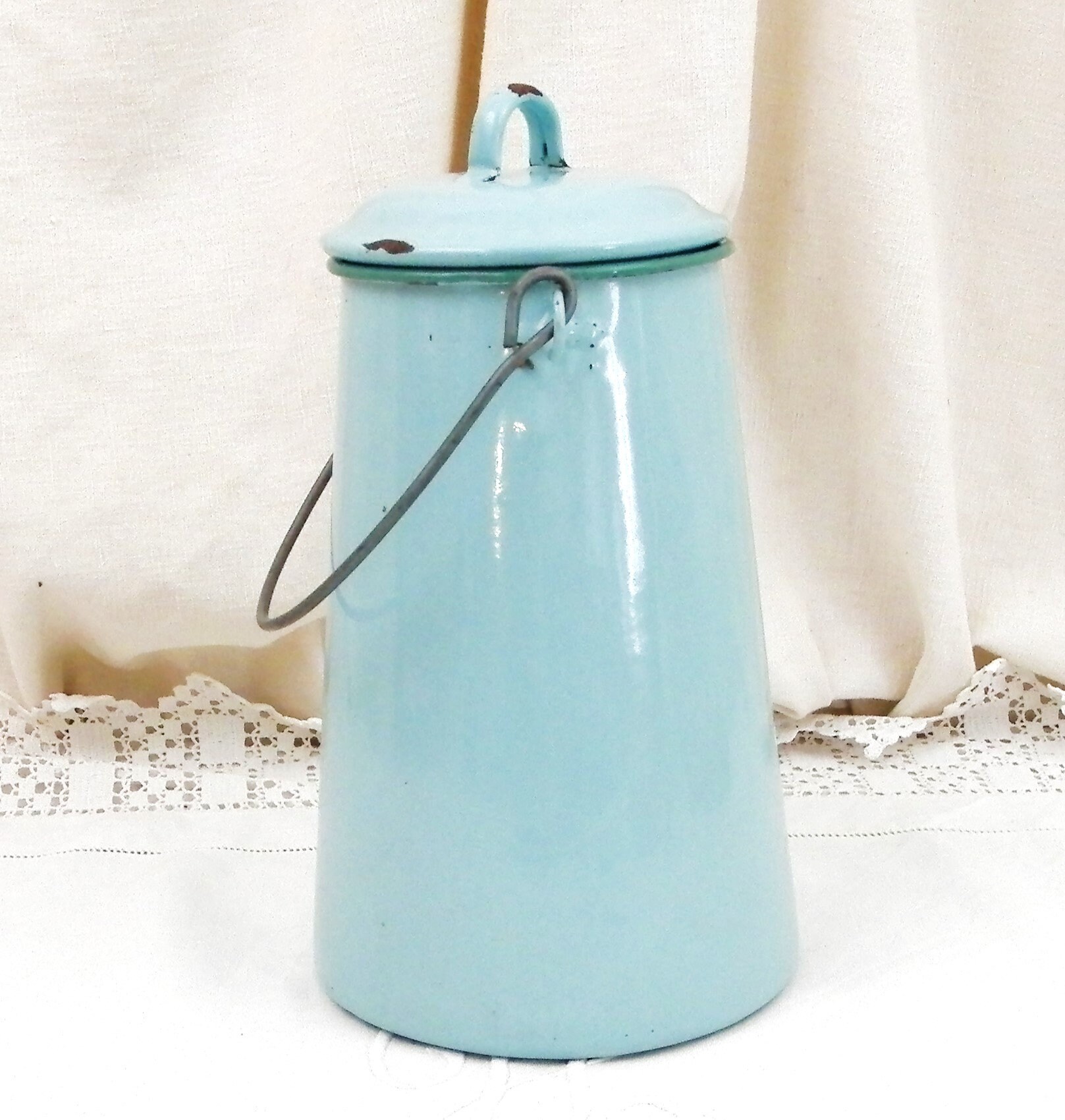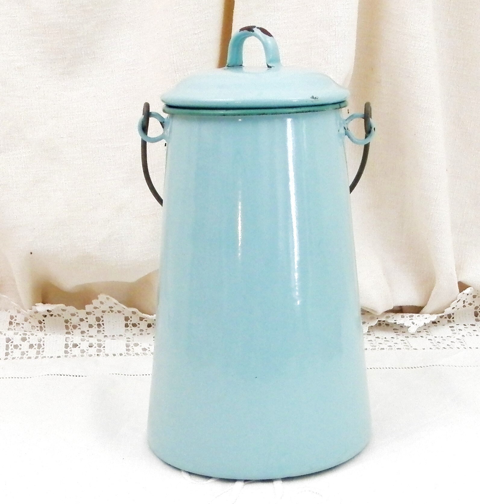 Antique French country farmhouse enamelware milk churn. Made of pale blue enamel on metal with a lid and wire handle. Traditionally used daily to fetch the milk from the farm. This particular churn is on the large size. Found at a fleamarket in Normandy France.