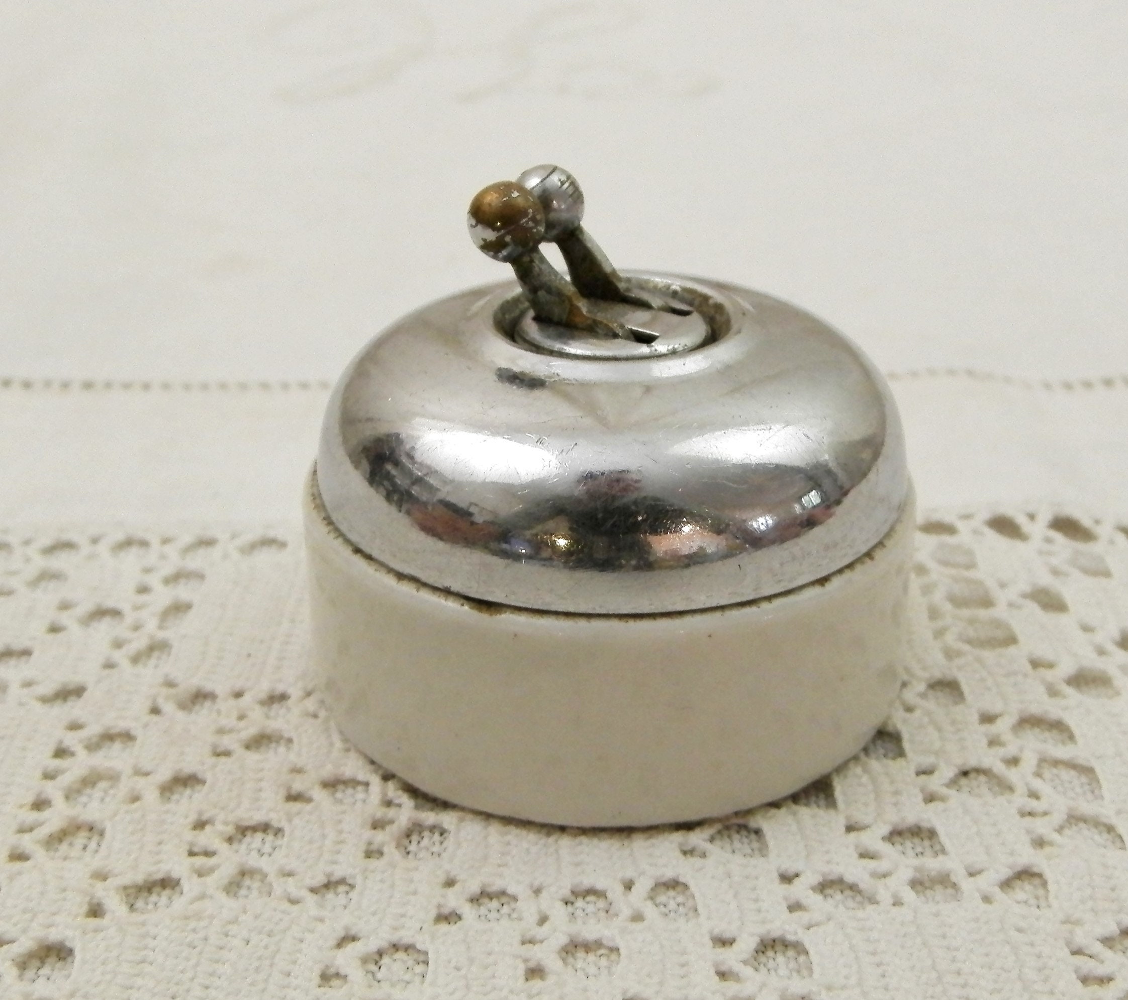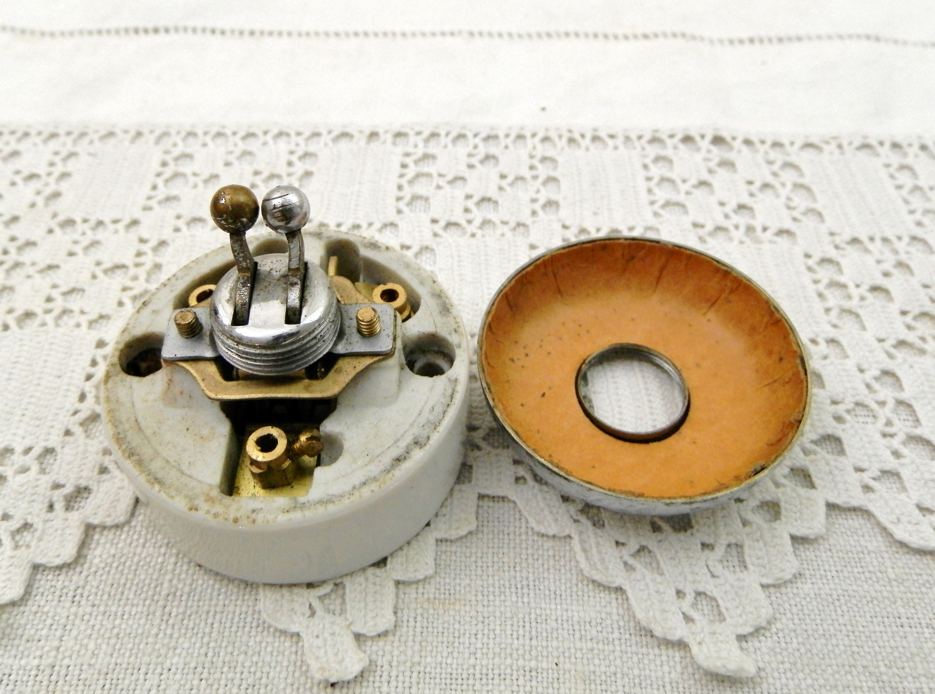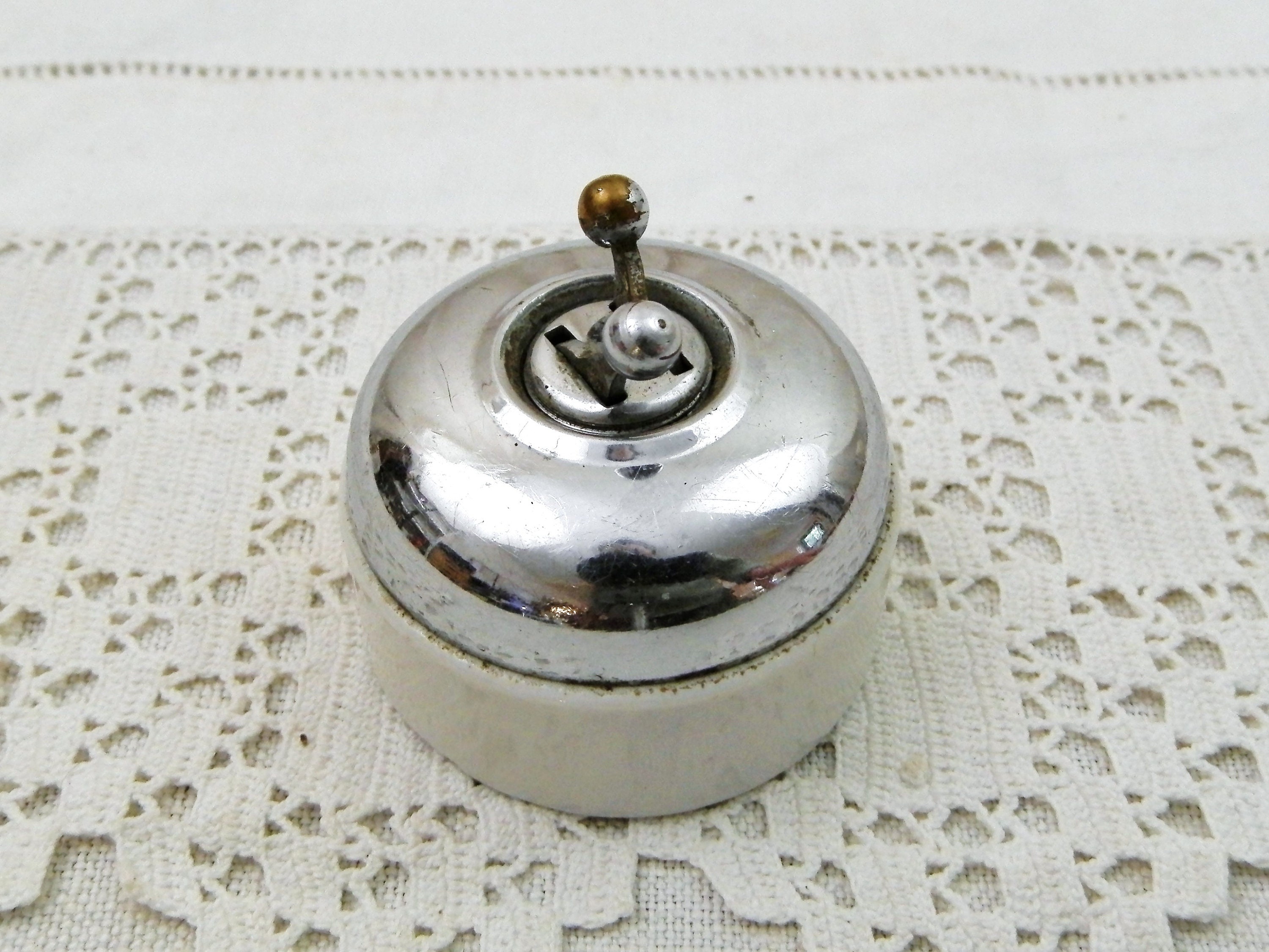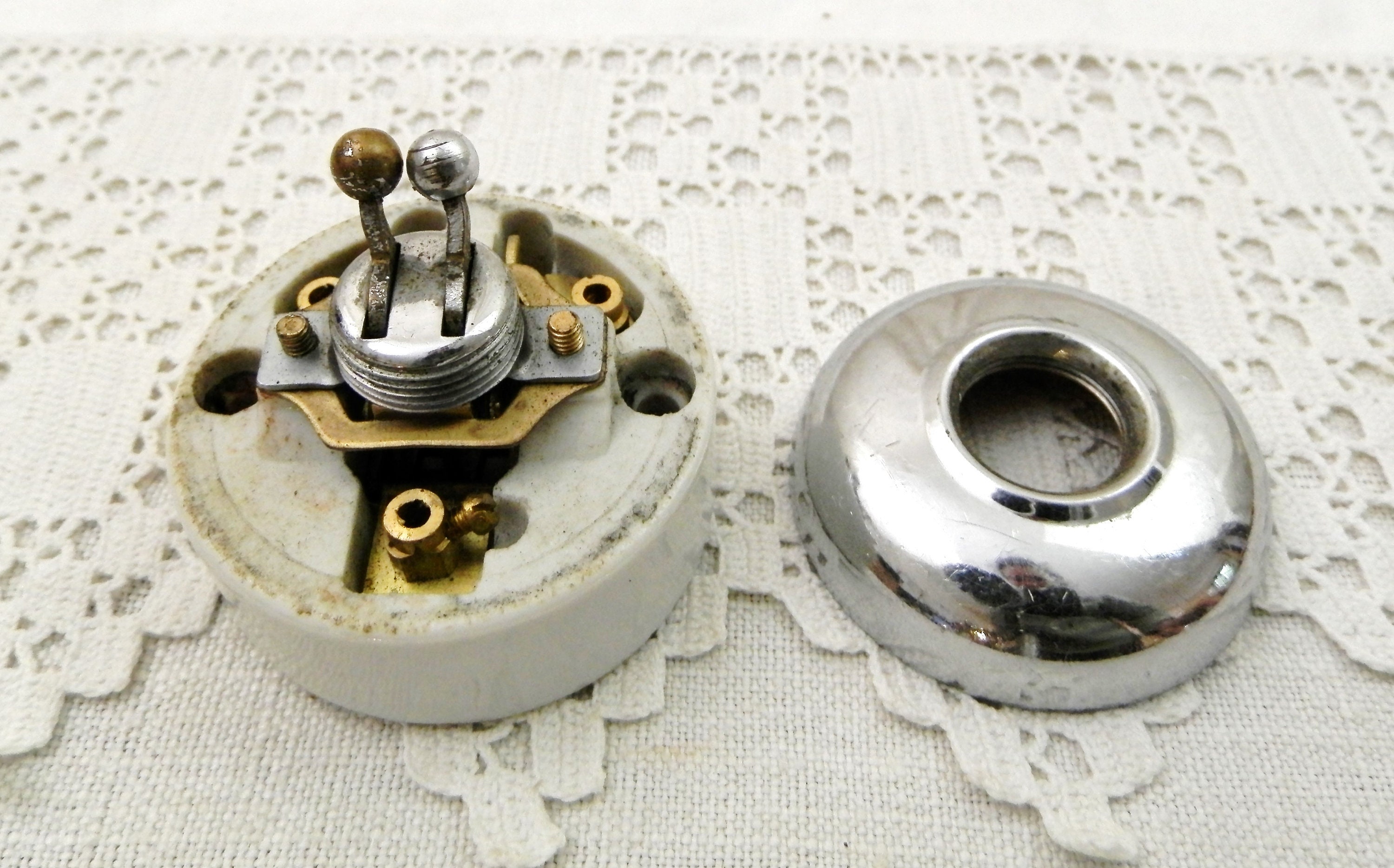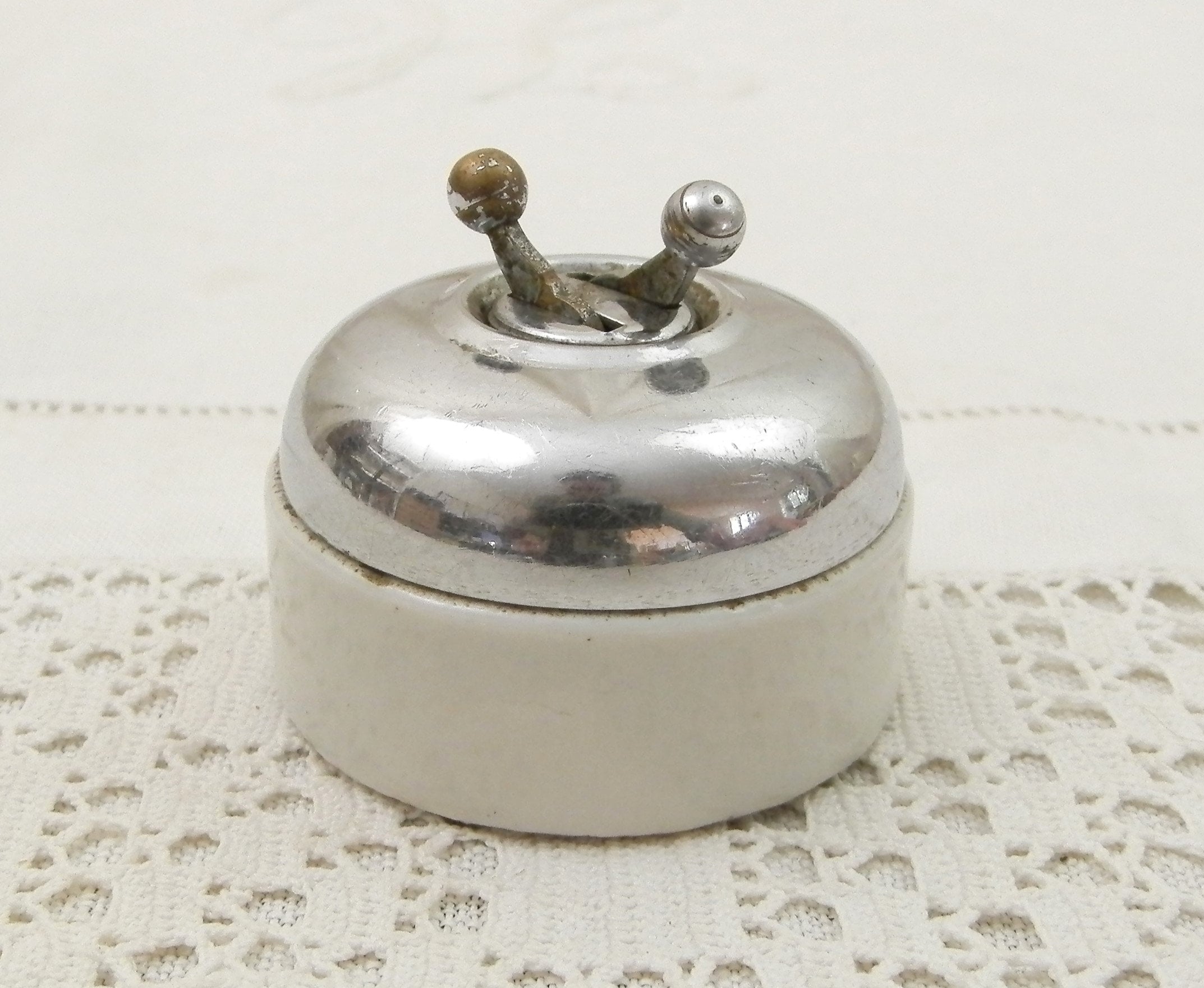 Vintage French round electrical double light switch. There are 2 independent switches. Made of chrome plated metal with a ceramic base. This switch has not been tested. Both switches are in moving order.