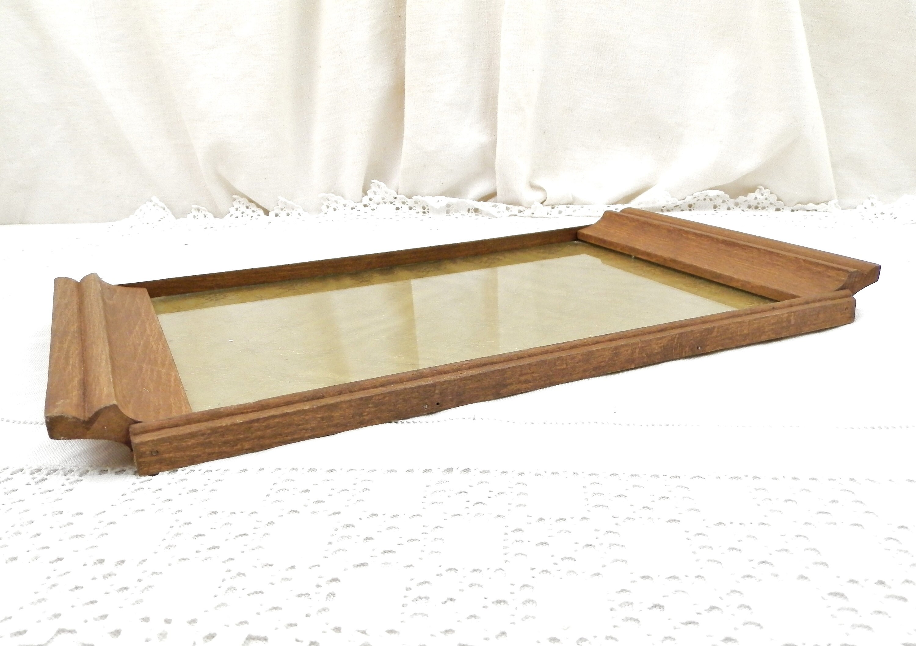 Small rectangular vintage tray made of a wooden frame with gold colored fabric under a glass top. Could be used for serving drinks, on a table to store condiments, or on a desk for organizing pens etc.. Circa 1950s. Found at a flea market in the Loire Valley.