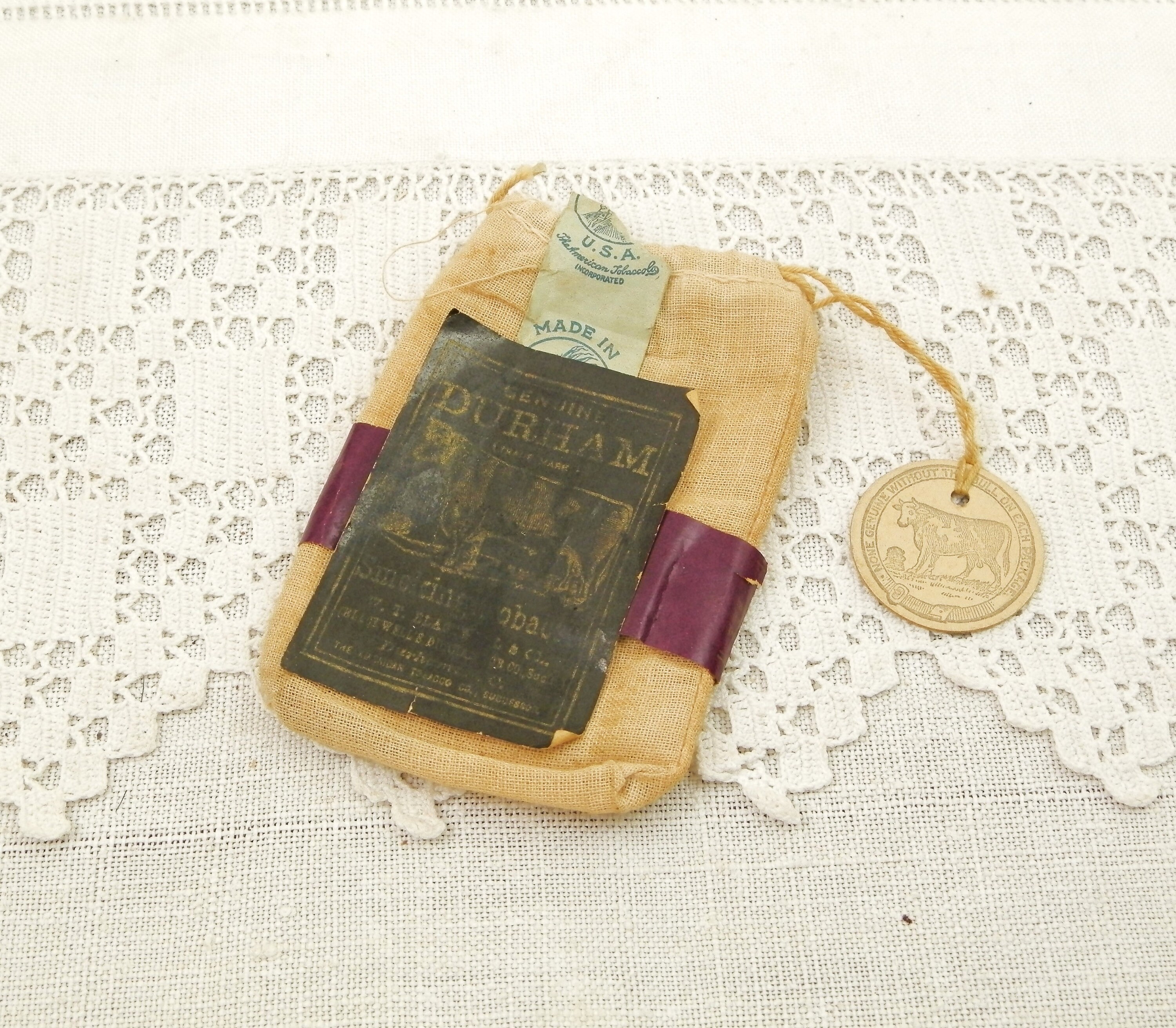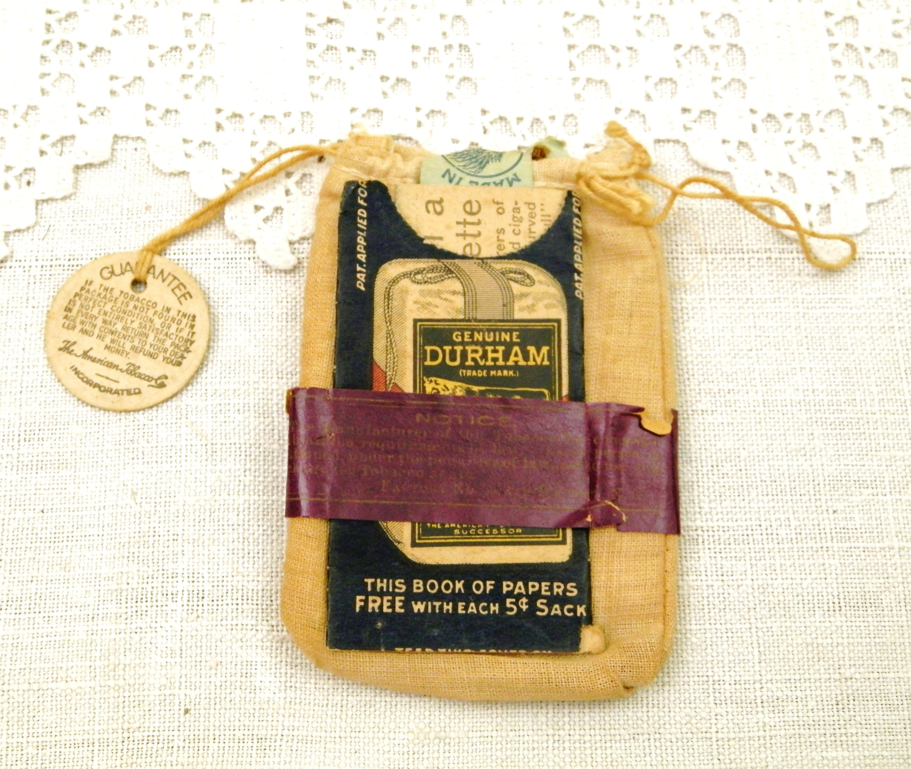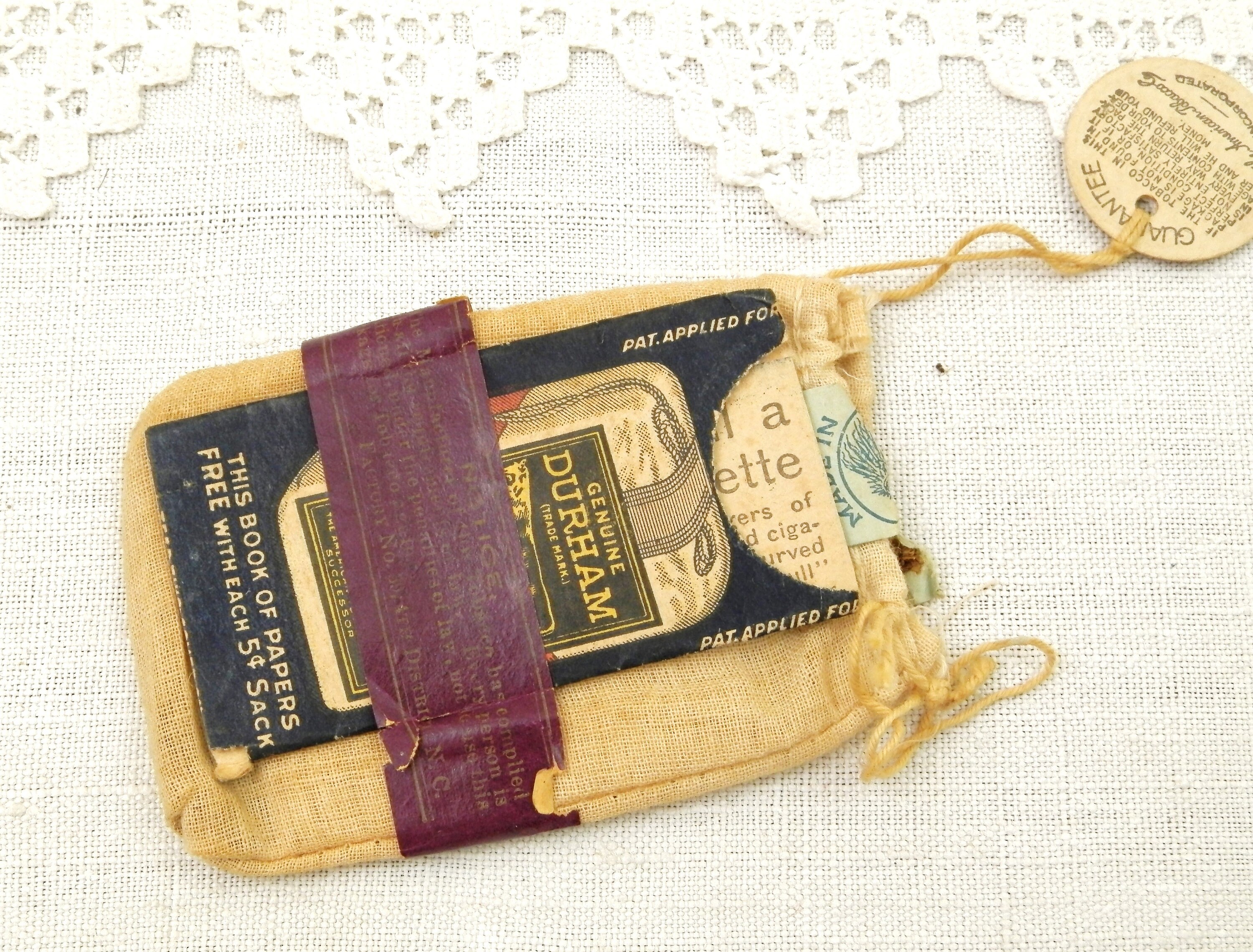 Antique French genuine Durham rolling tobacco cotton pouch. Found in France, probably a gift from an American GI during World War Two. Empty, still with an empty rolling papers booklet. An unusual find. Found at a French flea market in Normandy.