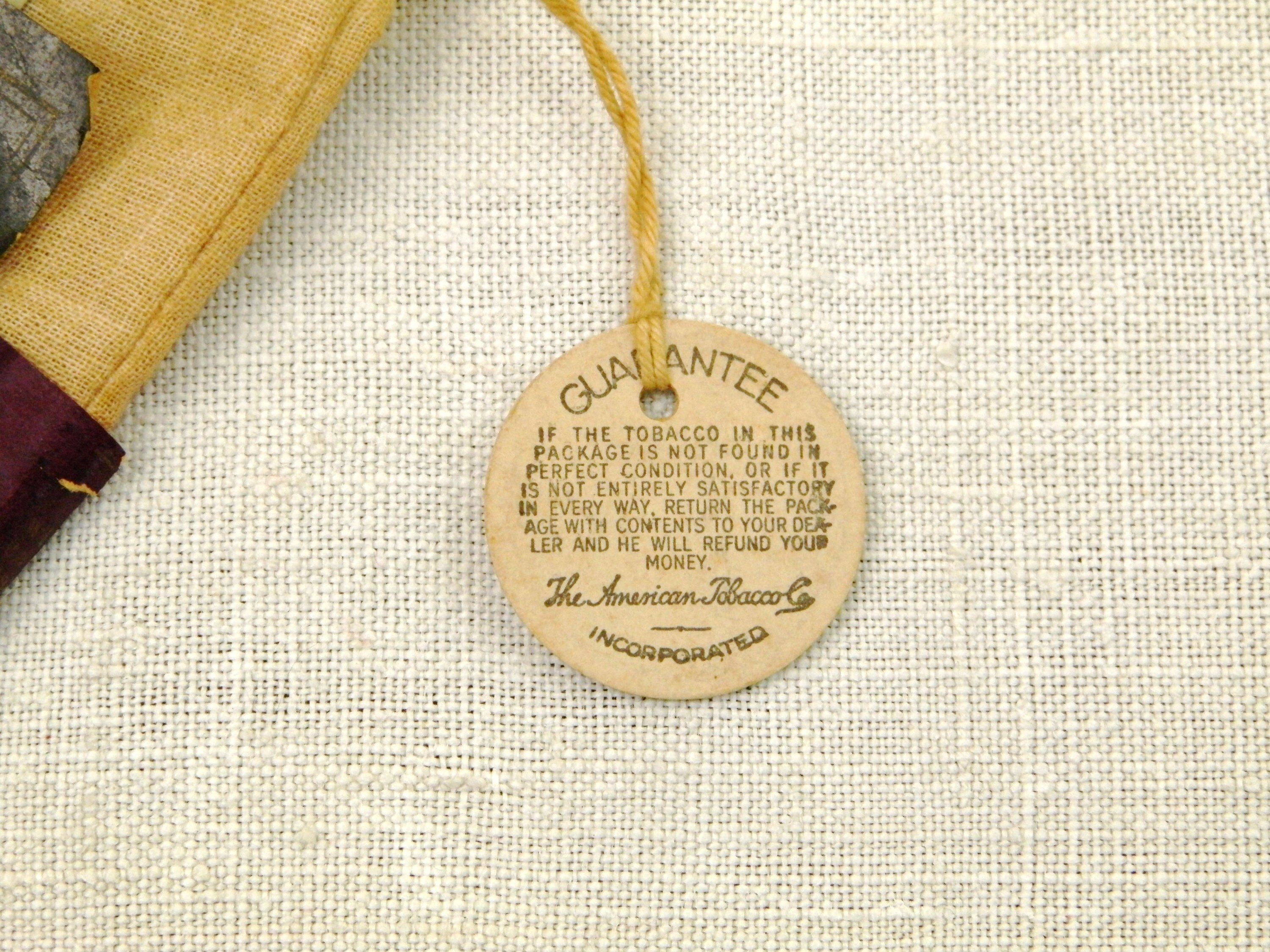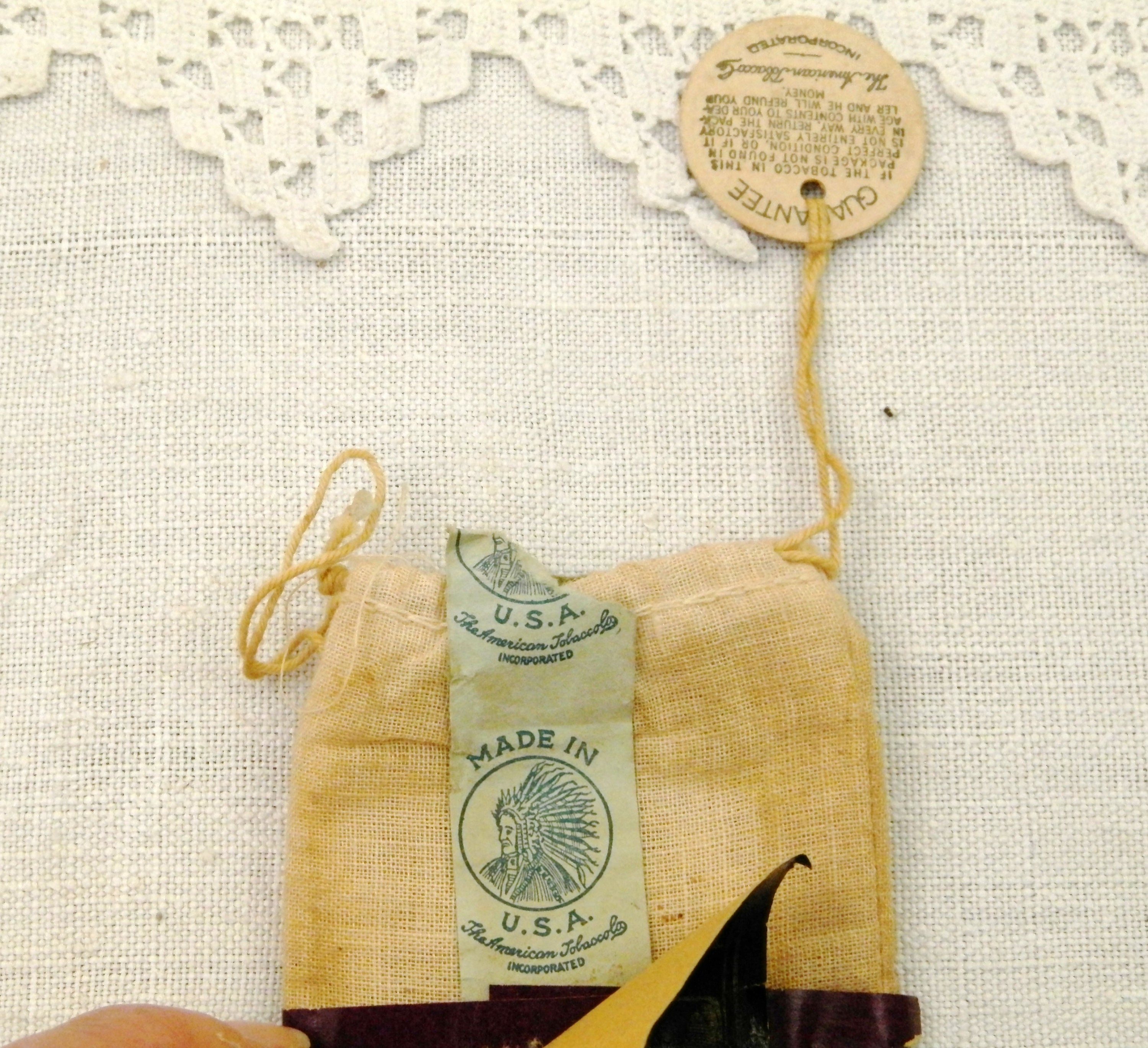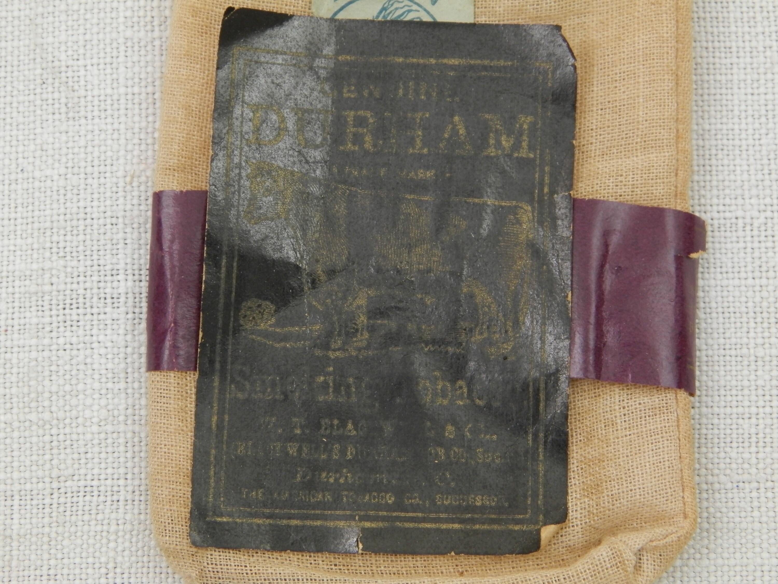 Antique French genuine Durham rolling tobacco cotton pouch. Found in France, probably a gift from an American GI during World War Two. Empty, still with an empty rolling papers booklet. An unusual find. Found at a French flea market in Normandy.