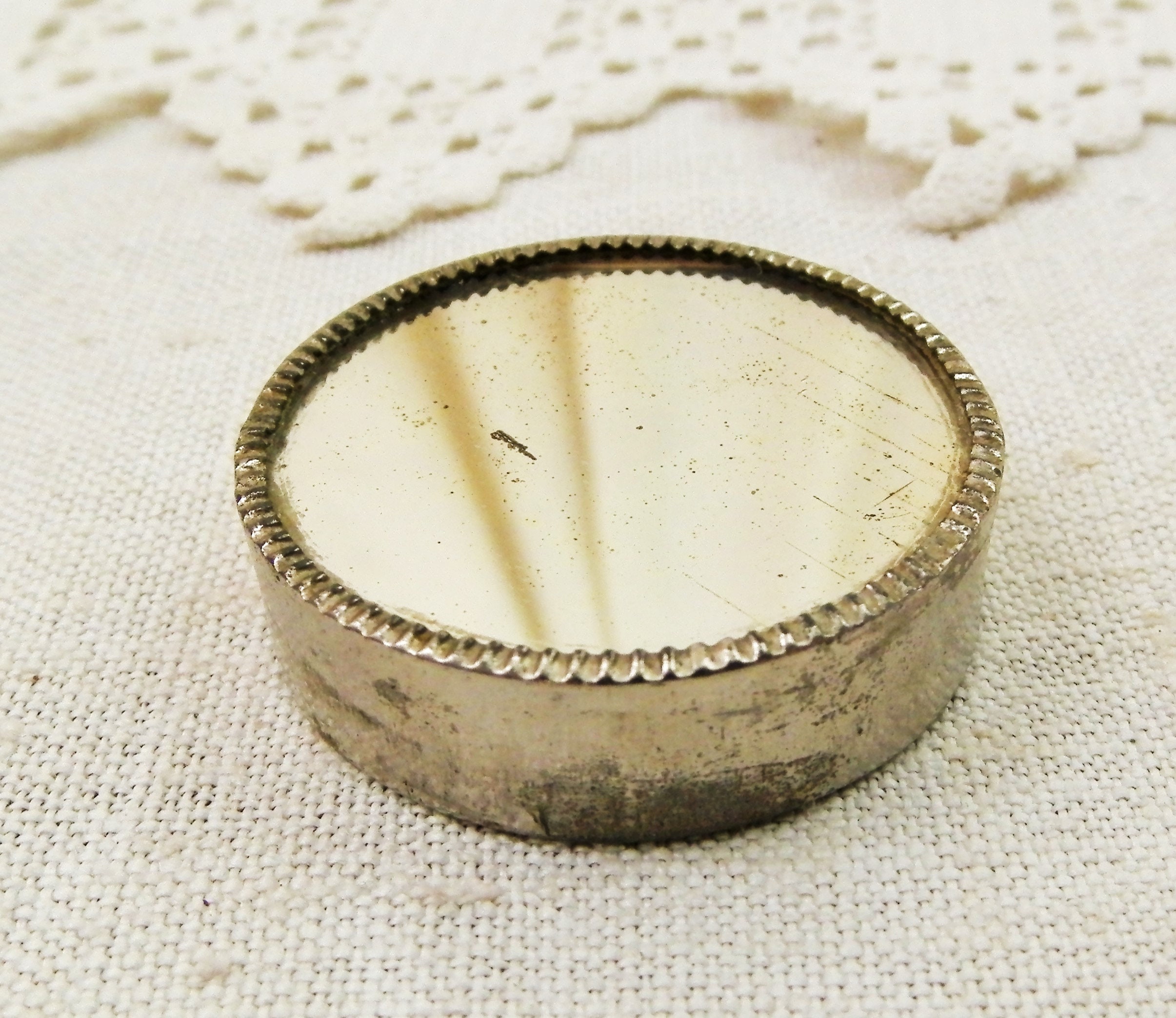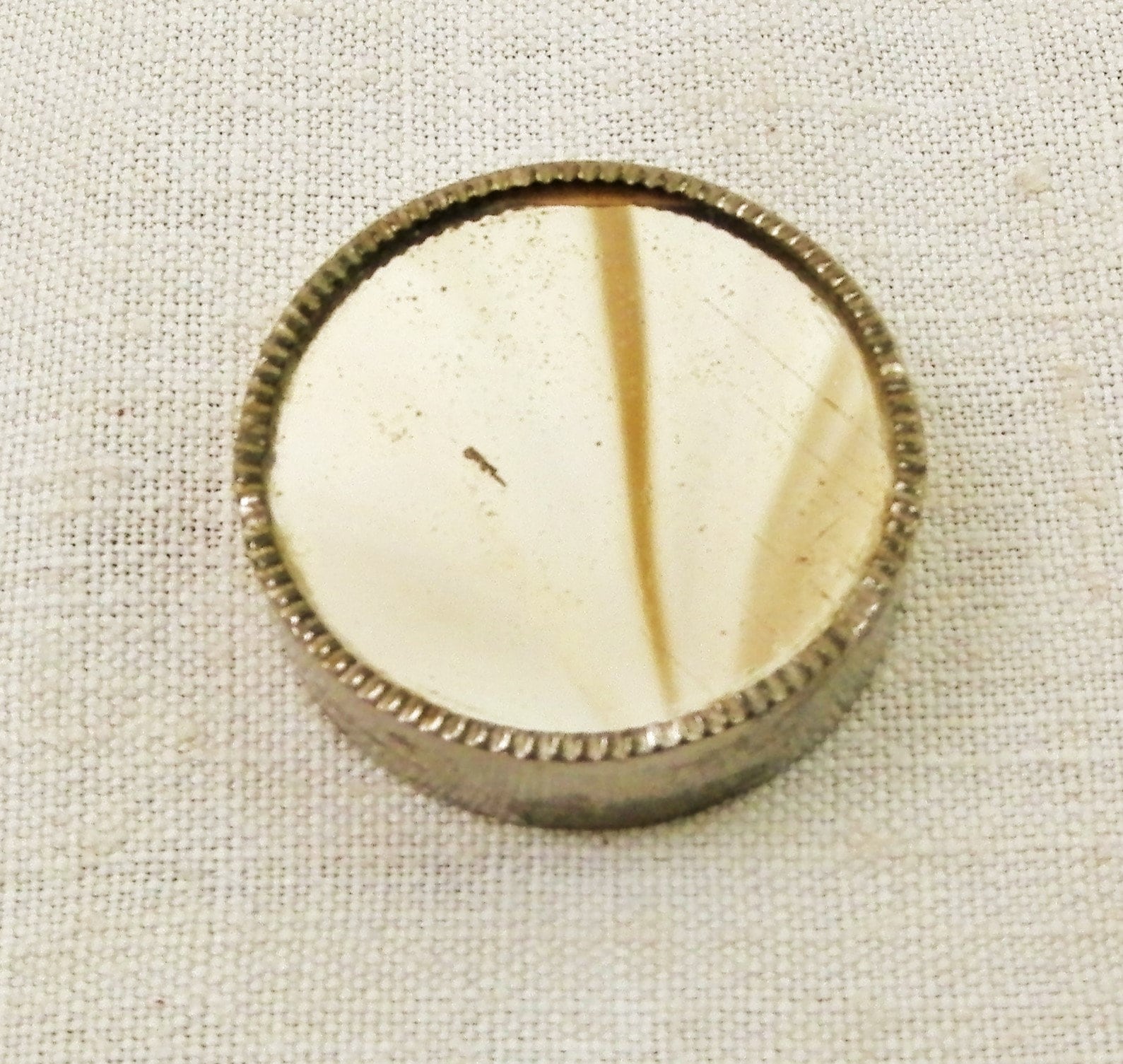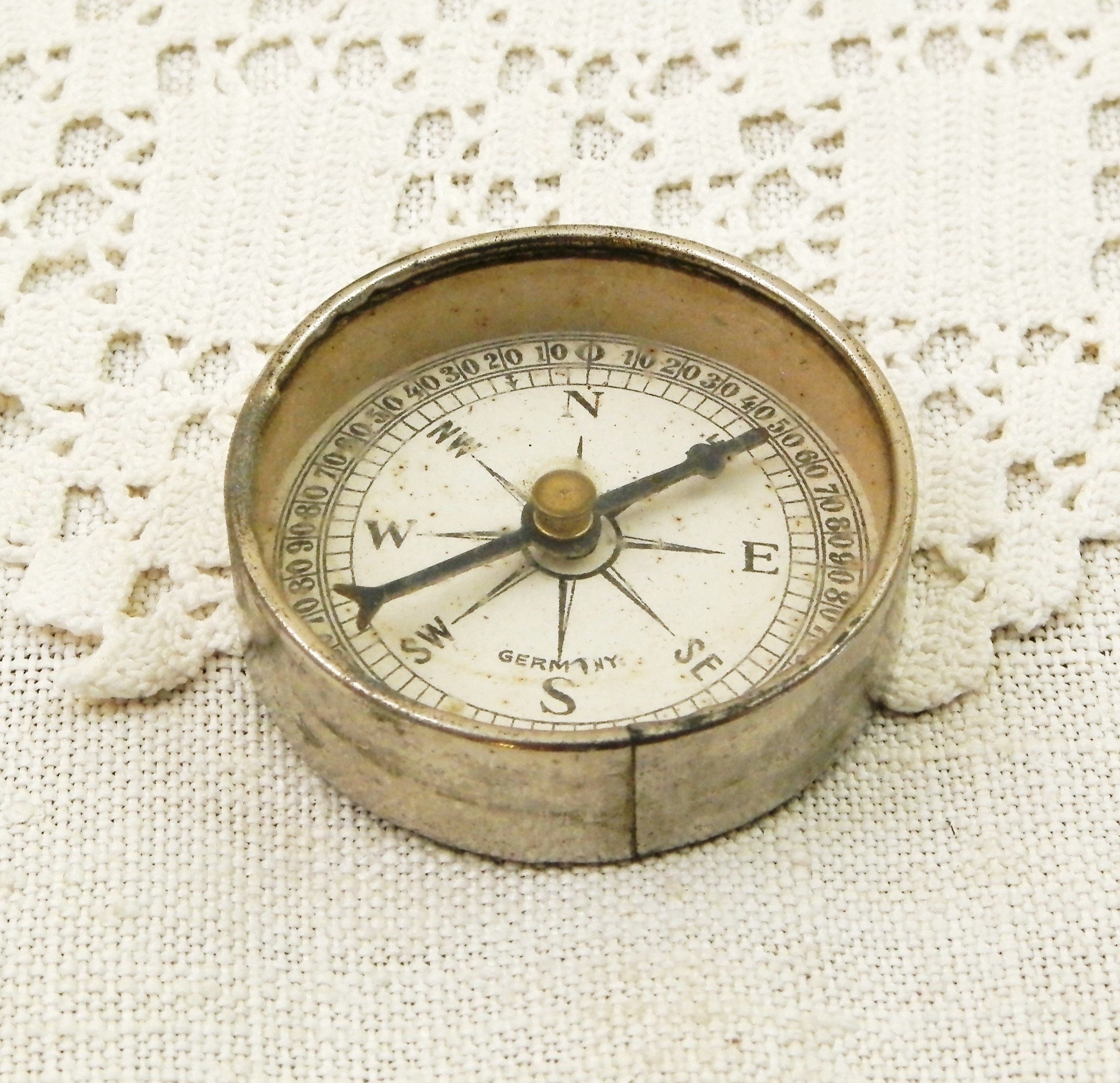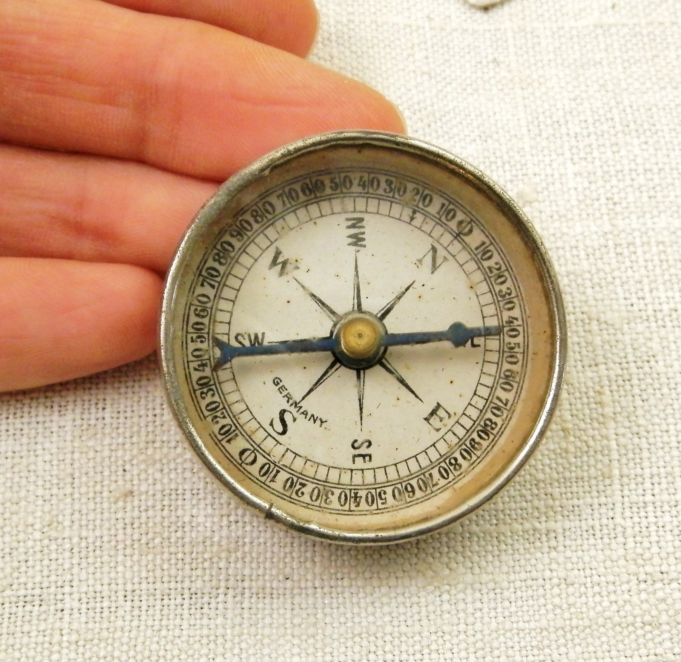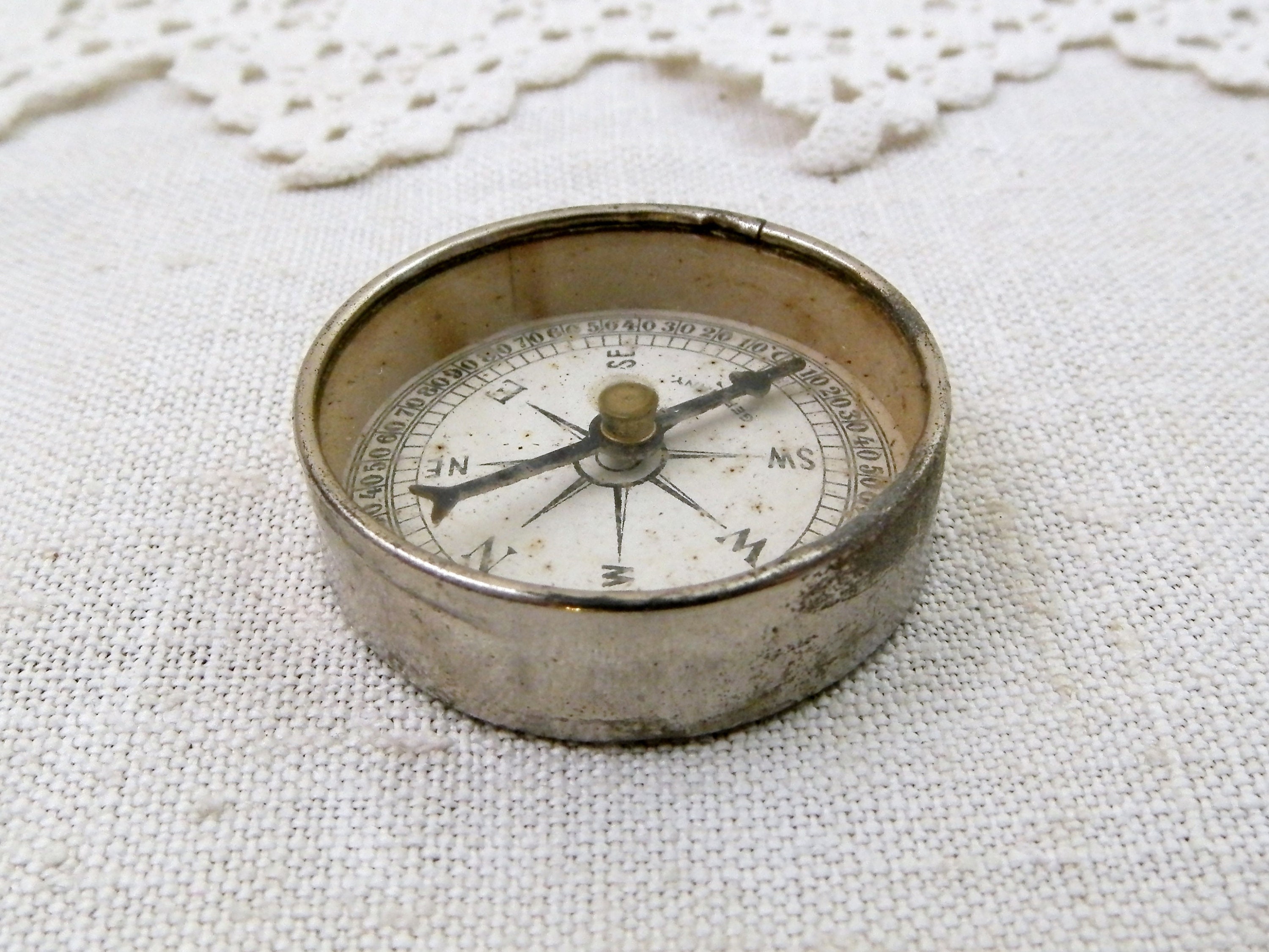 An Antique compass and mirror. On one side is the compass and on the other is a mirror. The cardinal points are in English with N E S W for north, east, south, west. Made in Germany of silver colored metal and glass. Found at a French flea market in Normandy.