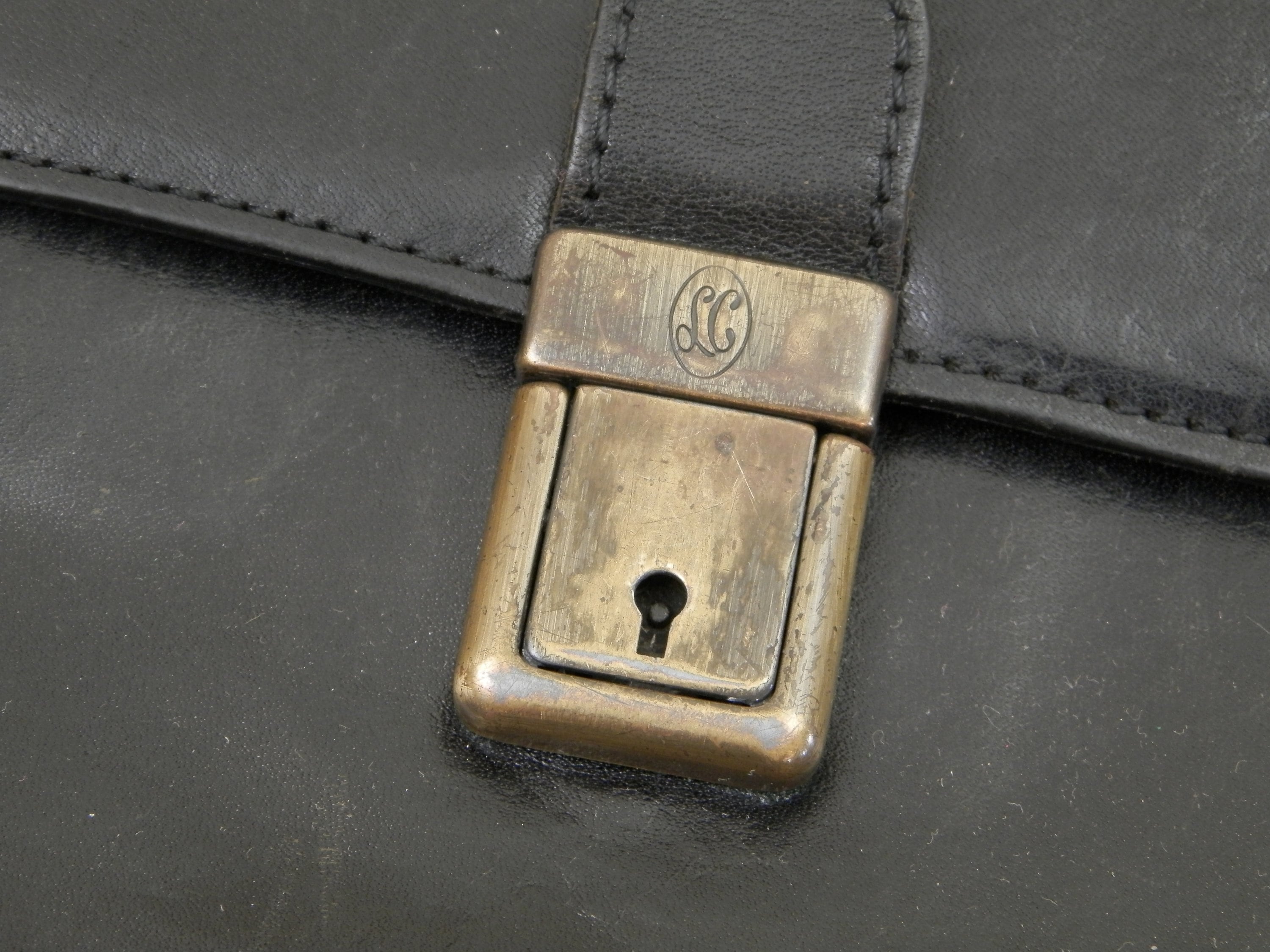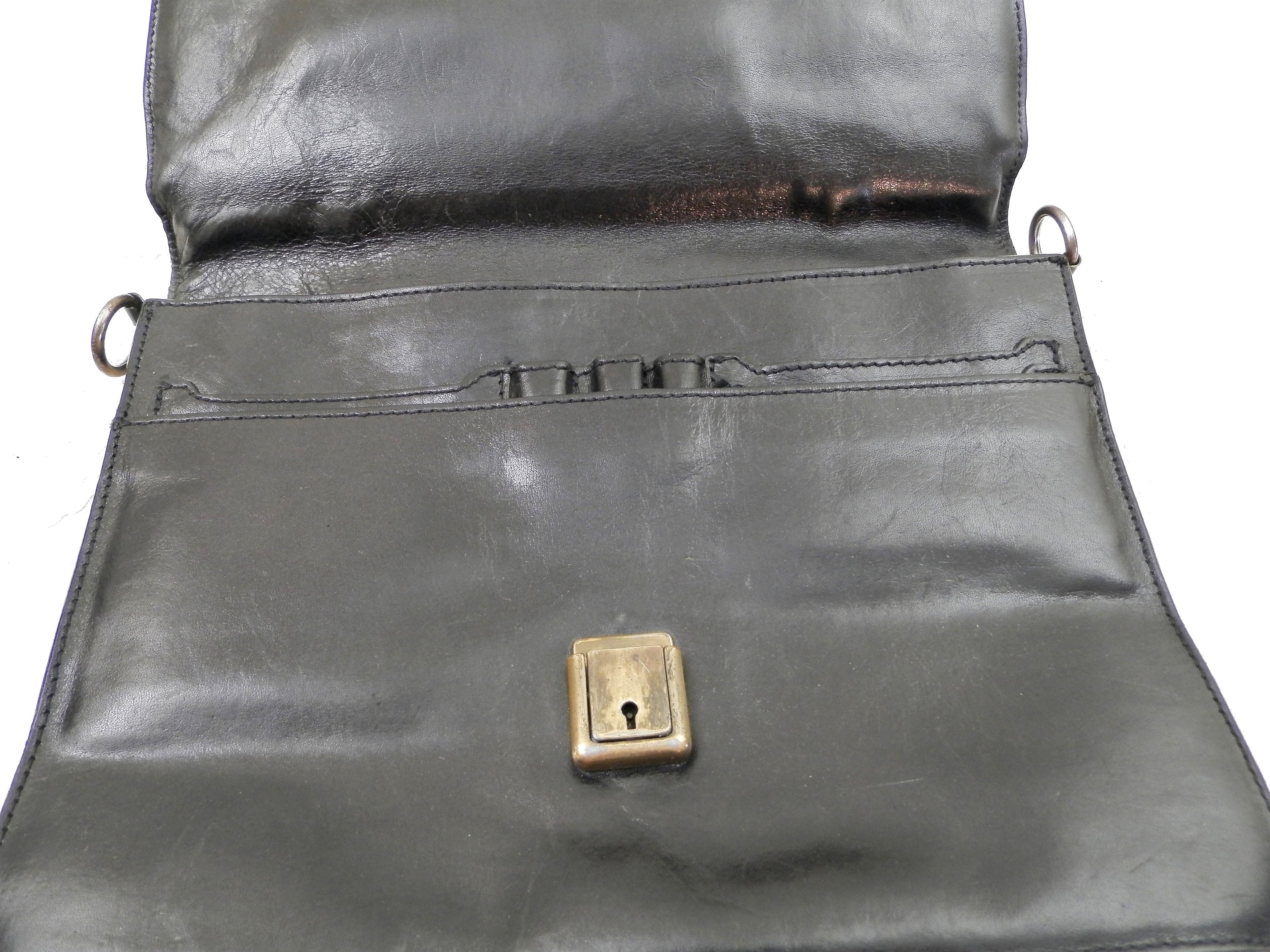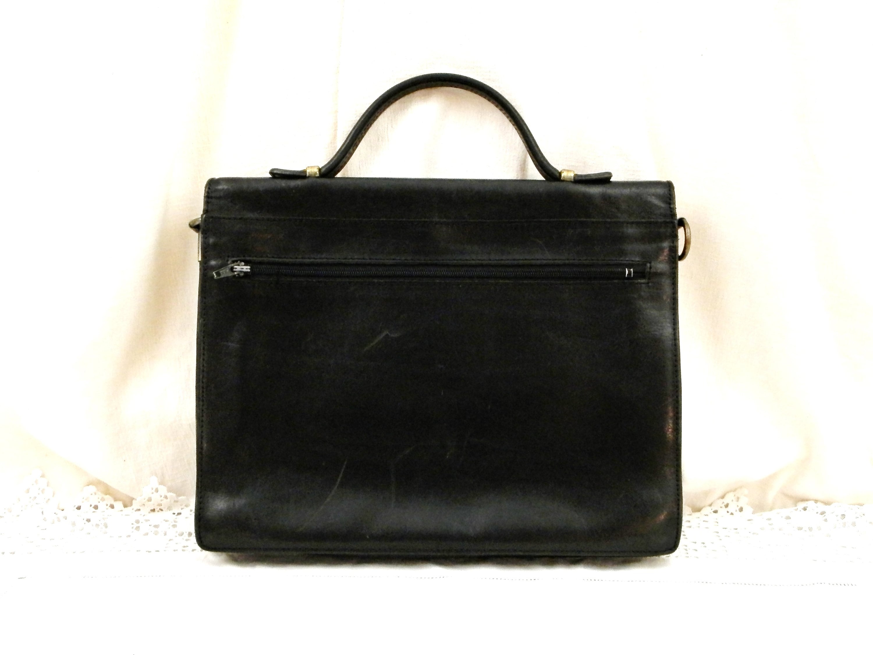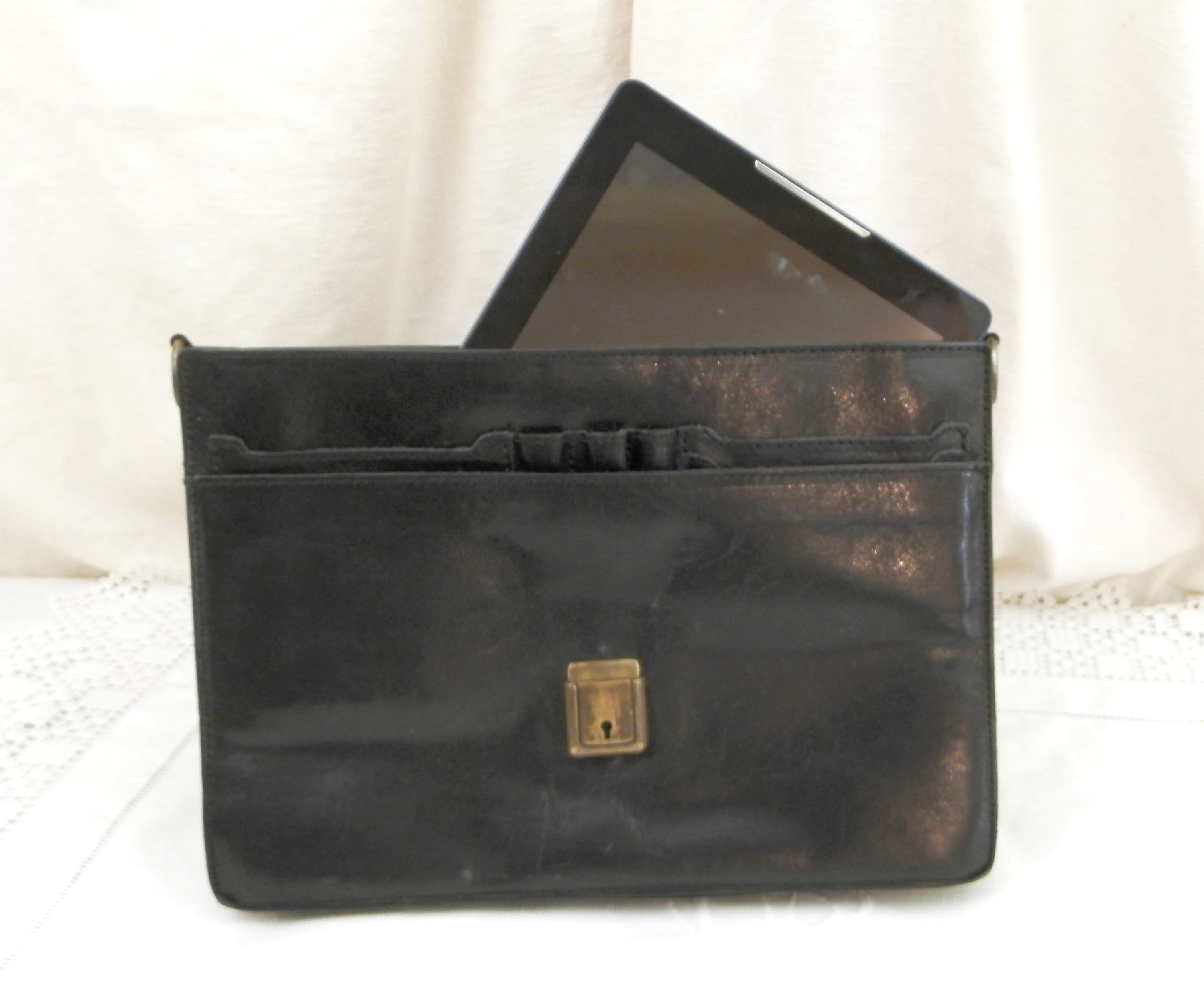 Small vintage retro French black leather briefcase. Made by French manufacturer Louis Chene, solde by a leather goods shop in Alencon, Normandy. Inside are 2 compartments with a pen holders for 3 pens, 2 small pockets and a card pocket, at the rear is a compartment that closes with a zipper. Popper clasp with no key. Originally there would have been a shoulder strap, this could easily be replaced as the 2 loops are still in place. The inner compartments are large enough to hold a tablet.