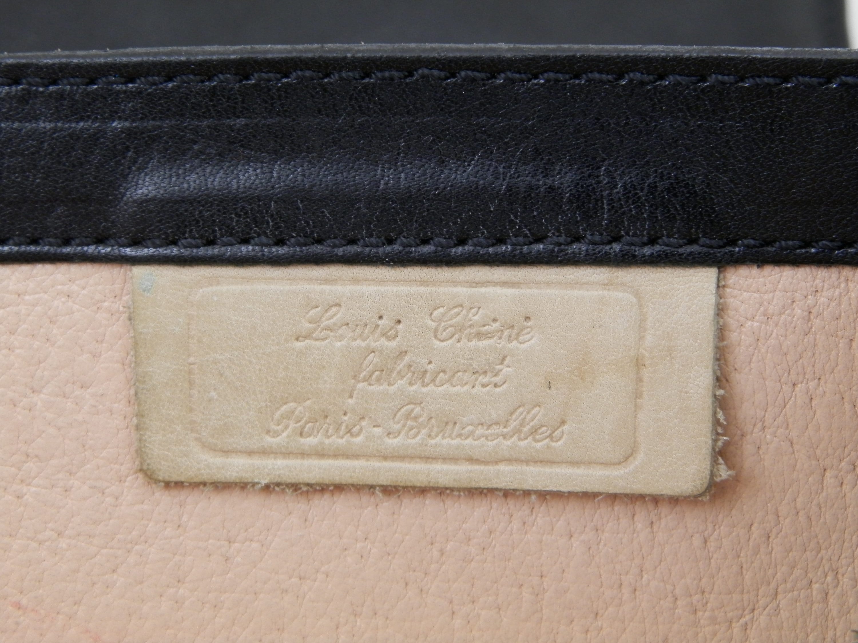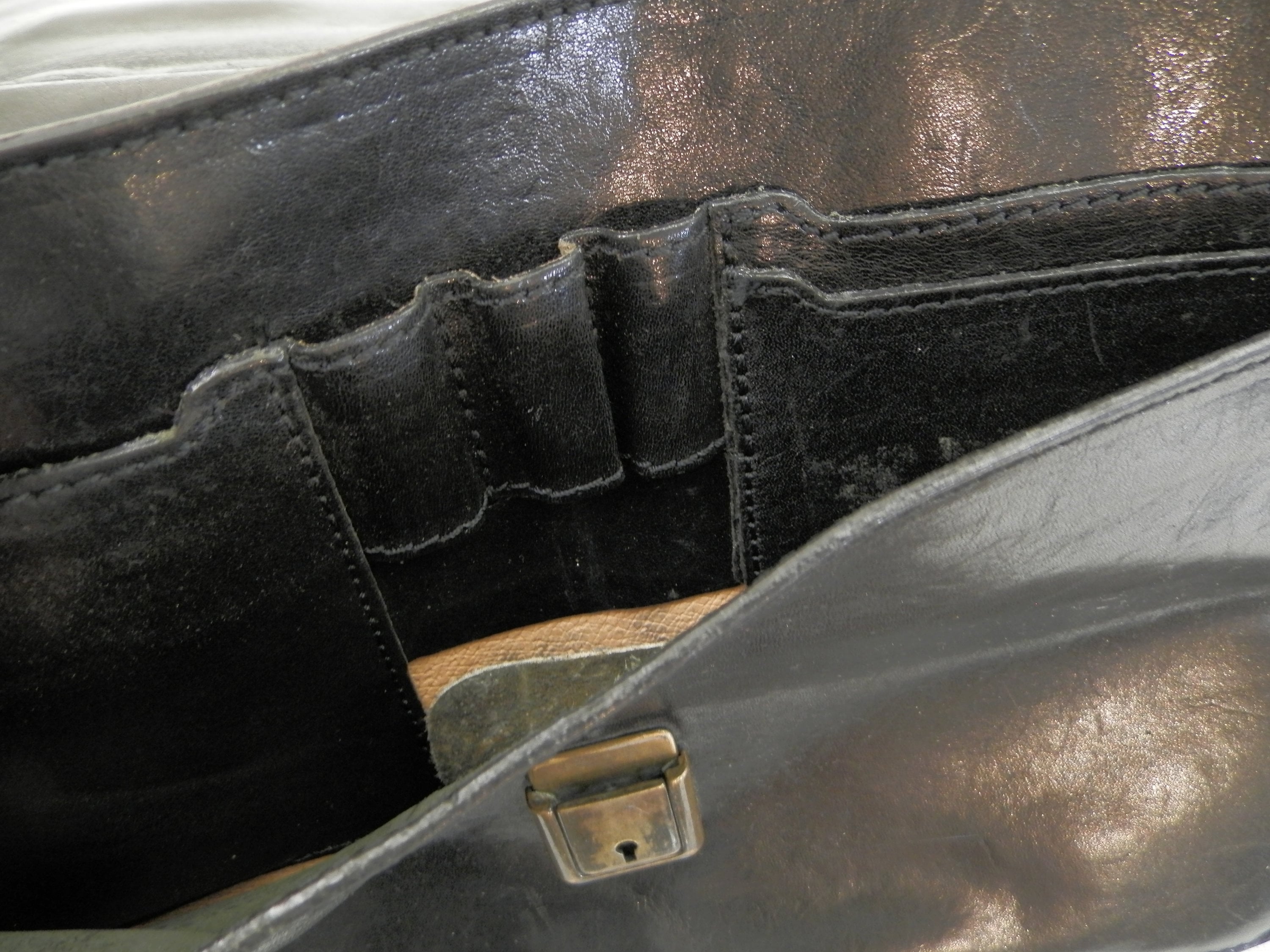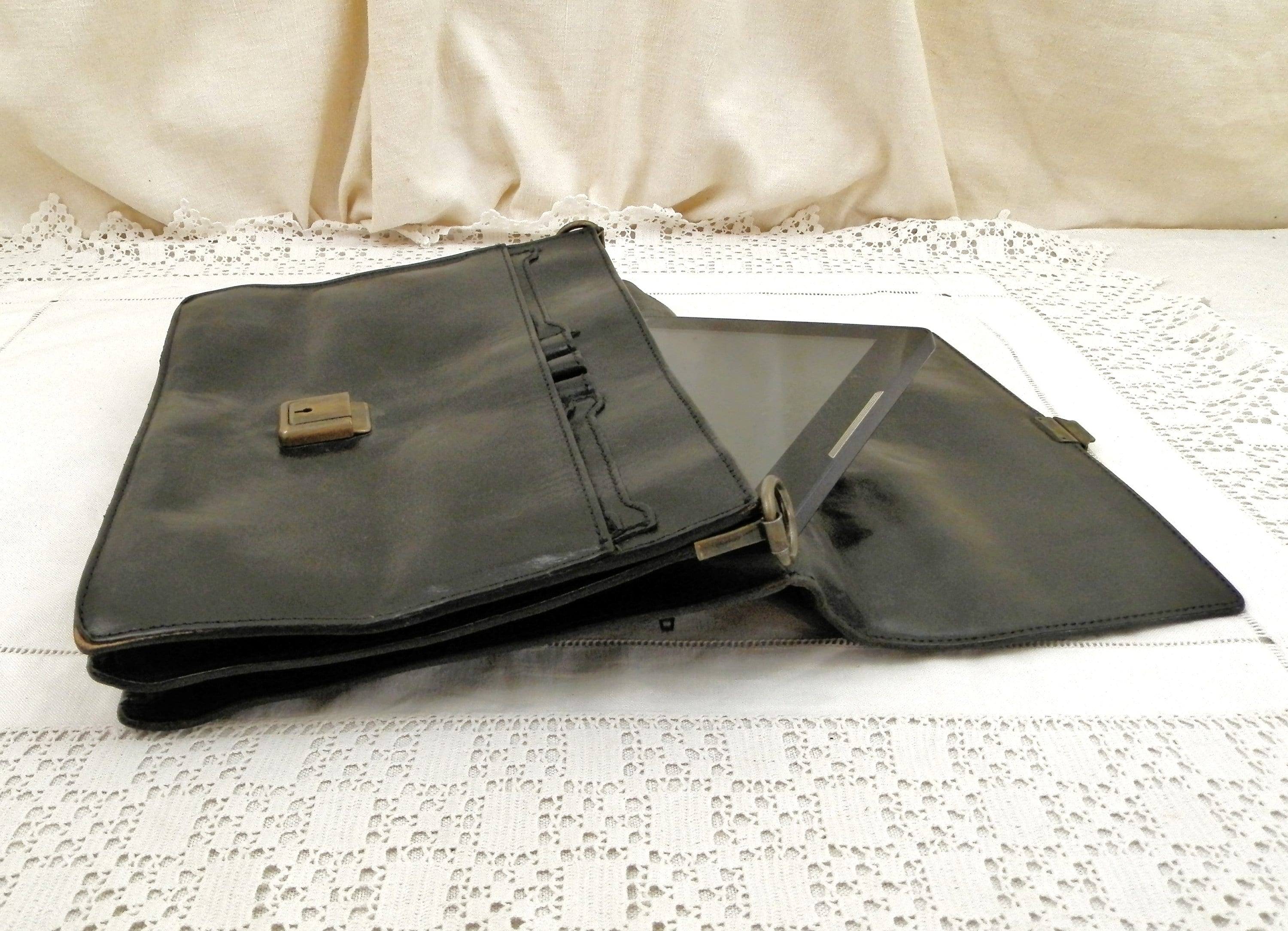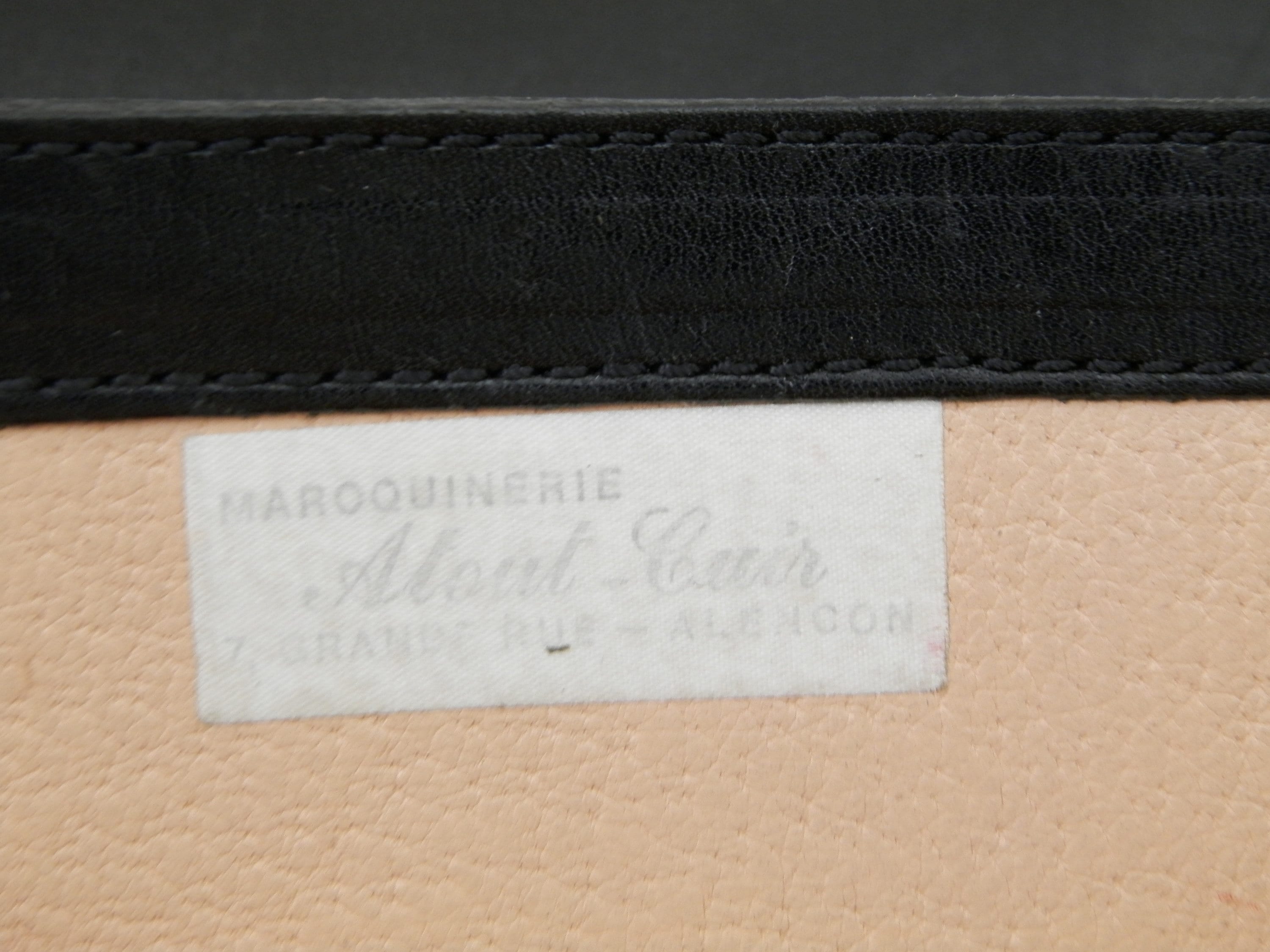 Small vintage retro French black leather briefcase. Made by French manufacturer Louis Chene, solde by a leather goods shop in Alencon, Normandy. Inside are 2 compartments with a pen holders for 3 pens, 2 small pockets and a card pocket, at the rear is a compartment that closes with a zipper. Popper clasp with no key. Originally there would have been a shoulder strap, this could easily be replaced as the 2 loops are still in place. The inner compartments are large enough to hold a tablet.