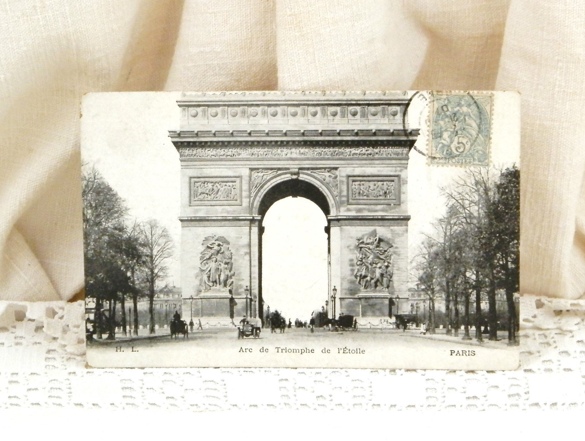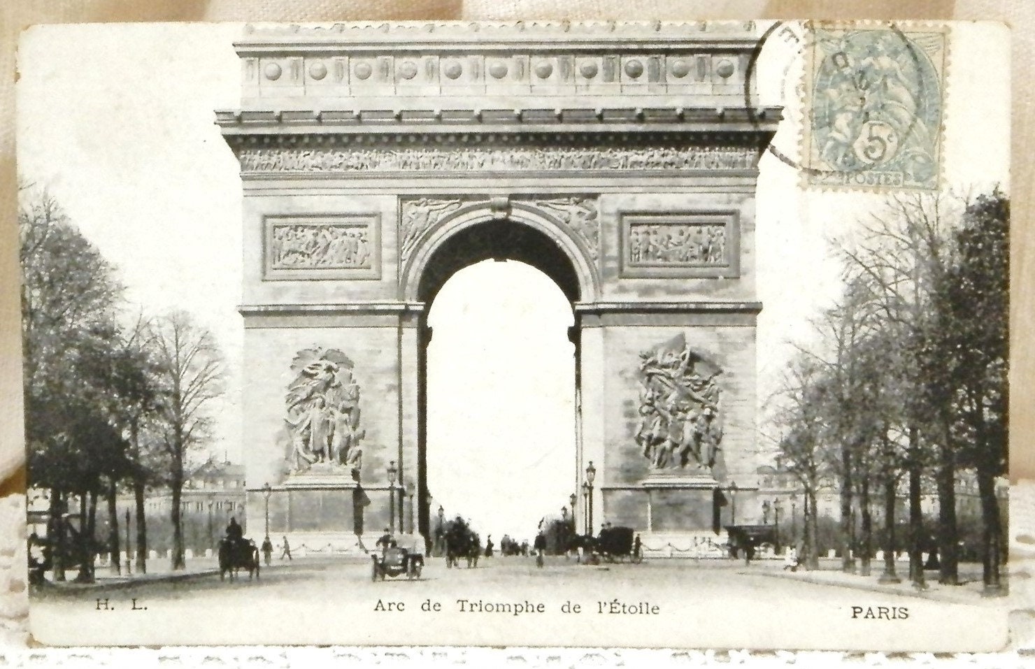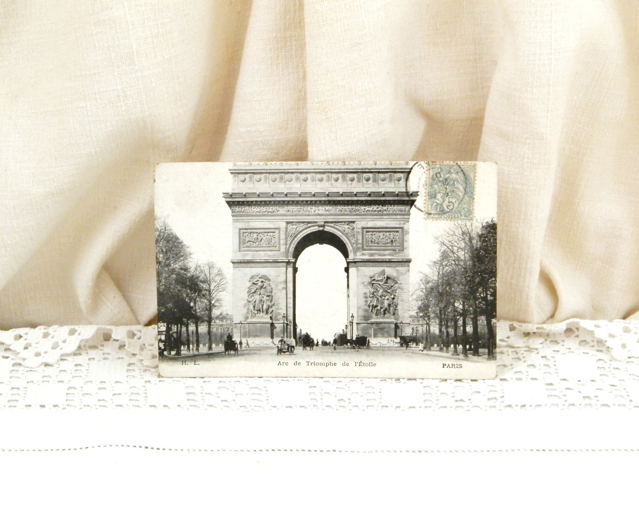 Antique French black and white postcard. Featuring the Arc de Triomphe at the top of the Champs Elysees with horses and carriages and an early automobile. Posted in 1901. Found at a French flea market.