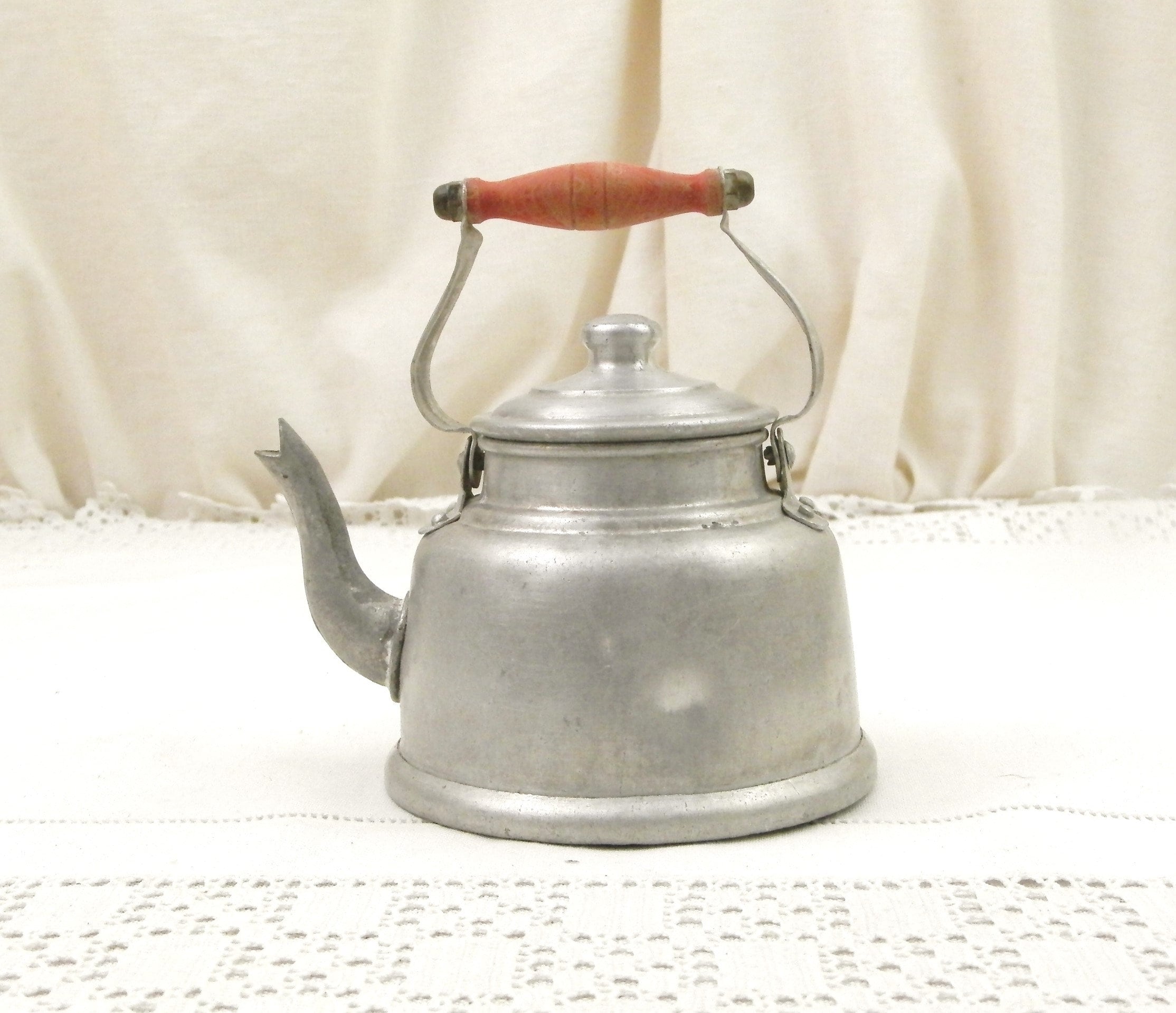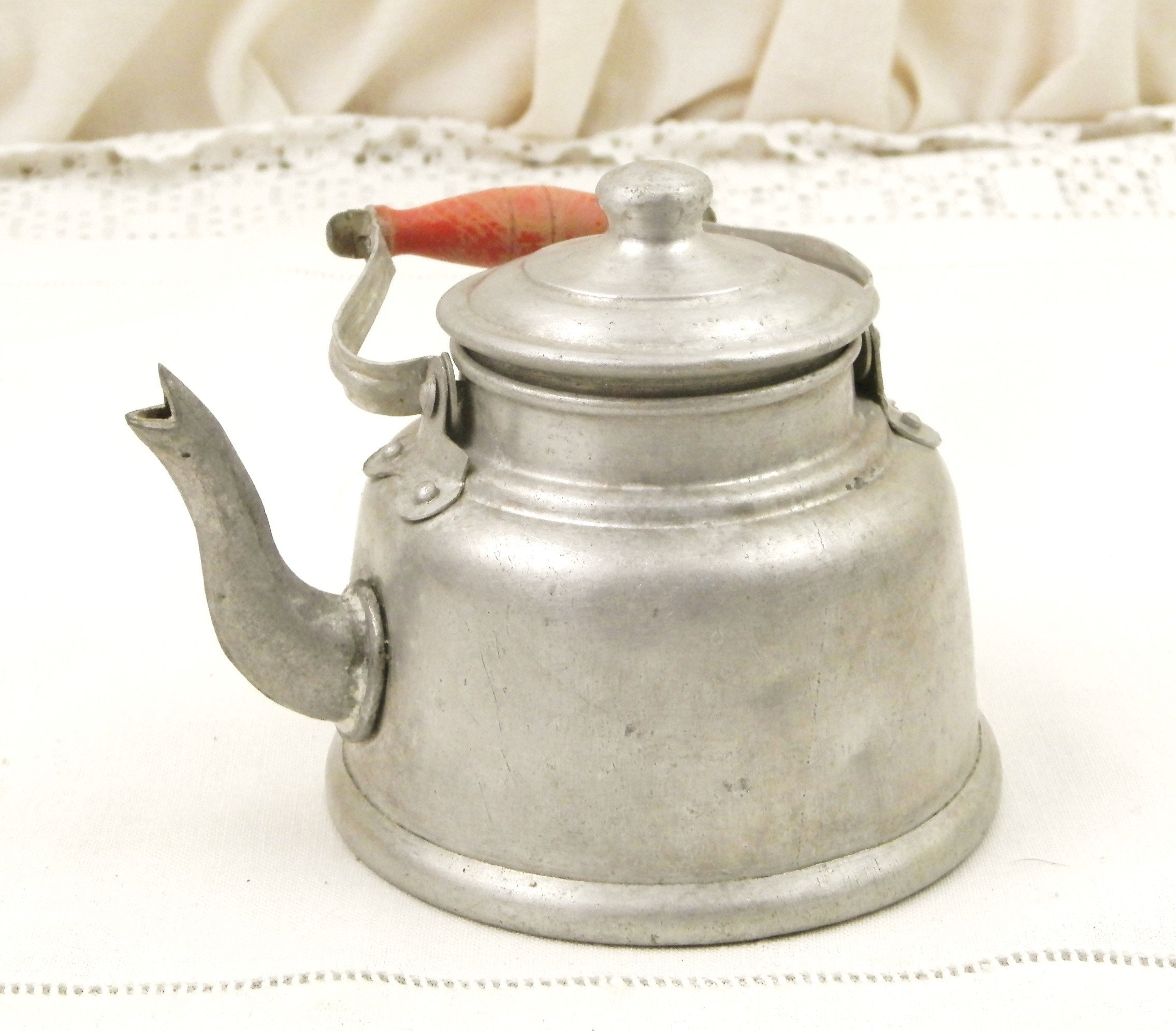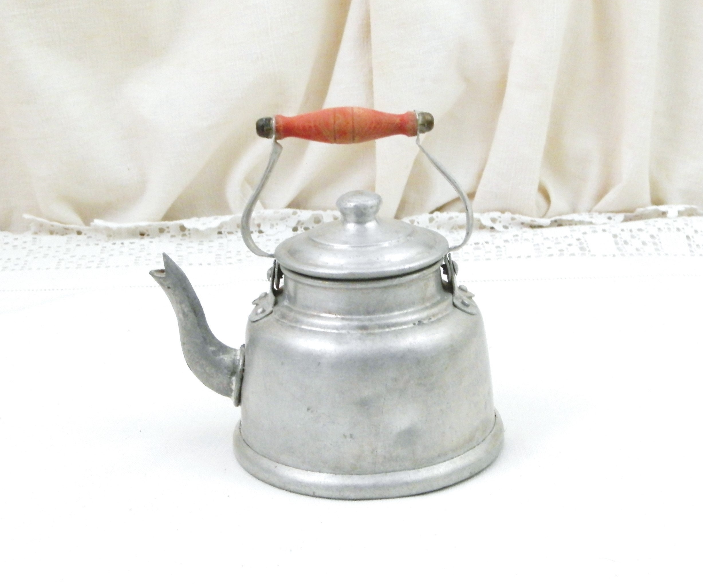 Vintage French metal toy kettle. Made of white metal with a red wooden handle and goose neck spout. Would have been used in a Child's play kitchen circa 1930s. Found at a French flea market in Normandy.