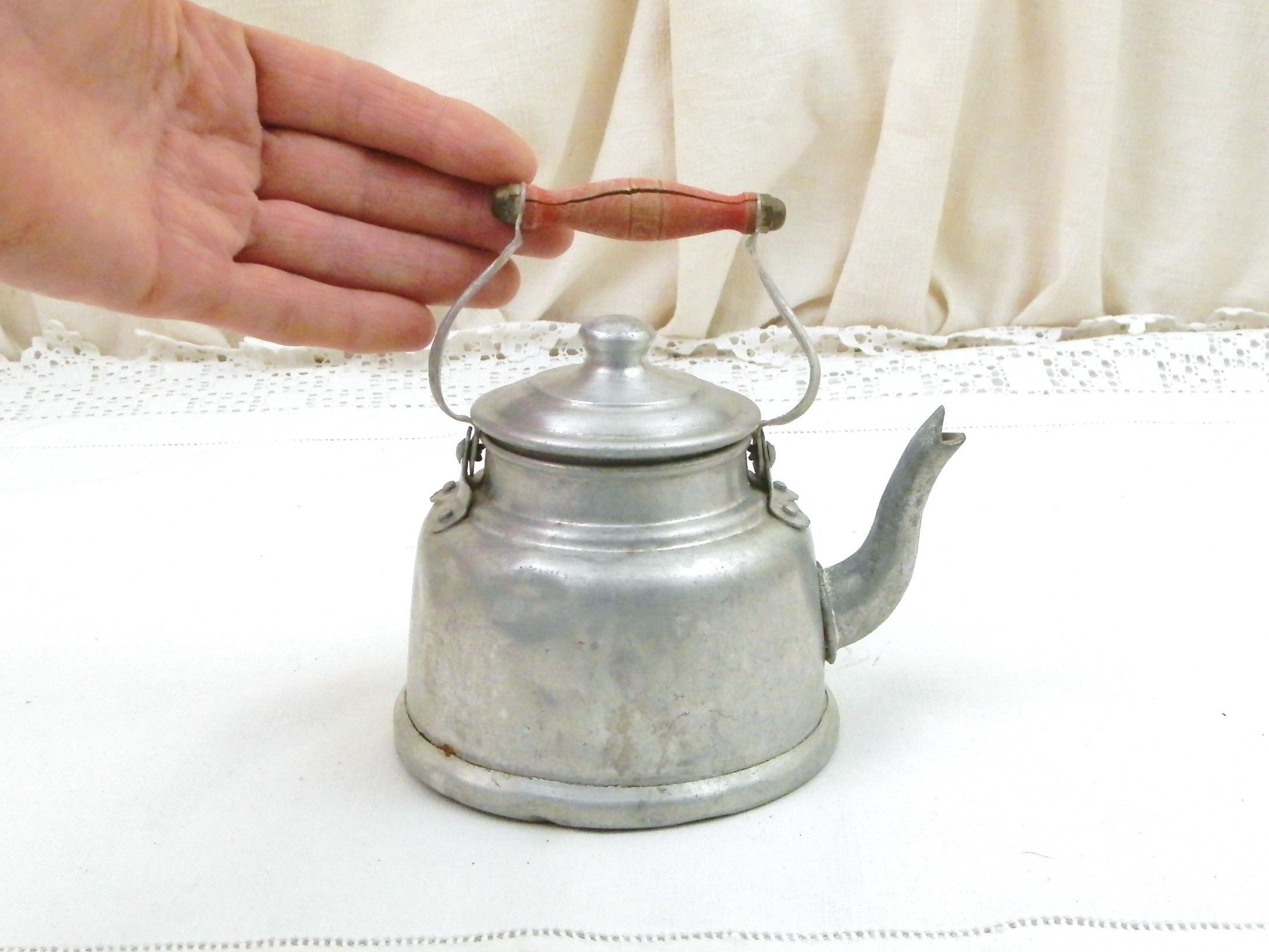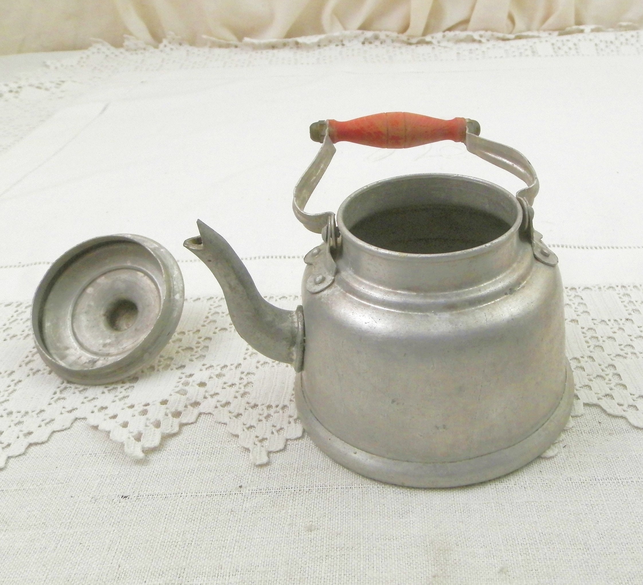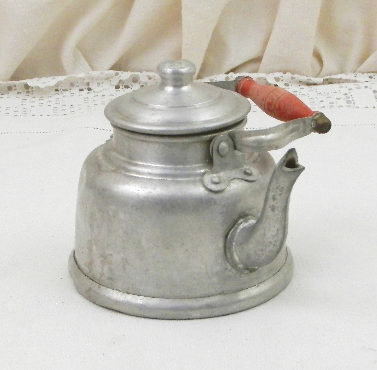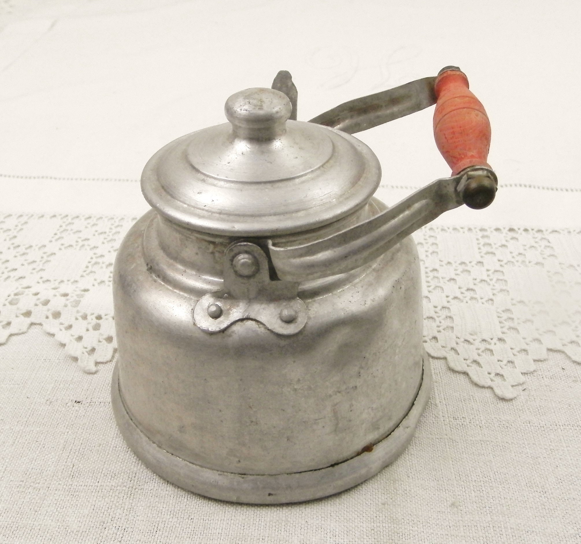 Vintage French metal toy kettle. Made of white metal with a red wooden handle and goose neck spout. Would have been used in a Child's play kitchen circa 1930s. Found at a French flea market in Normandy.