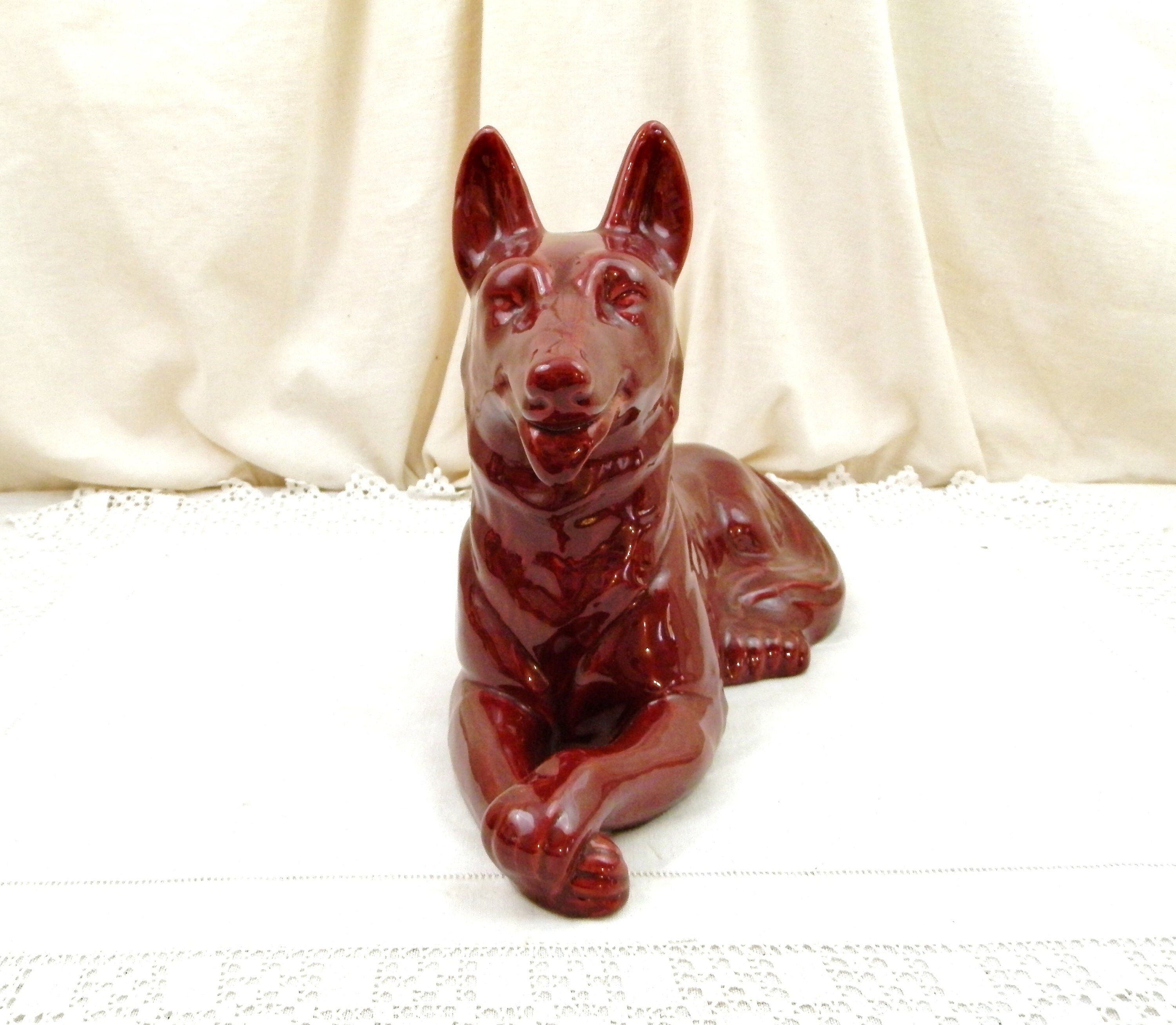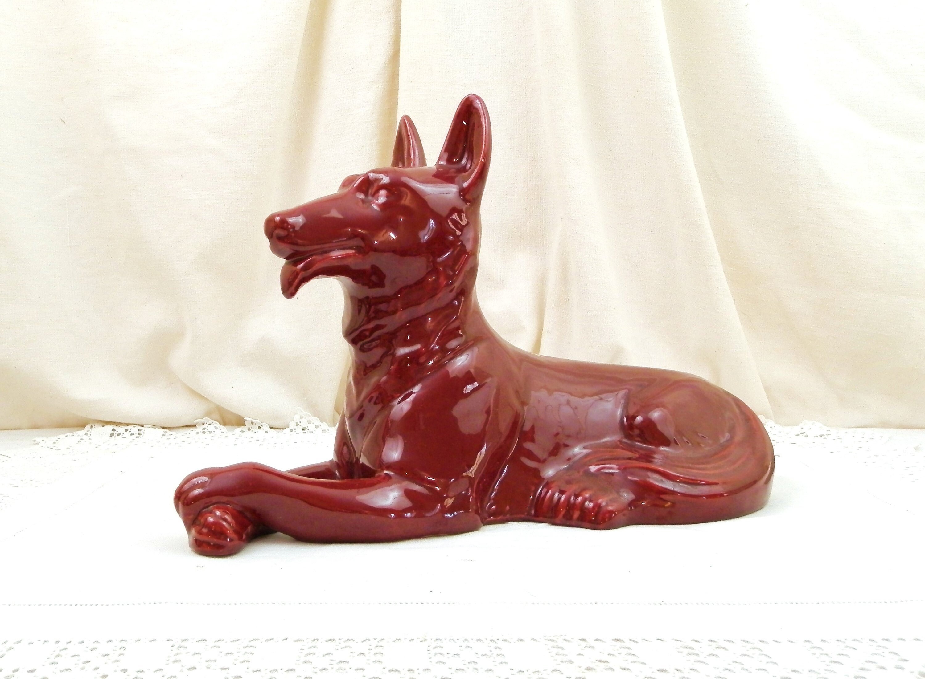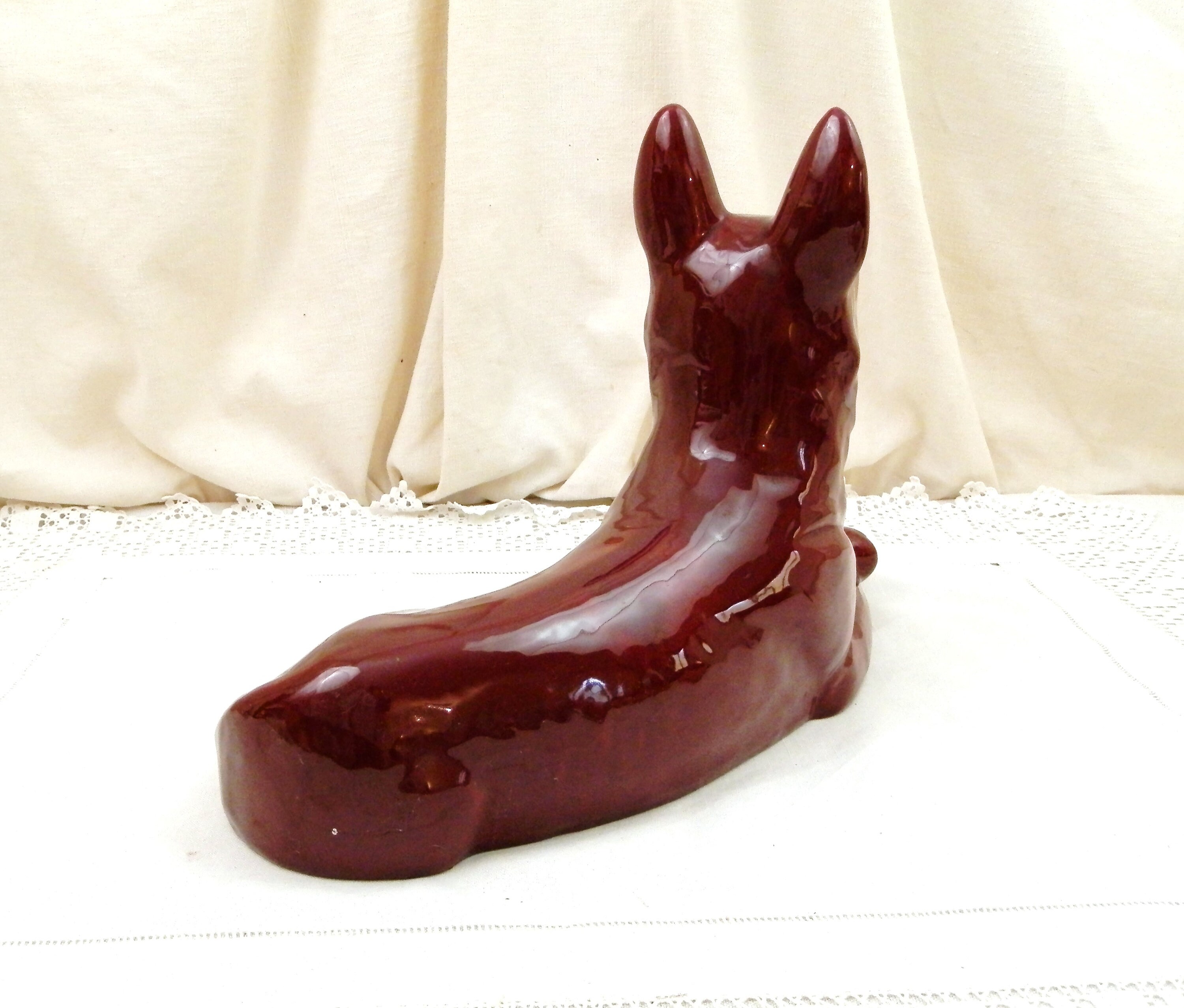 Large vintage retro 1950s cast ceramic statue of an Alsatian dog. Dark maroon glaze. Stamped on the underside made in France, although I can not make out a makers mark. Found at a French flea market in the Loire Valley.