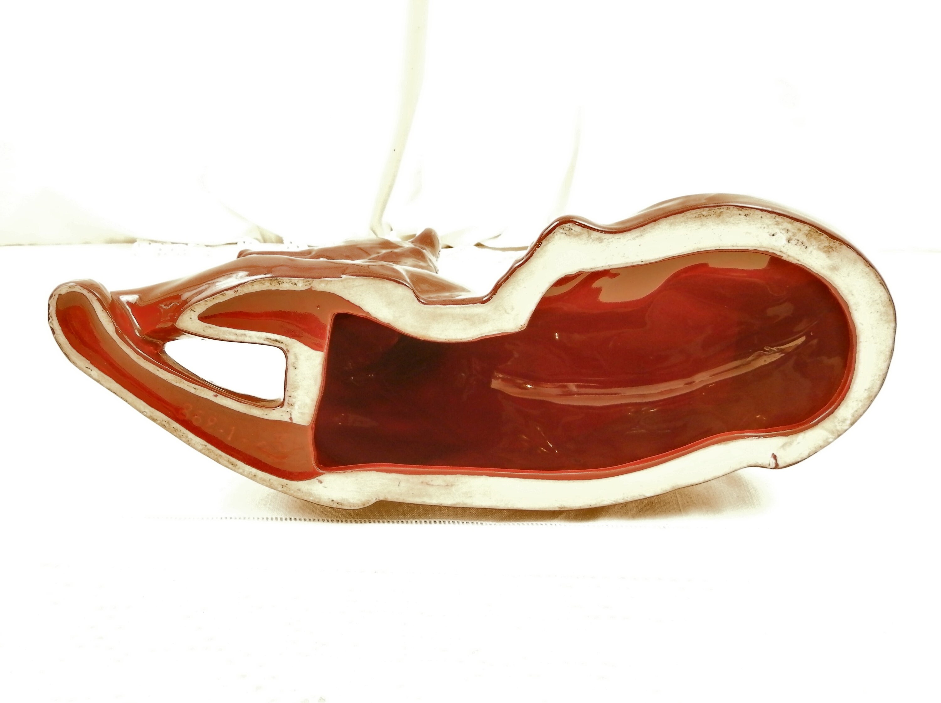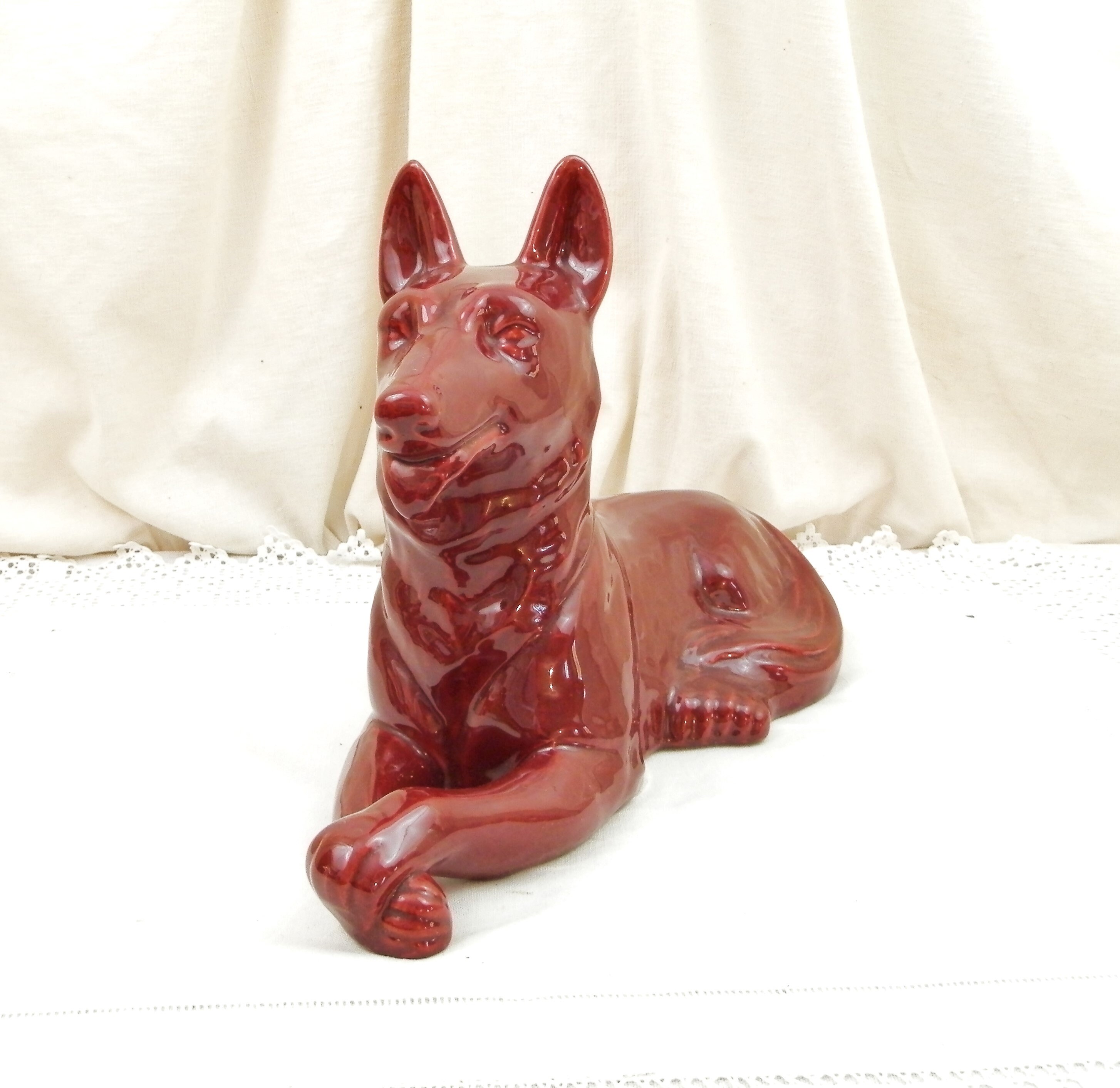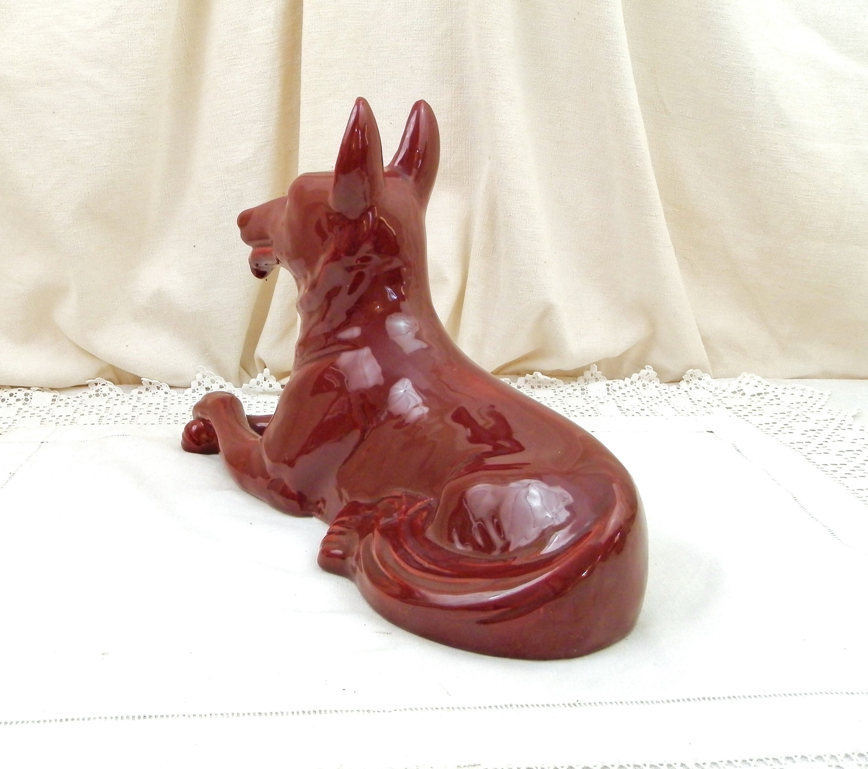 Large vintage retro 1950s cast ceramic statue of an Alsatian dog. Dark maroon glaze. Stamped on the underside made in France, although I can not make out a makers mark. Found at a French flea market in the Loire Valley.