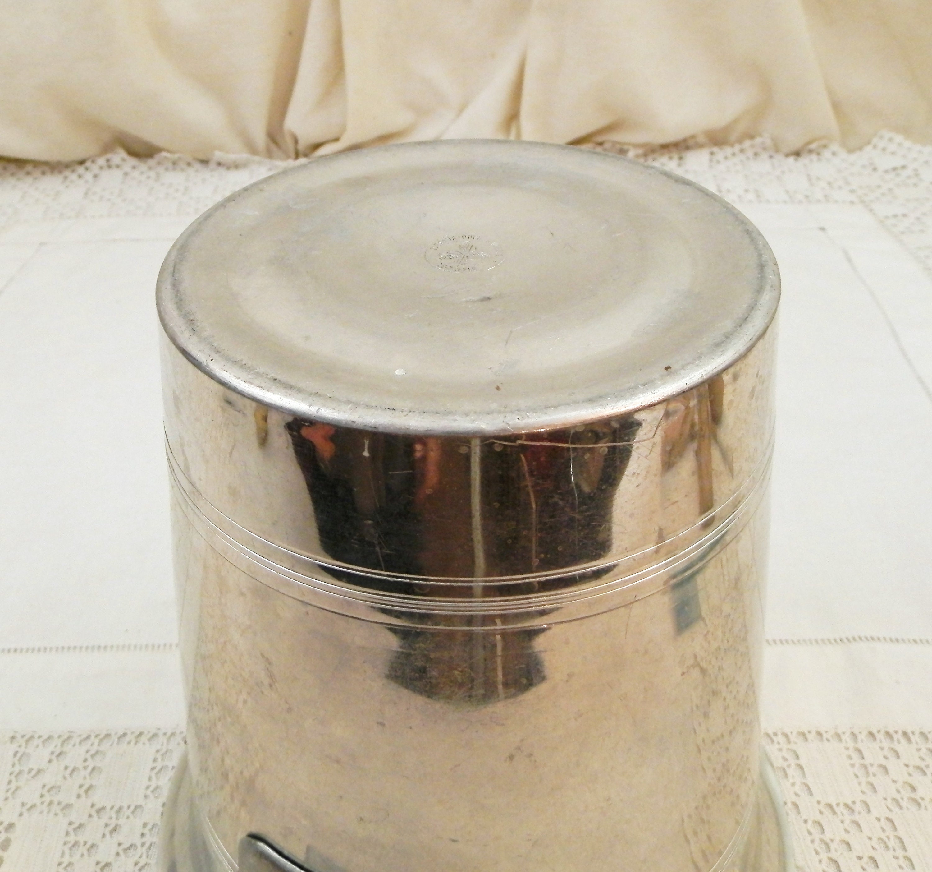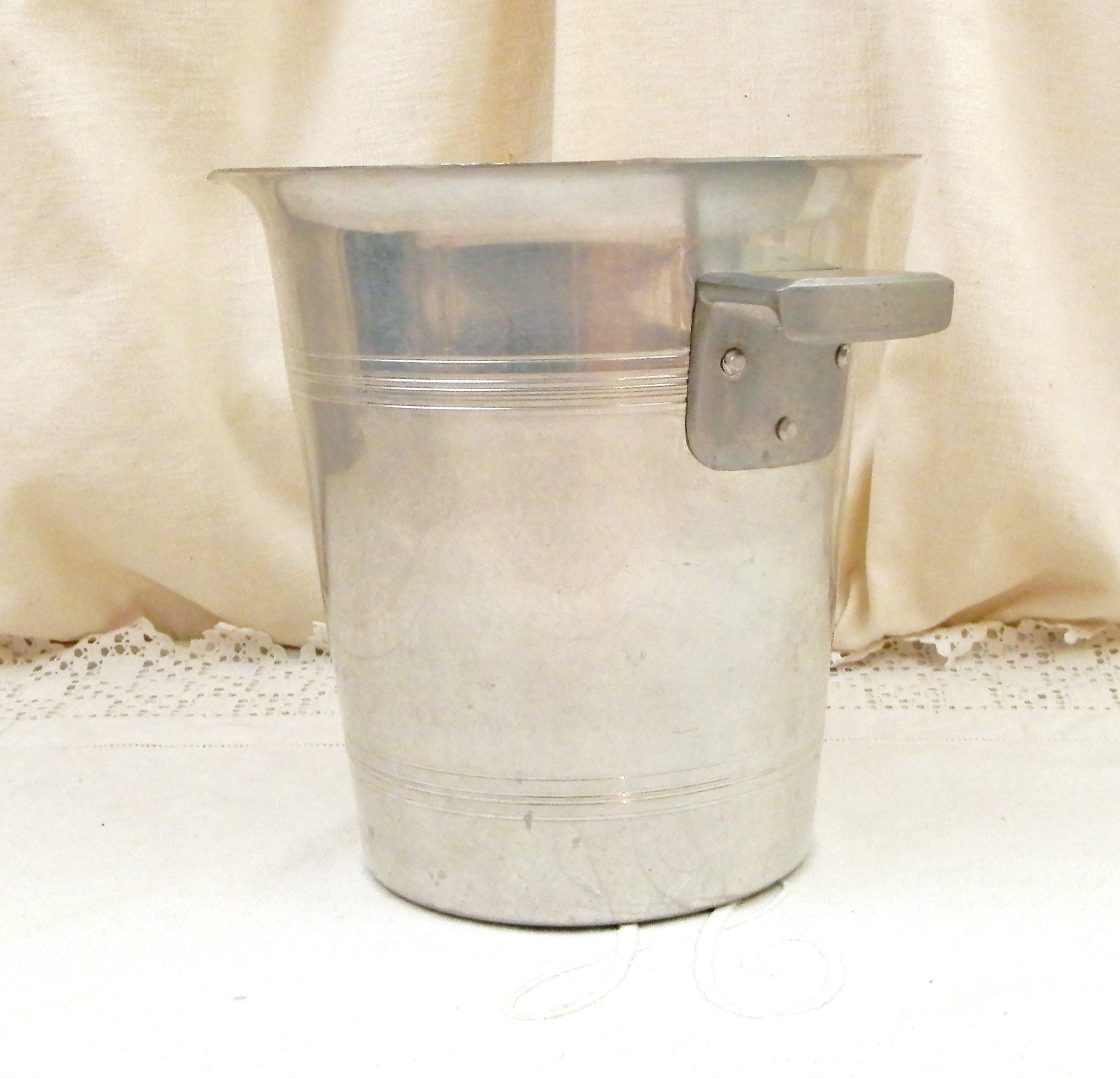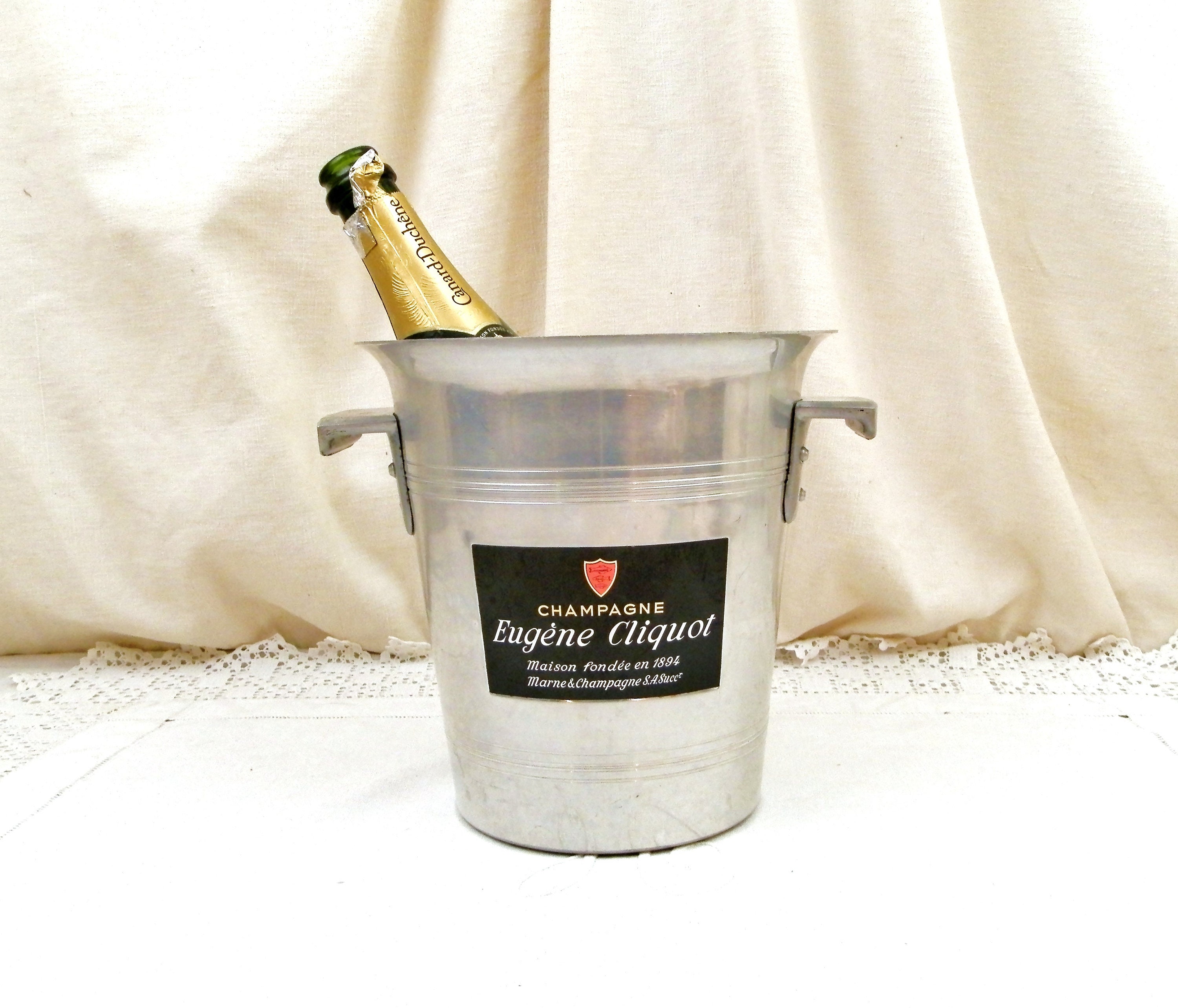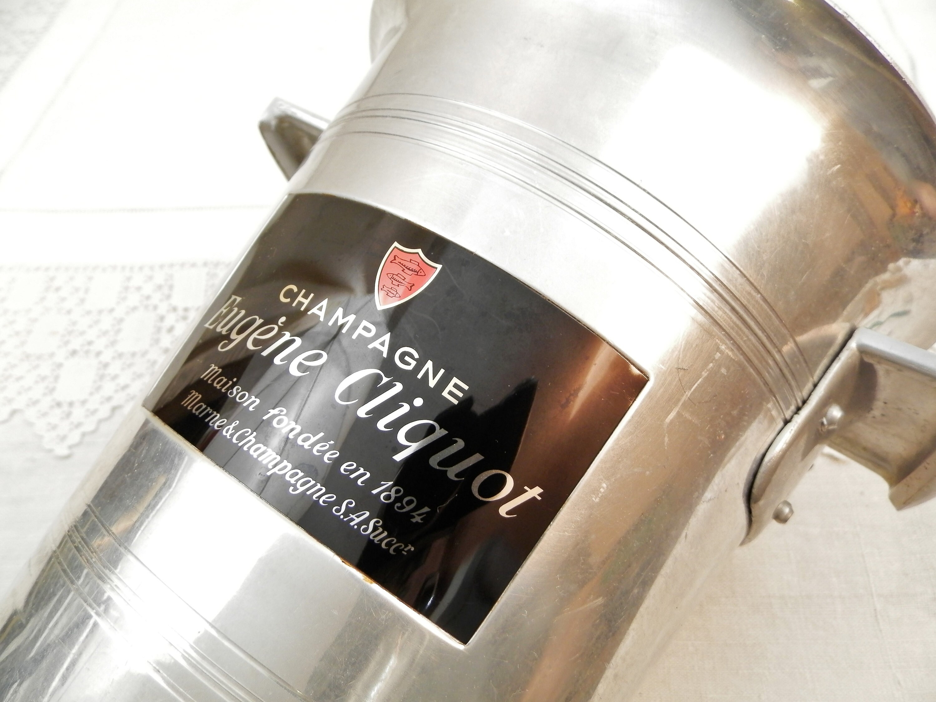 Vintage French champagne ice bucket. Made in France for Eugen Clicquot Est 1894. Made of white metal with the black, gold, silver and red logo on one side. Stamped Le Trefle Metaux Ouvres Vesoulon on the base. 2 side handles. Found at a French flea market in the Loire Valley.