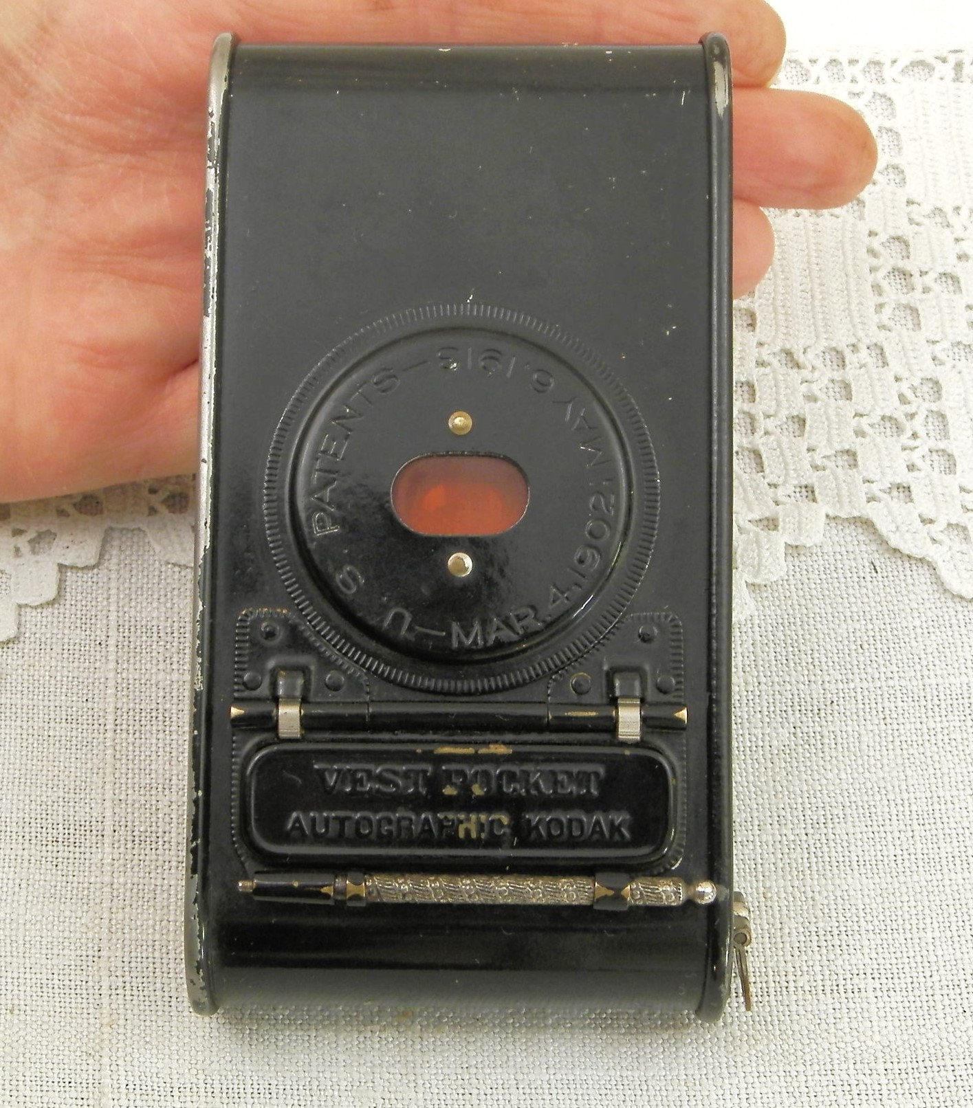Antique folding pocket camera by Kodak The Vest Pocket Autographic Kodak was a version advertised as "Soldier's camera" during WWI. It was manufactured from 1915 to 1926. It was of the compact strut folding type and had the meniscus lens or a U.S.-speed 8 Rapid Rectilinear. Its camera back had an area through which notes could be written onto the paper backing of the 127 film, the "autographic" feature - invented by Henry J. Gaisman. Vest Pocket Autographic Special models were equipped with selected f/6.9 and f/7.7 lenses of Kodak