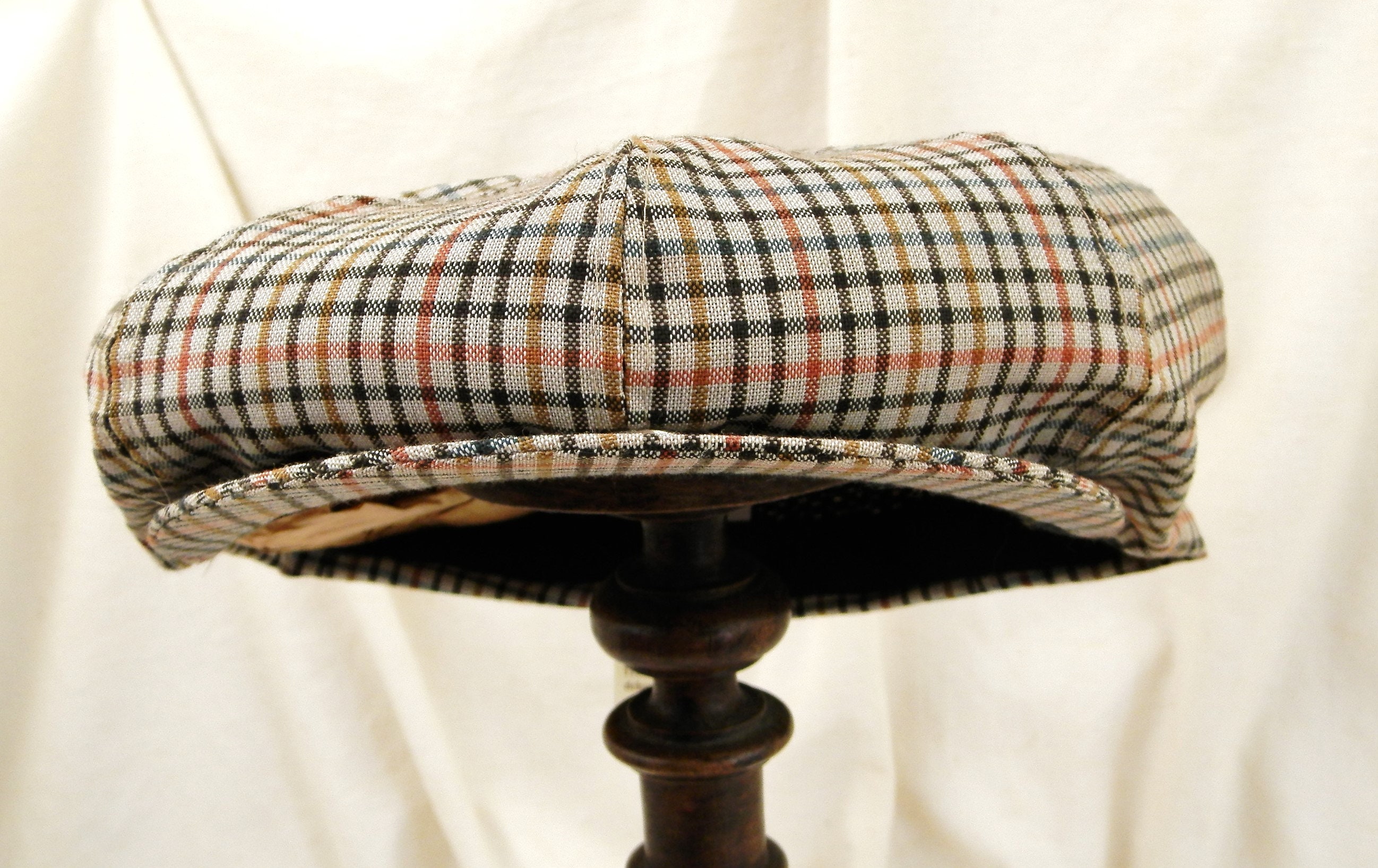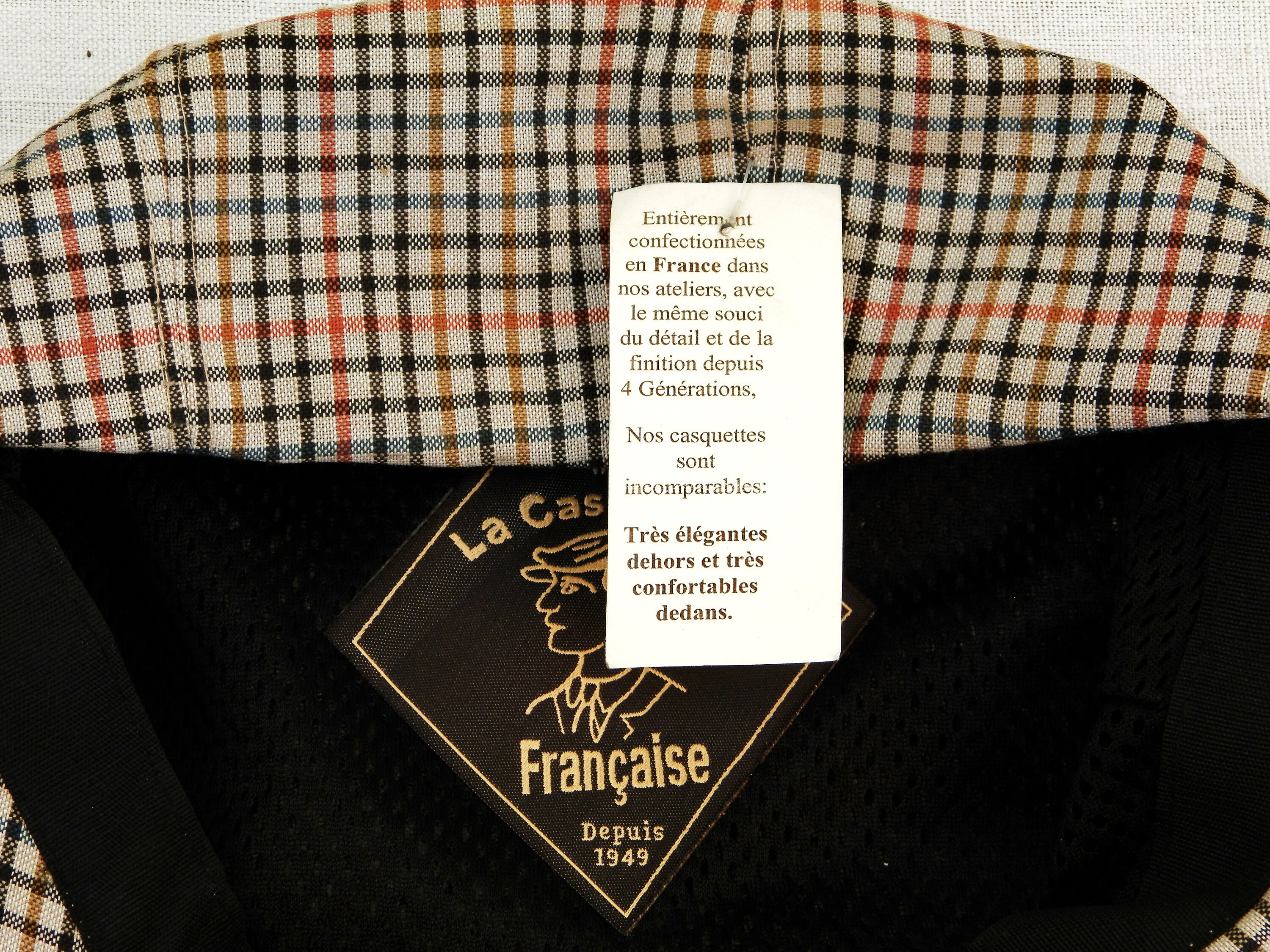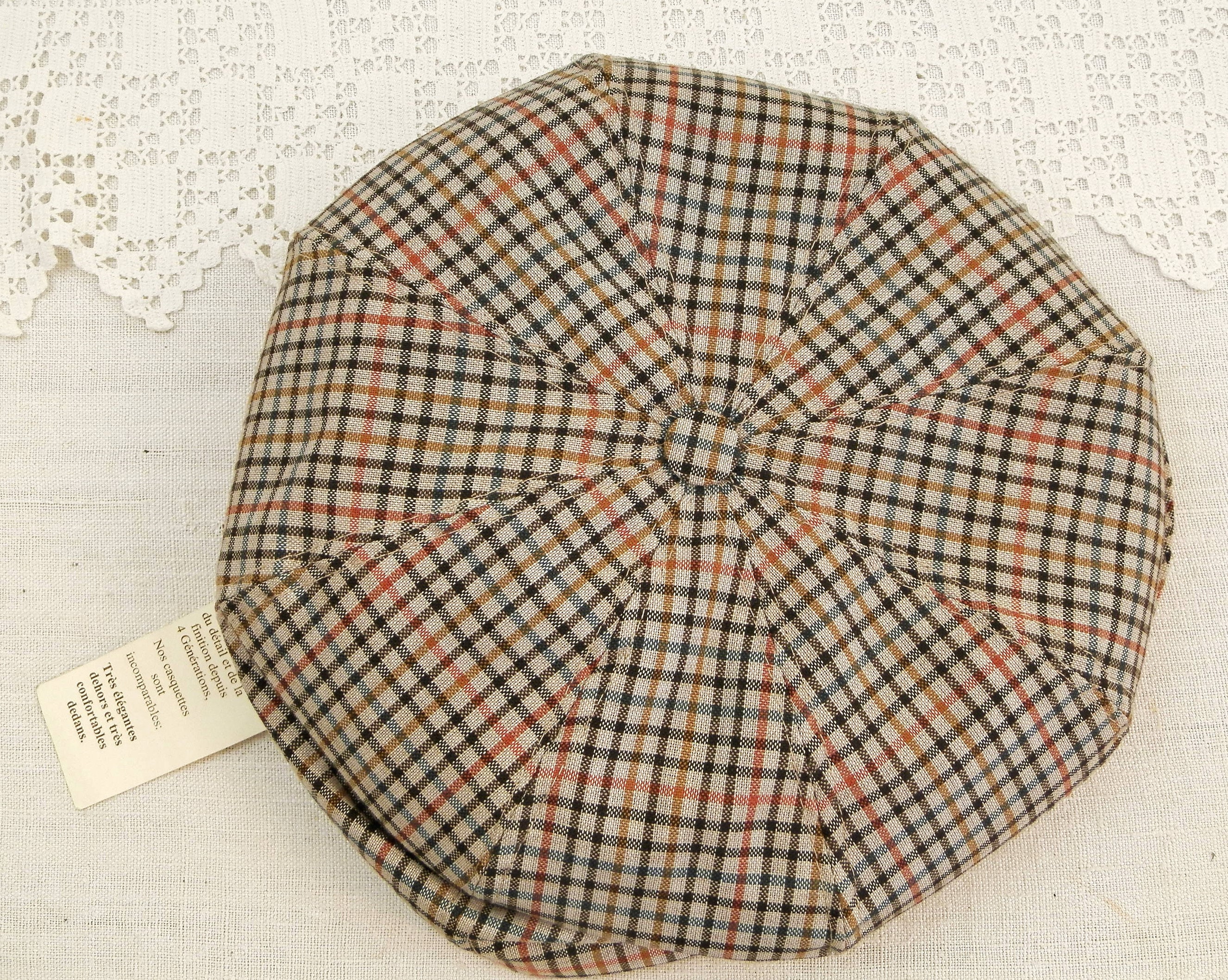 Vintage French cloth flat cap. Unused old new stock from a French hat shop in the town of Sablé sur Sarthe Western France. Made of 45 % wool, 55% Polyester. Size 61. Popper on the brim. Brown colored chequered patterned cloth. Manufactured in France by the company La Casquette Française.