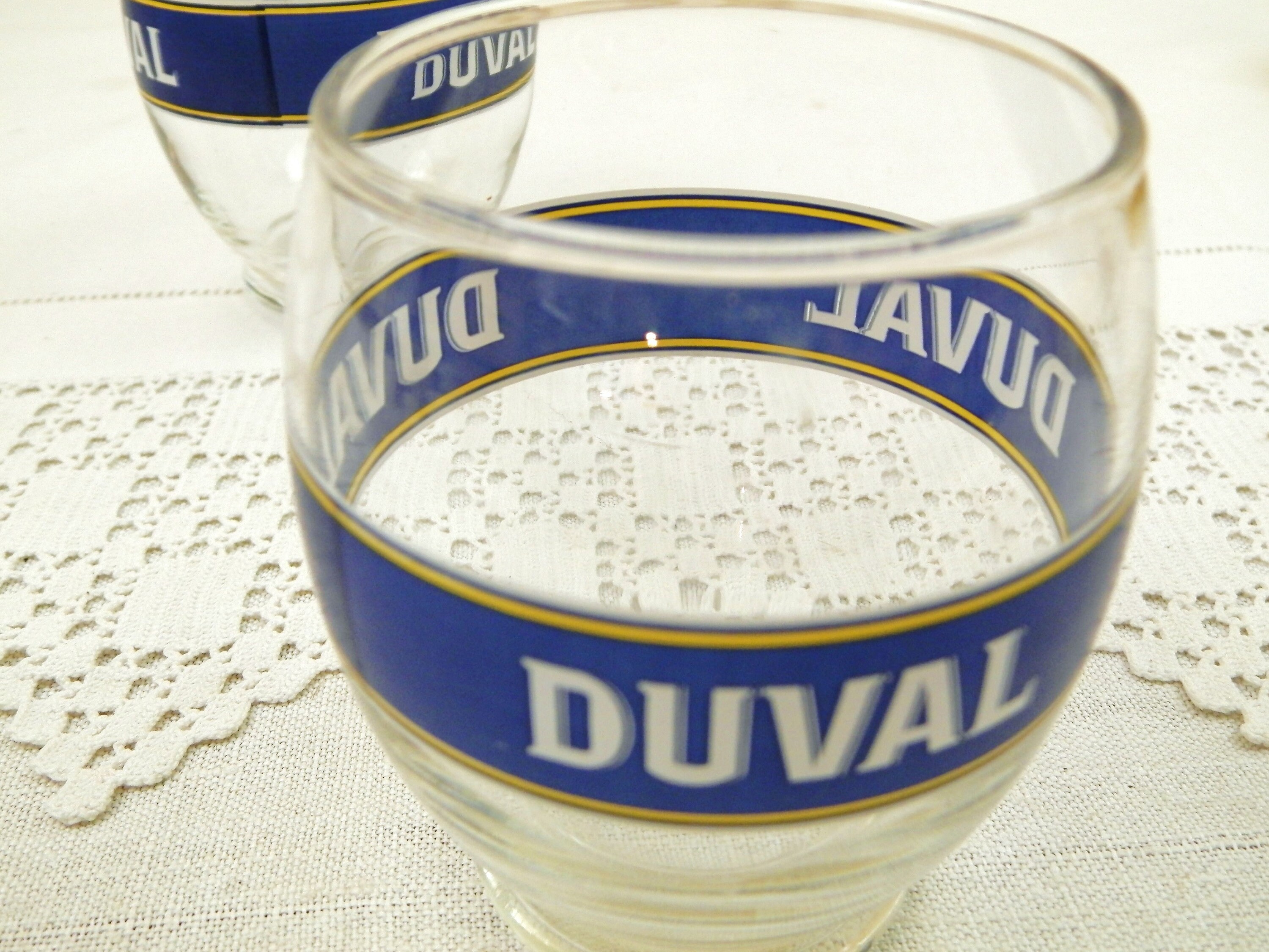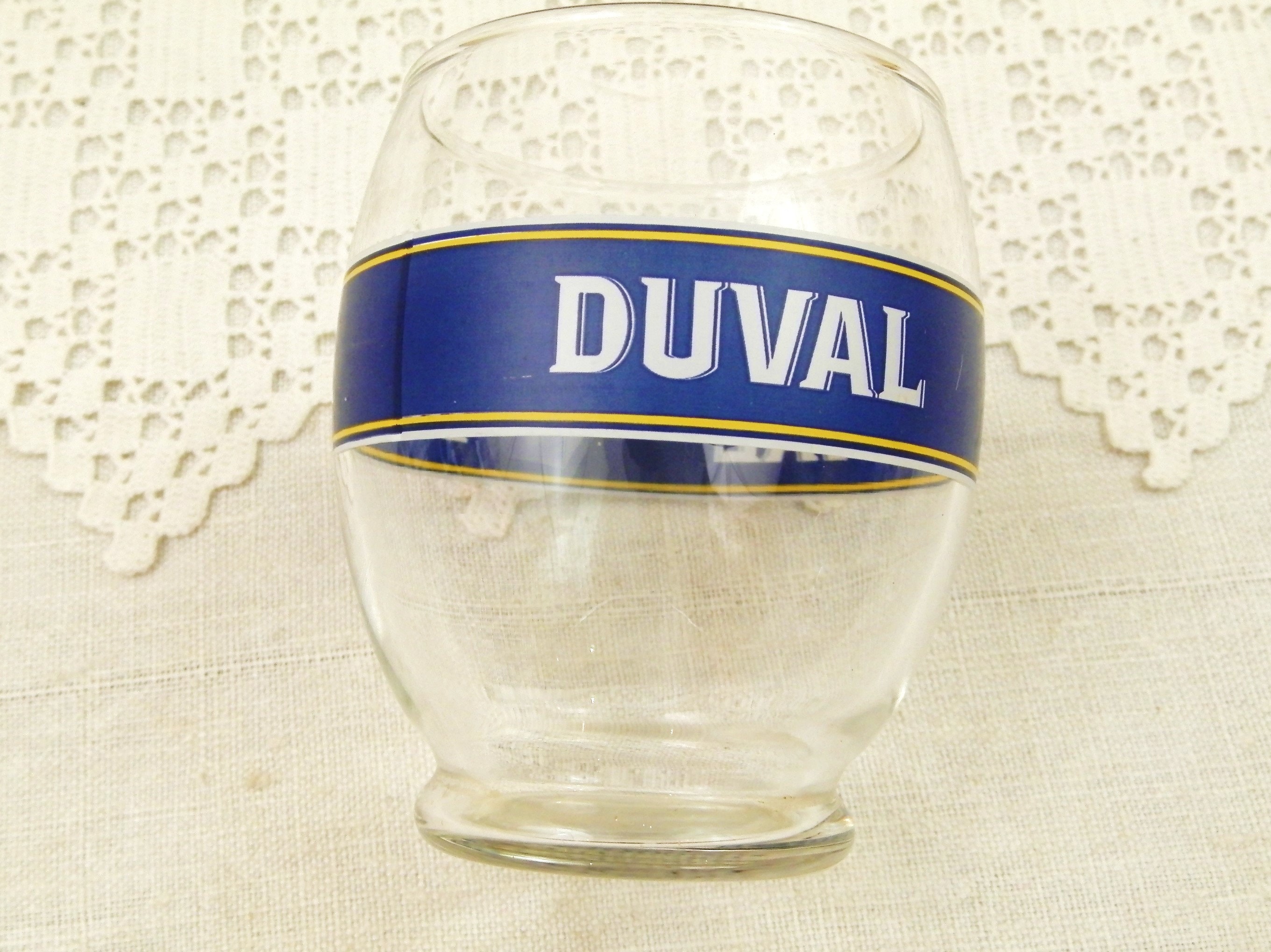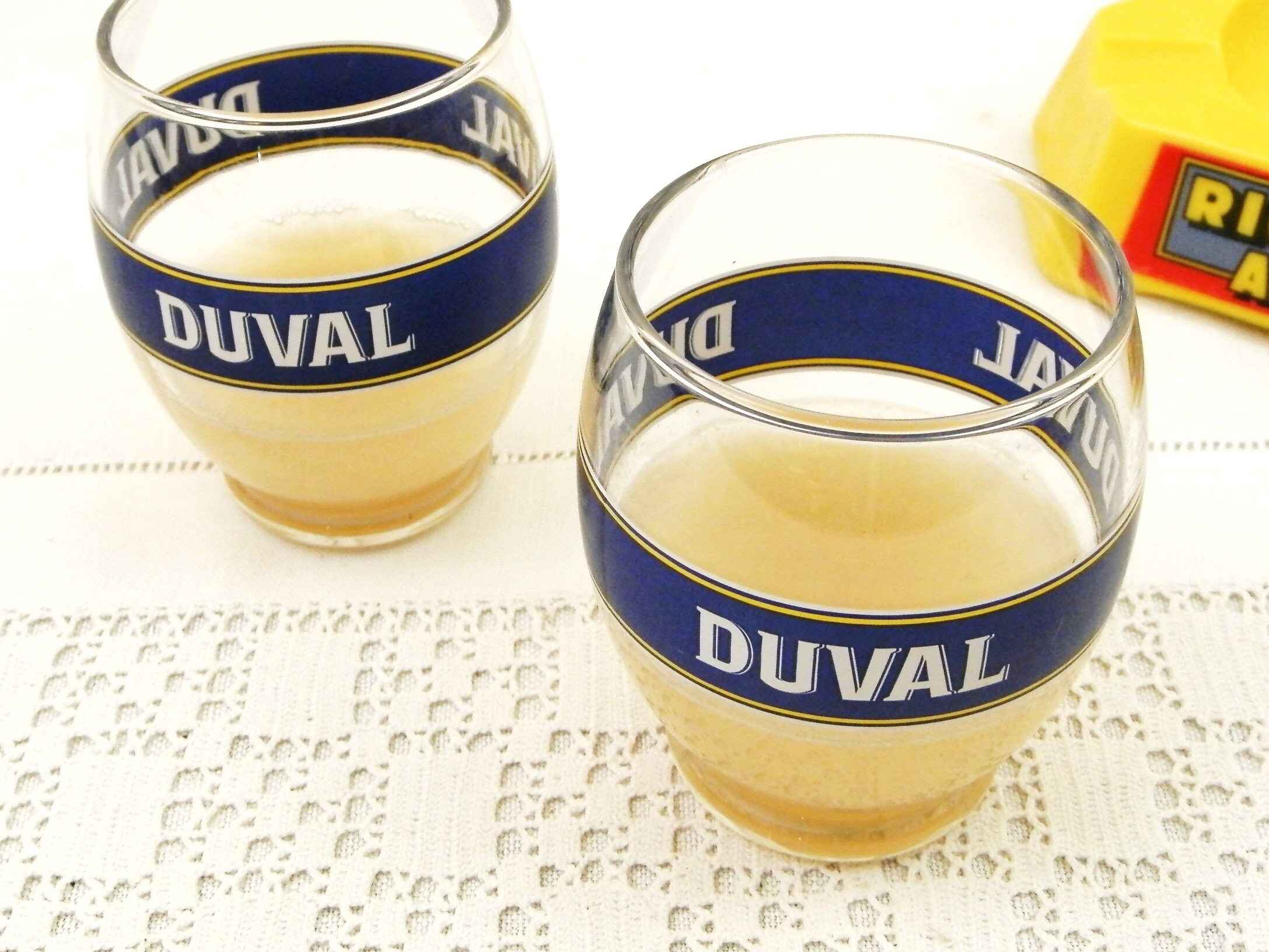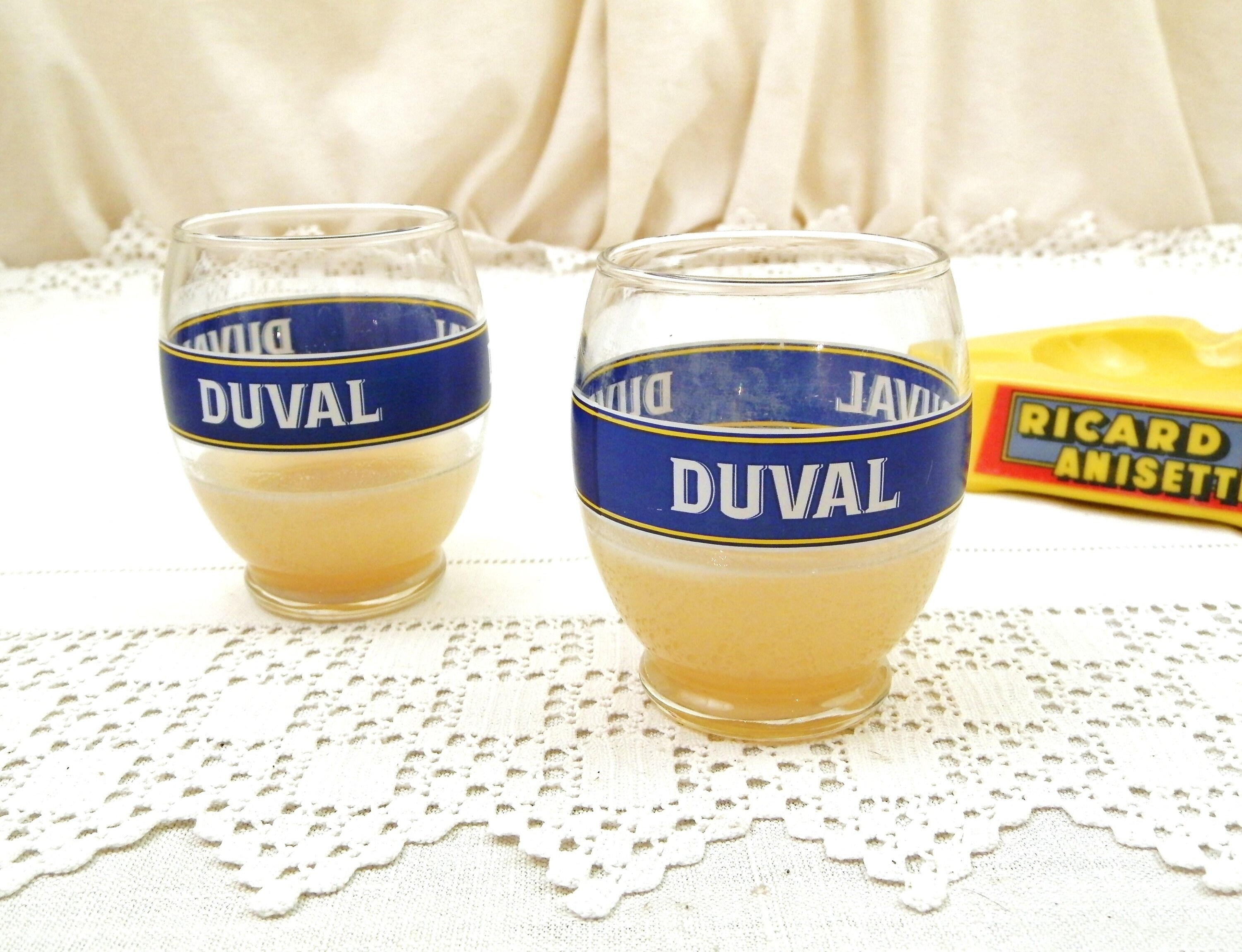 Pair of matching French vintage Duval glasses. Made of clear glass with white lettering on blue. Duval is a anisette aperitif drink originally from the south of France but popular all over the country. Found at a French flea market in Normandy.