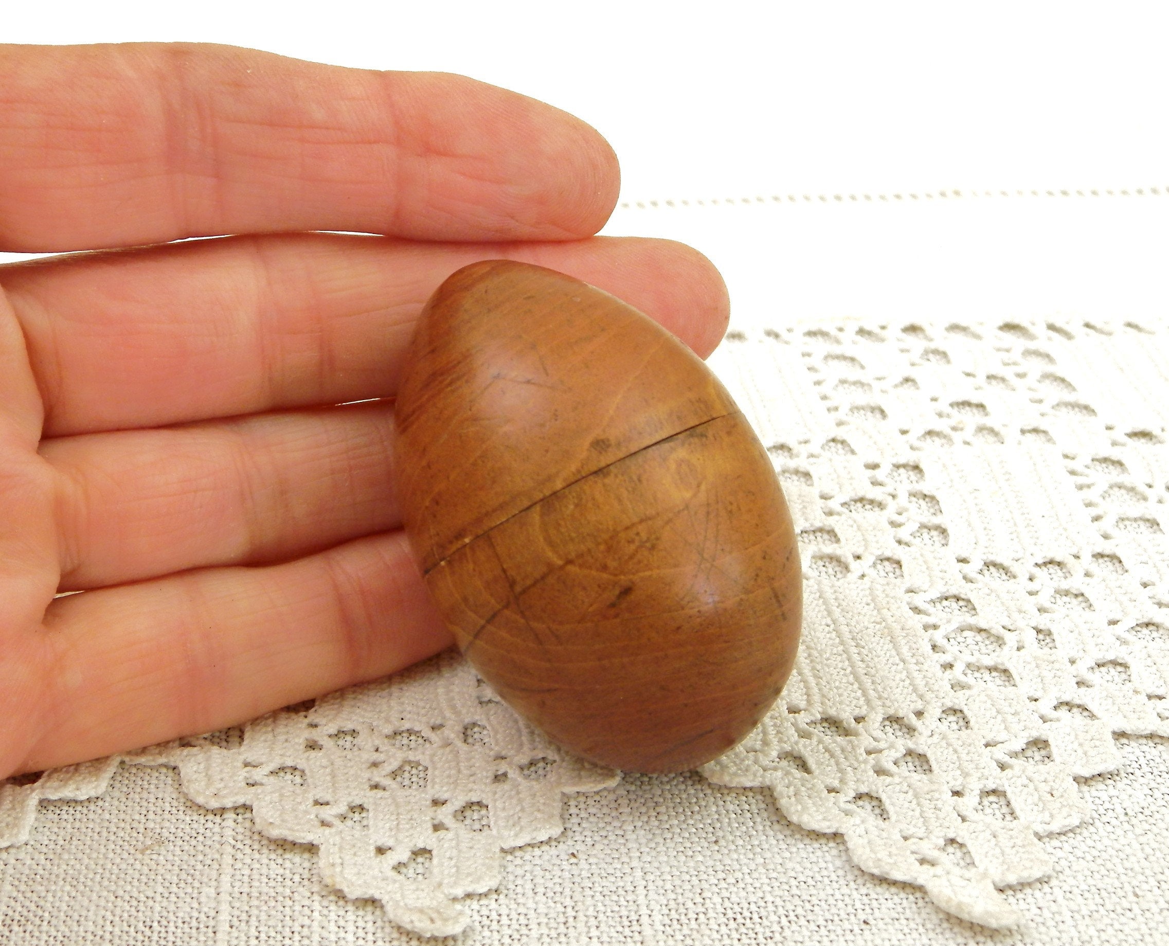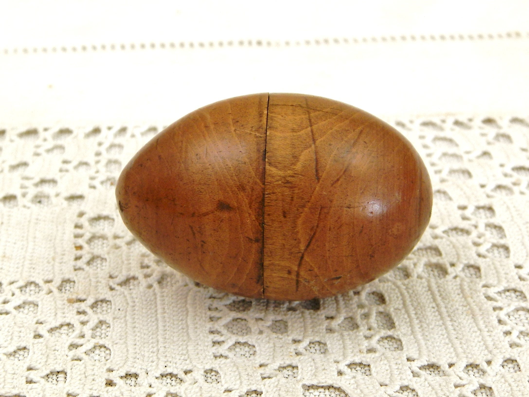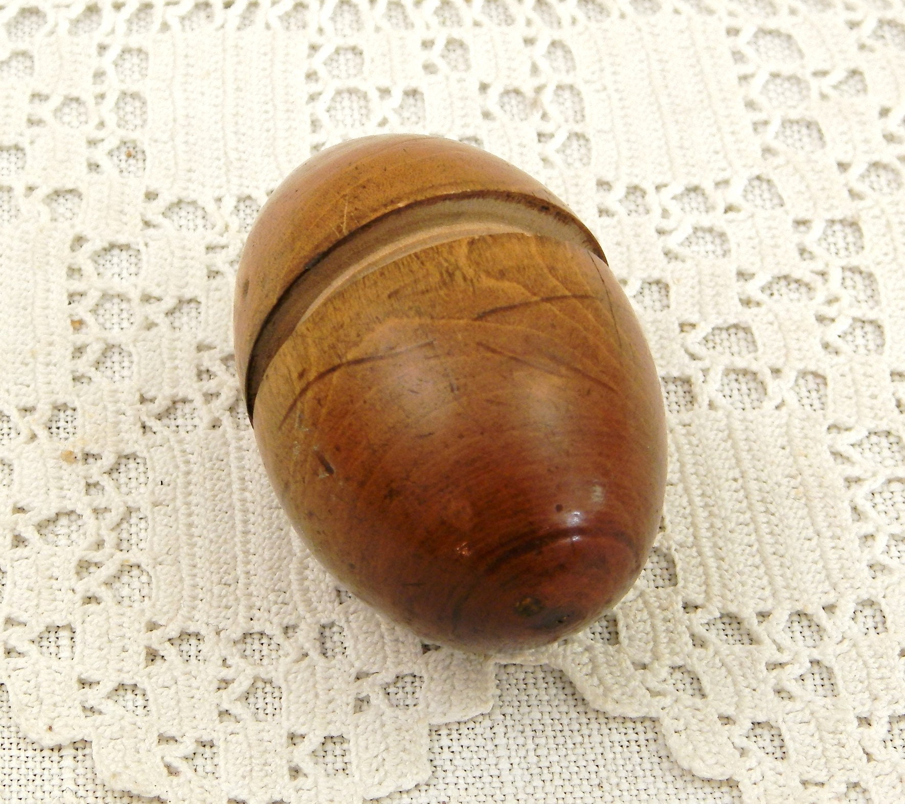 Small antique French treen egg shaped box. Made of turned fruit wood. Polished patina with years of use. Very often containers such as this were use to store a rosary. Found at a French flea market in Normandy.