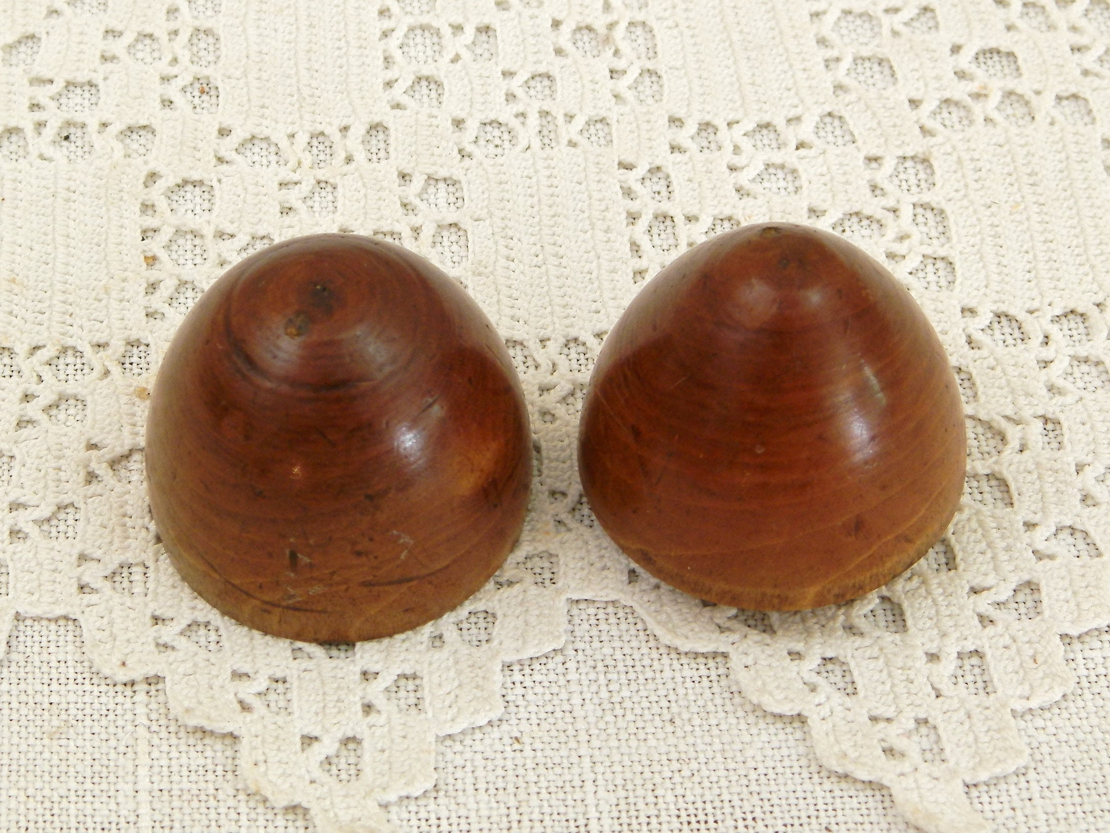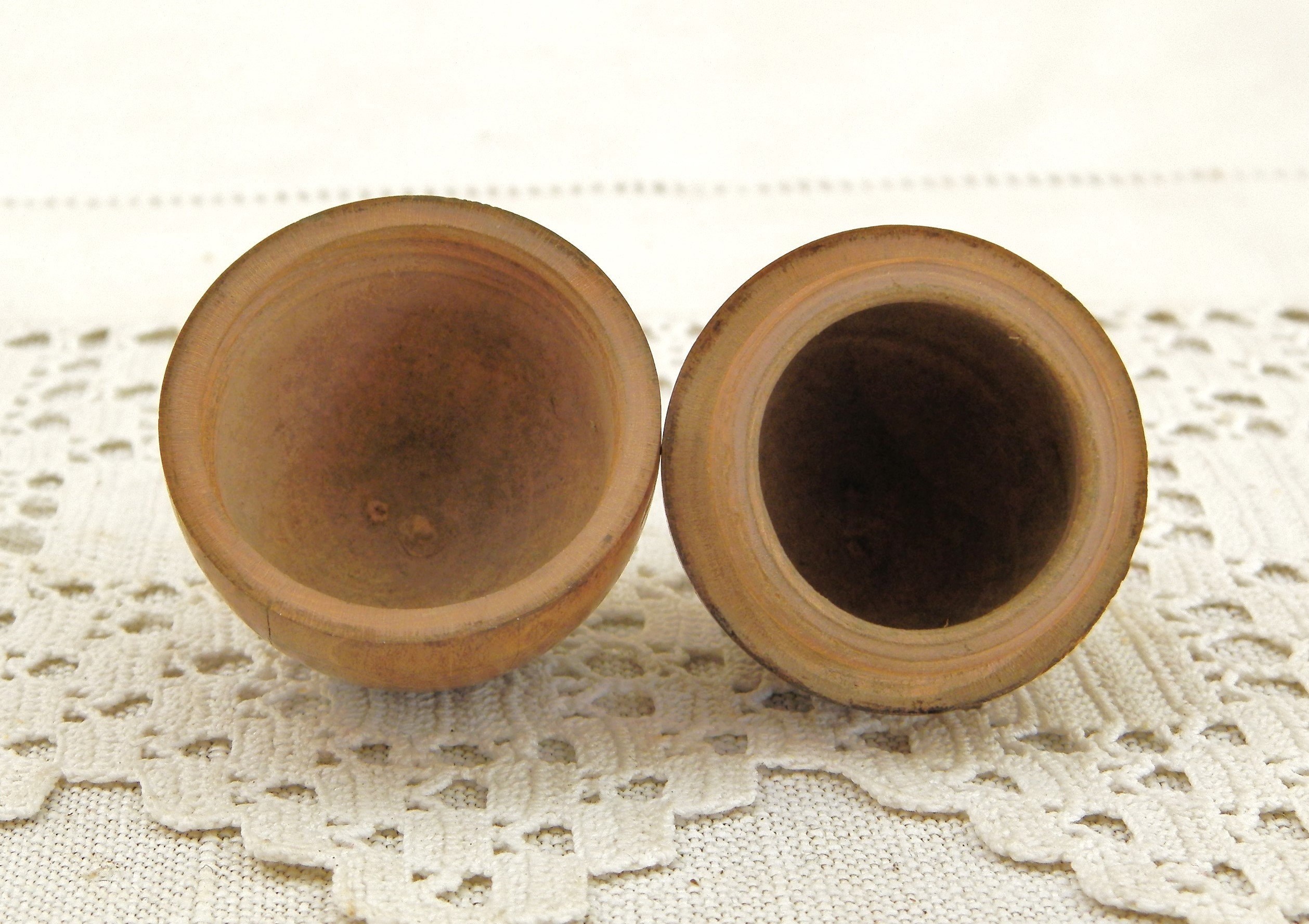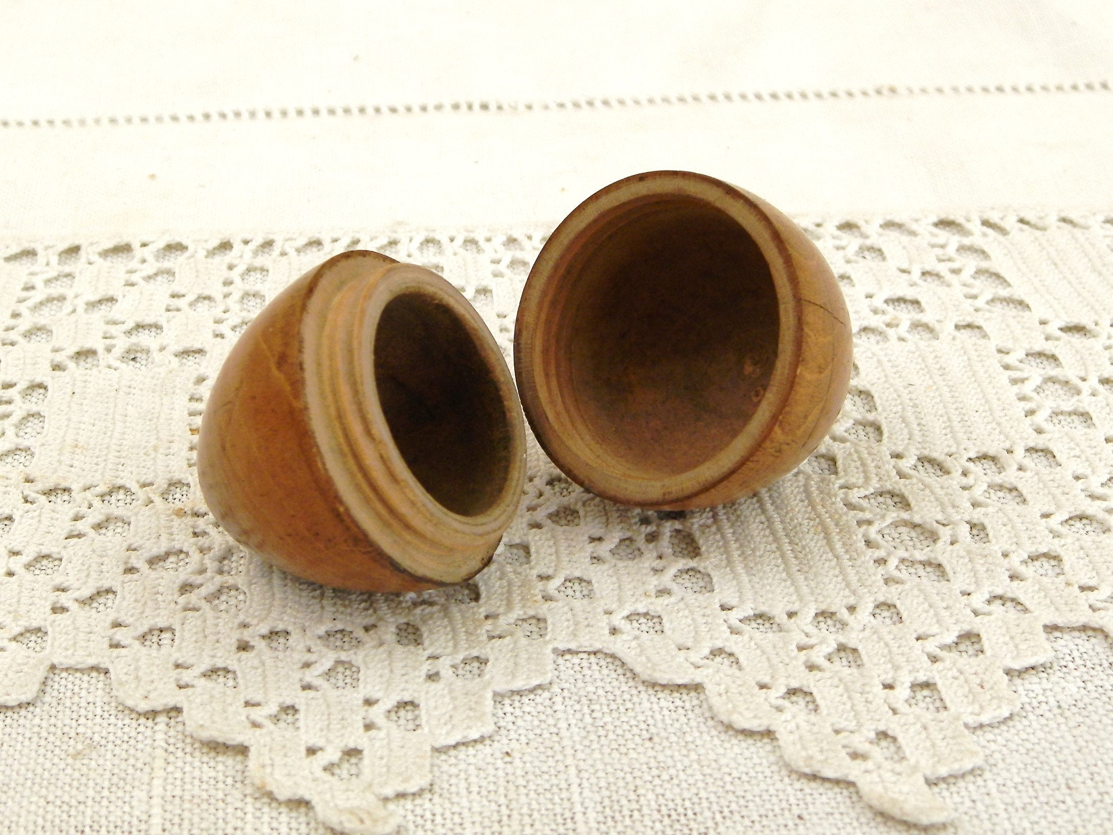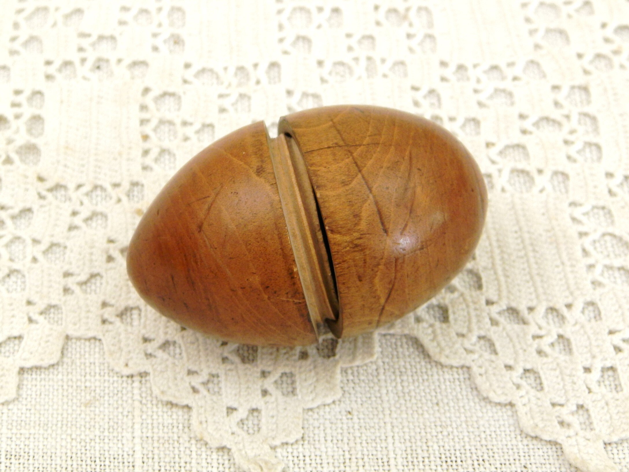 Small antique French treen egg shaped box. Made of turned fruit wood. Polished patina with years of use. Very often containers such as this were use to store a rosary. Found at a French flea market in Normandy.