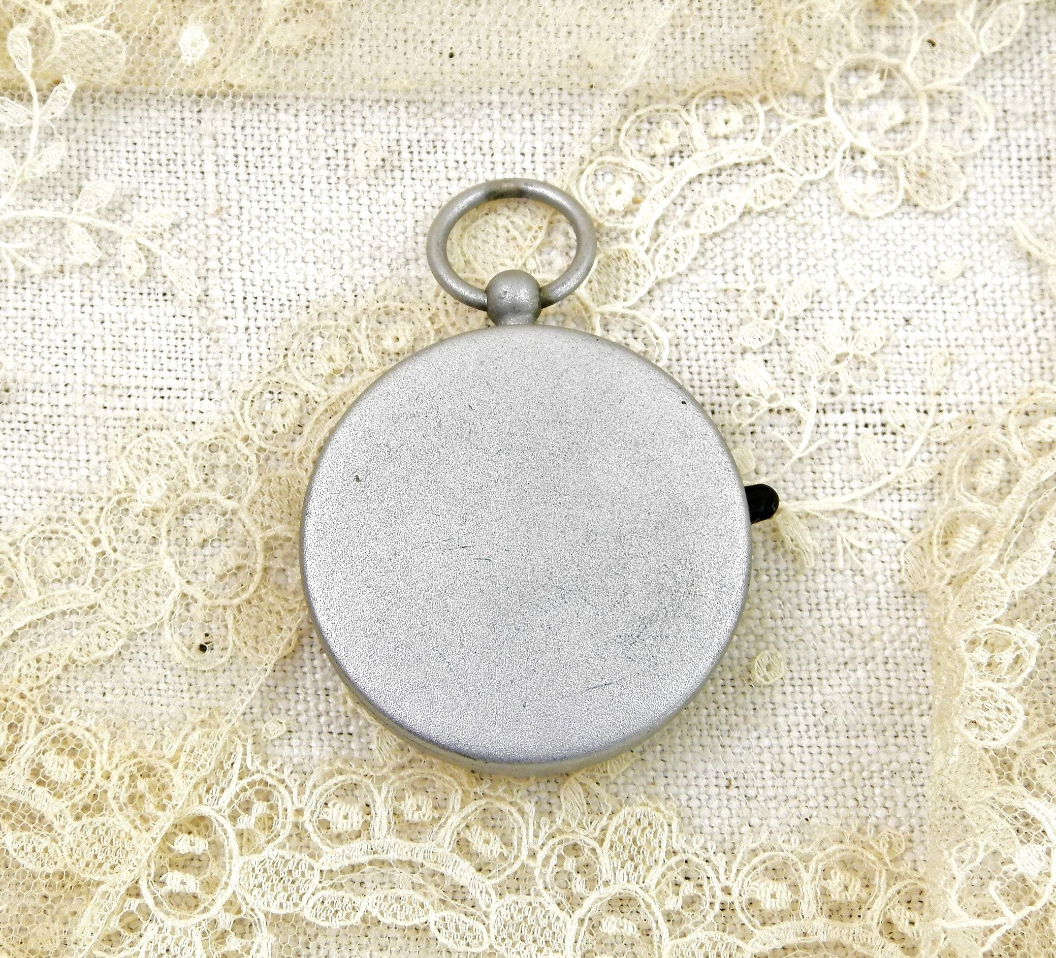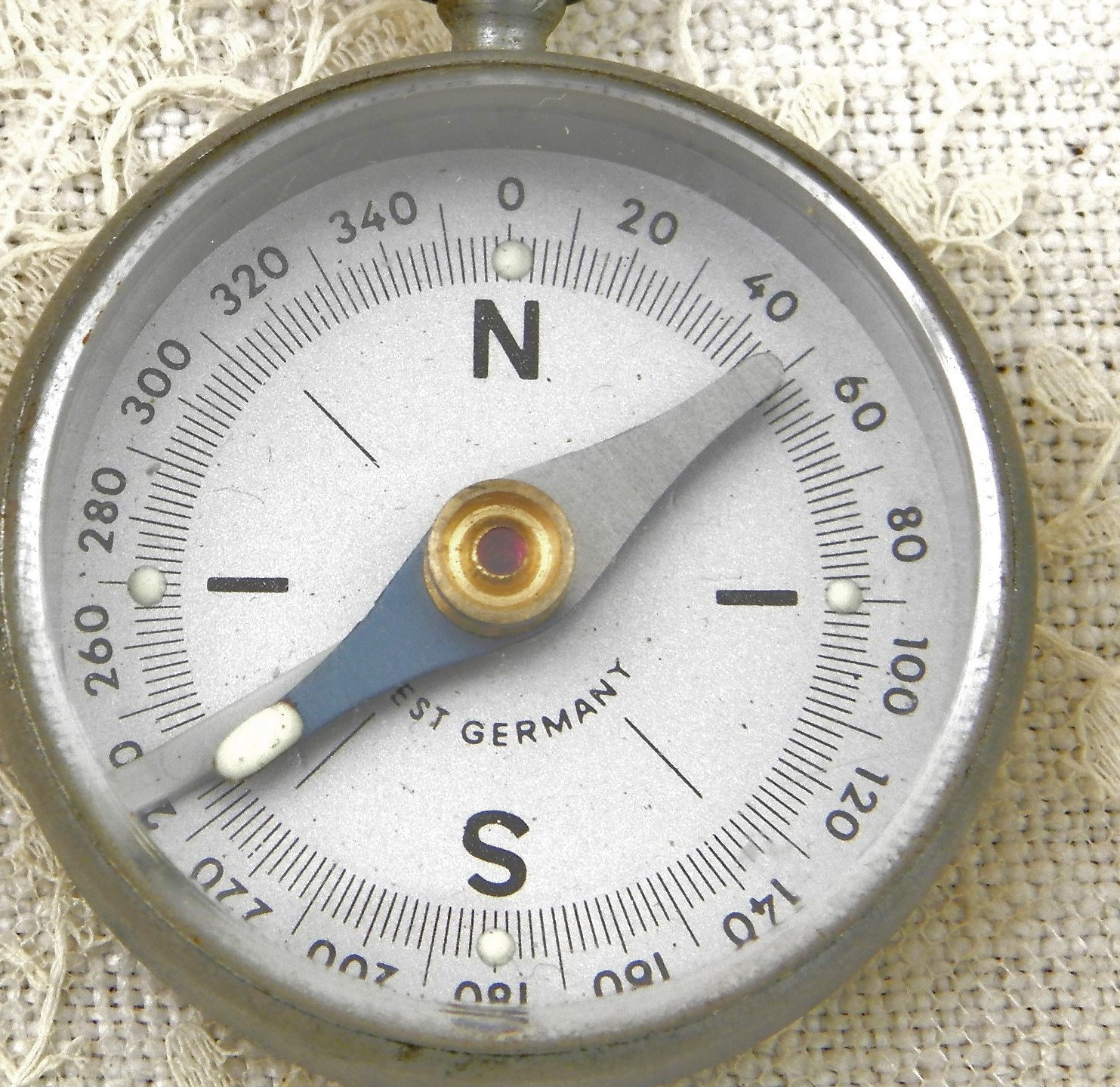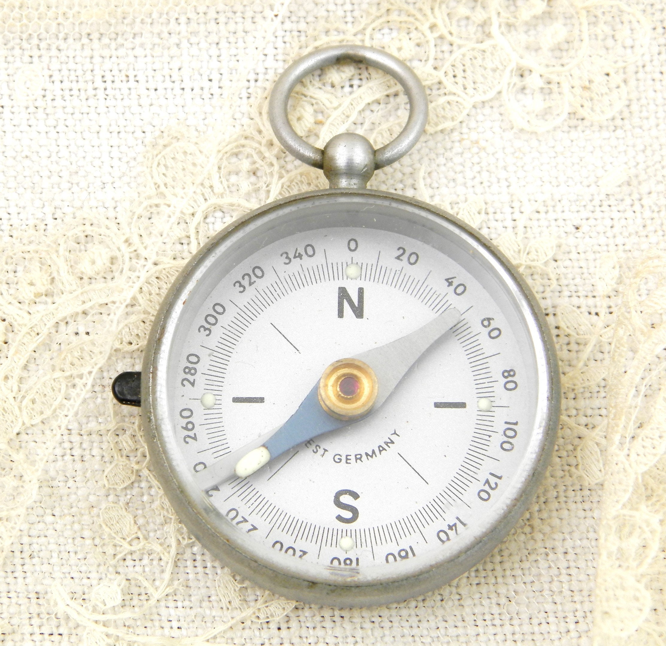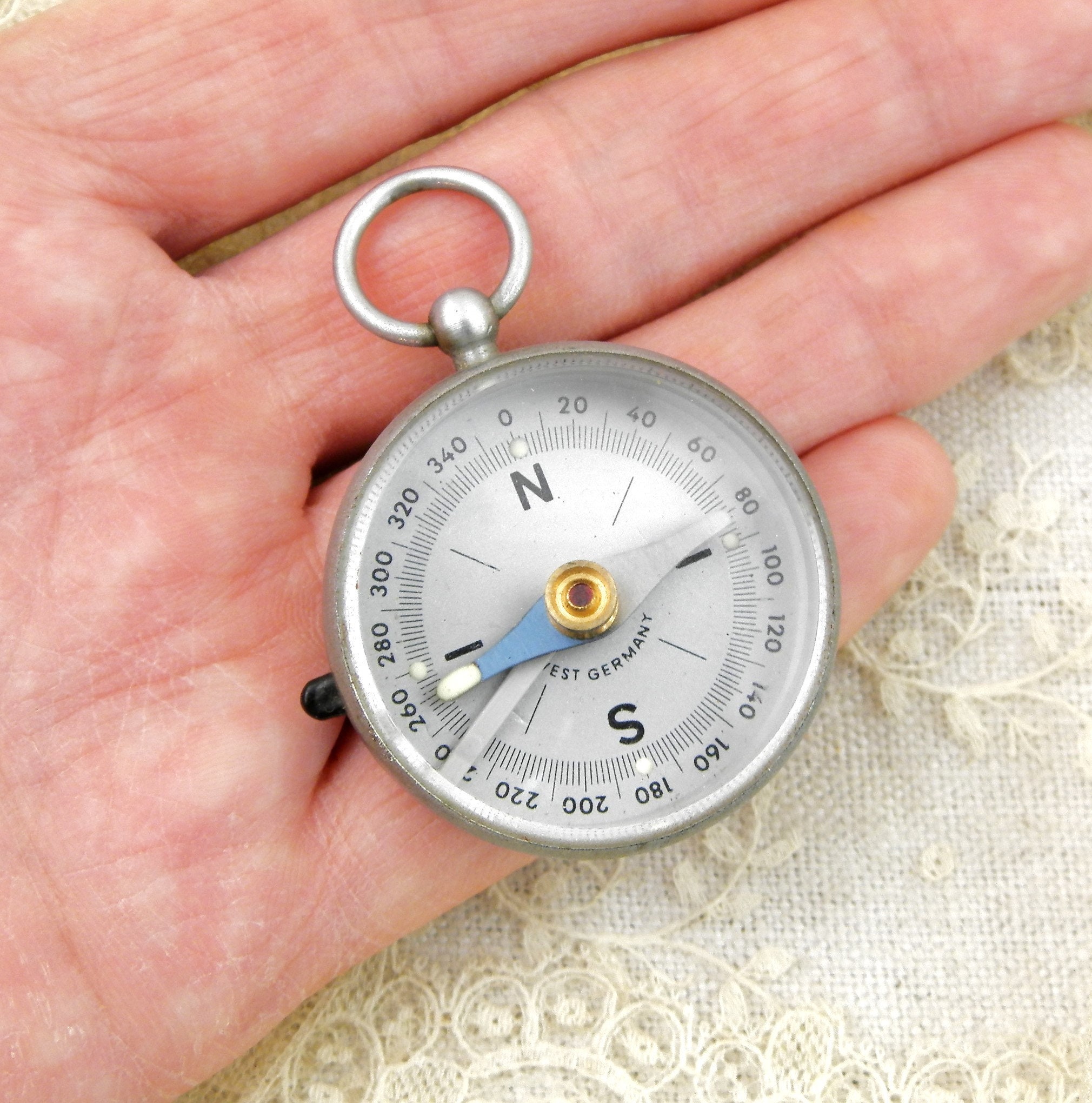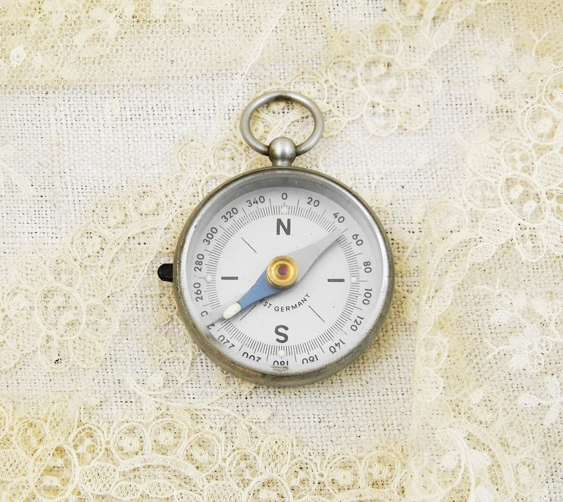 Vintage West German compass. Made of brushed silver colored metal with a plastic lens. Glow in the dark dots on the 4 cardinal points and the hand of compass. Hanging loop at the top. Found at a French flea market in Normandy. In working condition.