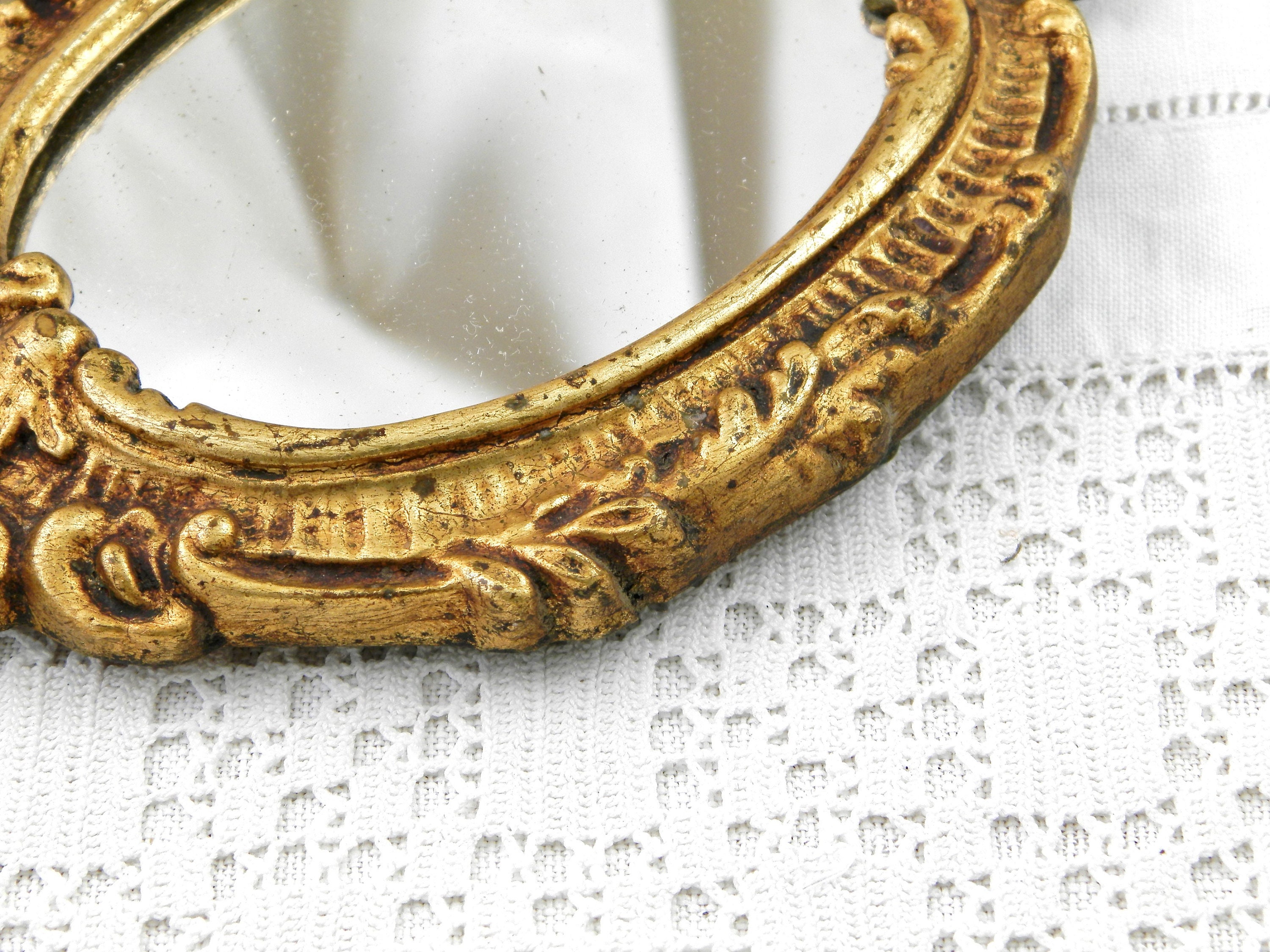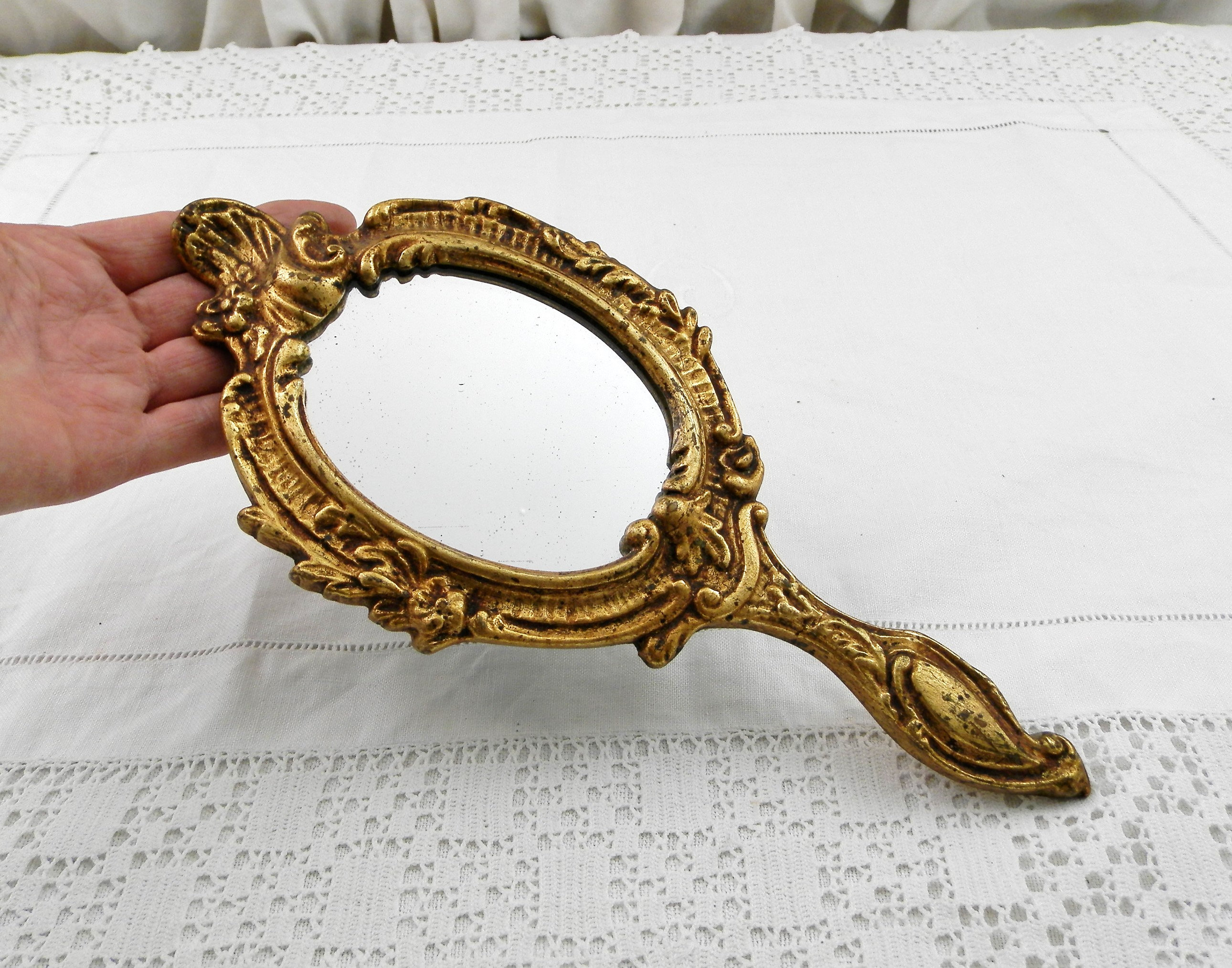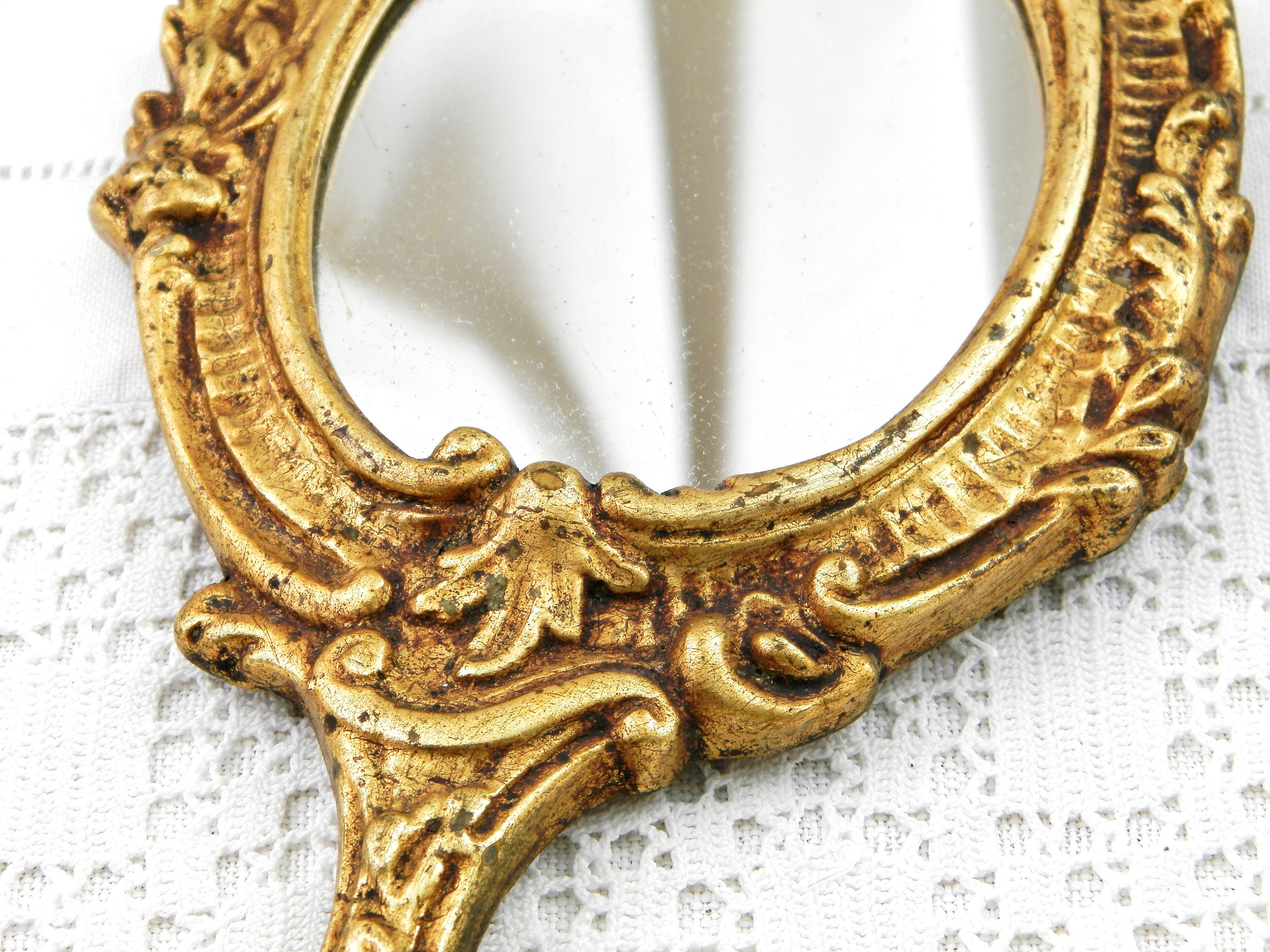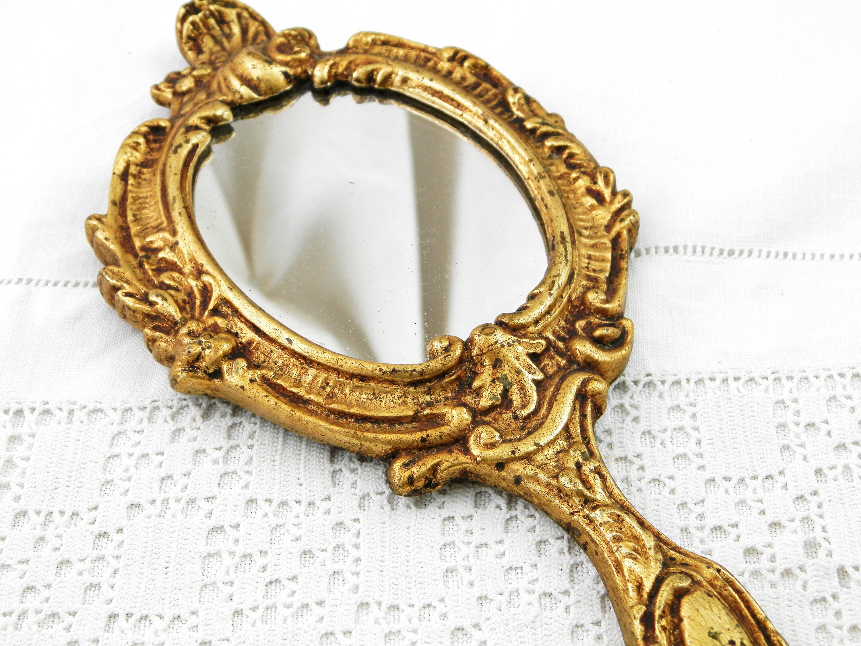 Vintage French gilded oval hand mirror which can double as a wall hanging mirror. Ornate Rocco style circa 1950s /1960s. Made of wood covered in gold leaf with an oval shaped mirror, at the rear is a round hanging hook. Found at a French flea market in Normandy.