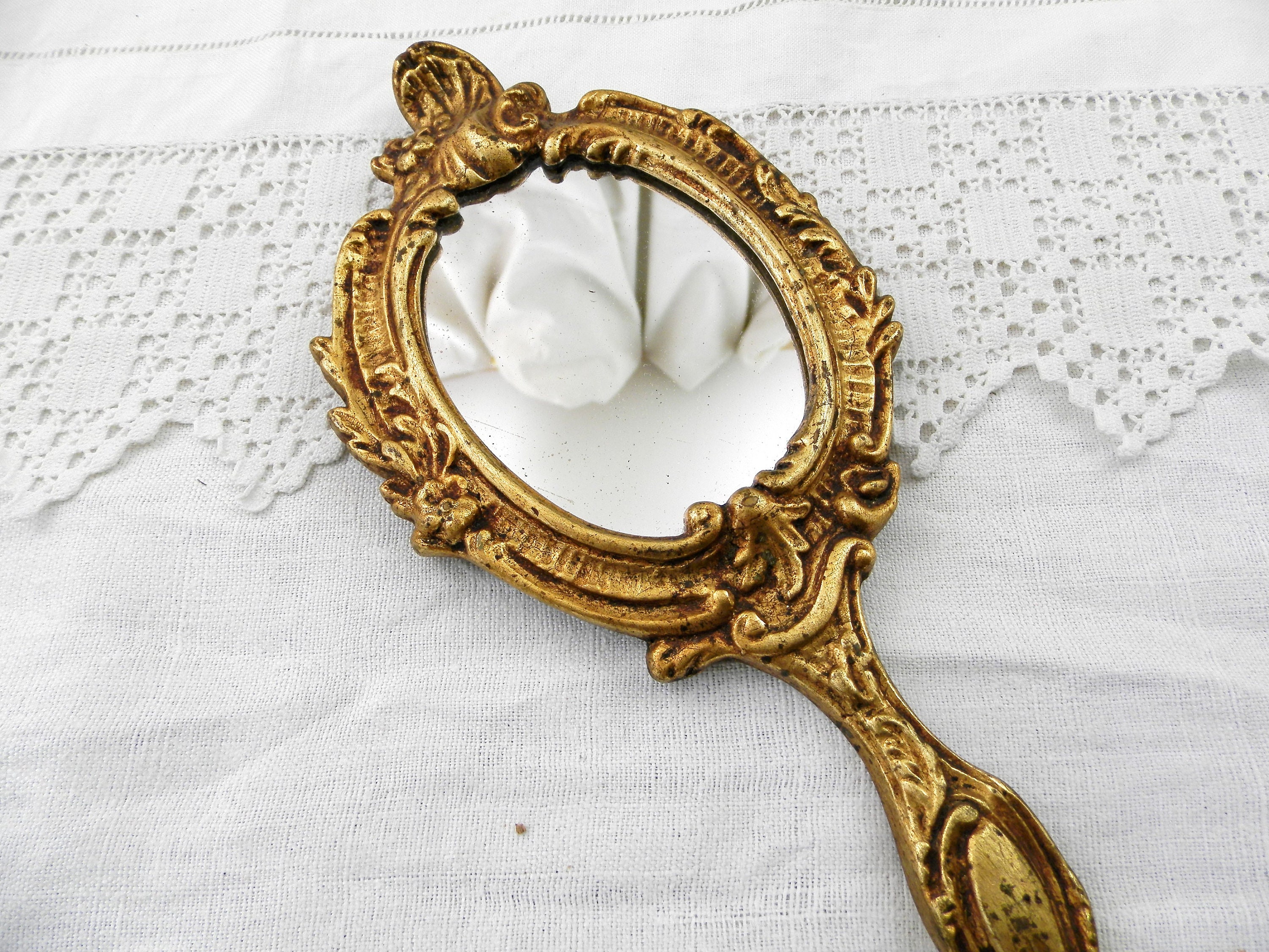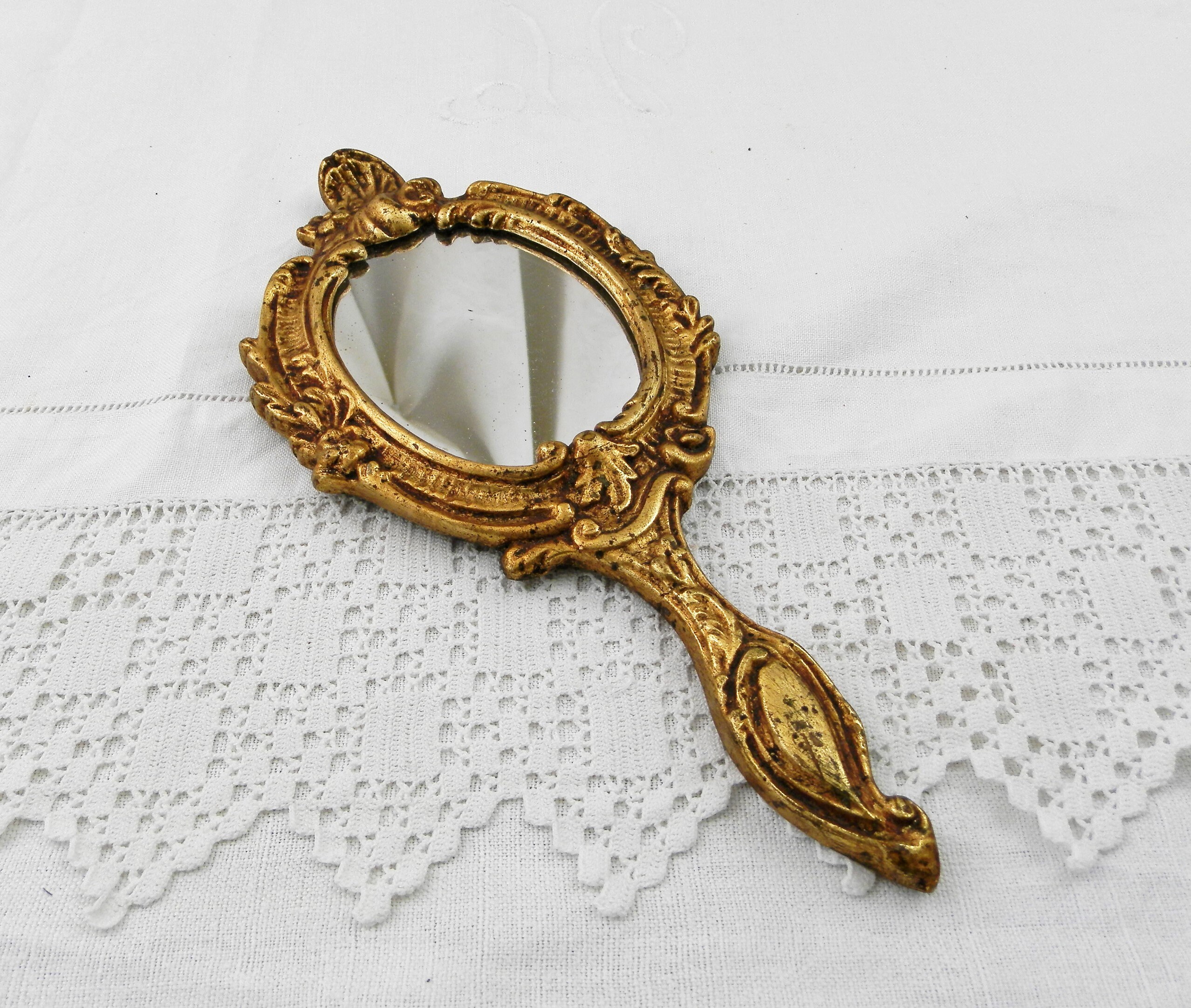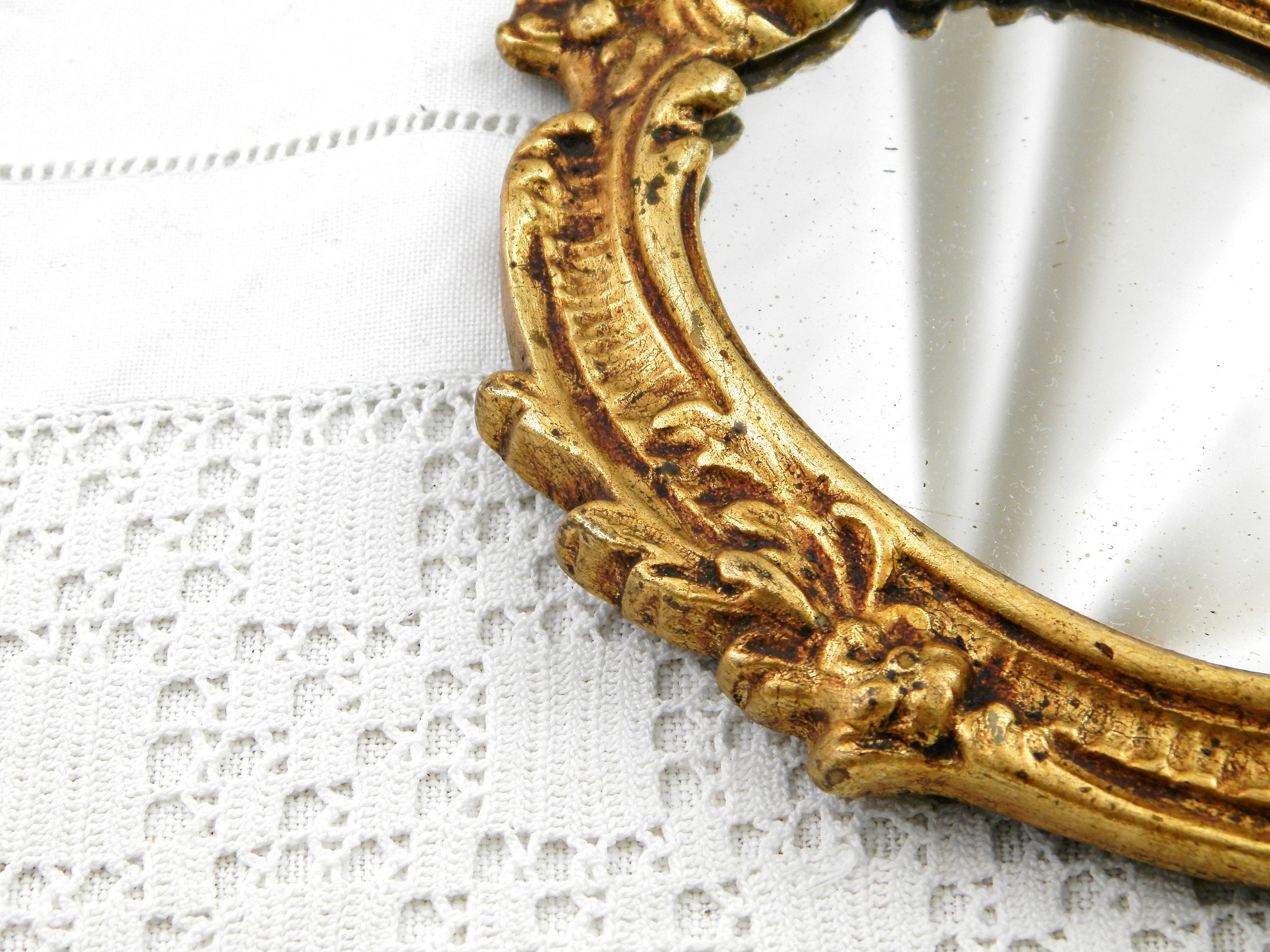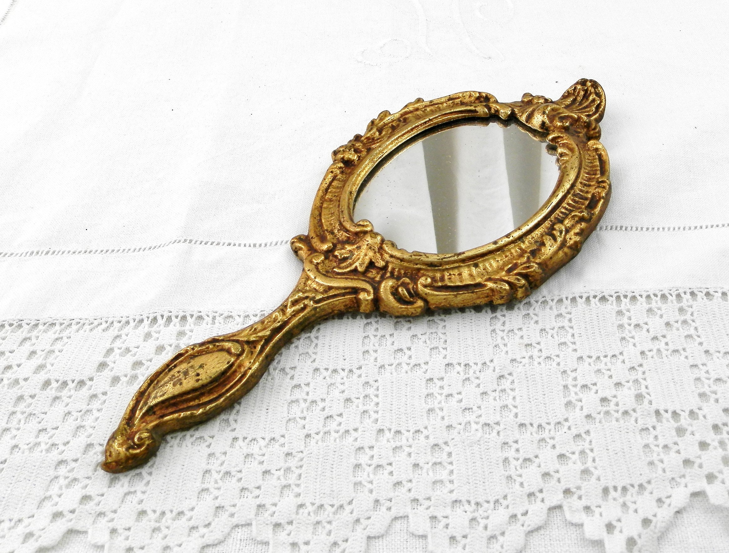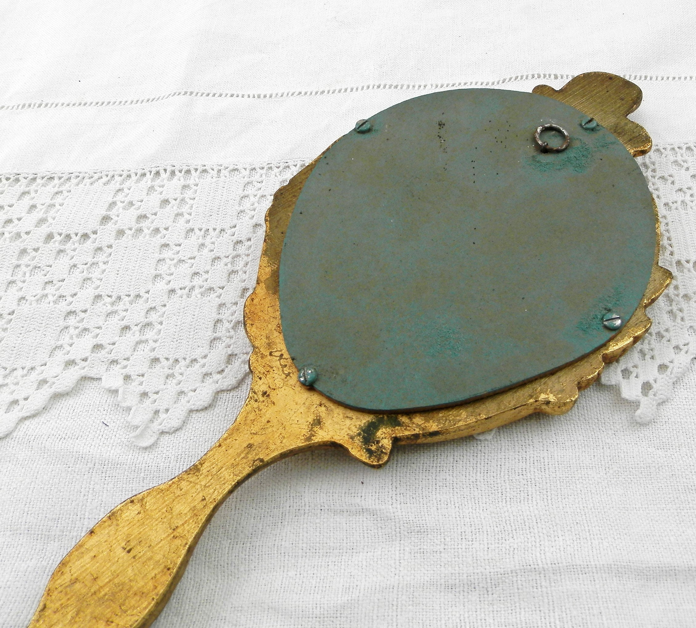 Vintage French gilded oval hand mirror which can double as a wall hanging mirror. Ornate Rocco style circa 1950s /1960s. Made of wood covered in gold leaf with an oval shaped mirror, at the rear is a round hanging hook. Found at a French flea market in Normandy.