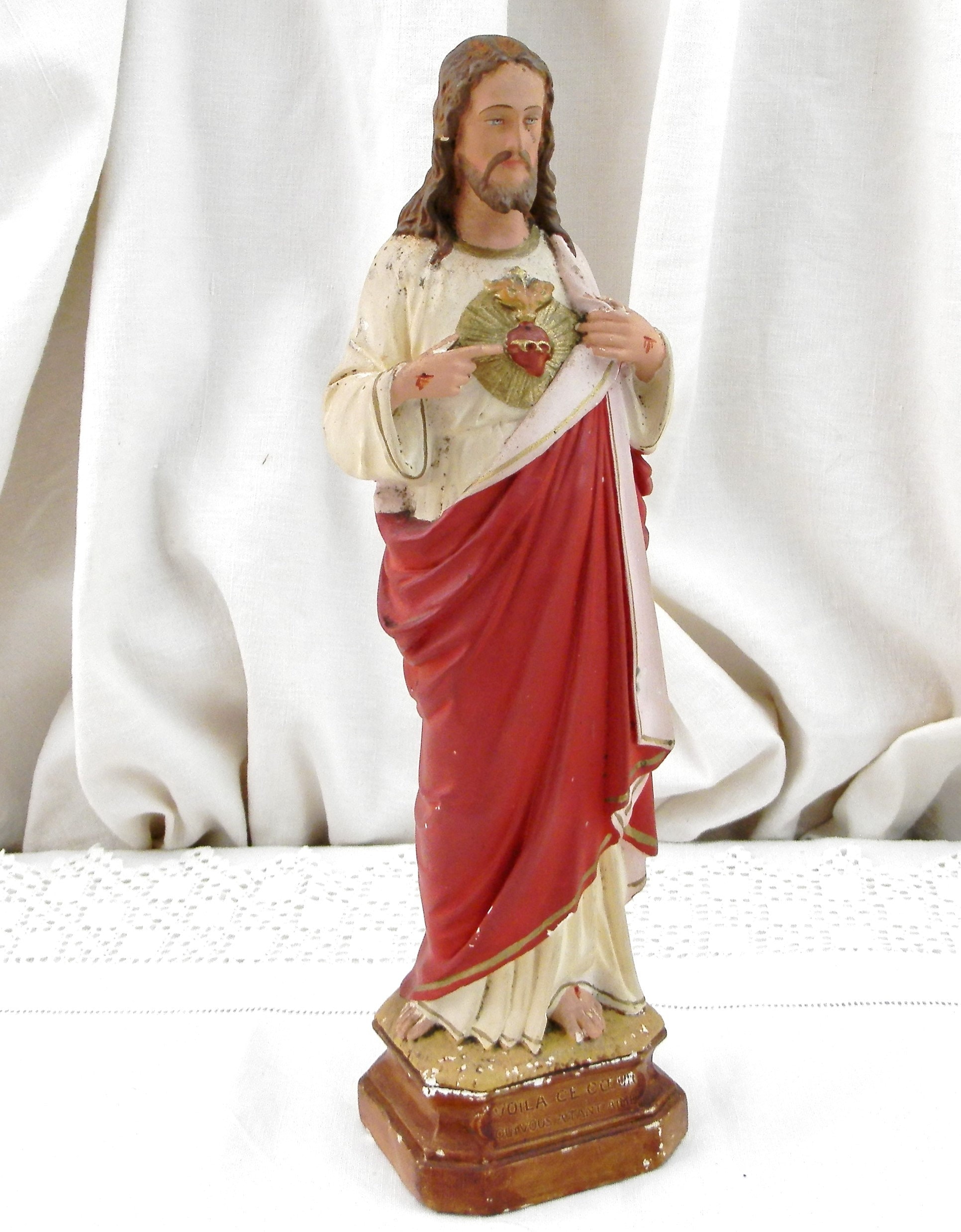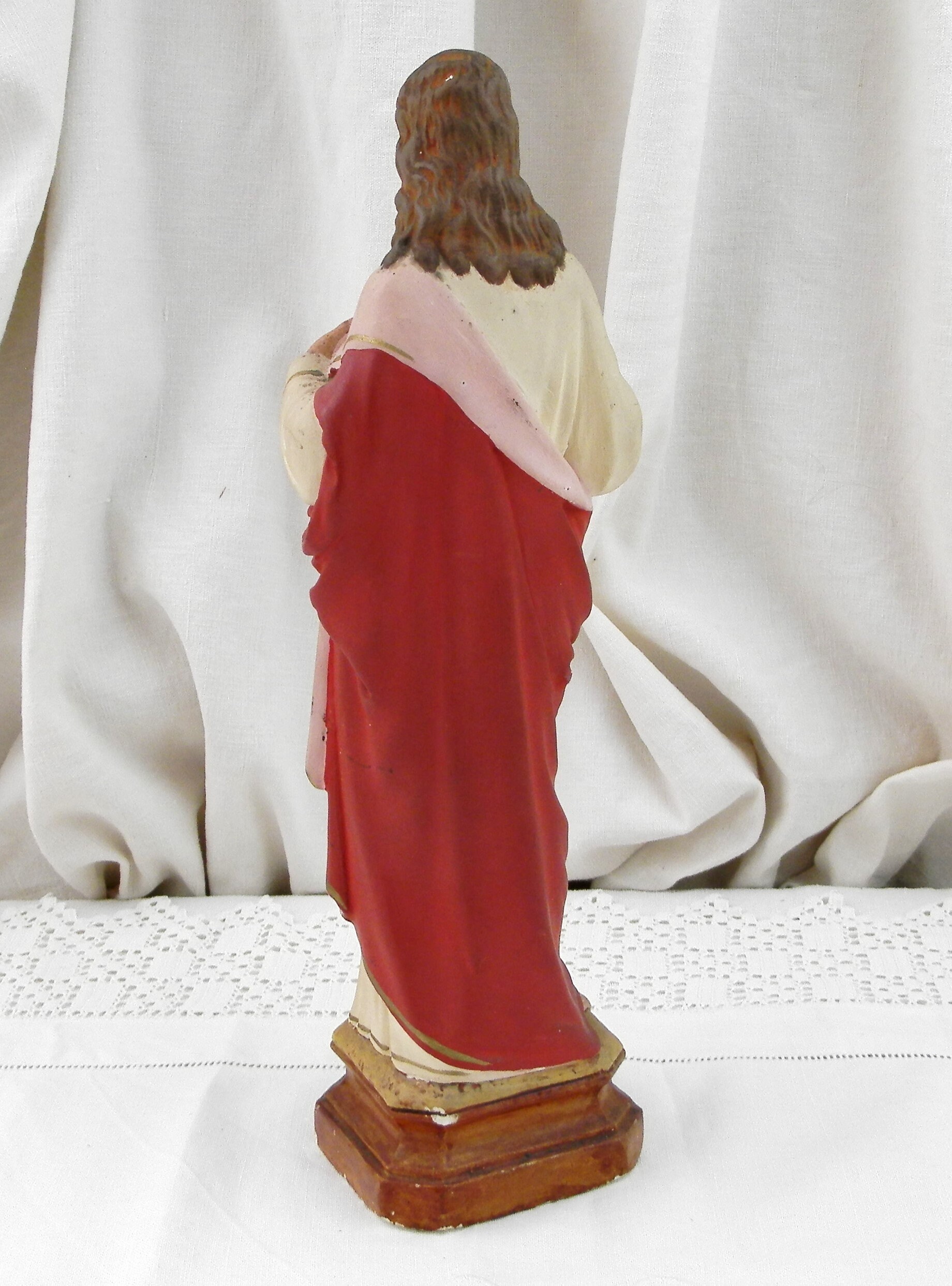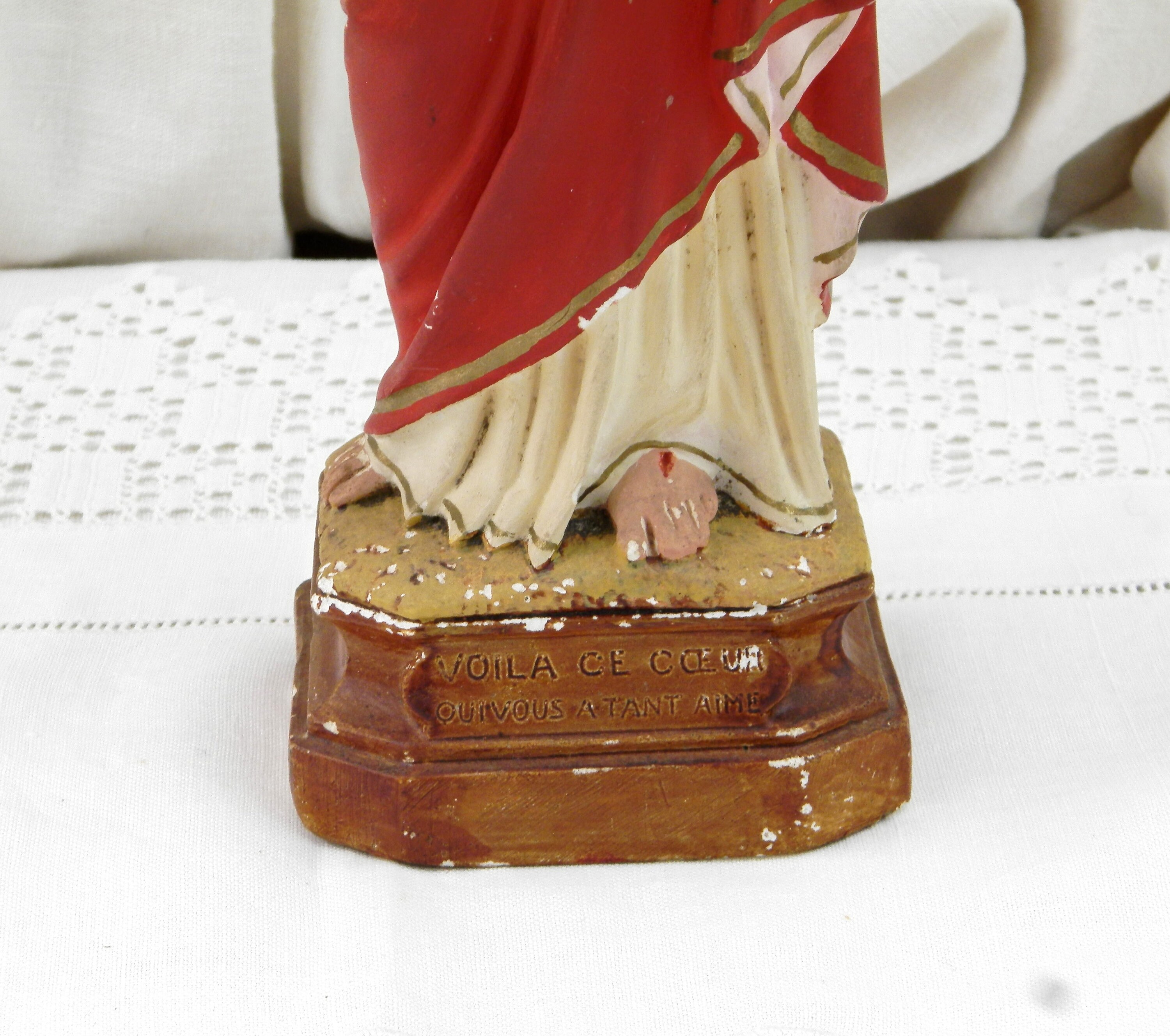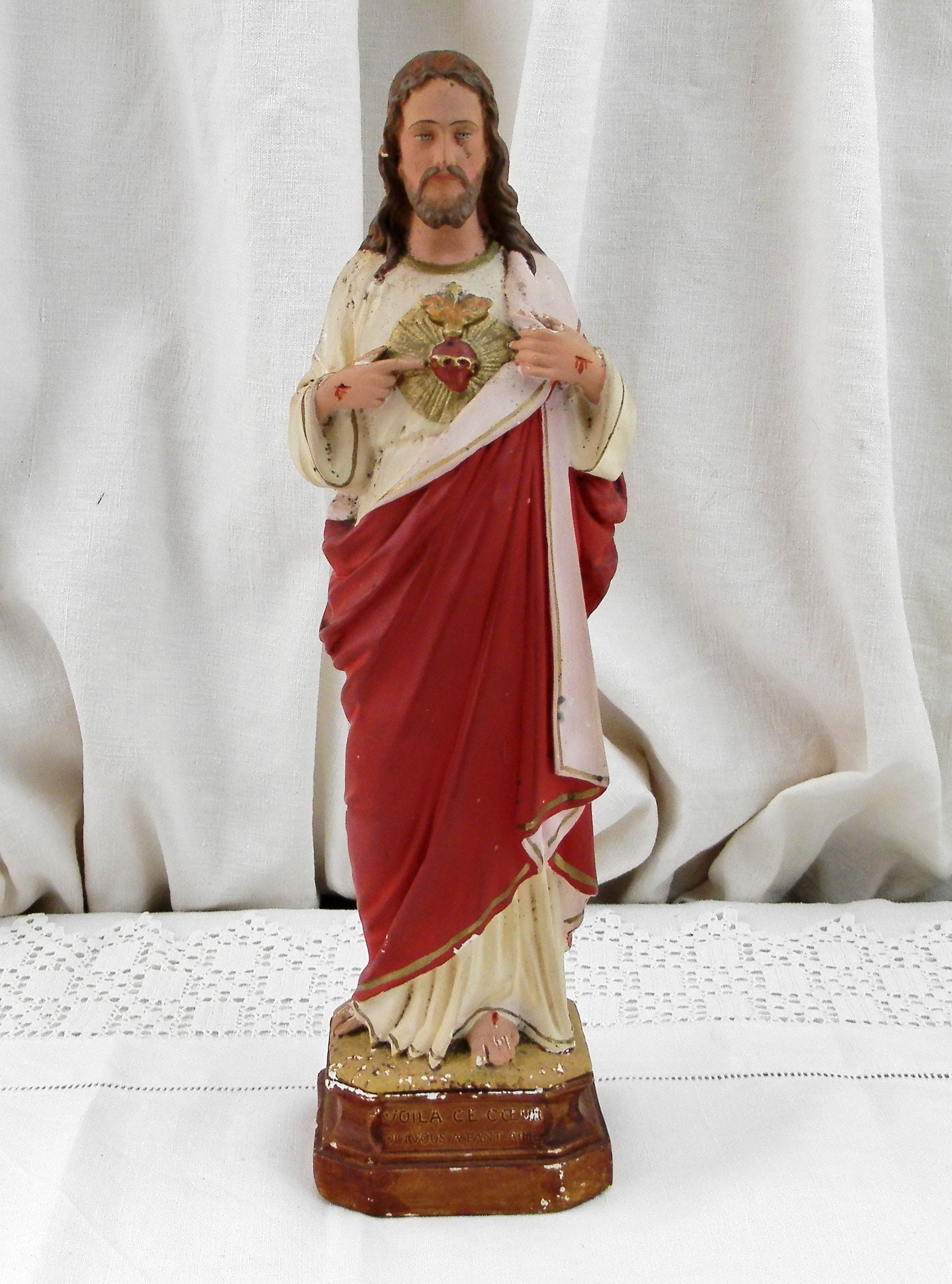Antique chalkware statue of Jesus Sacred Heart. Made of painted plaster of Paris. Circa 1910s - 1920s. Found at a French flea market in Normandy.