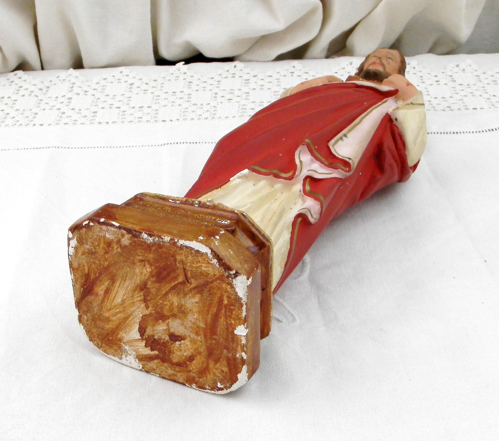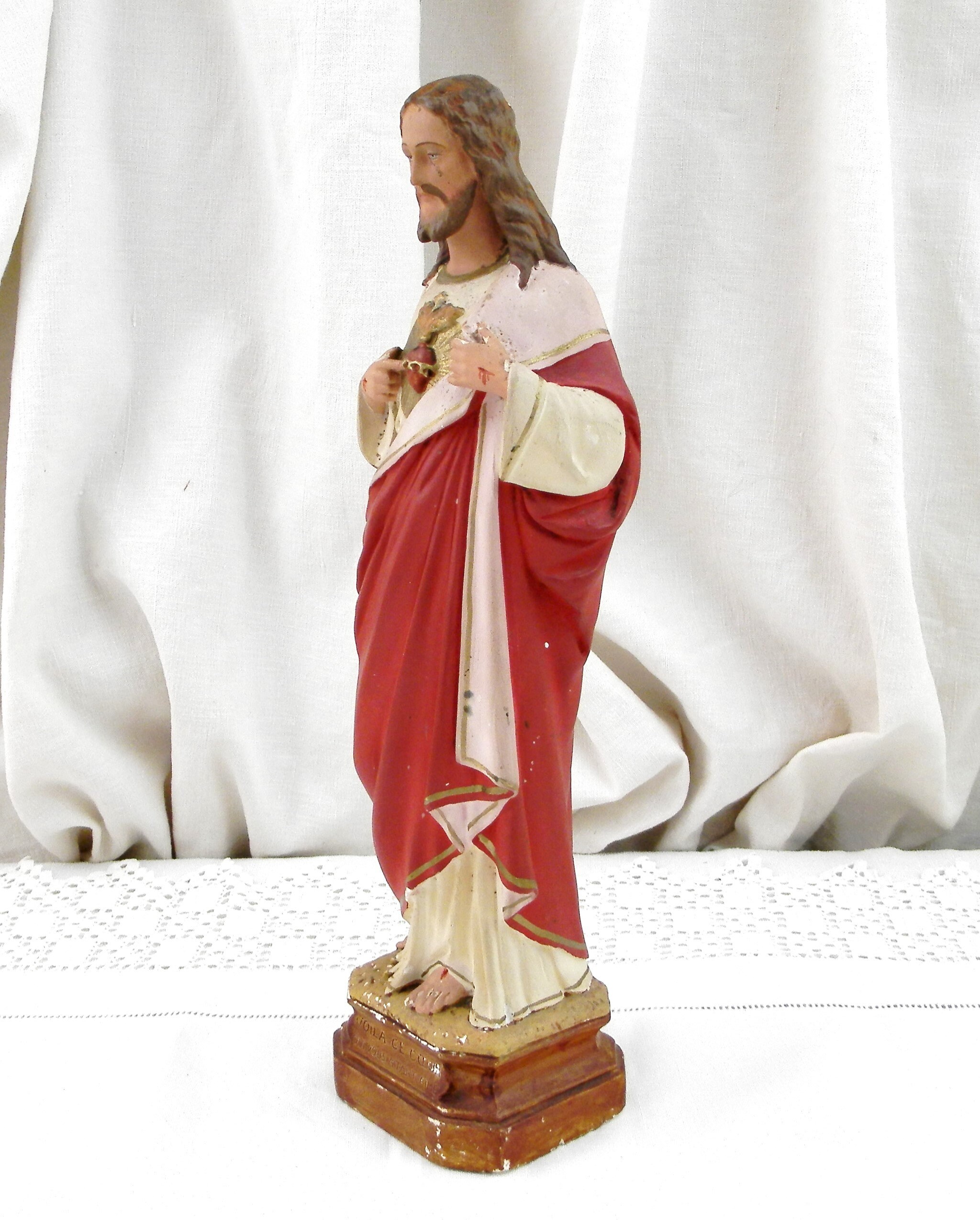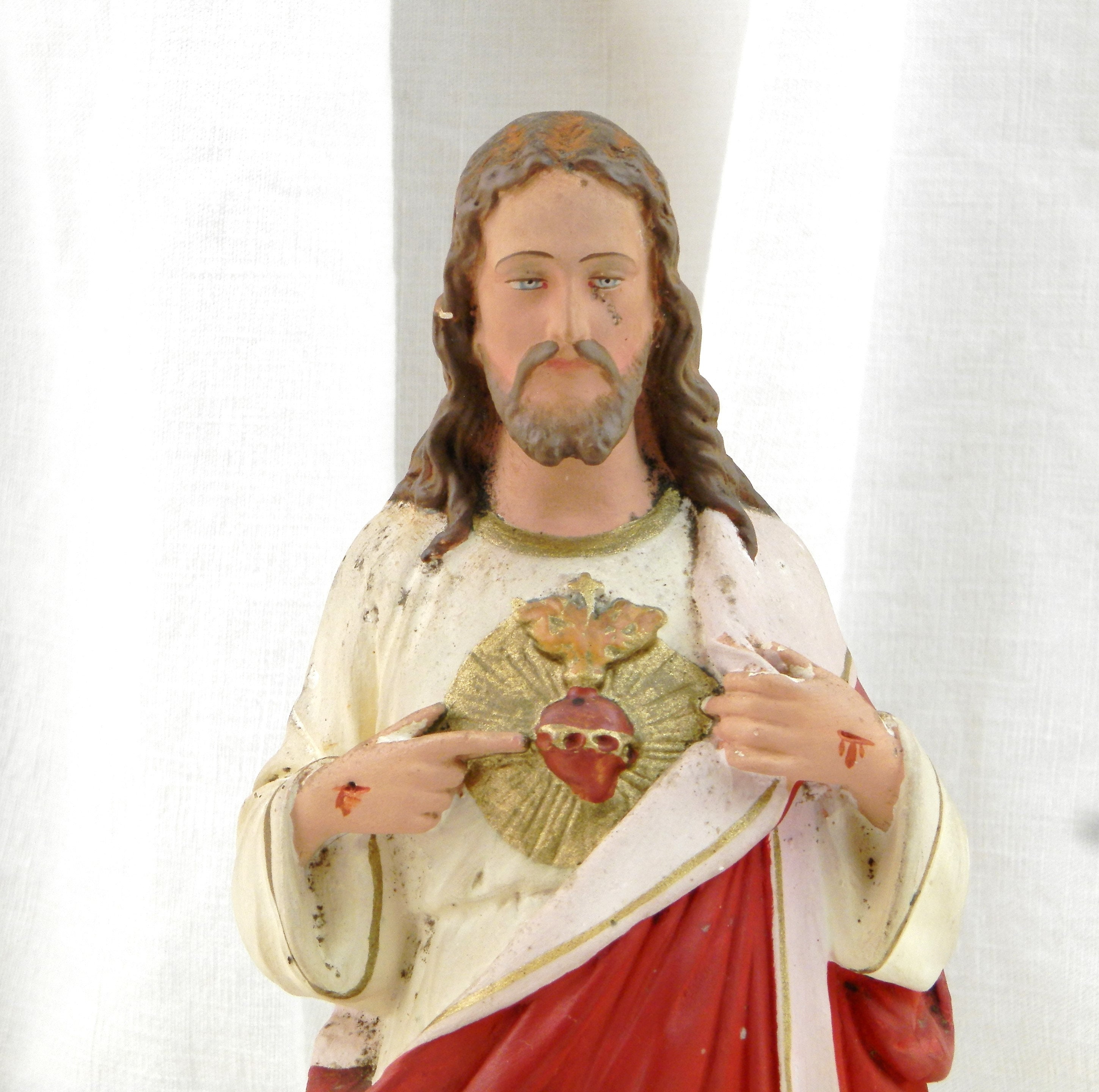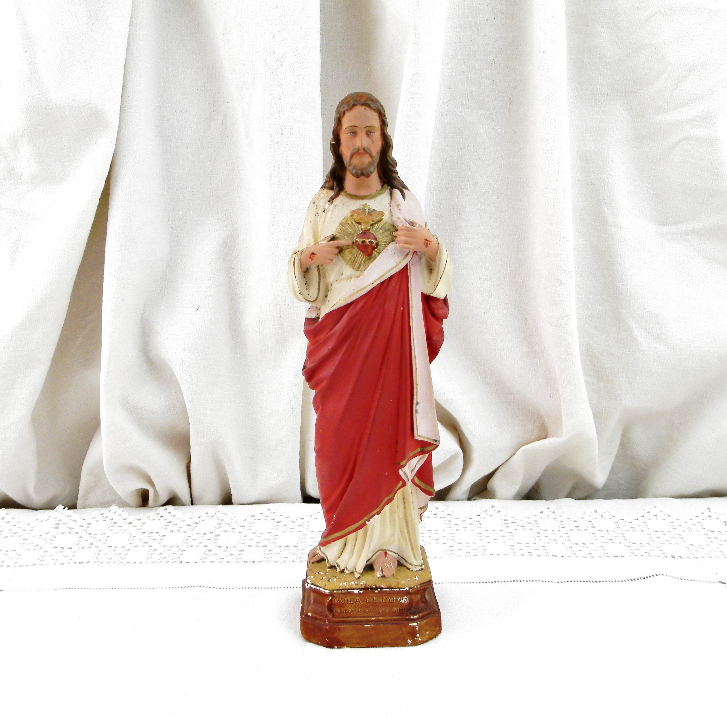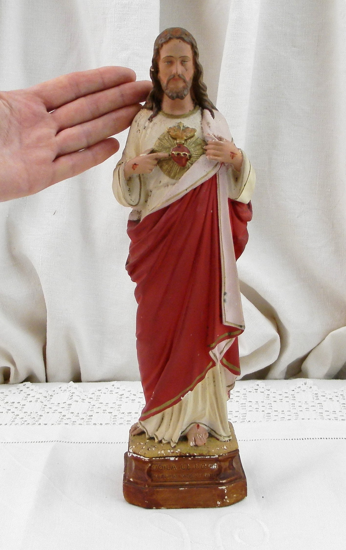 Antique chalkware statue of Jesus Sacred Heart. Made of painted plaster of Paris. Circa 1910s - 1920s. Found at a French flea market in Normandy.
