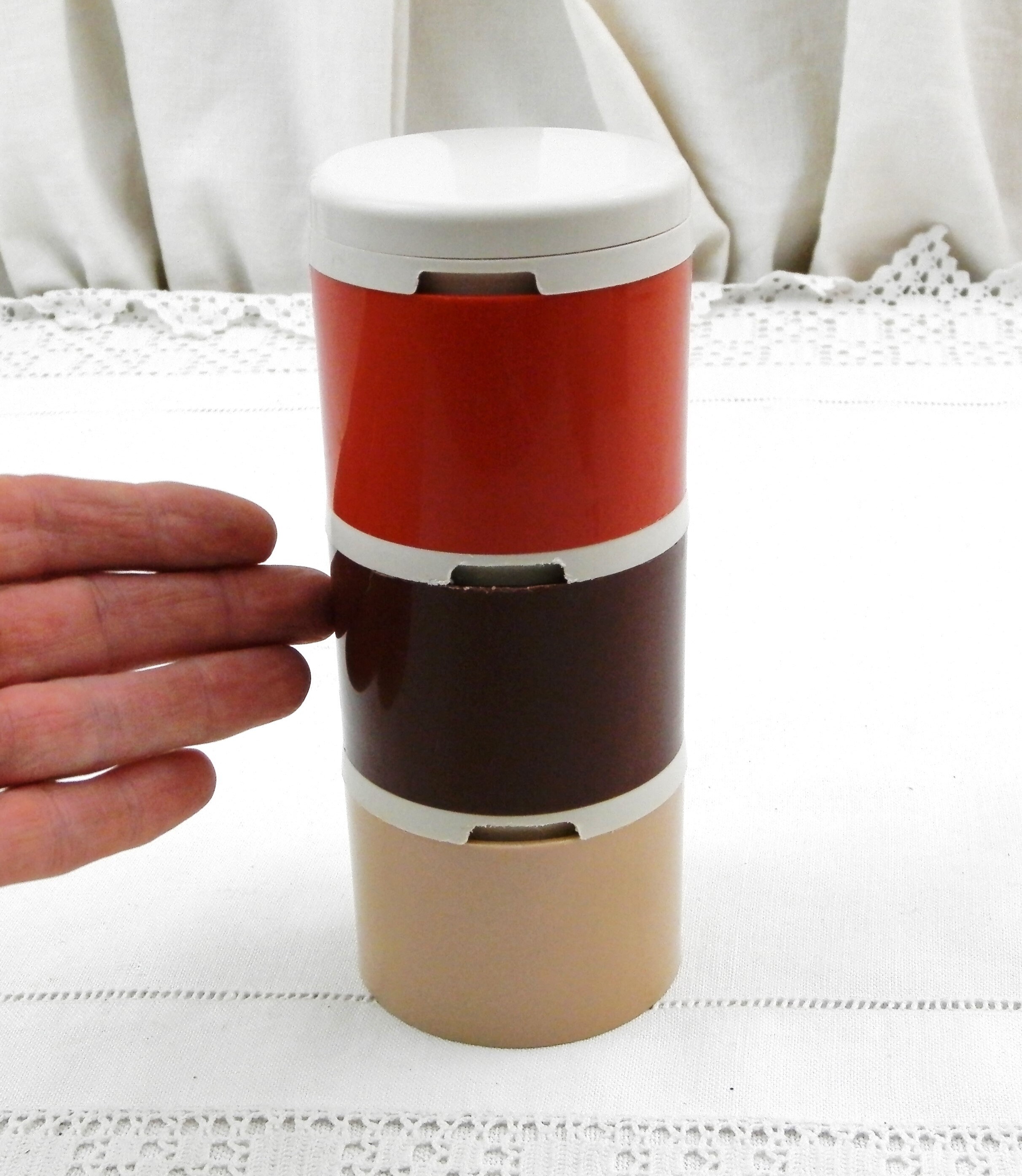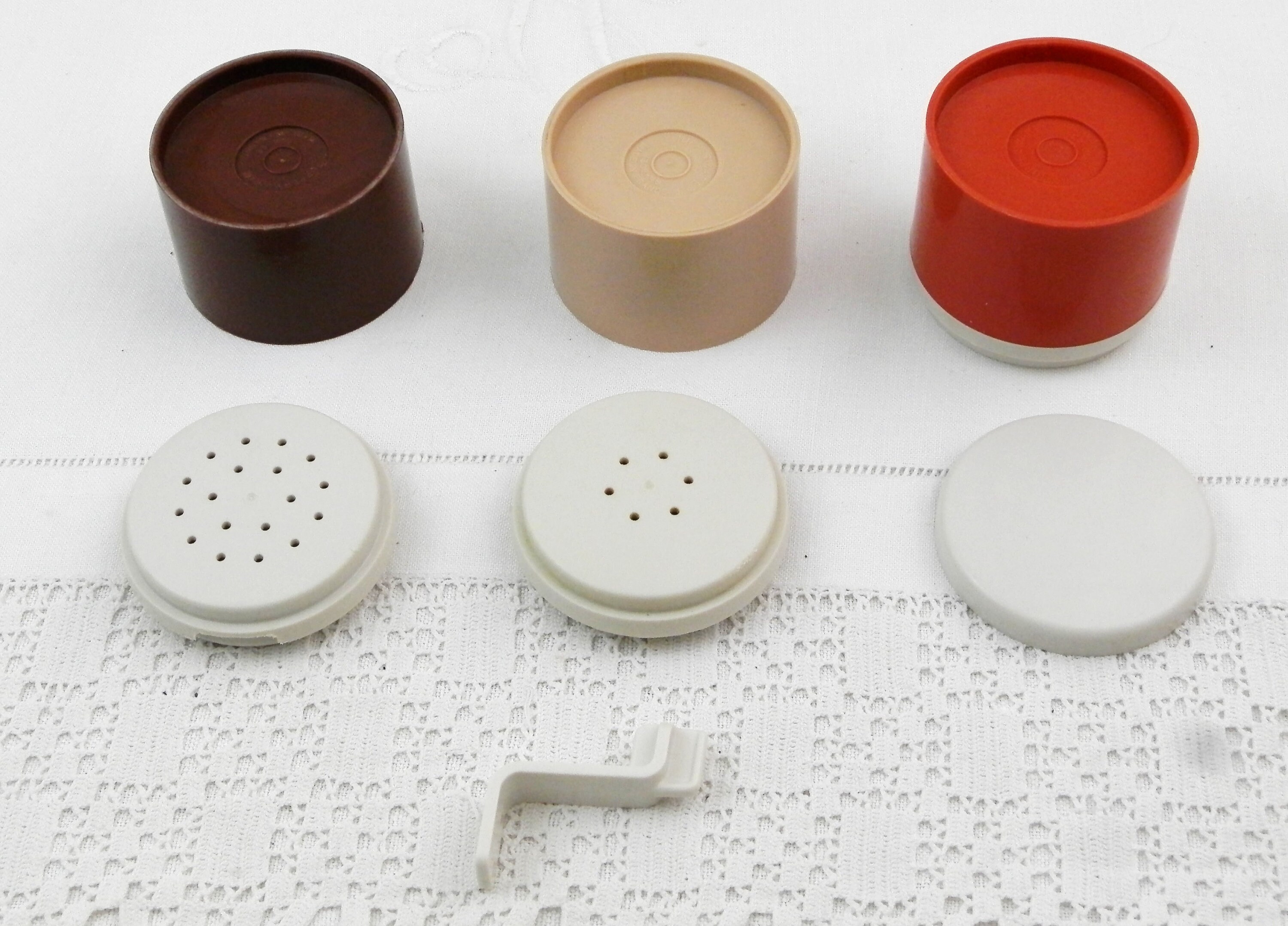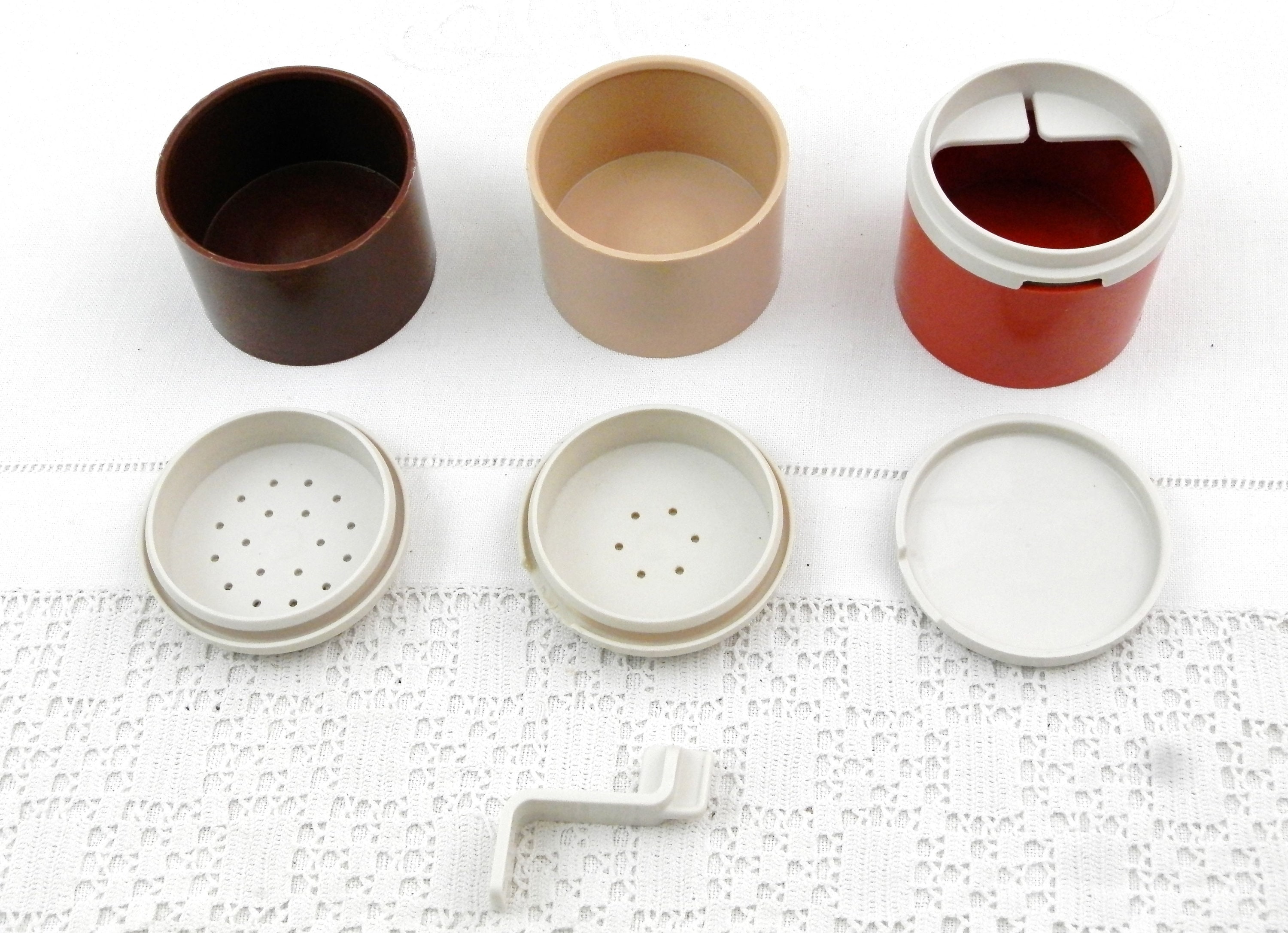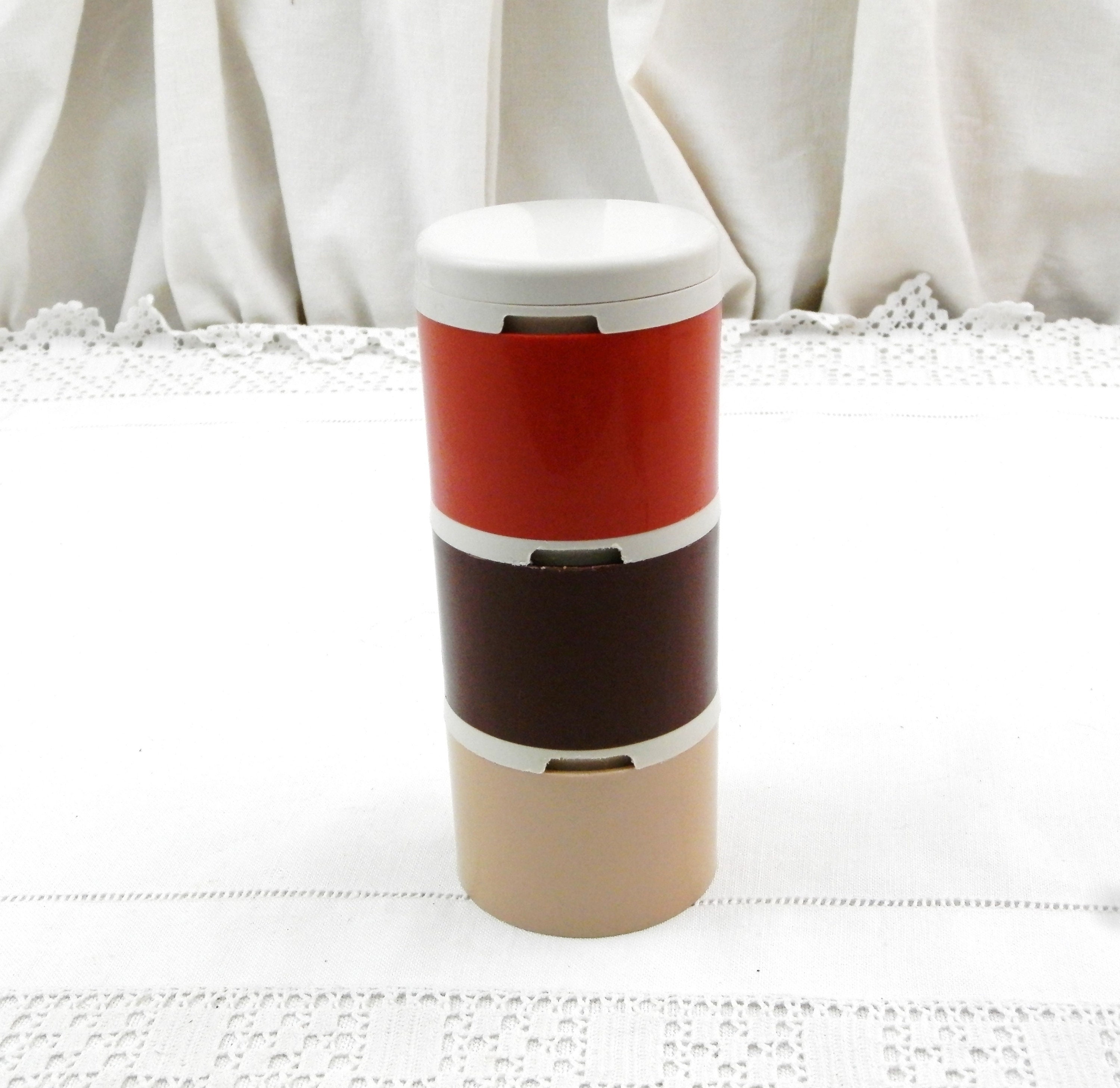 Vintage Tupperware condiment 3 piece set. Individual compartments for salt, pepper and one for mustard with a small spoon. Made of different 3 colored plastic in France. Model number 1308-48. Circa 1980s Found at a French flea market in Normandy.