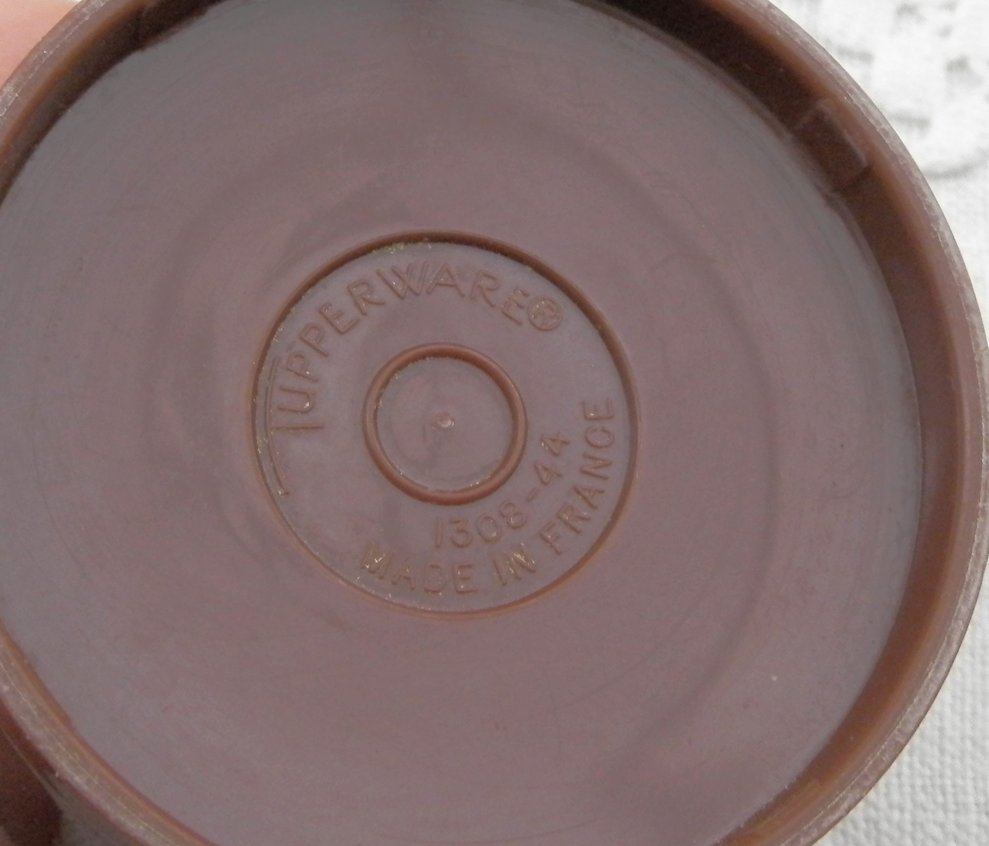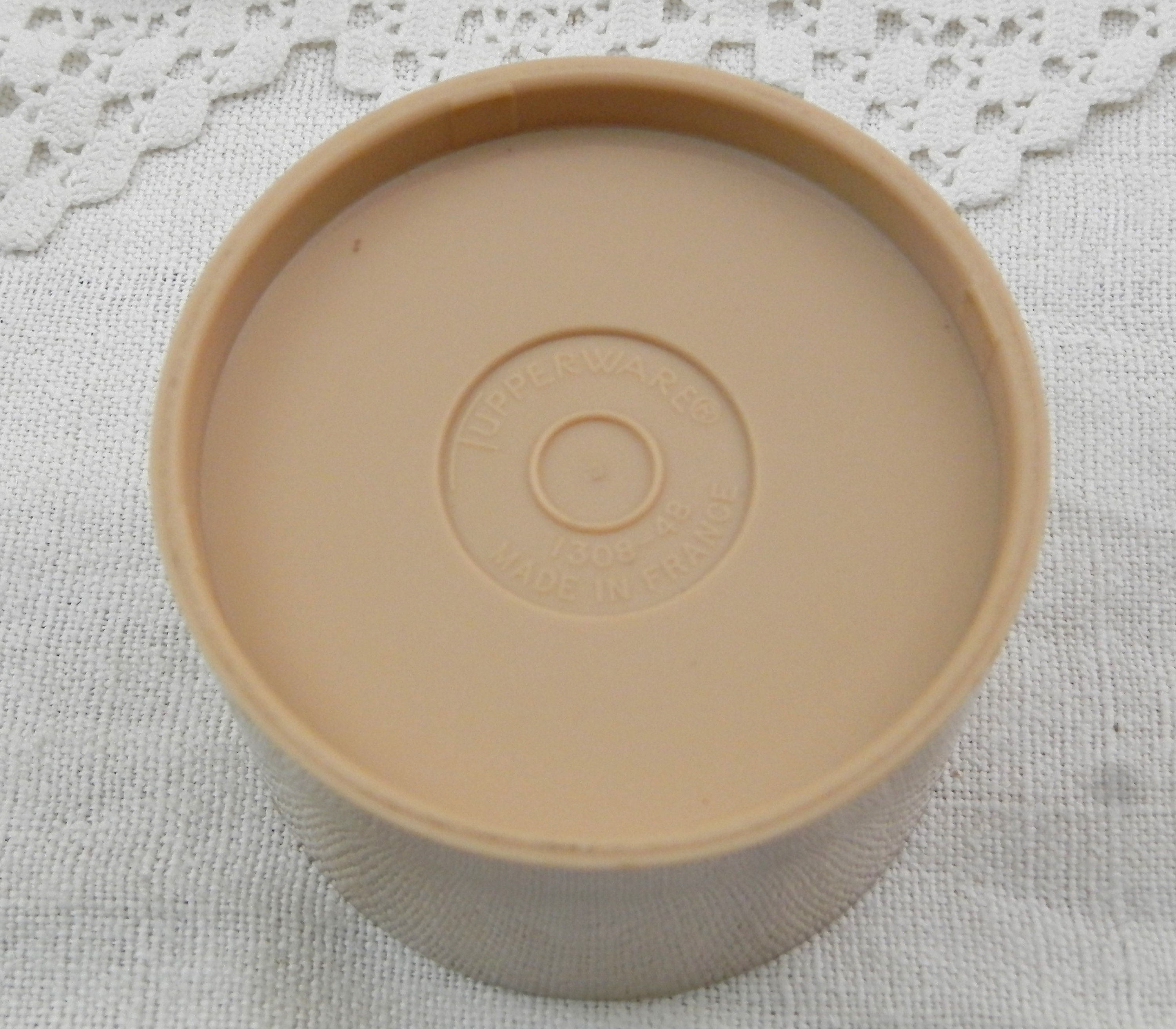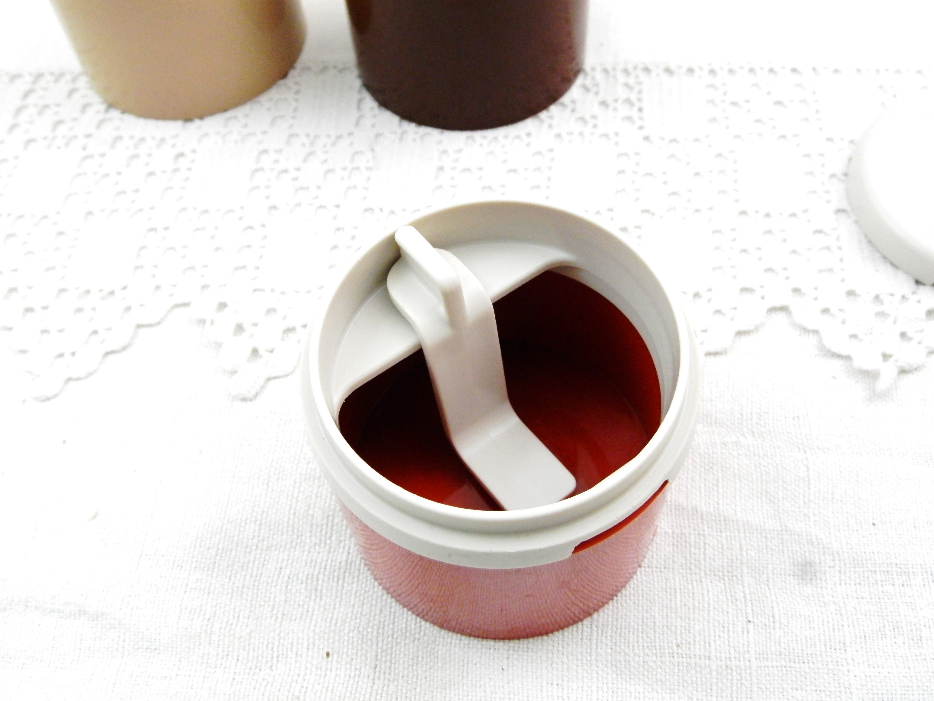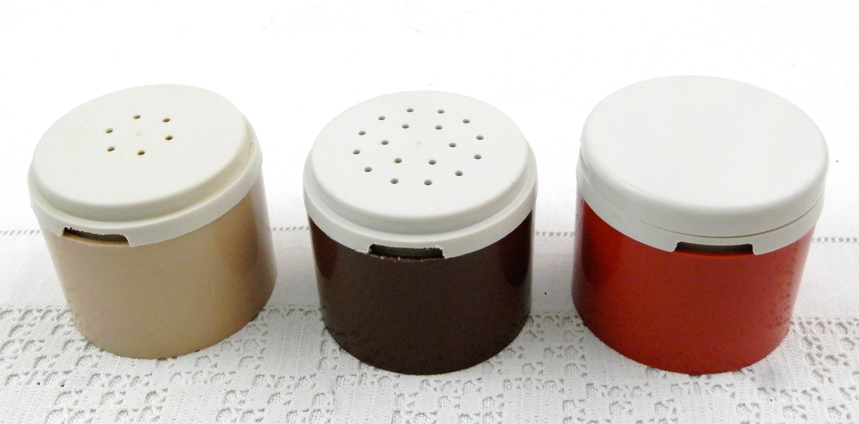 Vintage Tupperware condiment 3 piece set. Individual compartments for salt, pepper and one for mustard with a small spoon. Made of different 3 colored plastic in France. Model number 1308-48. Circa 1980s Found at a French flea market in Normandy.