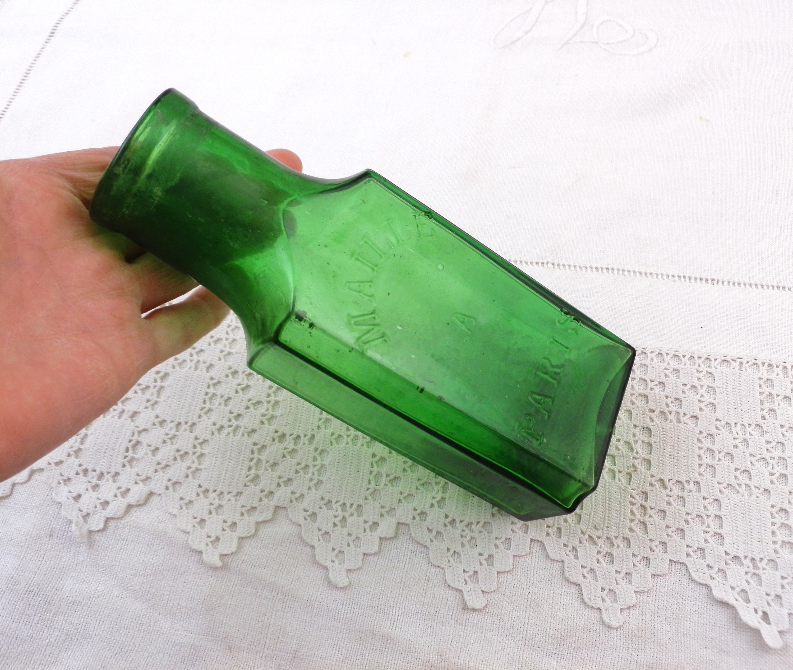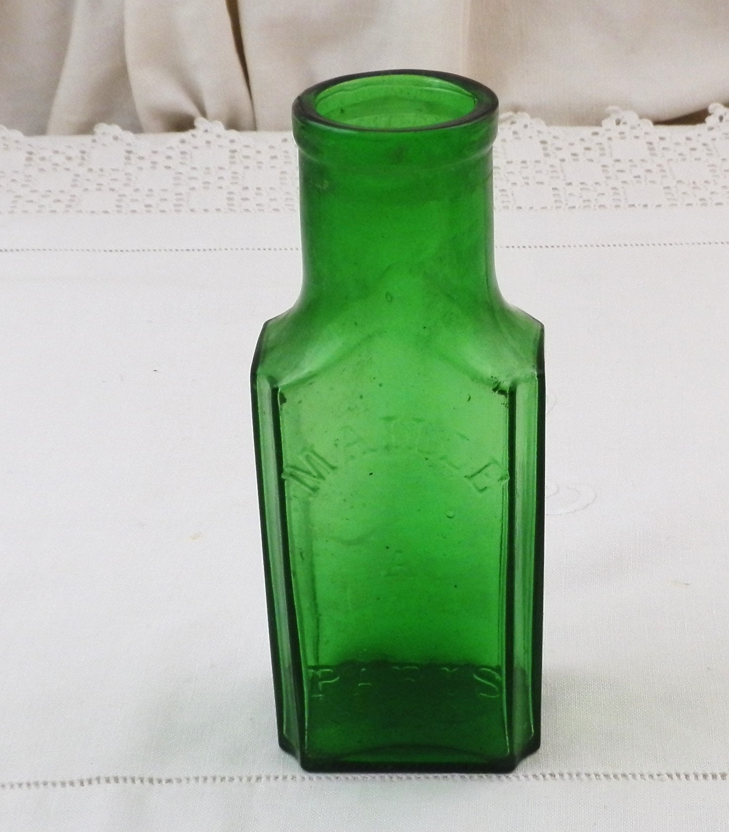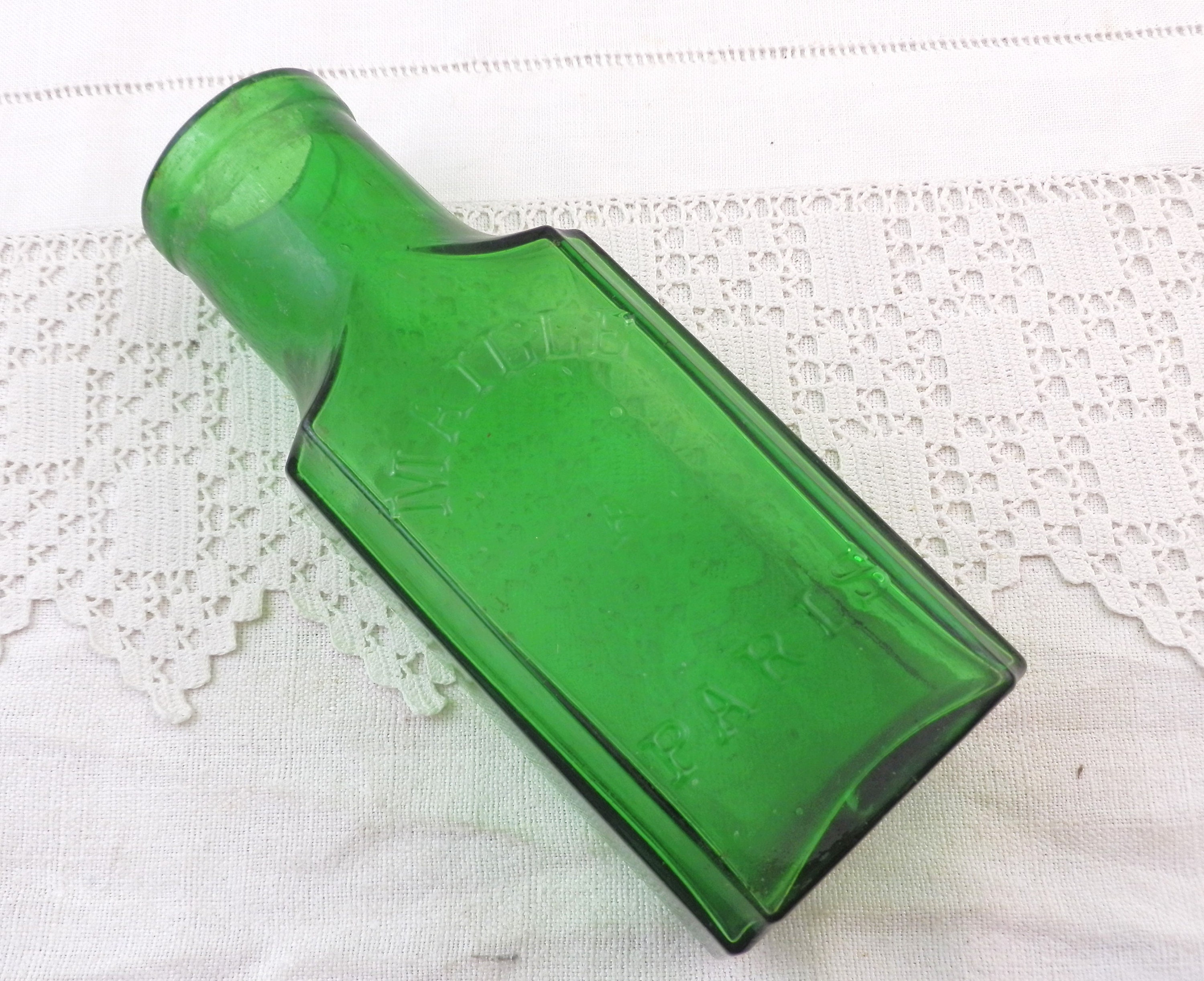 Antique French mustard bottle. A rare find in green glass, generally Maille was sold in stoneware ceramic crock pots. Embossed Maille Paris on the bottle with a wide neck. Circa late 19th C.