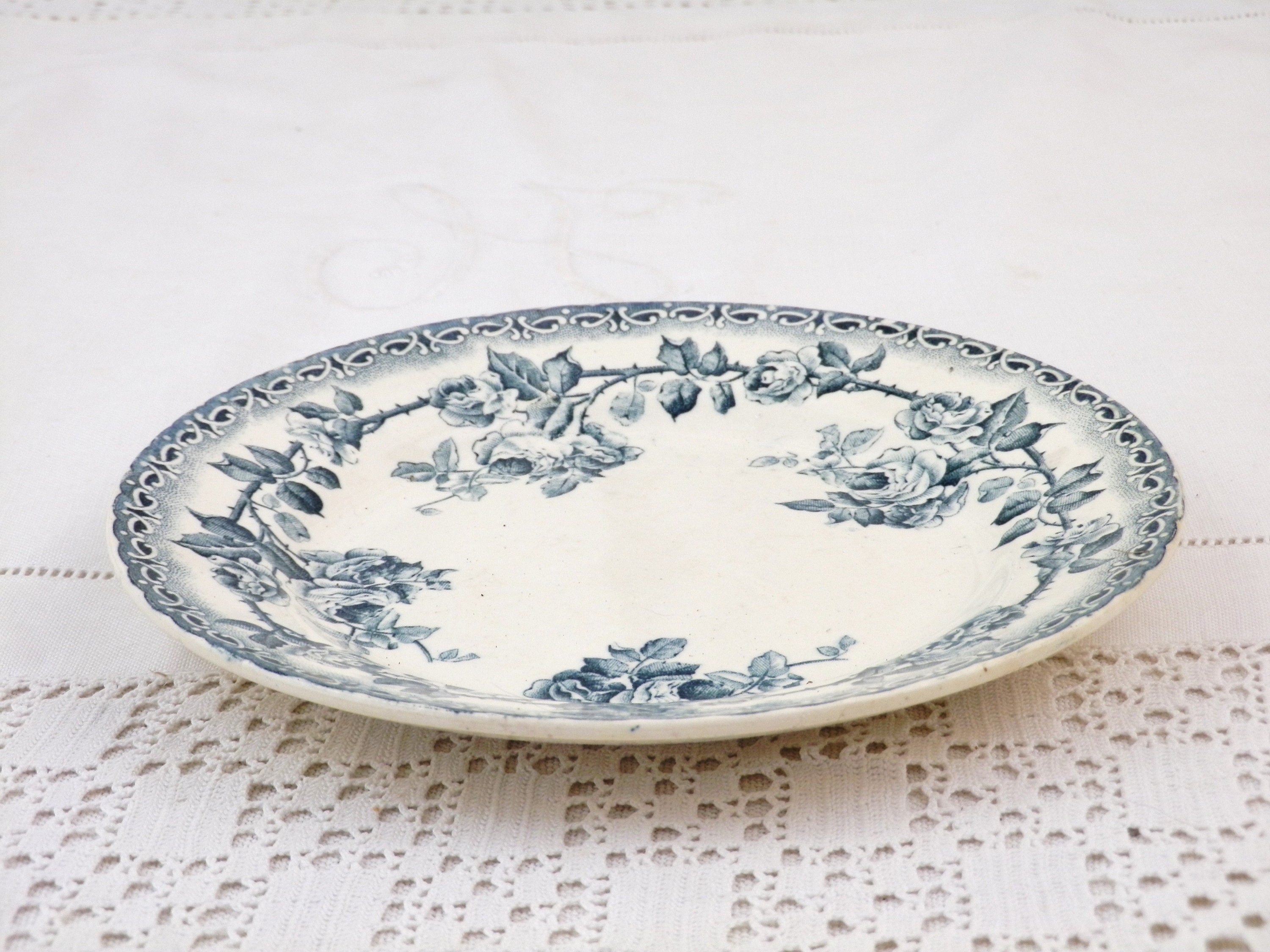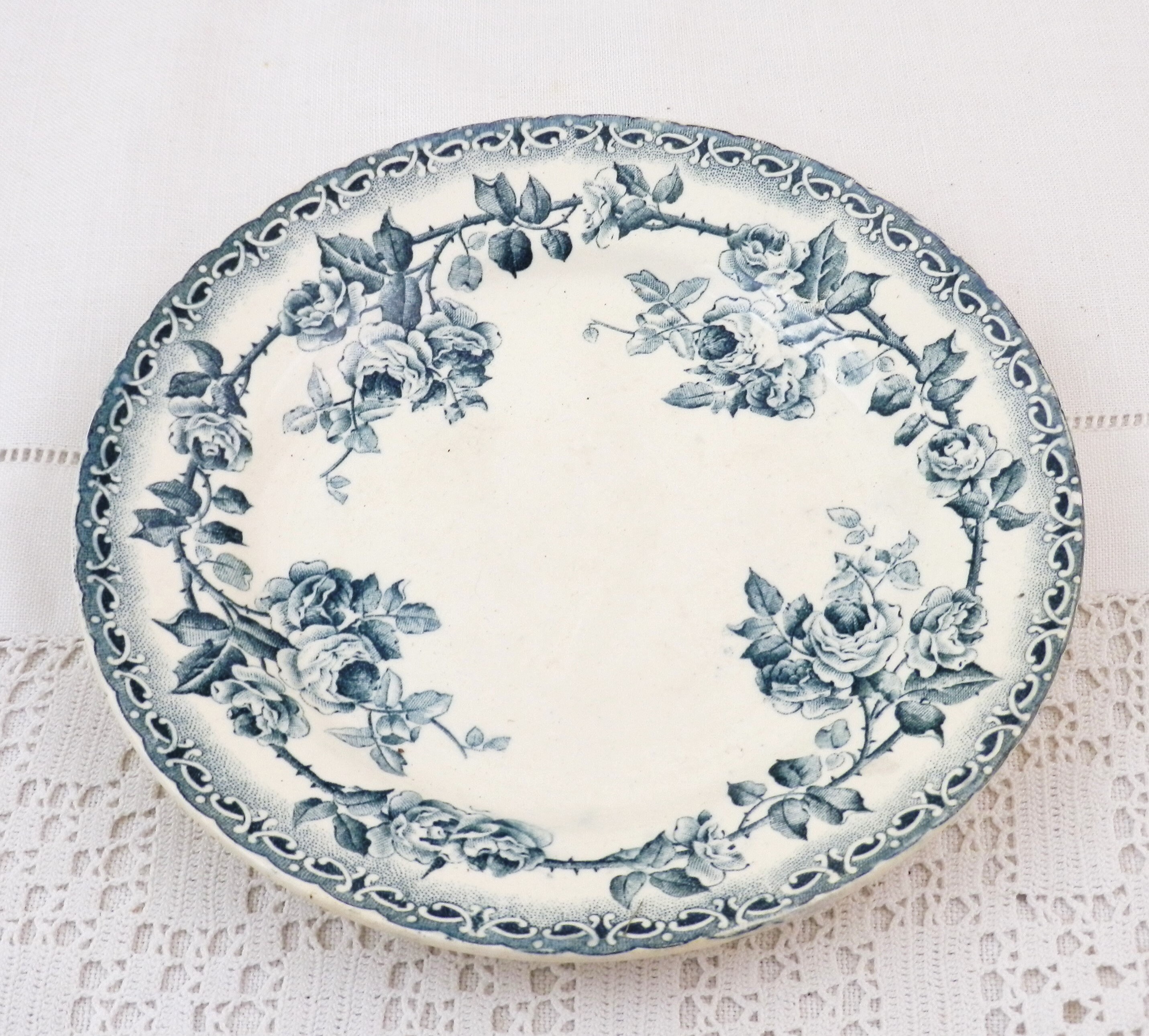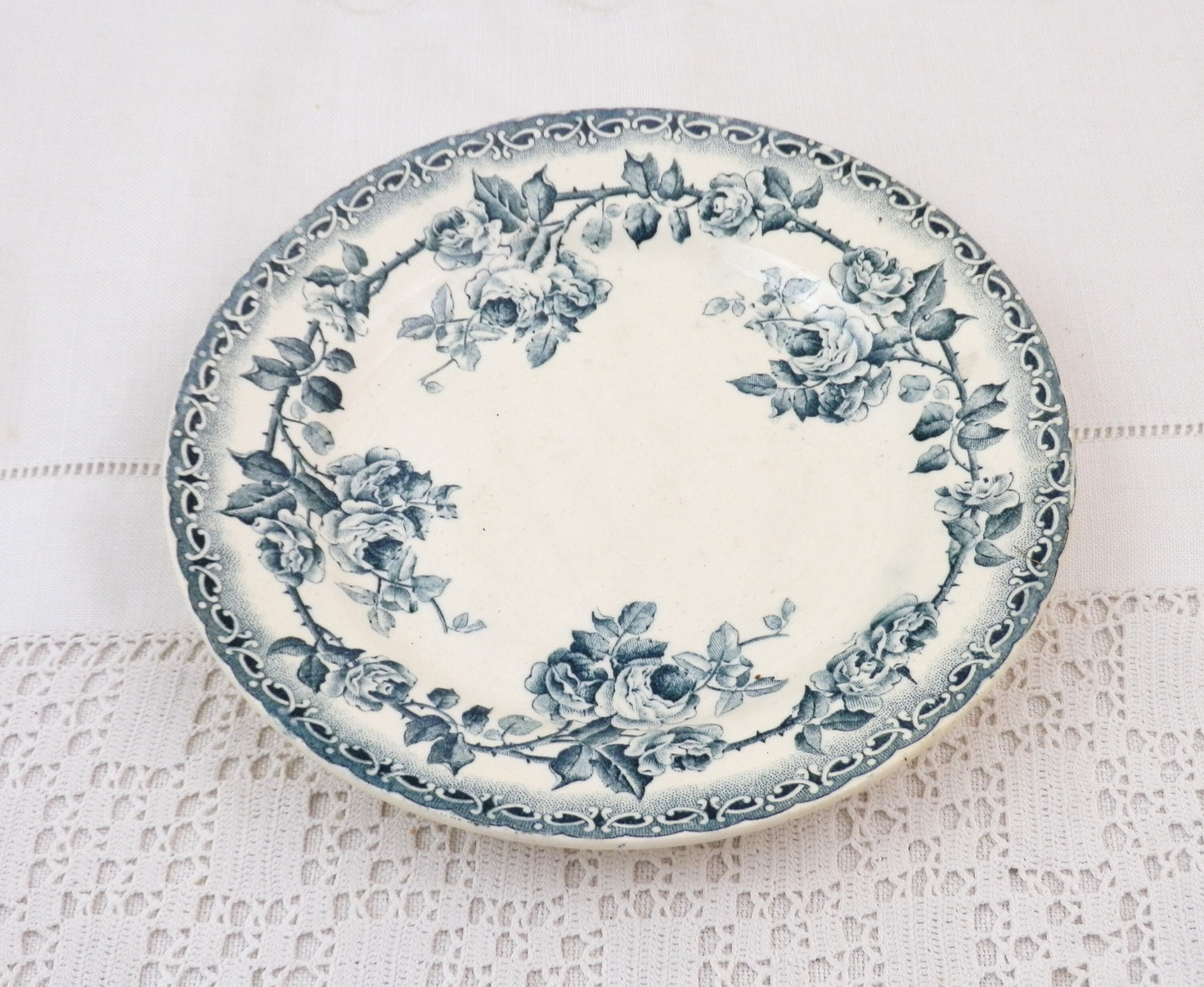 Antique French ironstone desert plate with rose pattern in teal blue. Made by H Boulanger. Circa end 1800s.