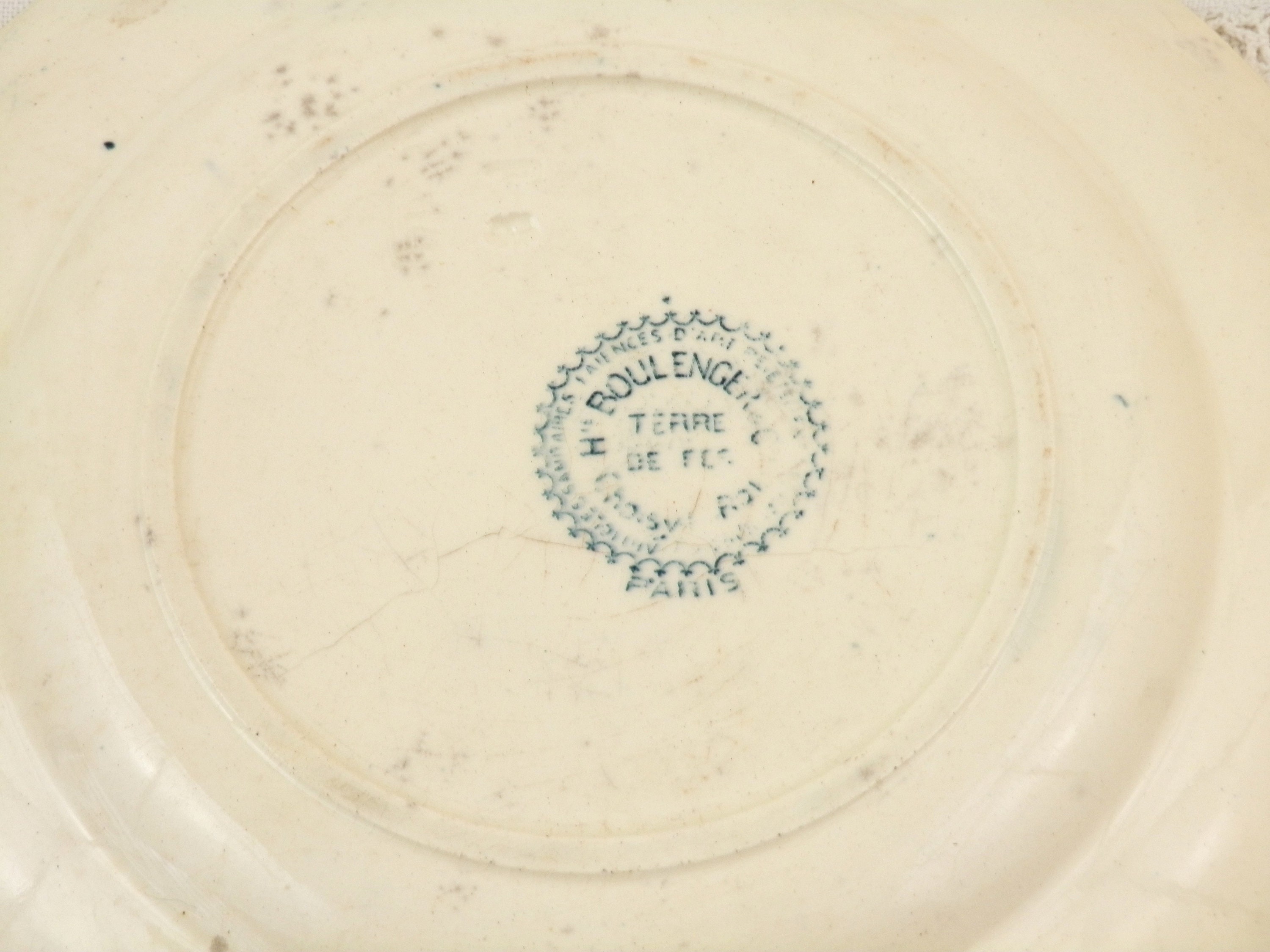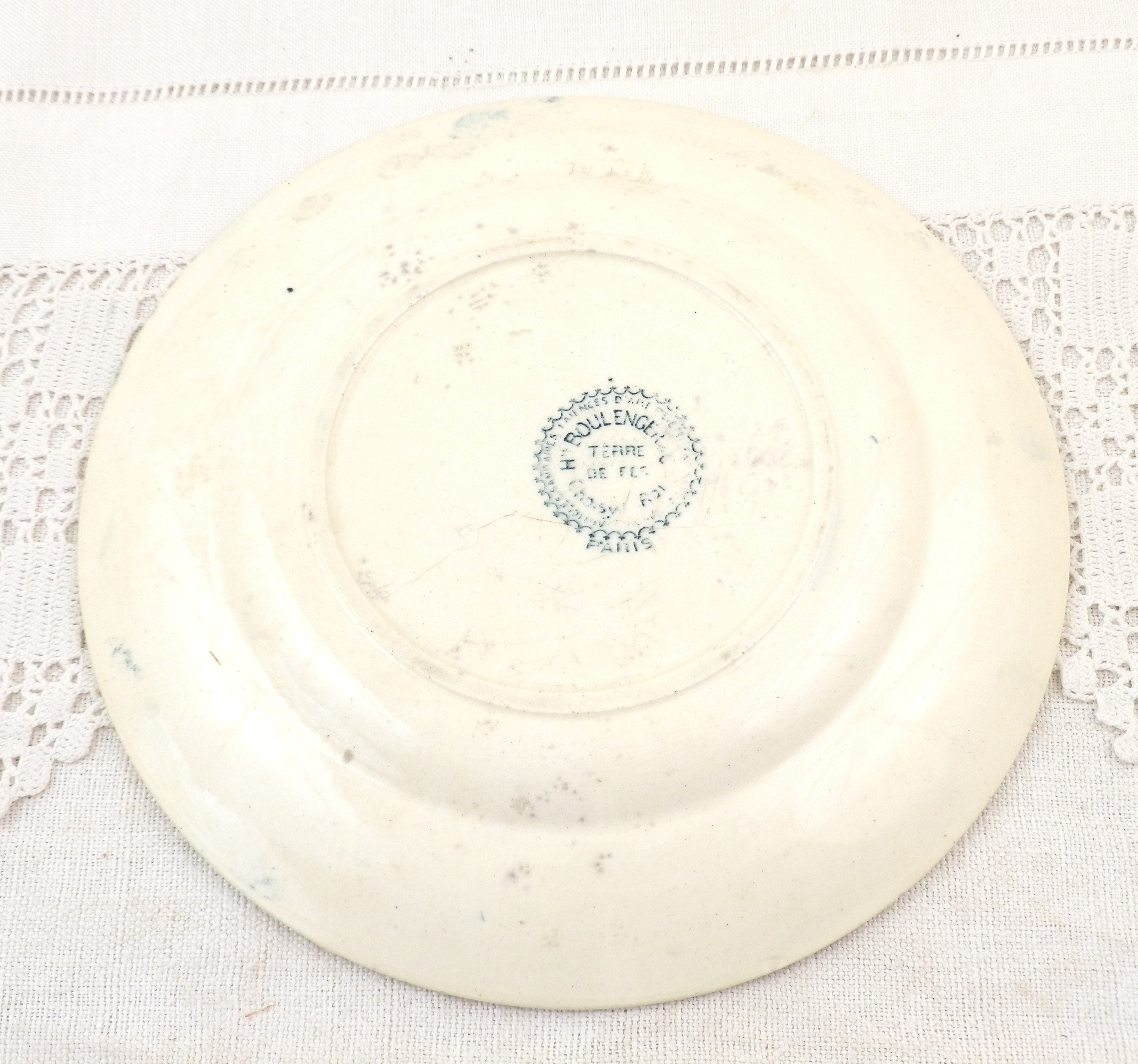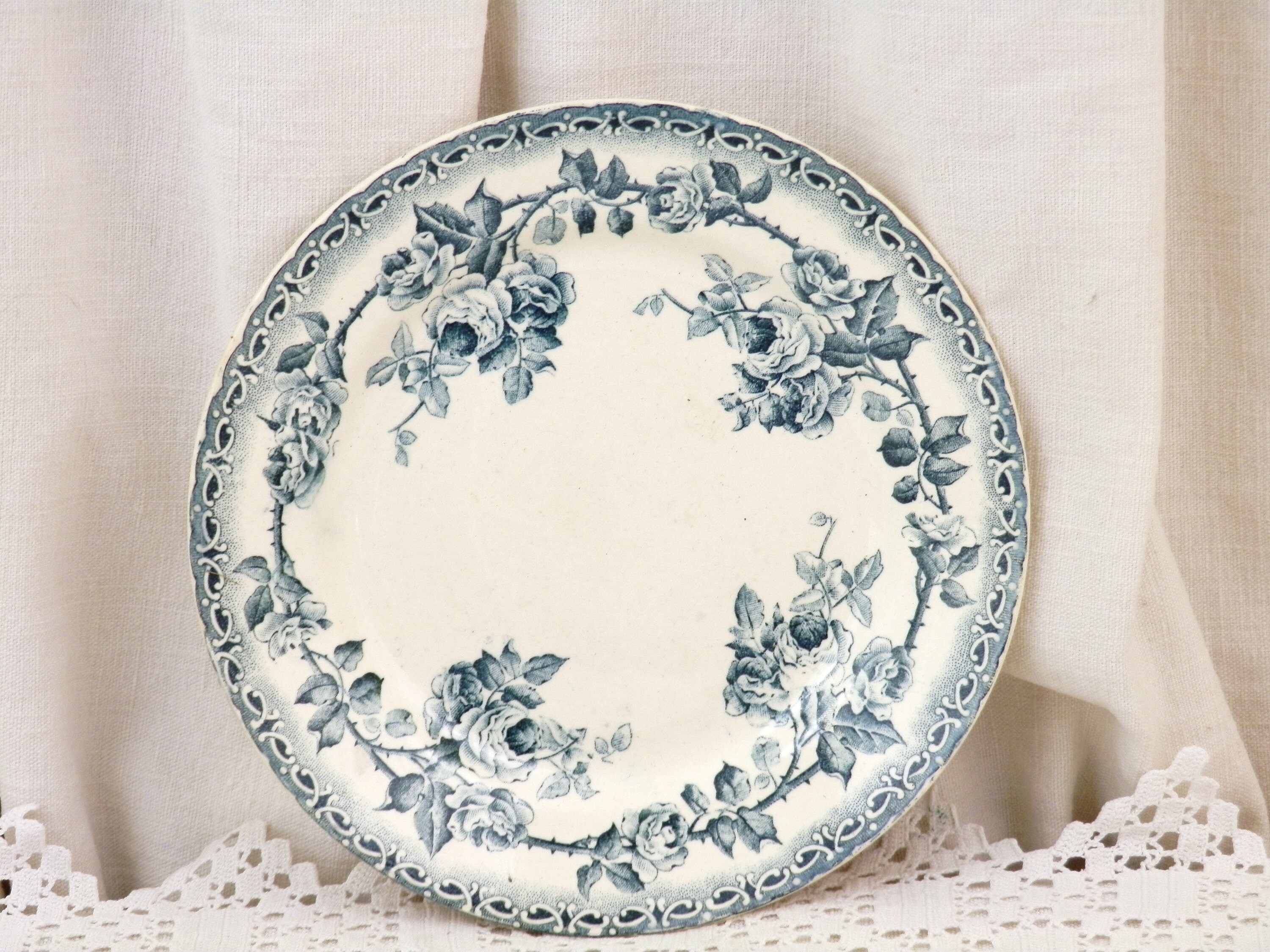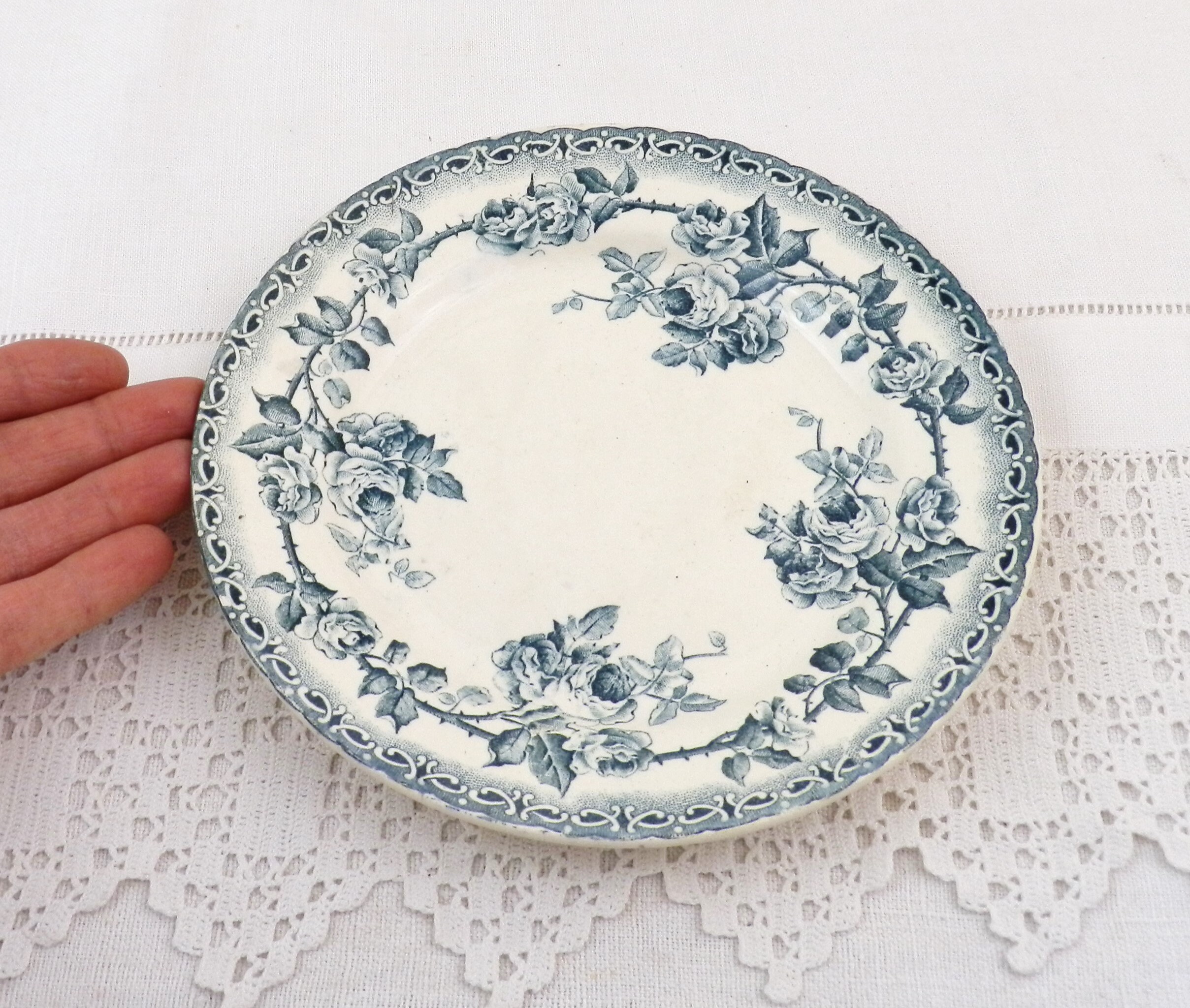Antique French ironstone desert plate with rose pattern in teal blue. Made by H Boulanger. Circa end 1800s.