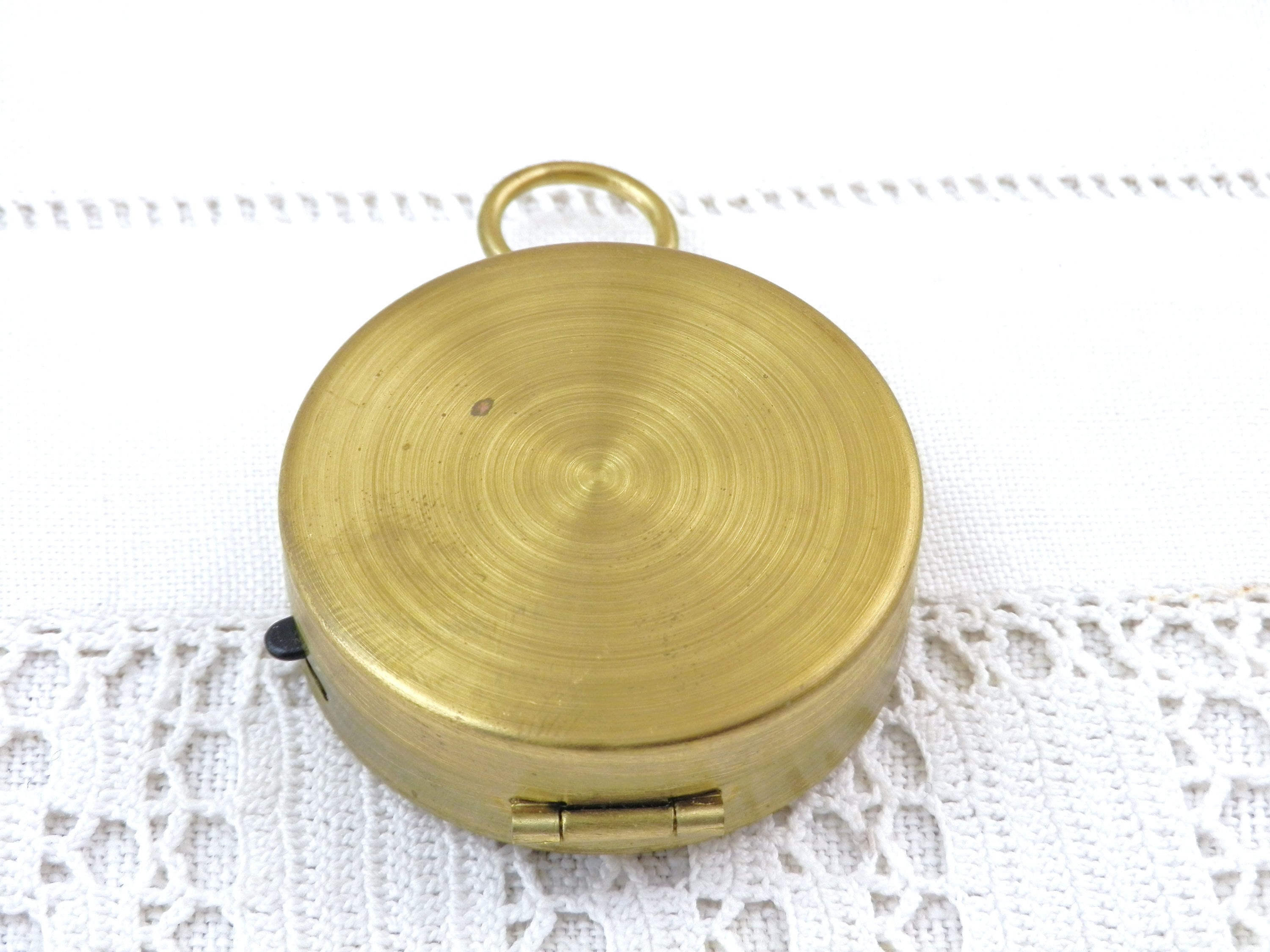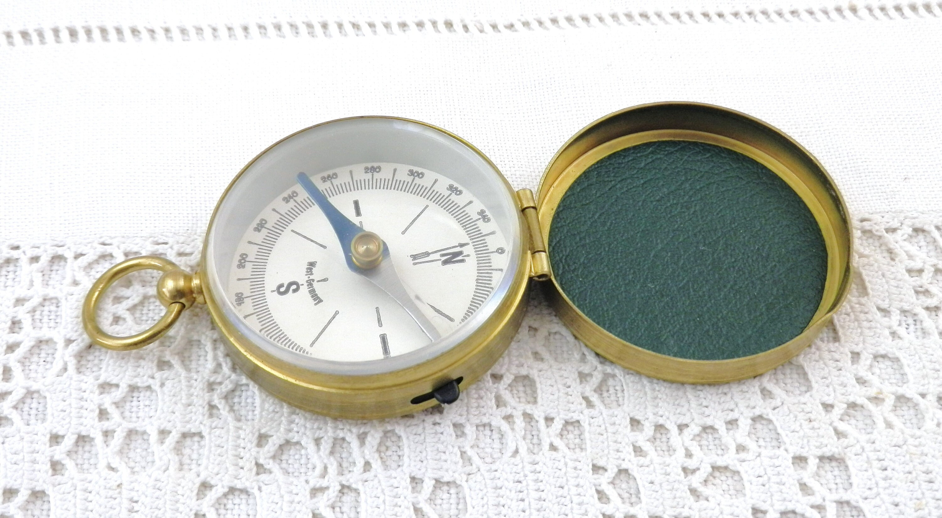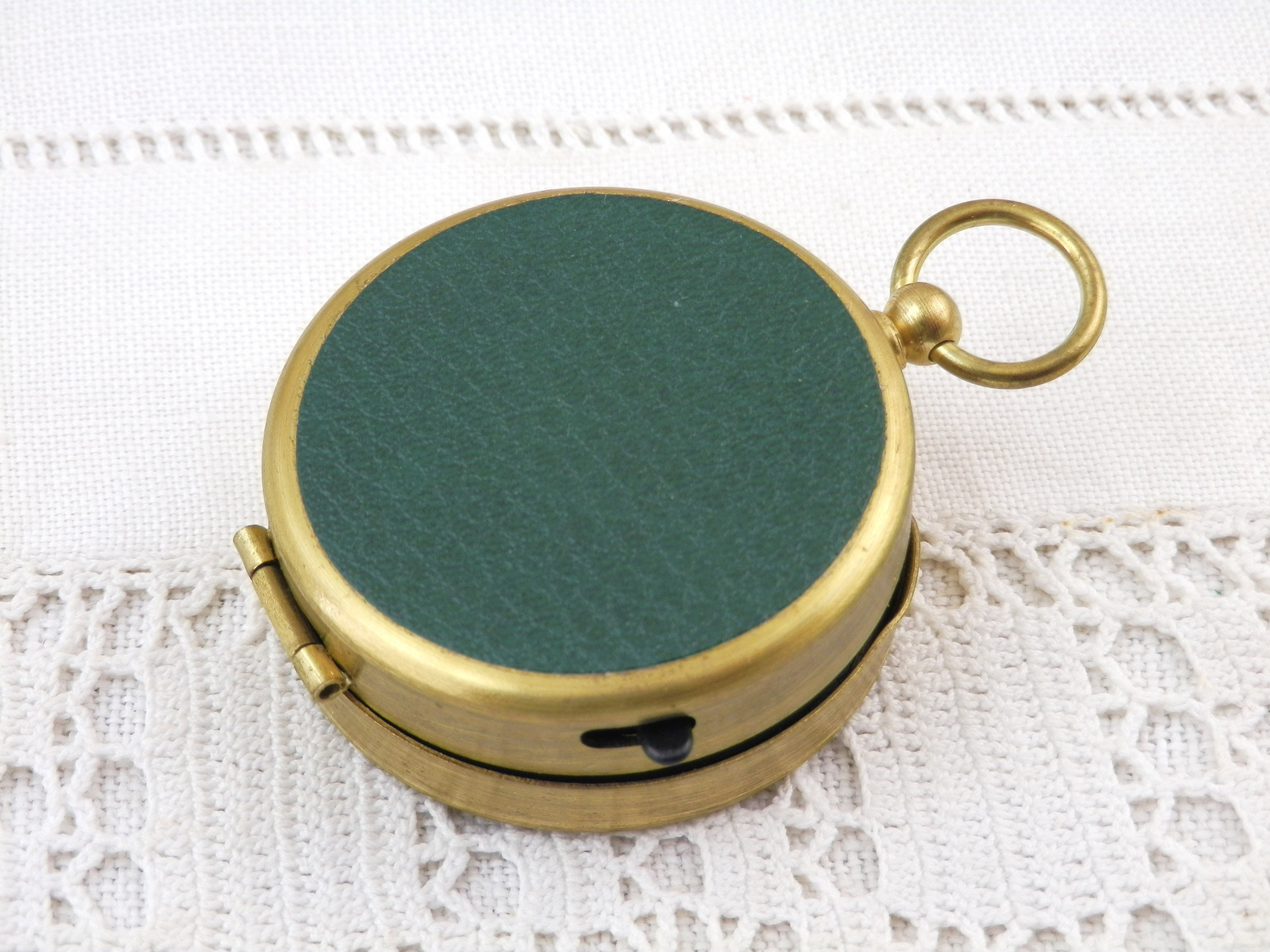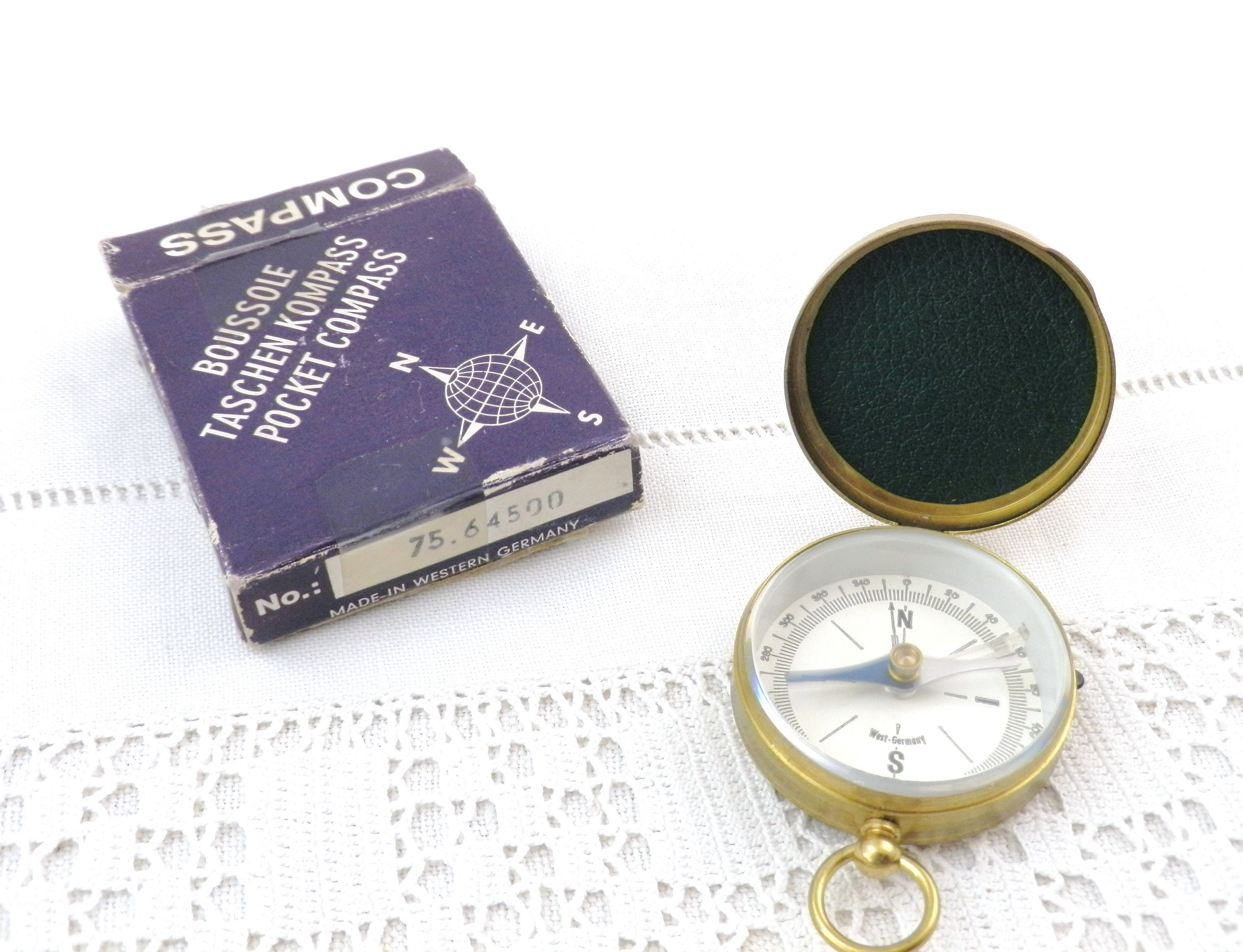 Vintage pocket compass with original box. Made of brass metal in west Germany. Lined with green leather. Folding hanging loop. Circa 1970s.