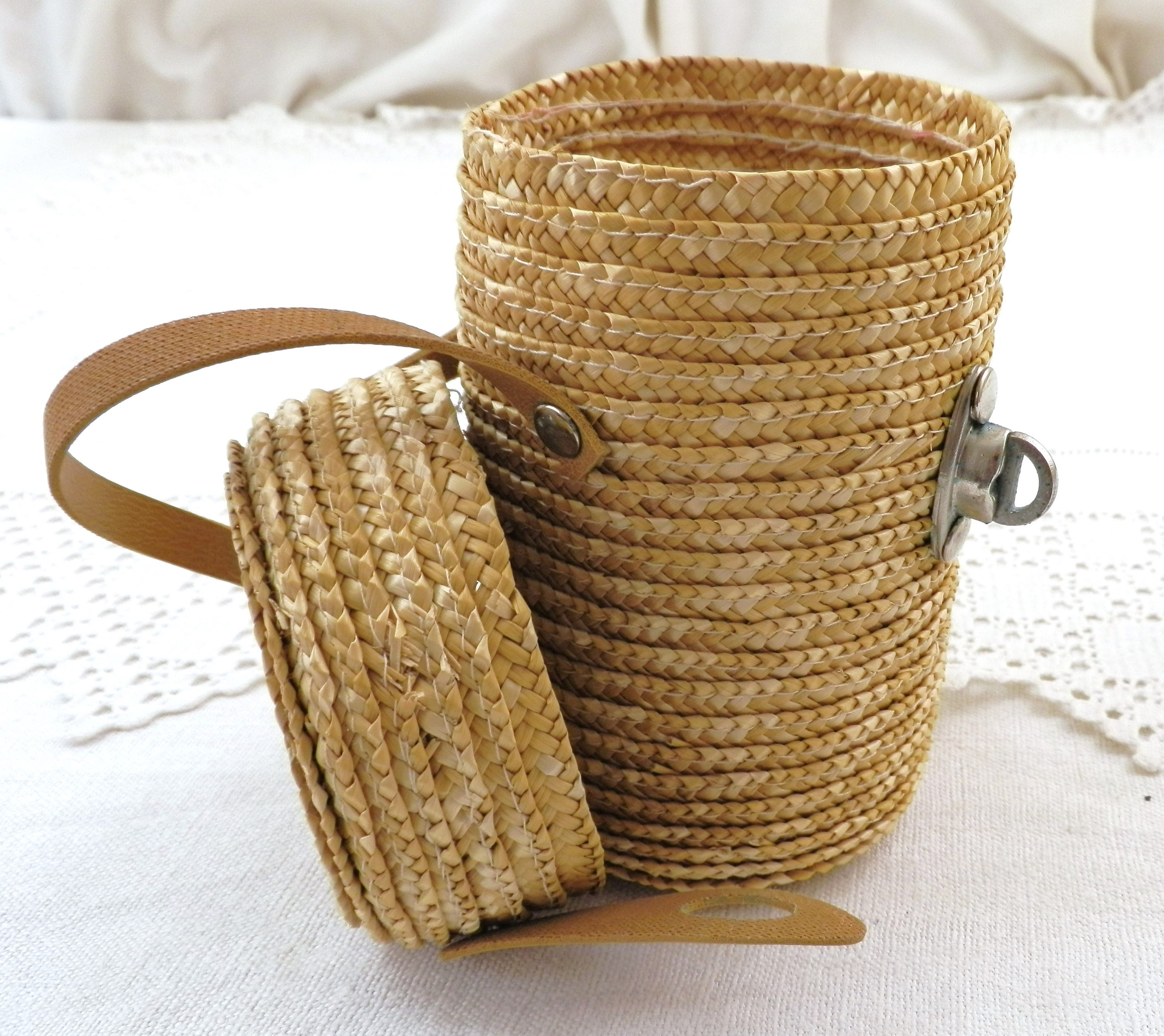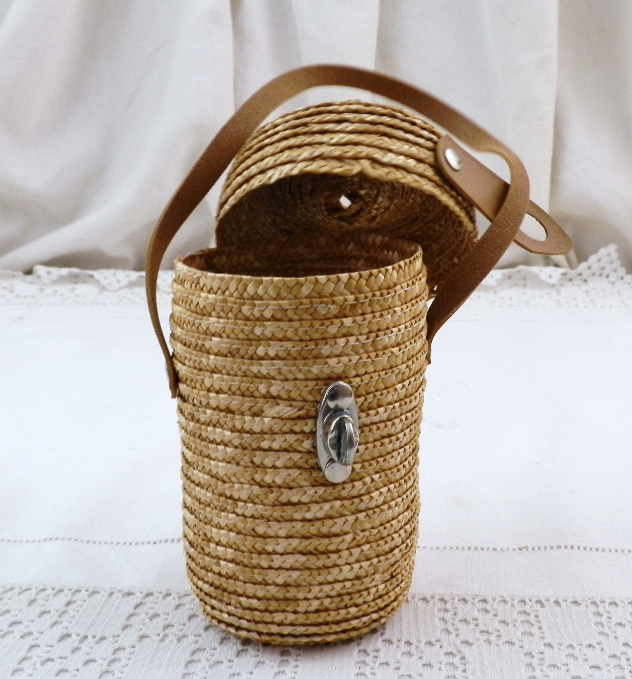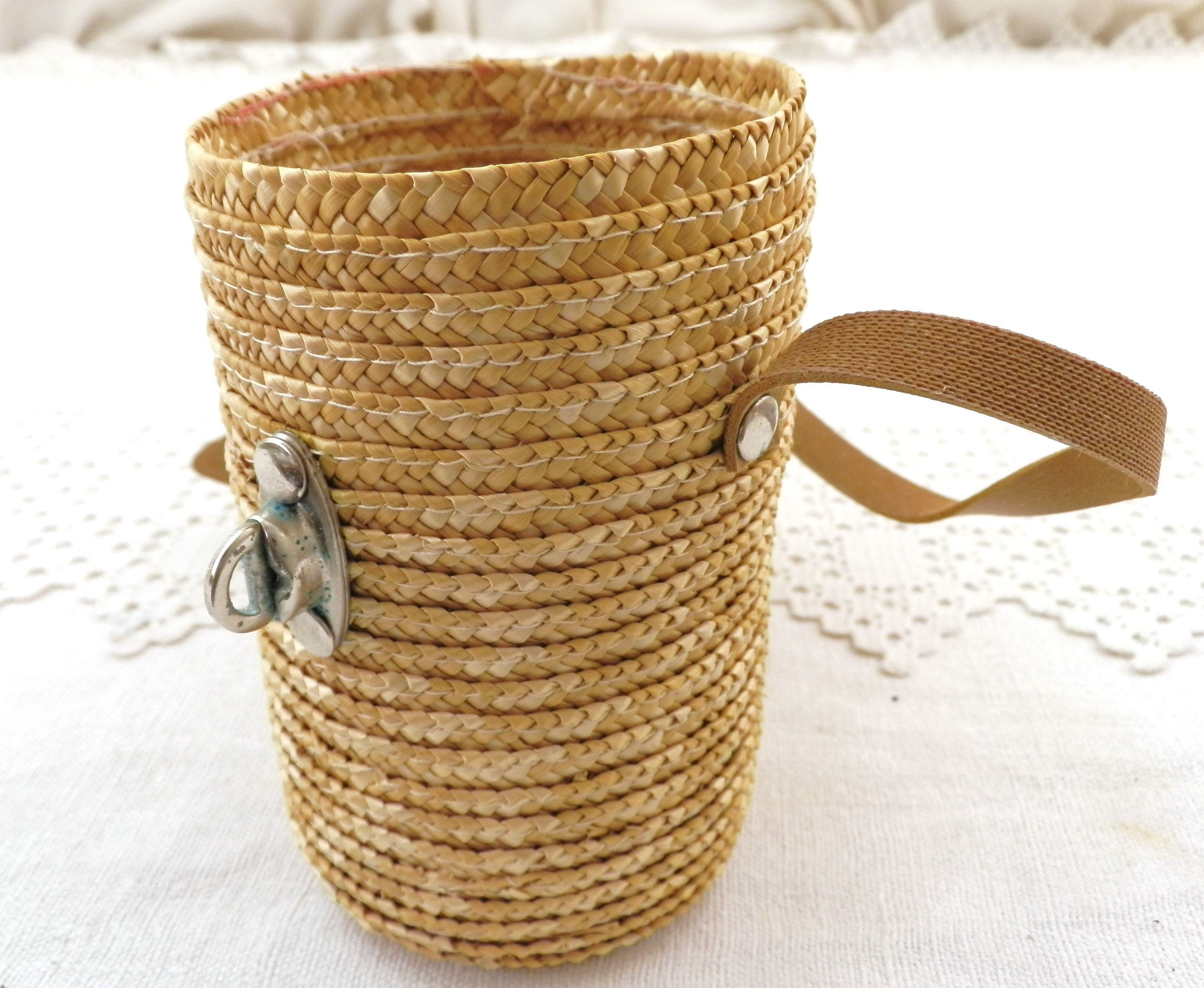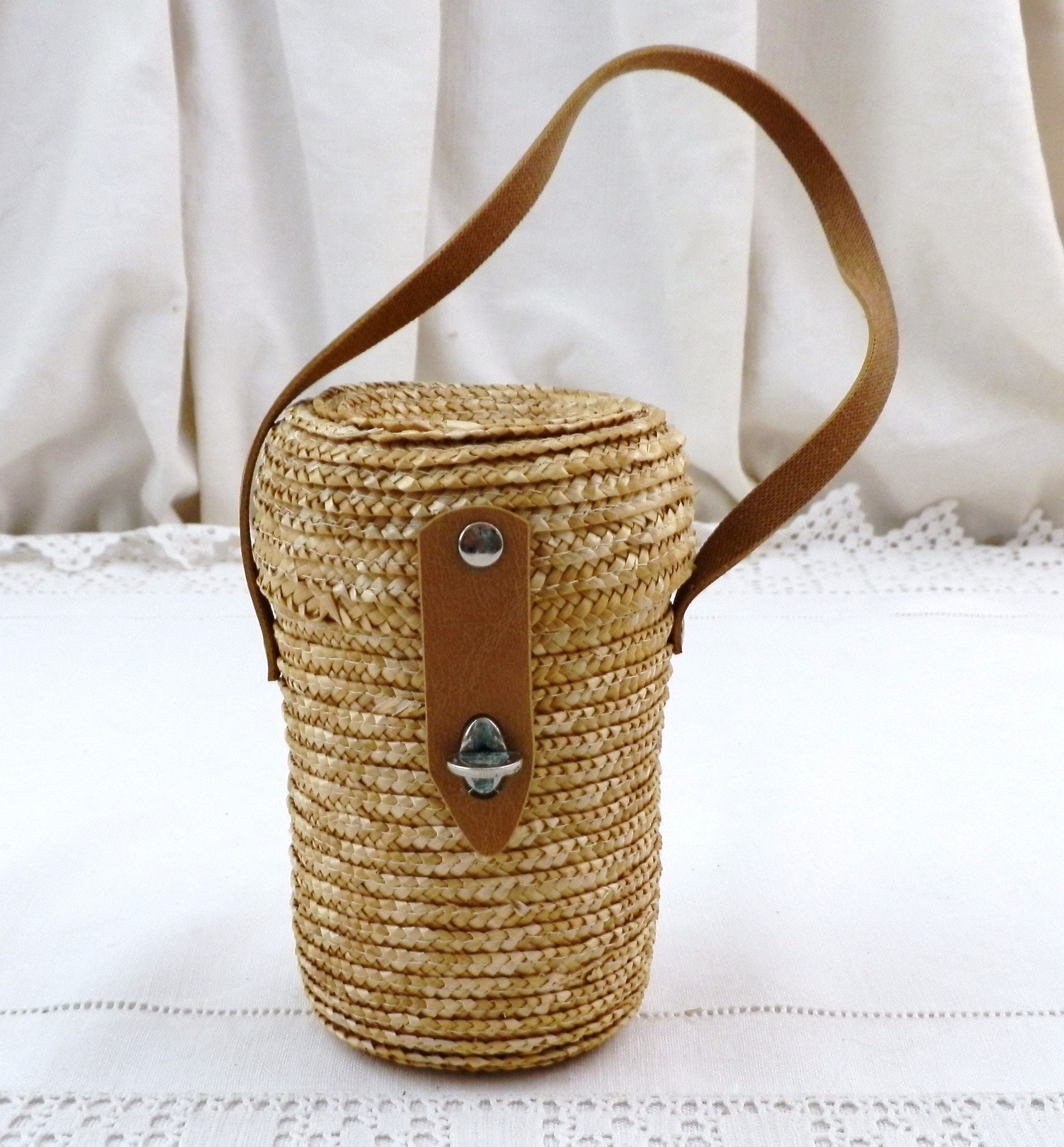 Vintage French spa glass basket. Used to carry ones glass for tasting the waters in places such as Vichy. Could be used for picnics camping etc. Would fit glass 7 cm / 2.75" diameter by 11 cm / 4.33" high. Made of woven straw, metal handle with fake leather handle. Circa 1950s.