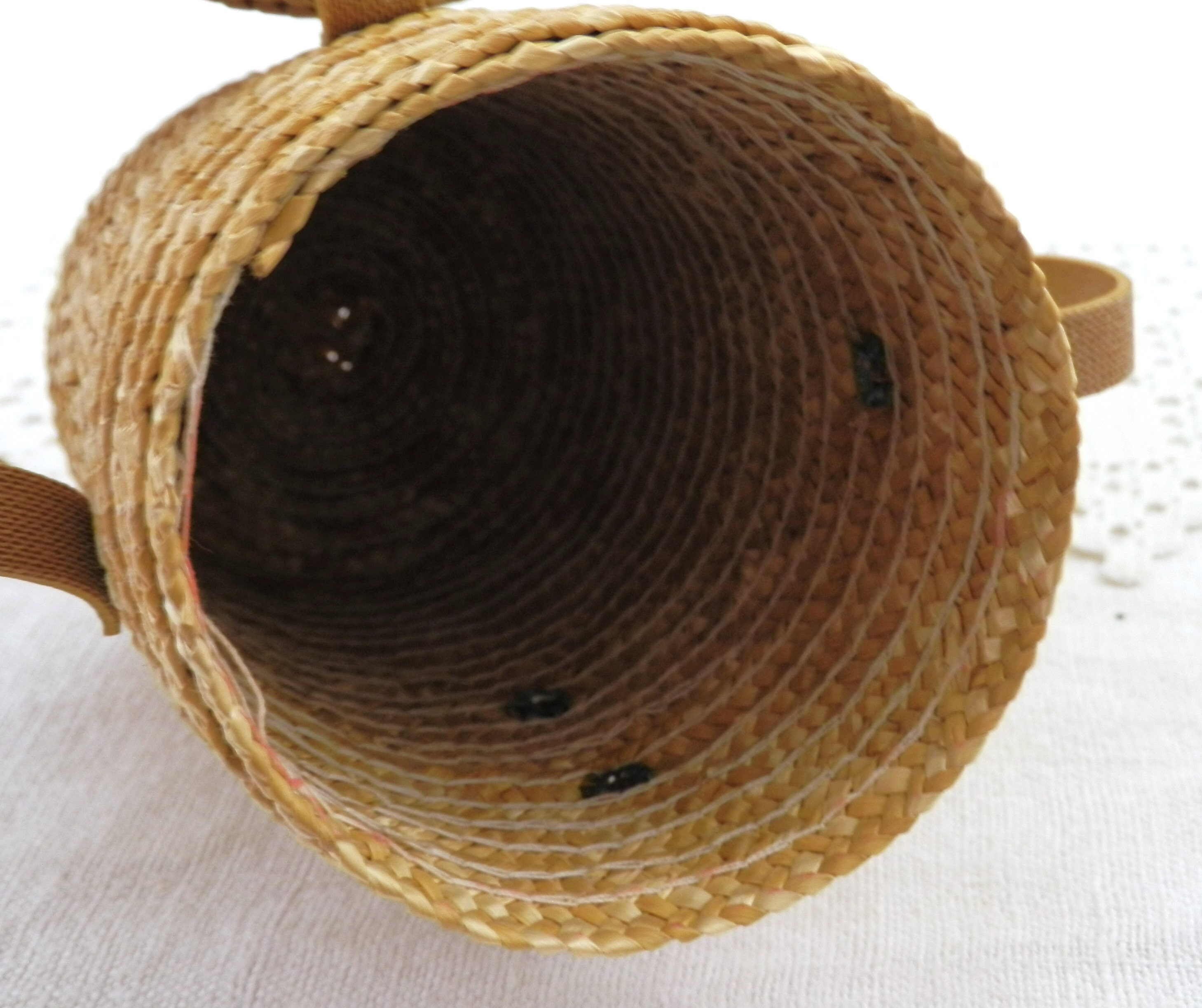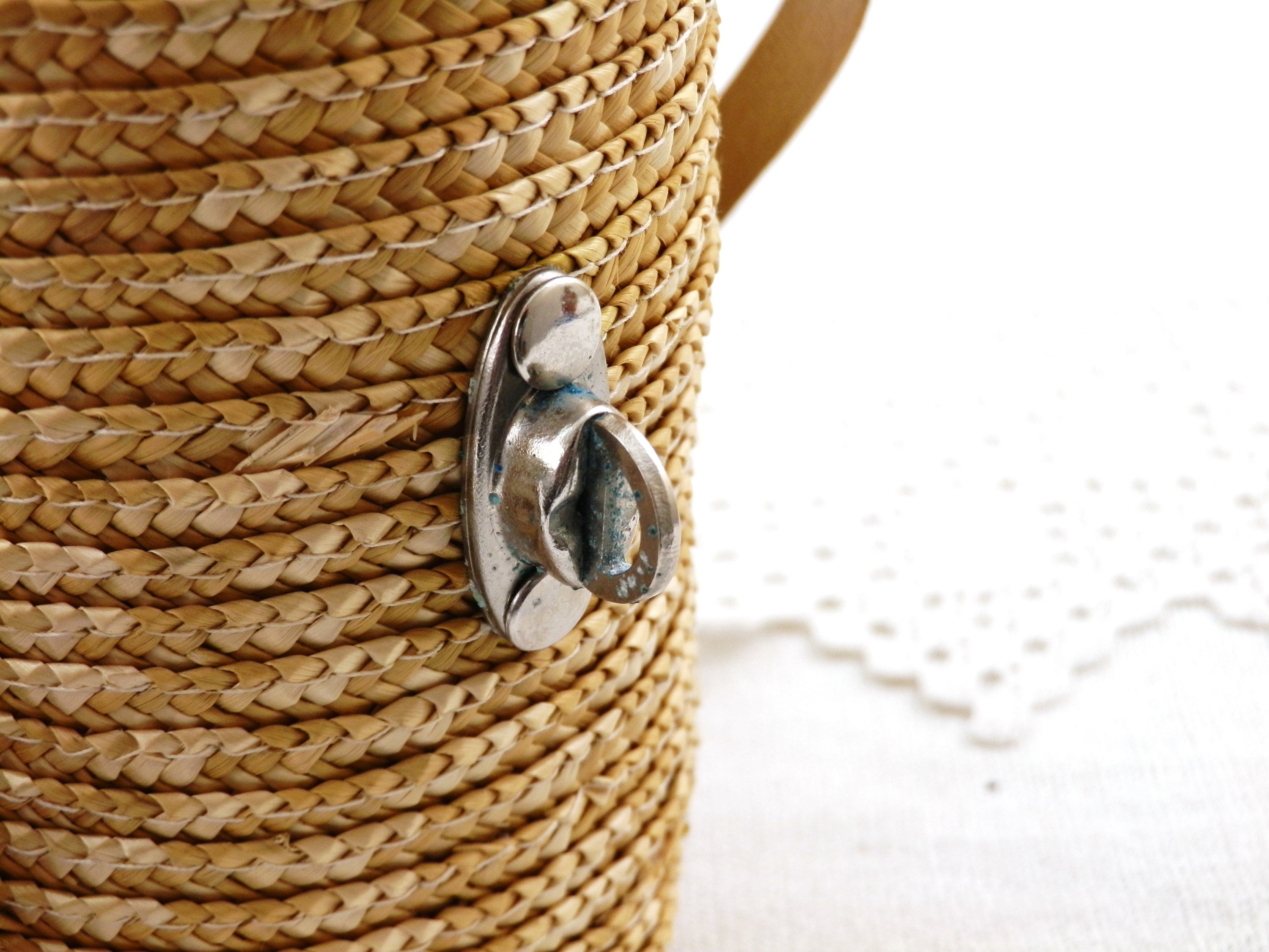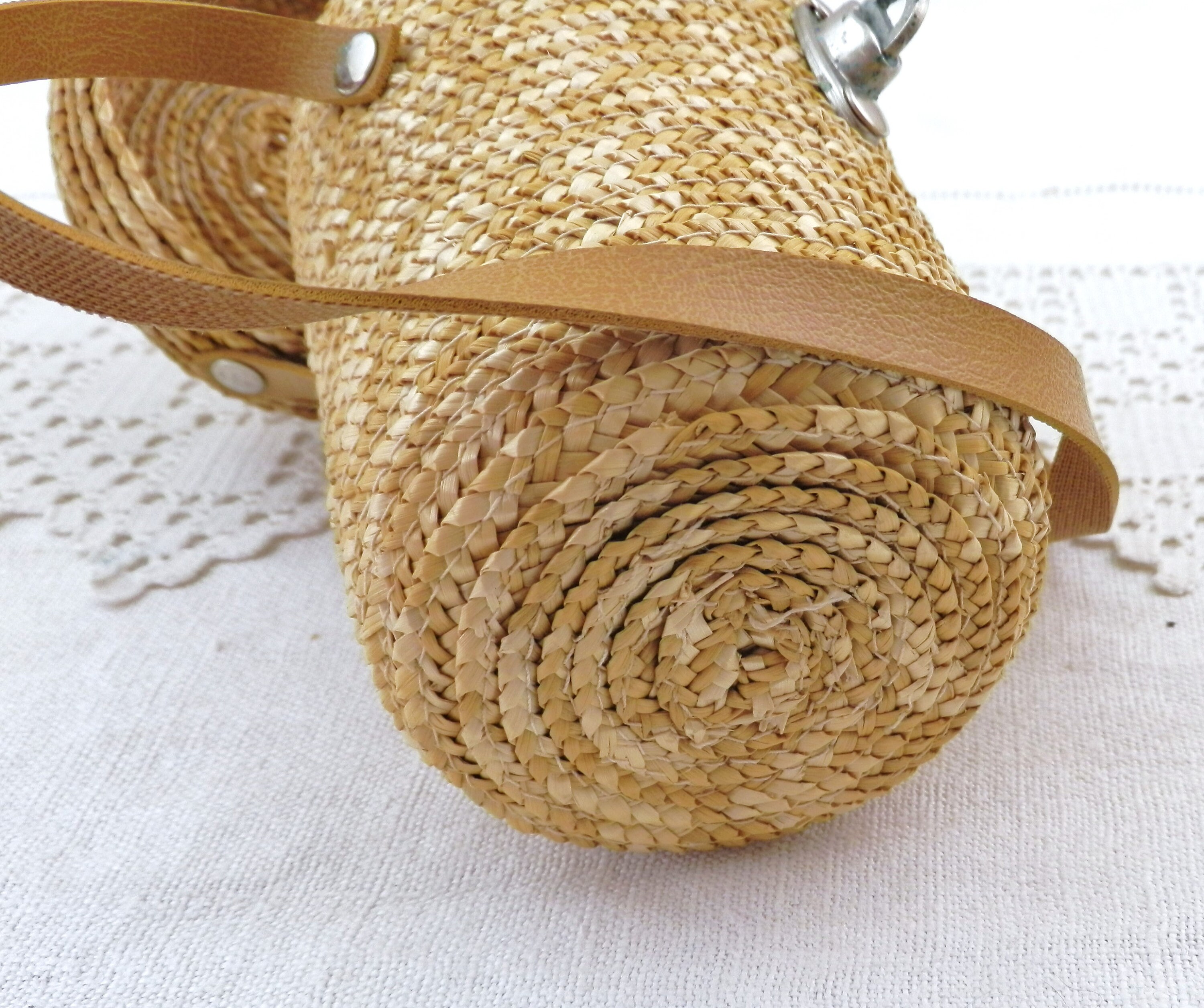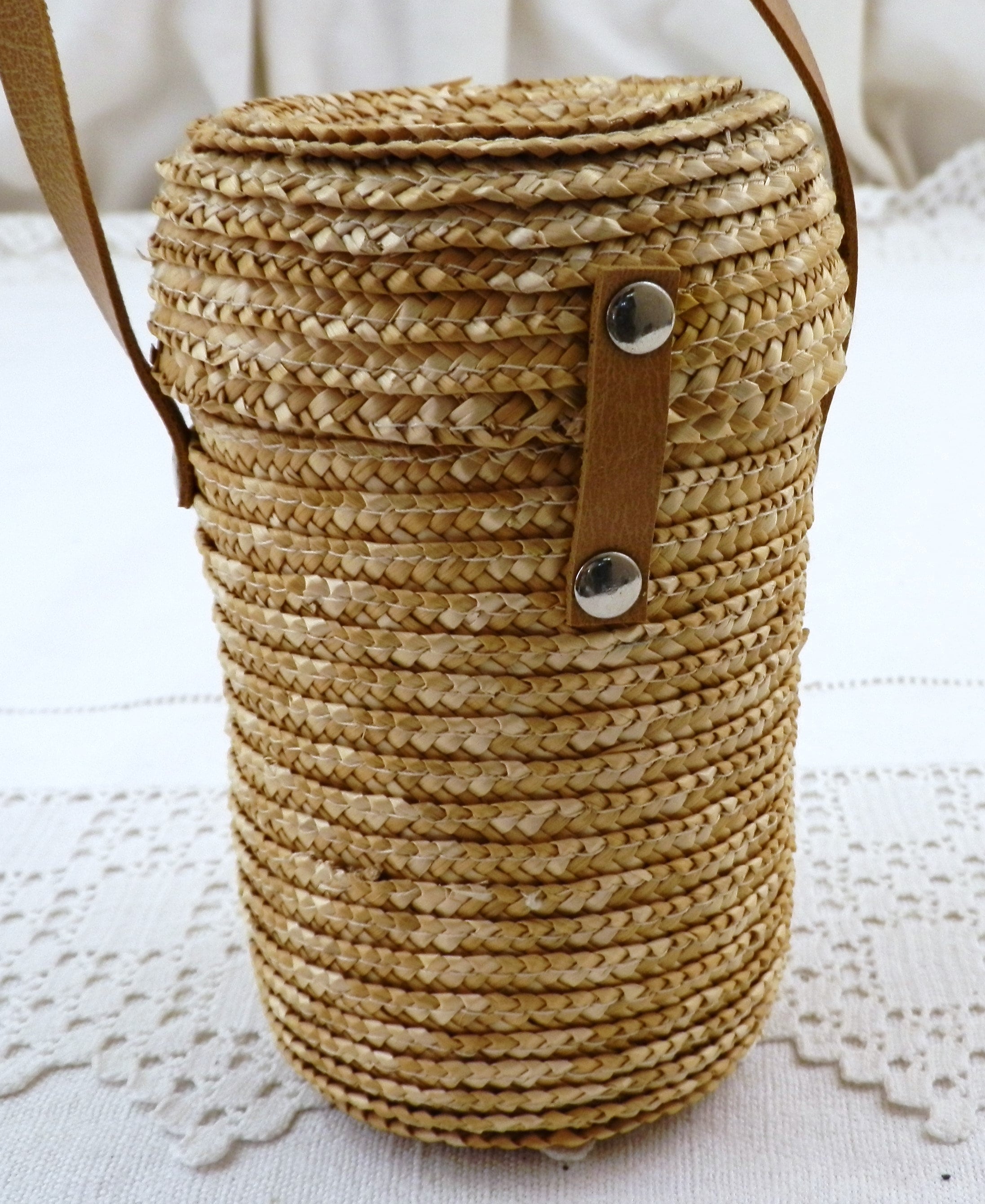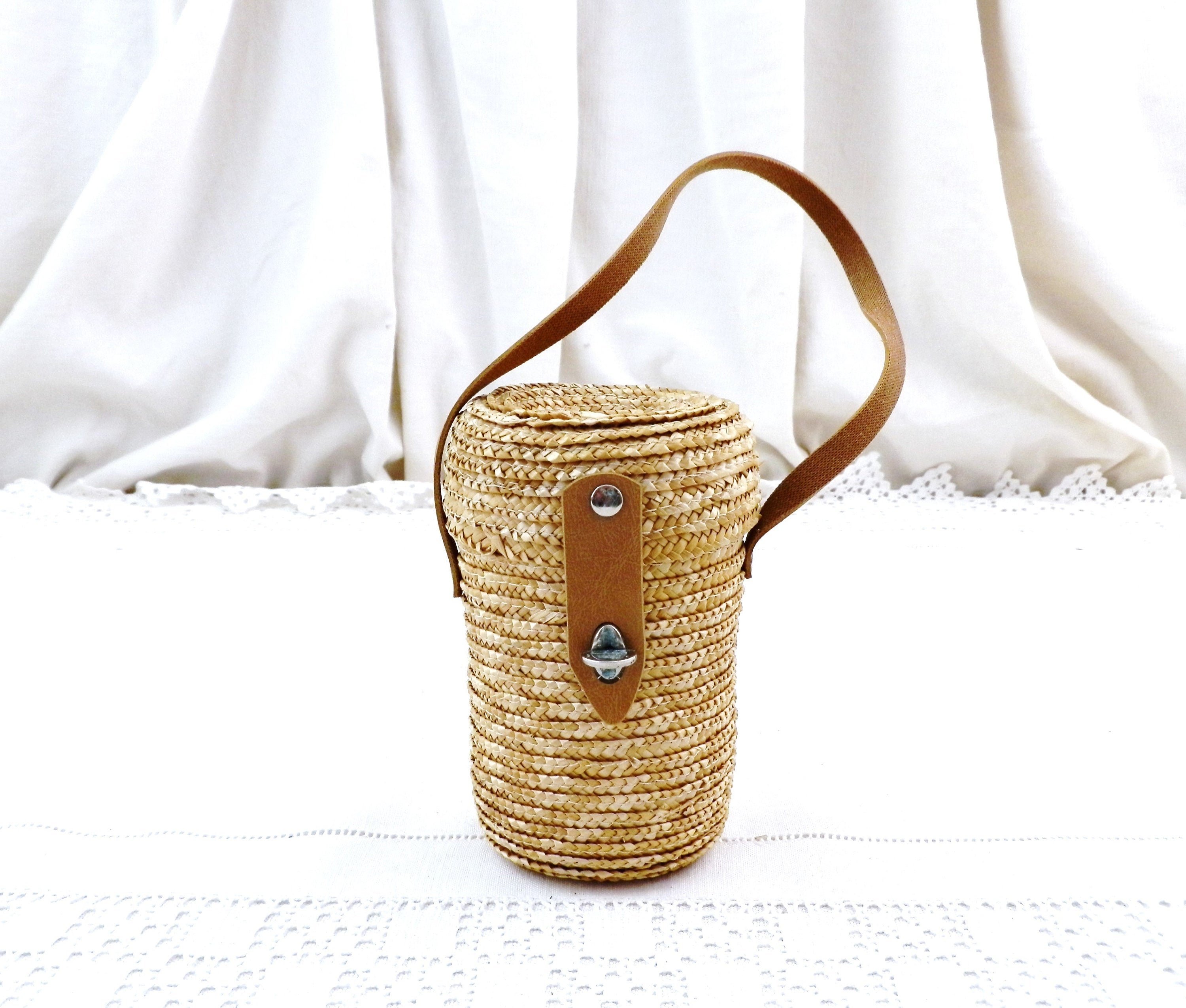 Vintage French spa glass basket. Used to carry ones glass for tasting the waters in places such as Vichy. Could be used for picnics camping etc. Would fit glass 7 cm / 2.75" diameter by 11 cm / 4.33" high. Made of woven straw, metal handle with fake leather handle. Circa 1950s.