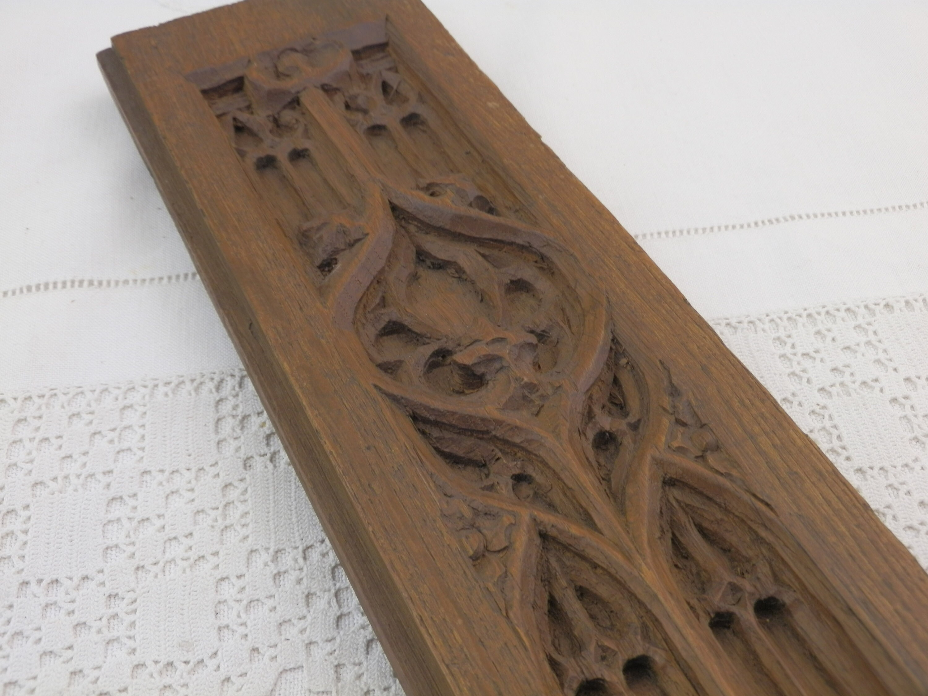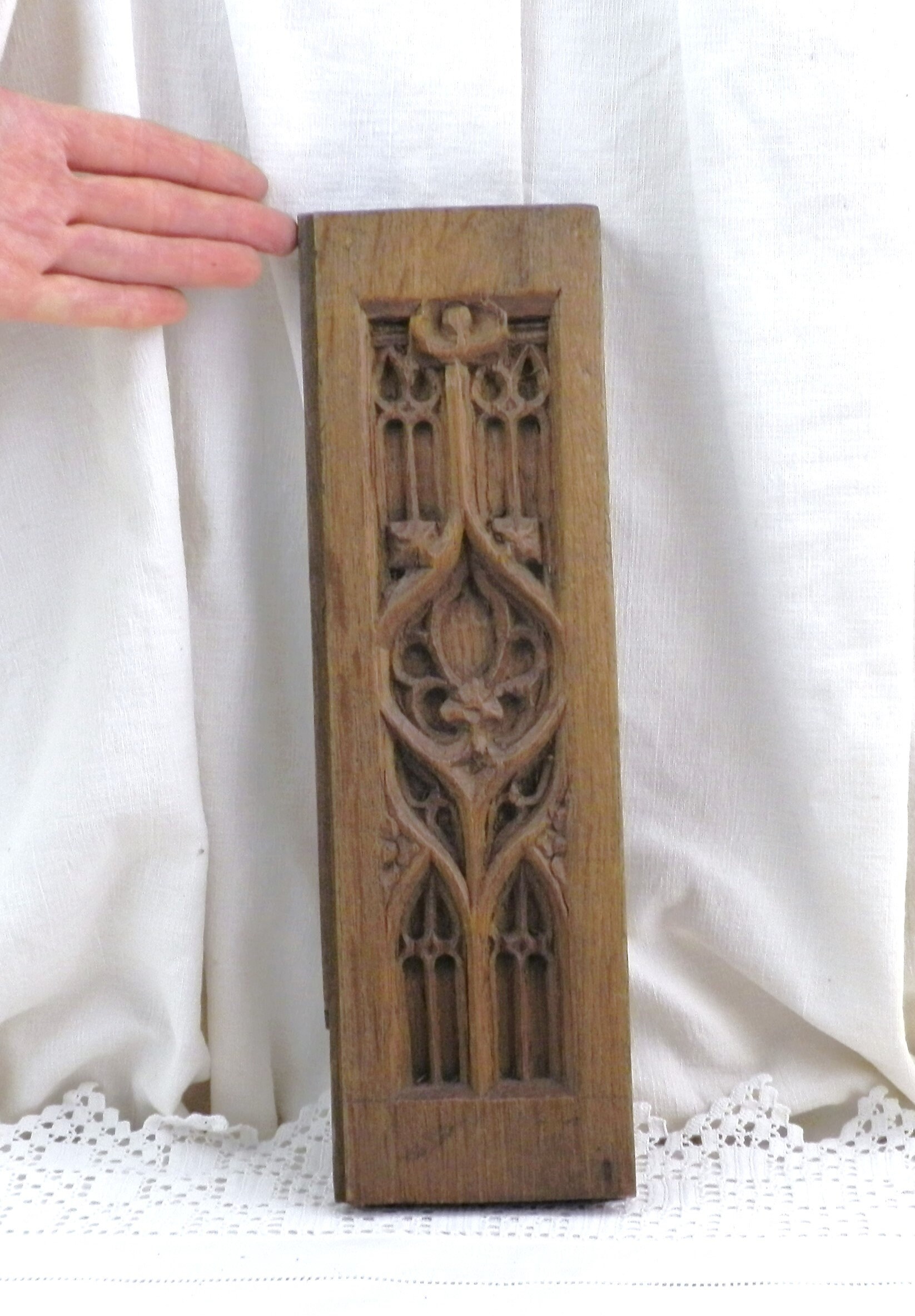 Antique French carved wooden panel. Reproduction gothic style. Originally part of a chest. Made of oak wood. Circa 1800s. 5 panels are available.