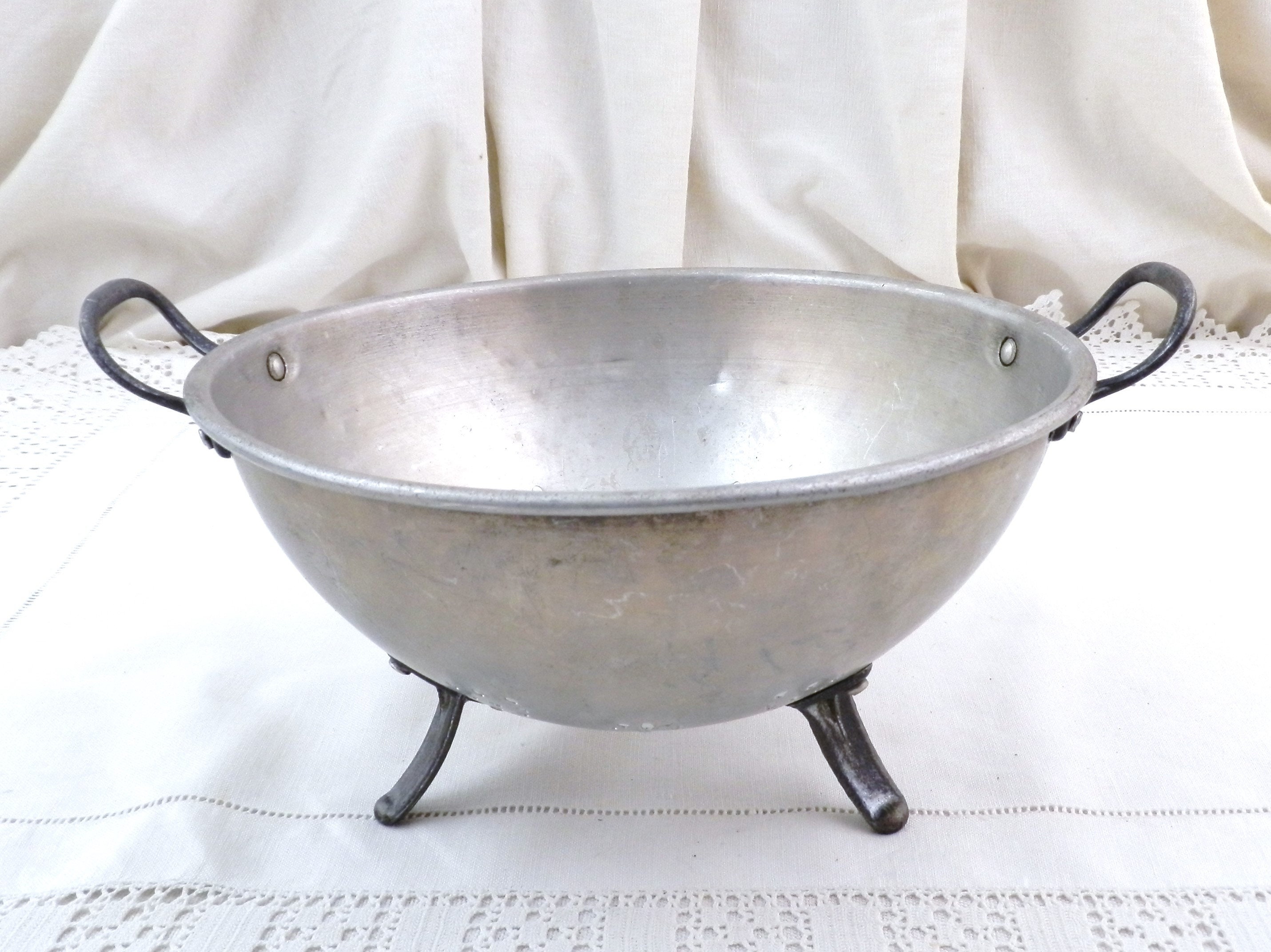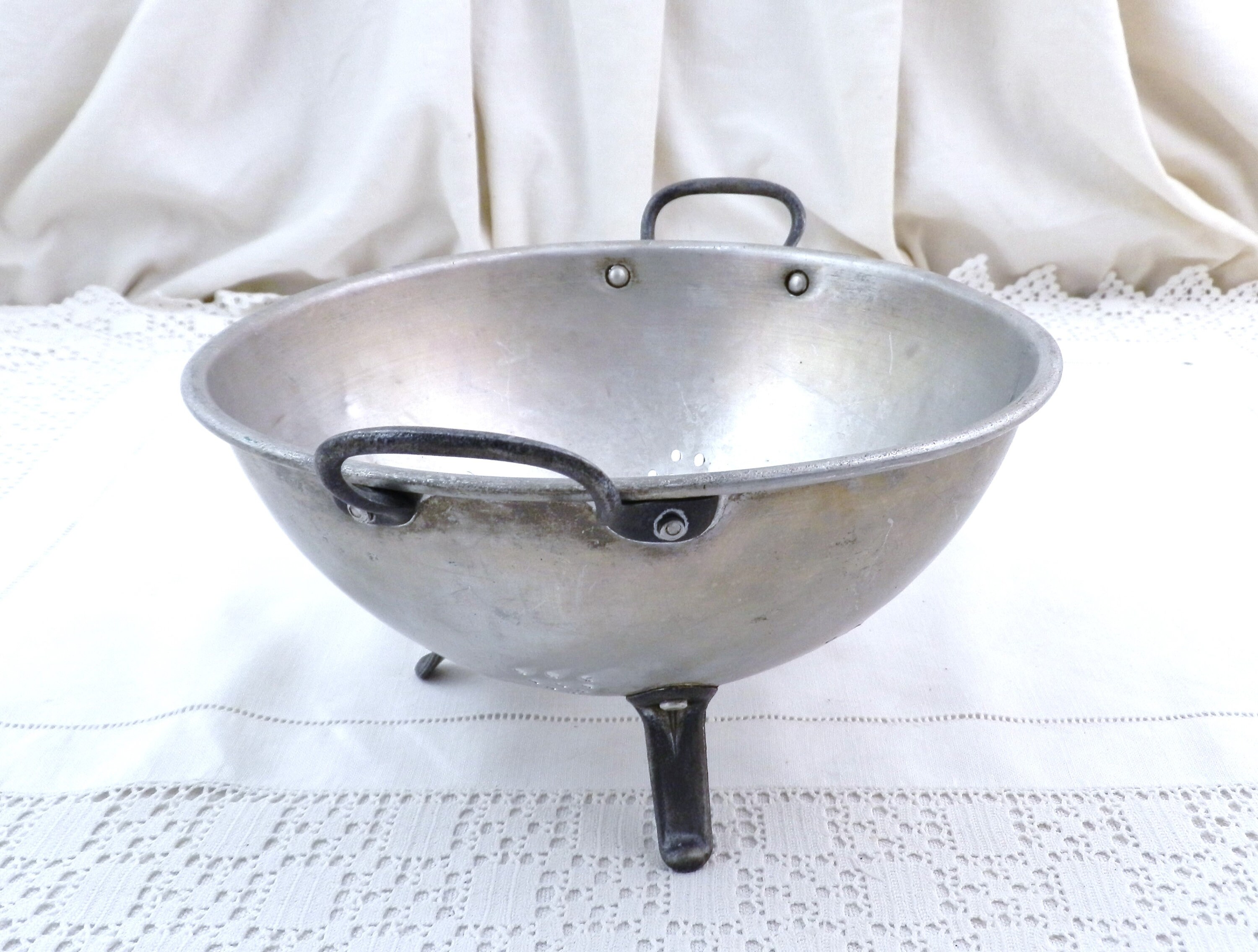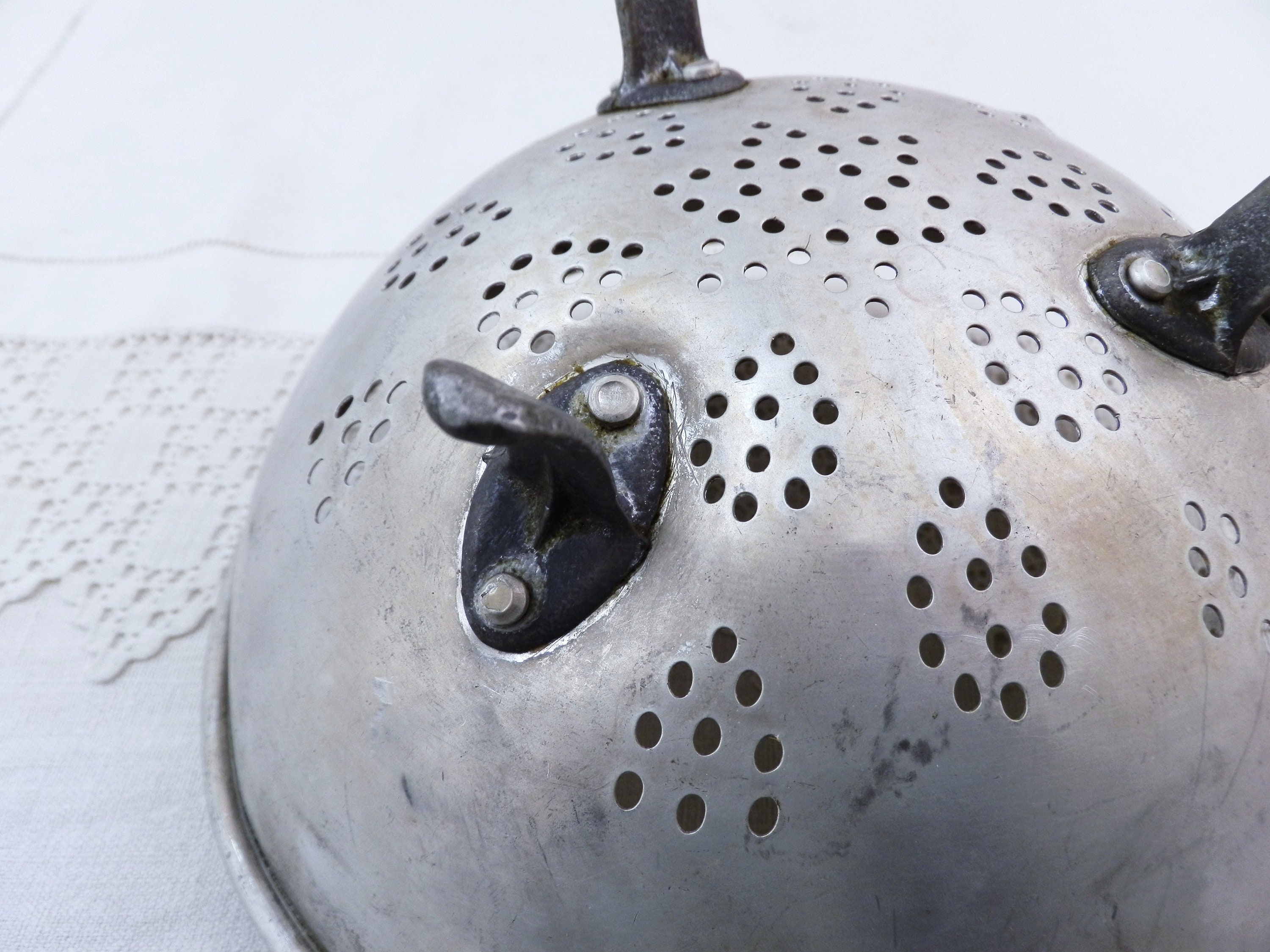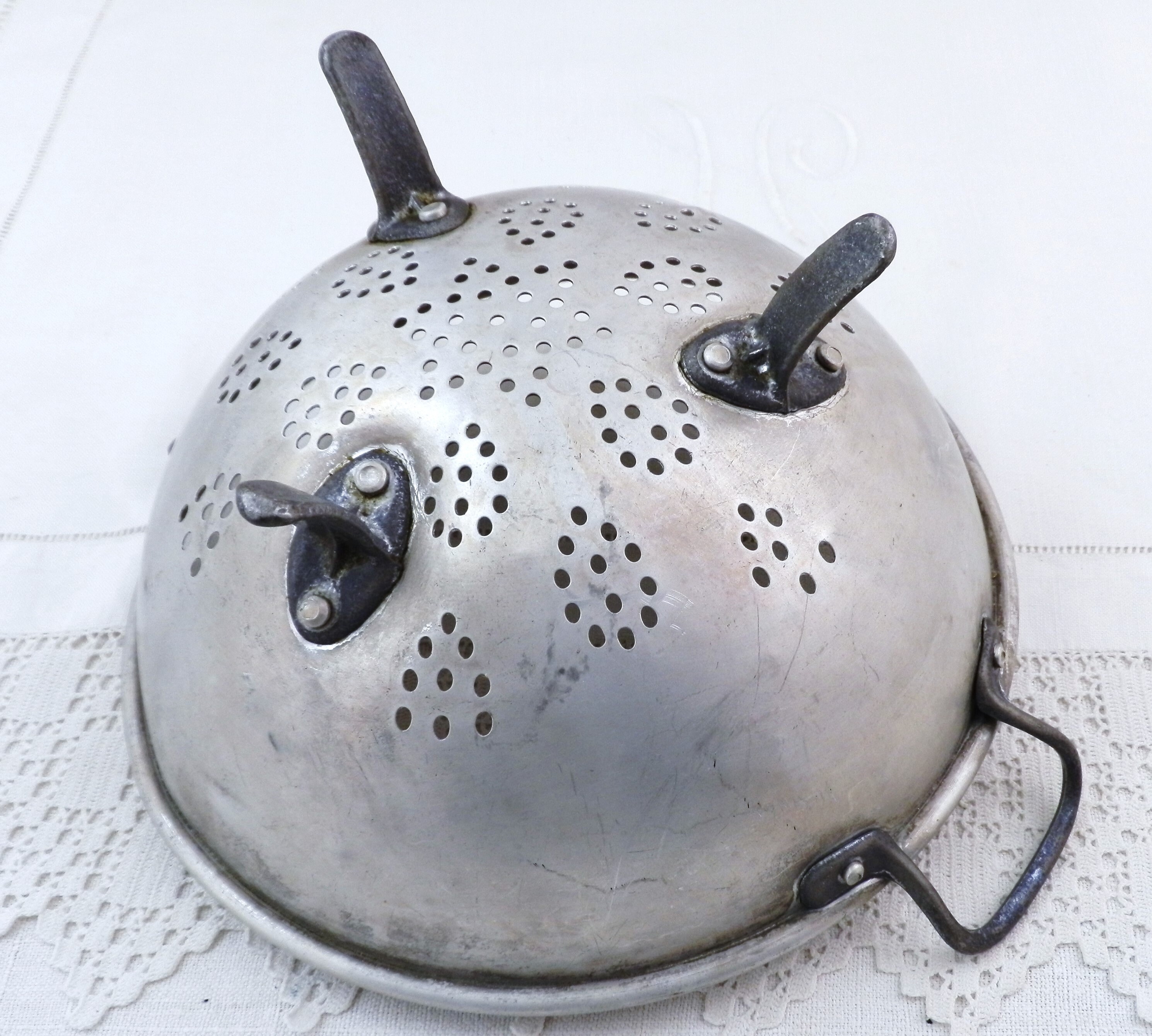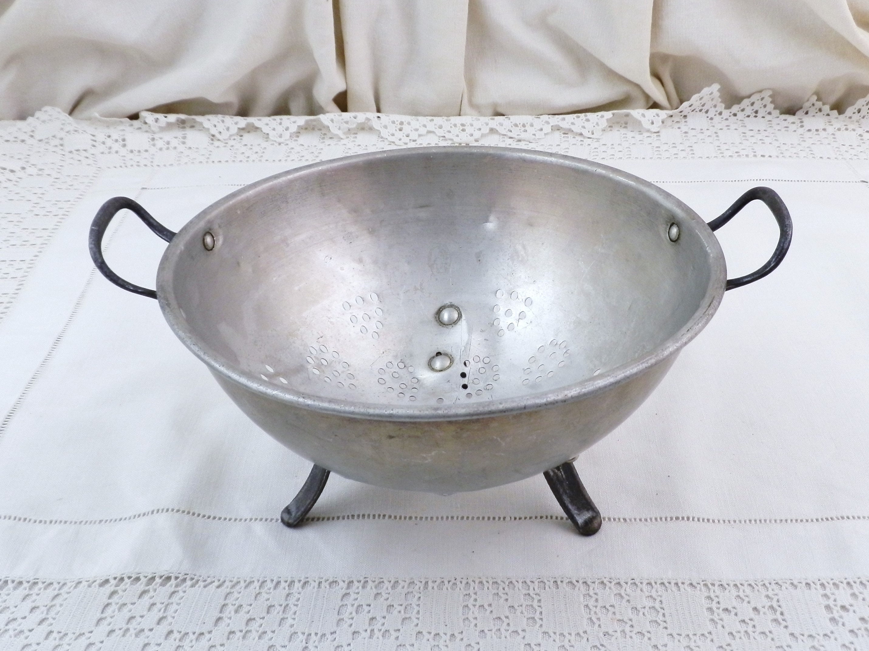 Vintage French 3 footed colander strainer. Made of white metal. Circa 1950s.