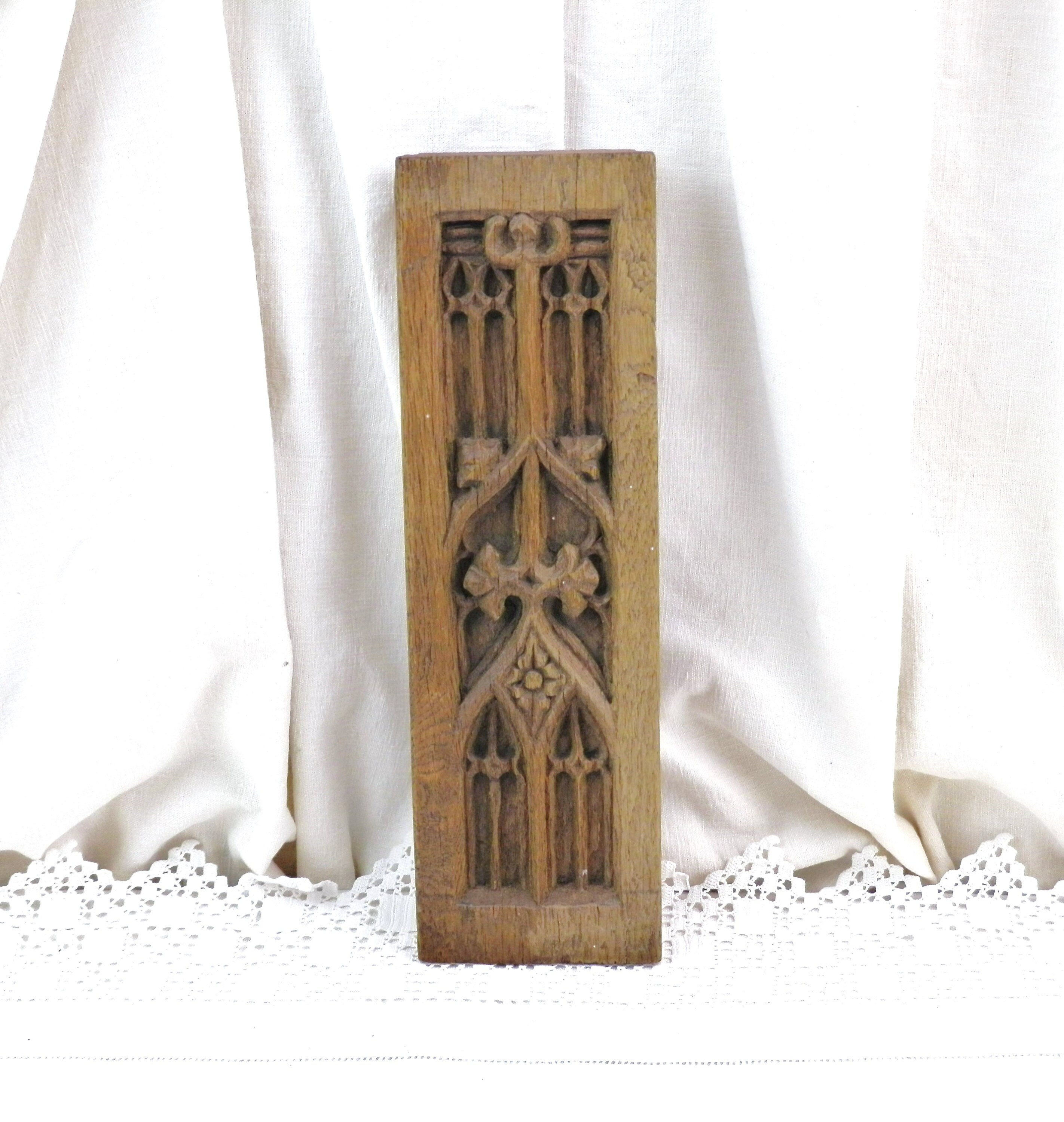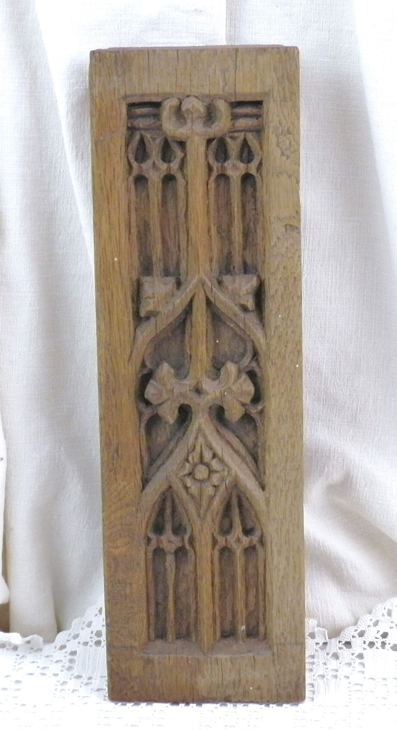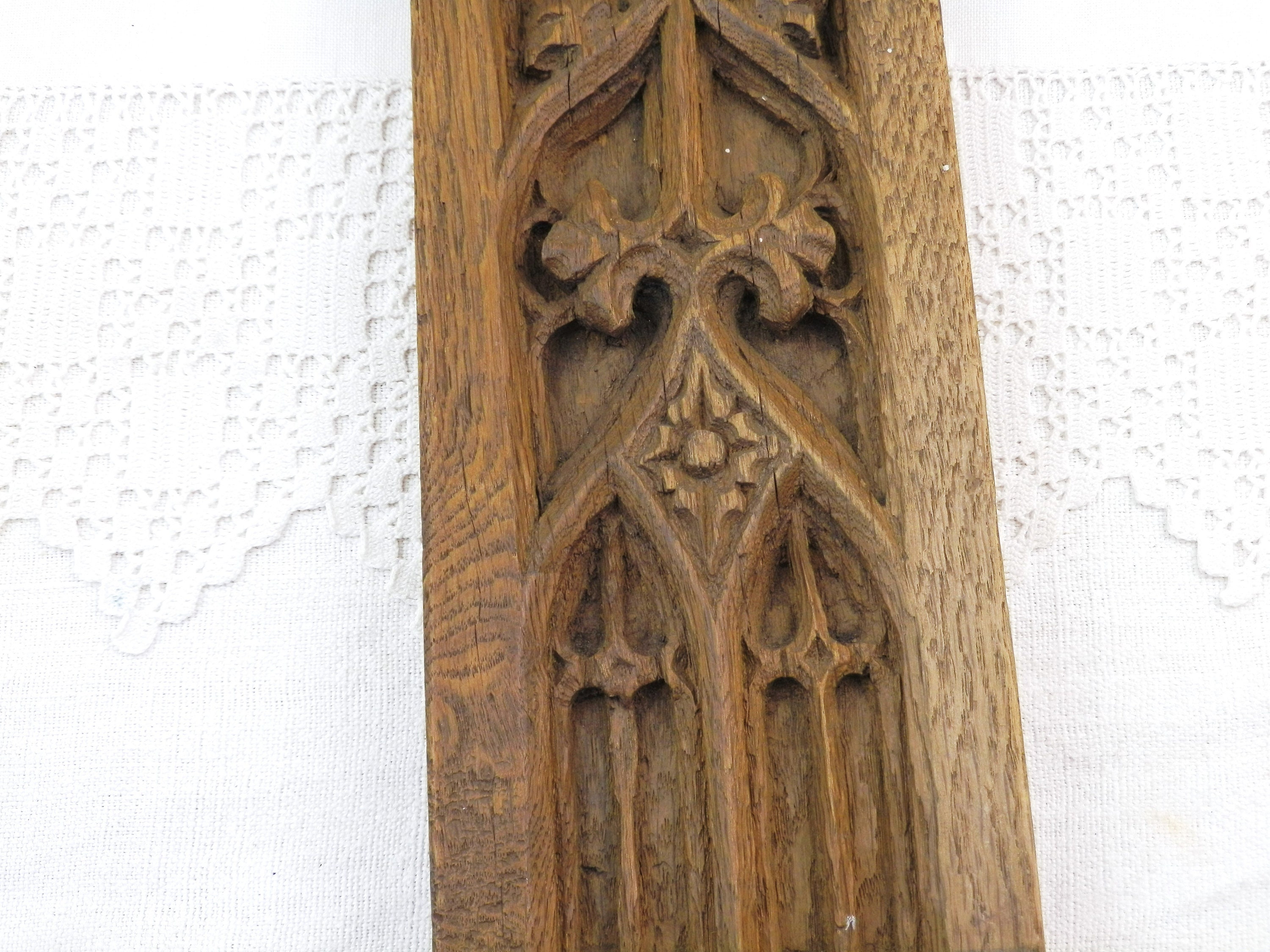 Antique French carved wooden panel. Reproduction gothic style. Originally part of a chest. Made of oak wood. Circa 1800s. 5 panels are available.