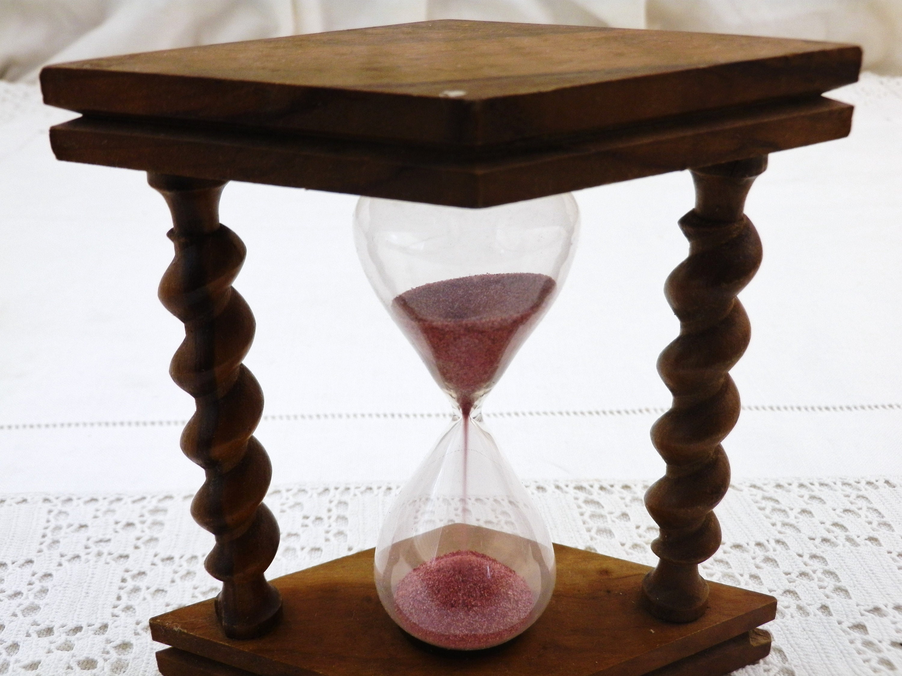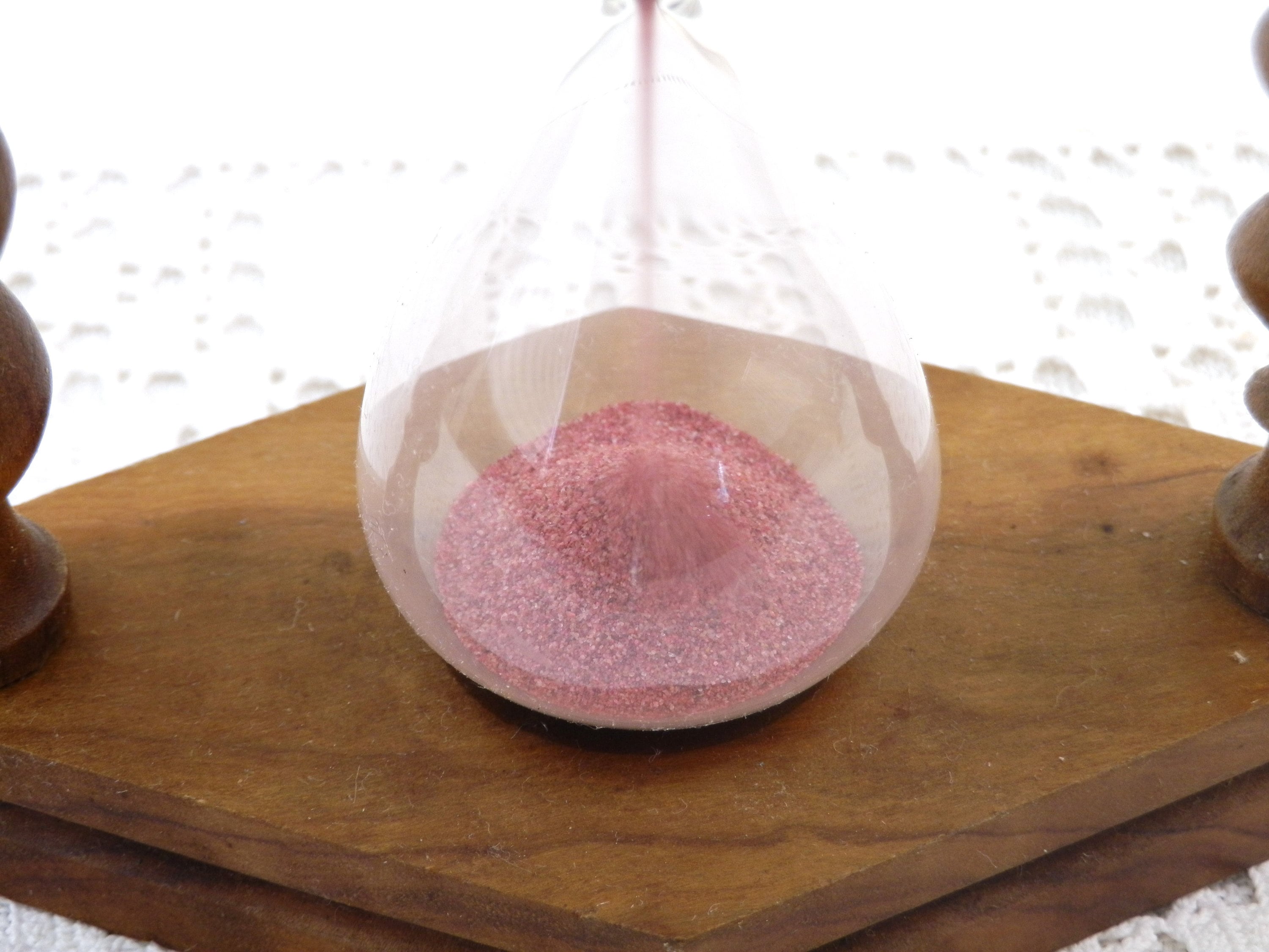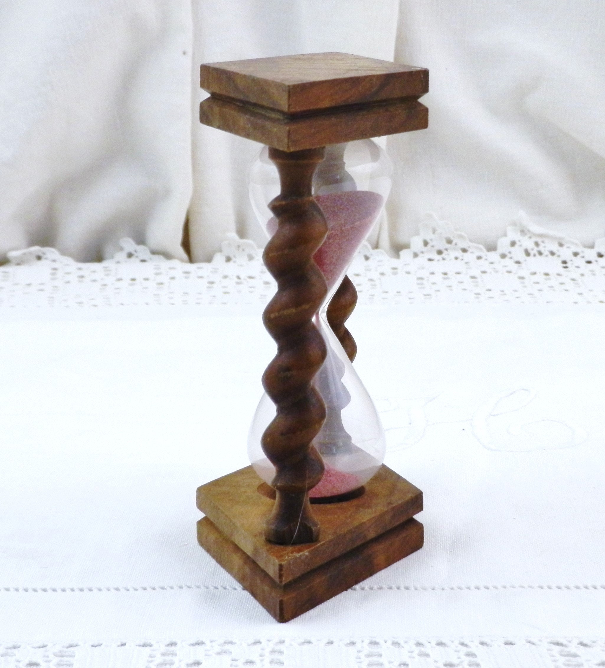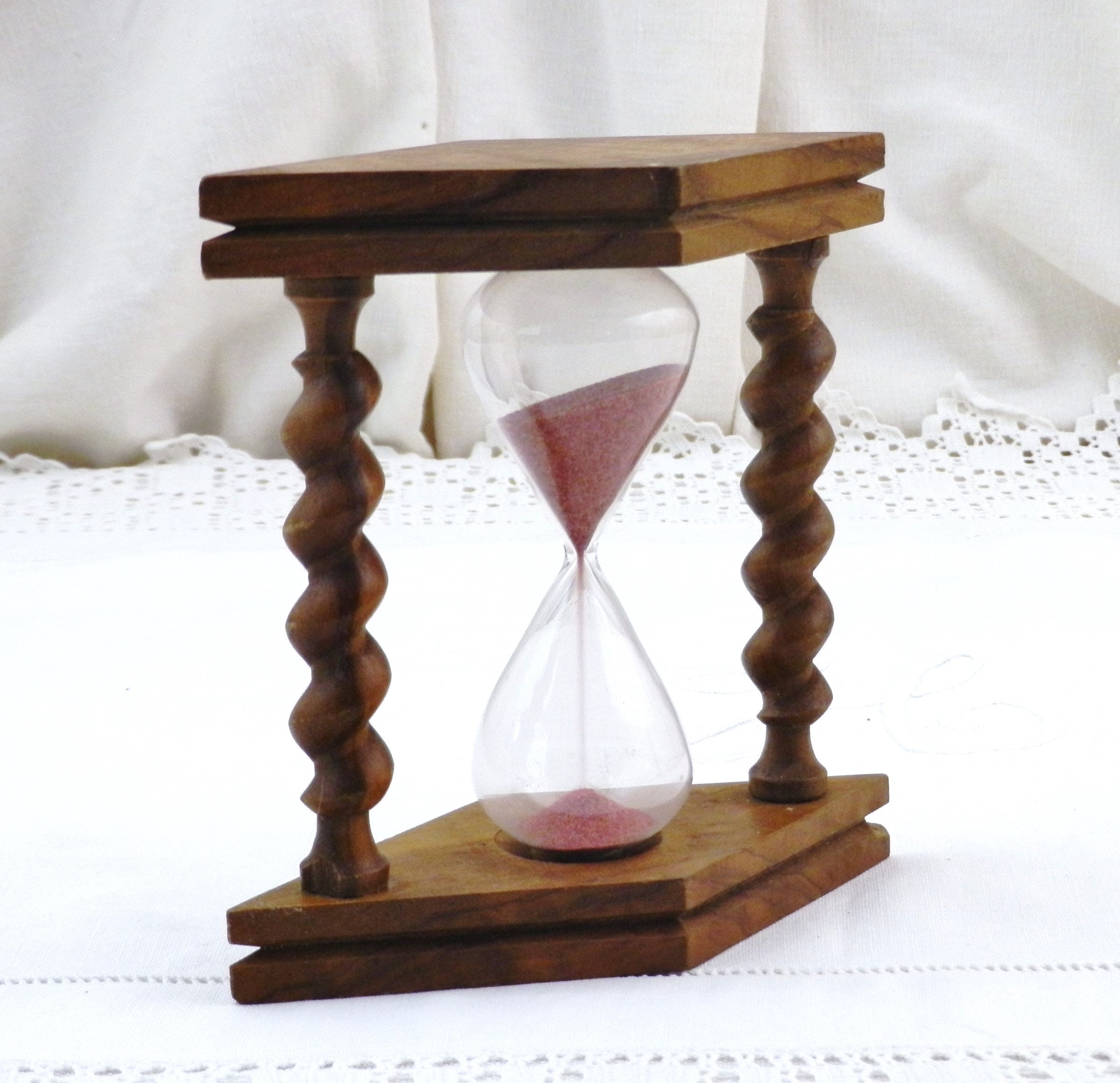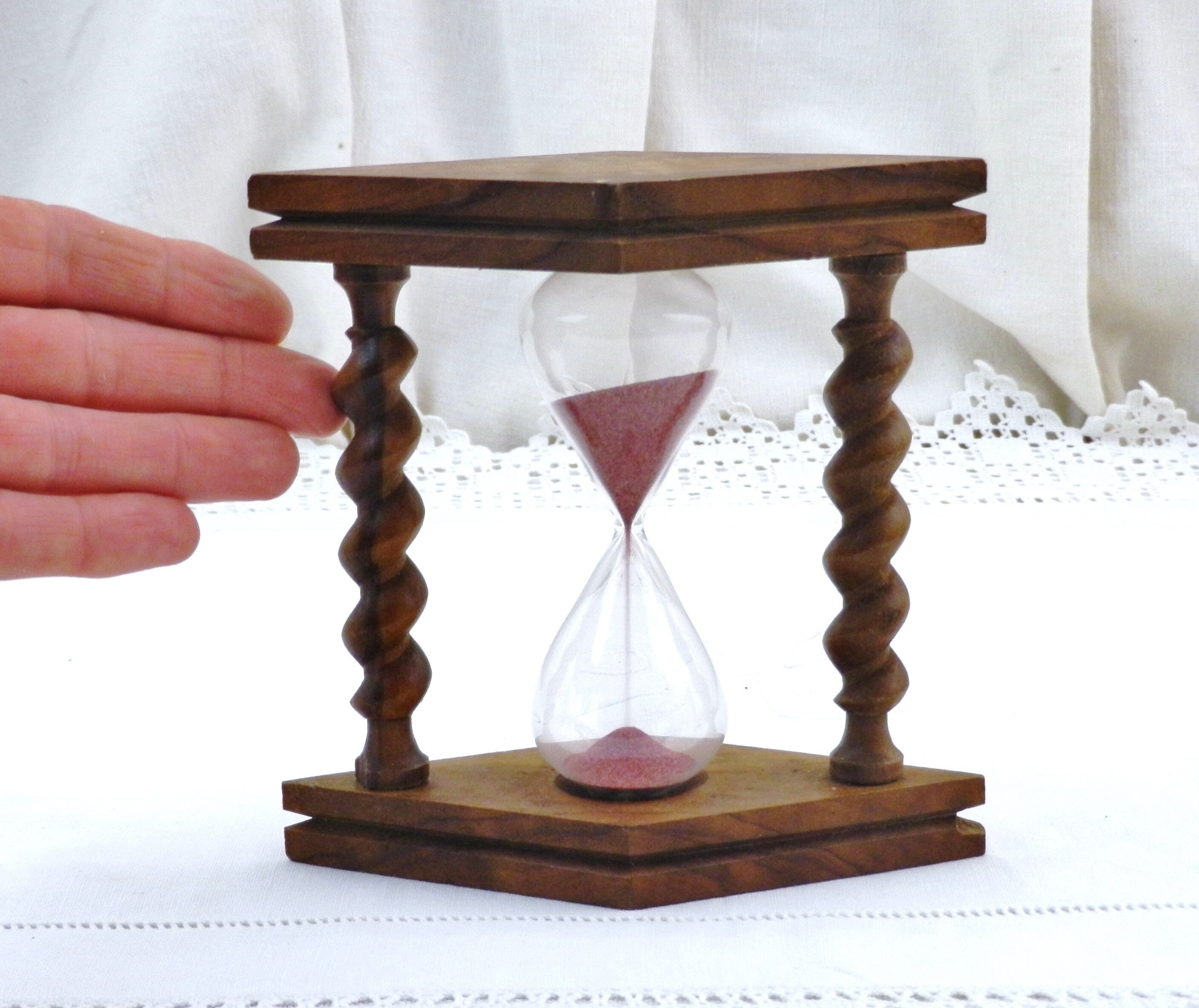 Vintage French egg timer . Made of olive wood with 2 turned columns, glass with pink sand. Timer = 2 minutes 48 secondes approximately. Circa 1960s.