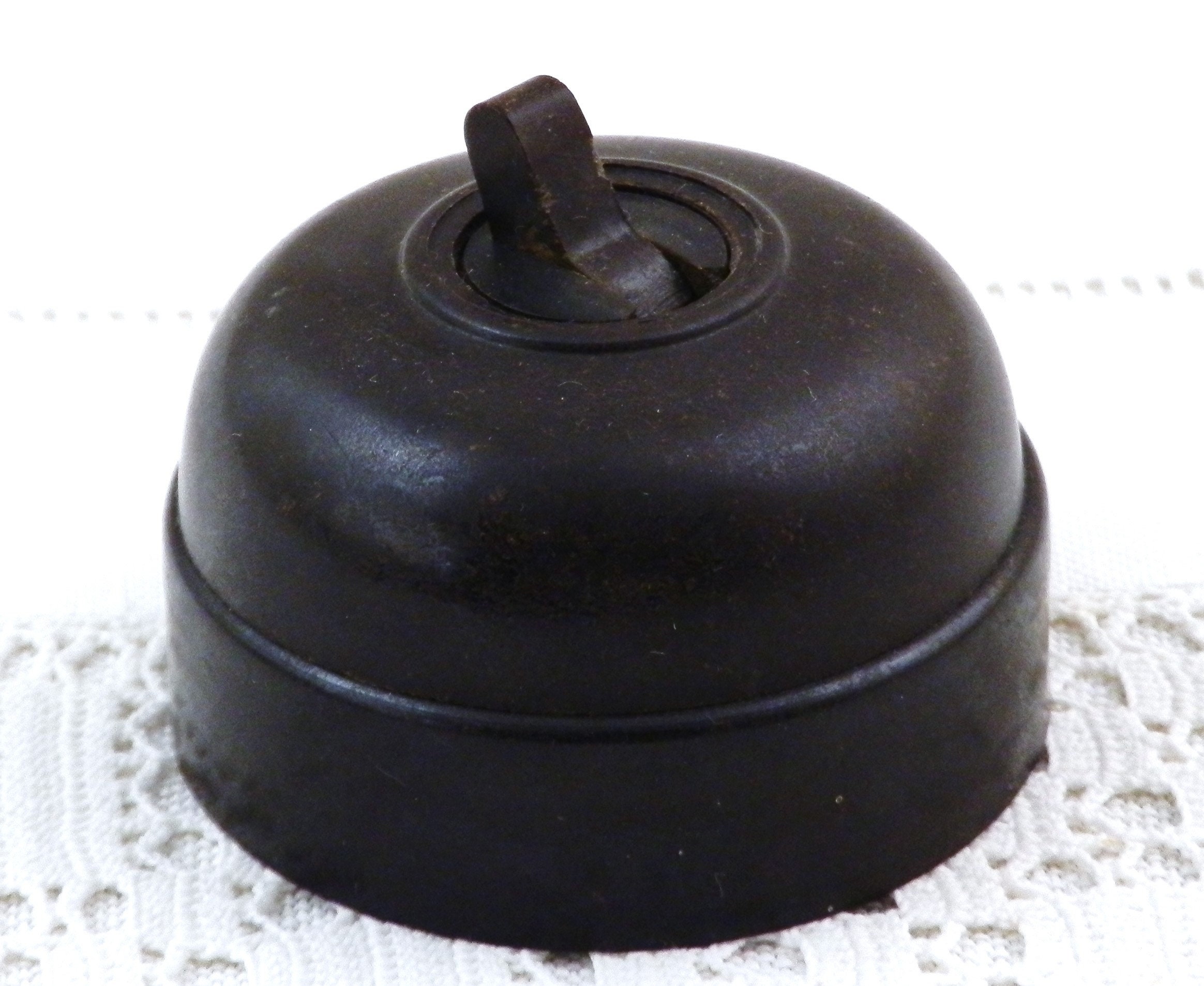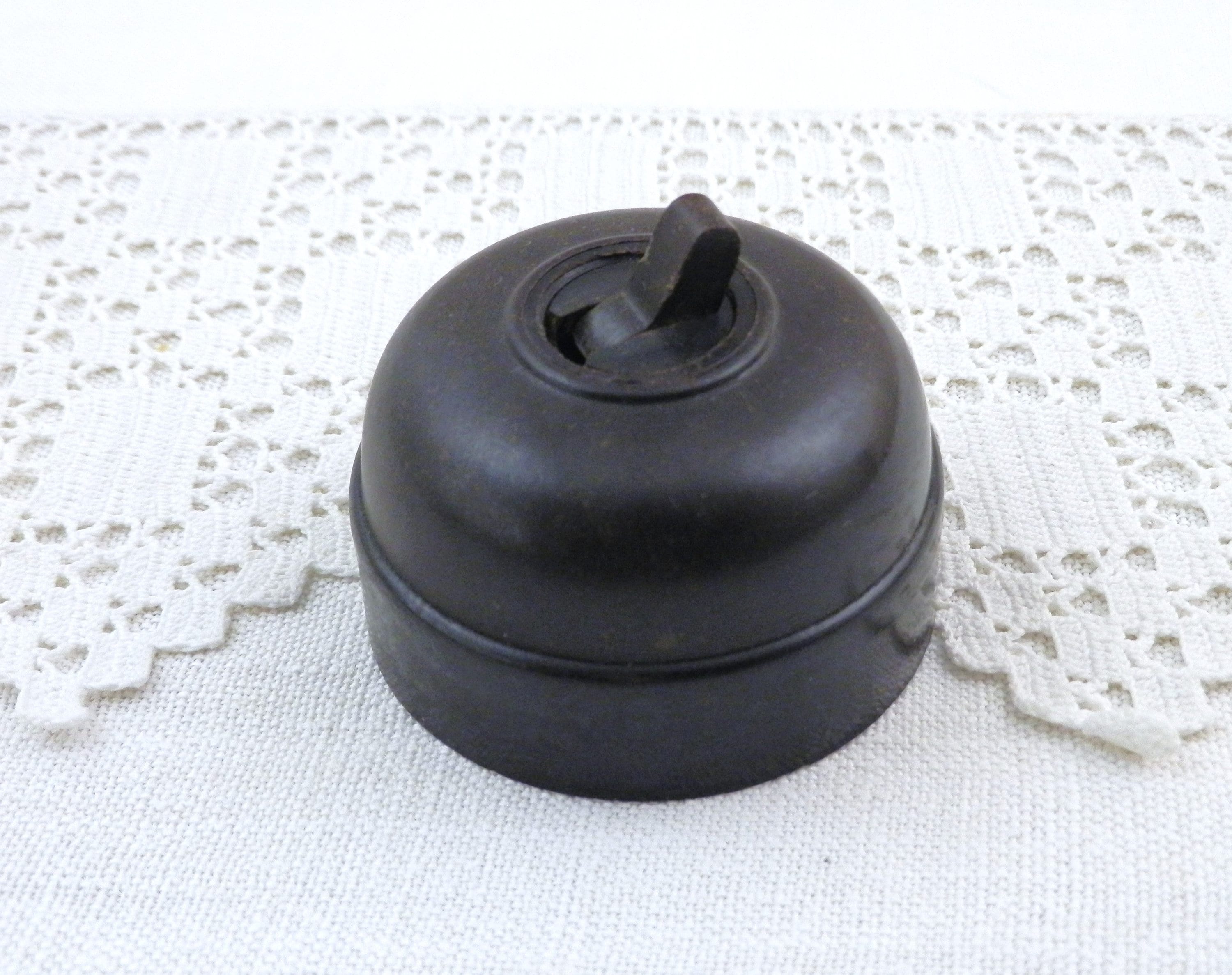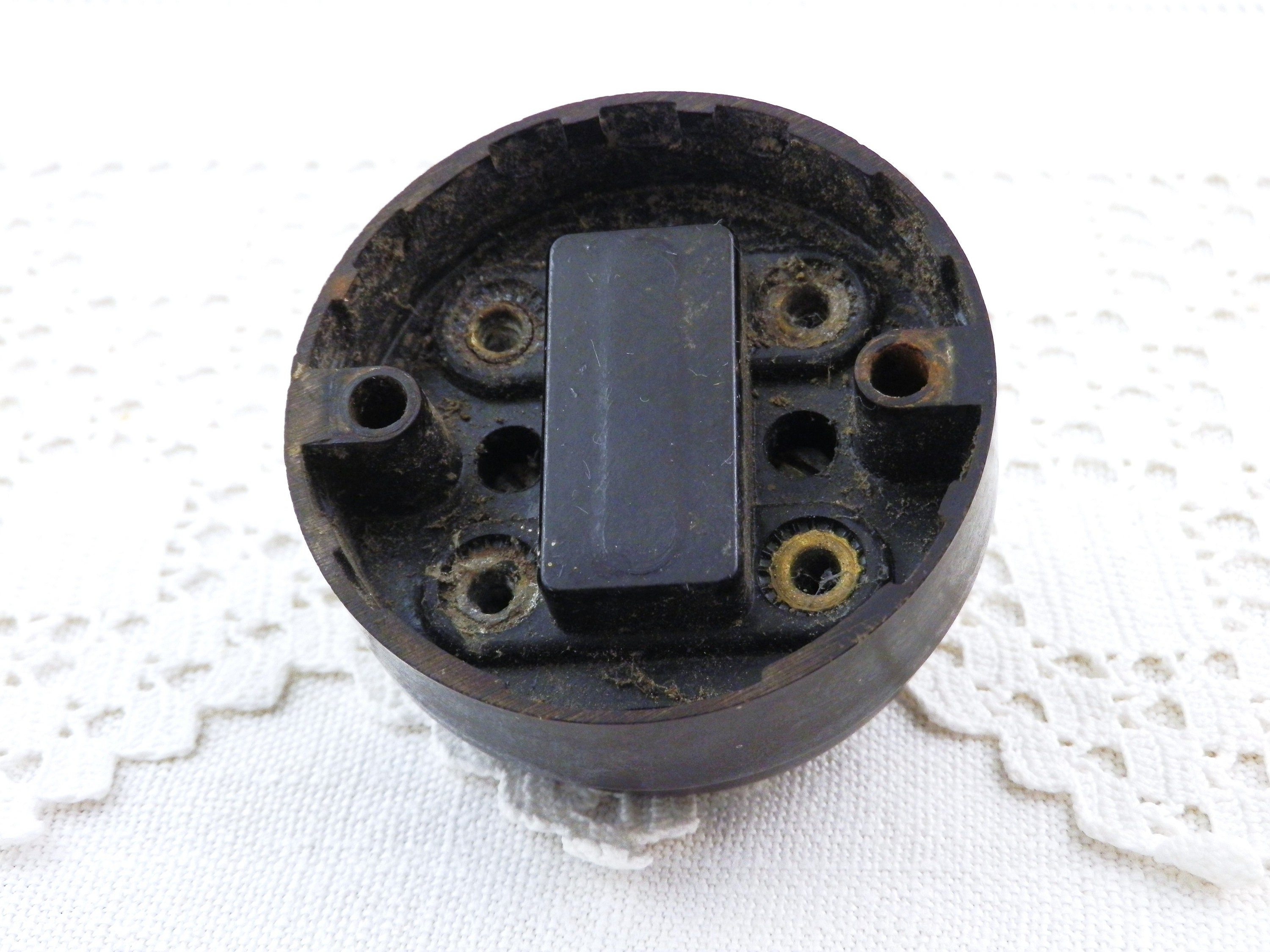 Vintage Bakelite light switch. Round shape. This switch has not been tested. The sides of the switch have not been broken for the wires.