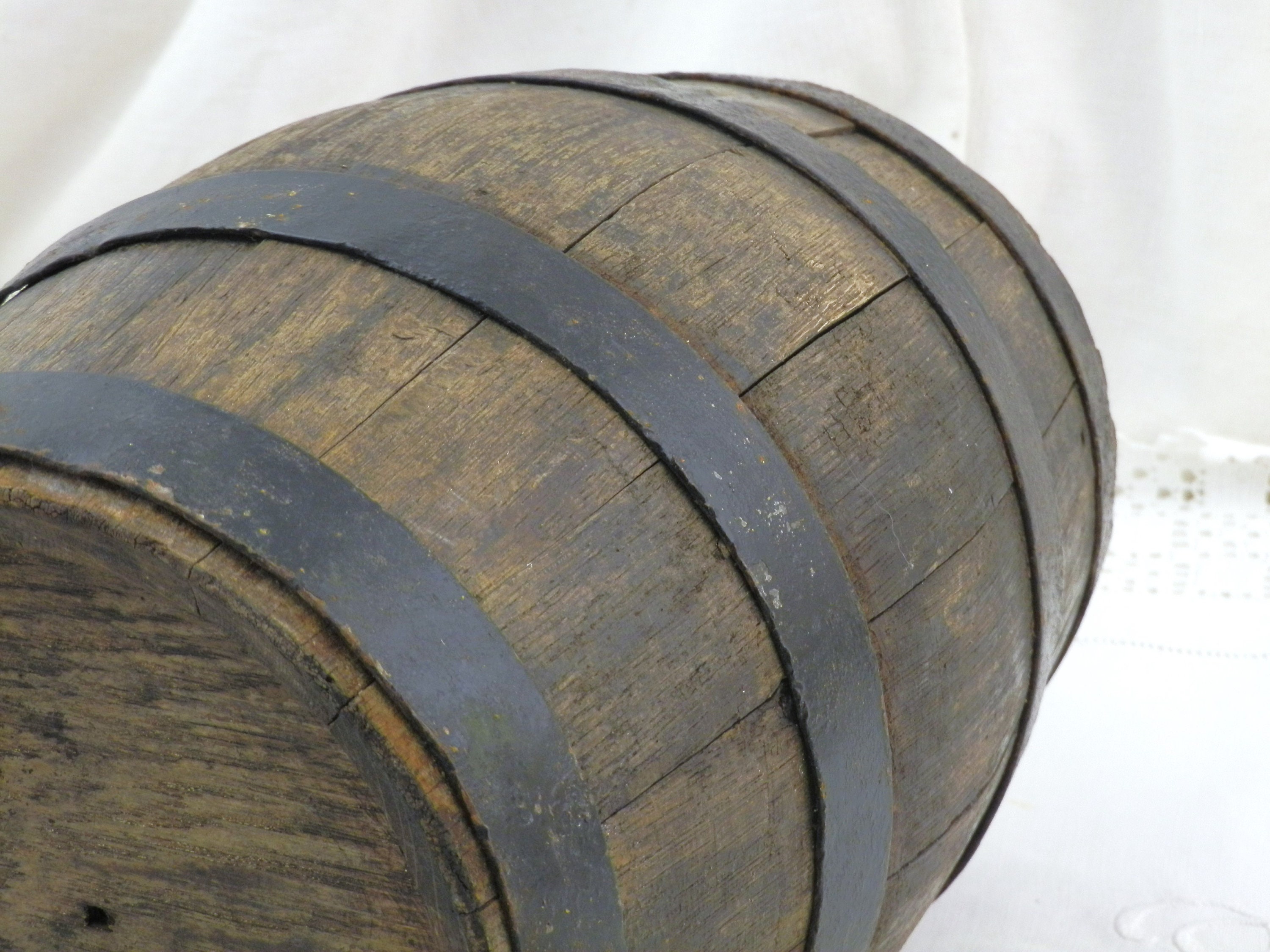 Antique French small wine barrel. Made of oak wood with metal rings. Carrying handle. Was used to transport wine to the fields or for maturing Calvados or liqueurs . Circa 1800s.