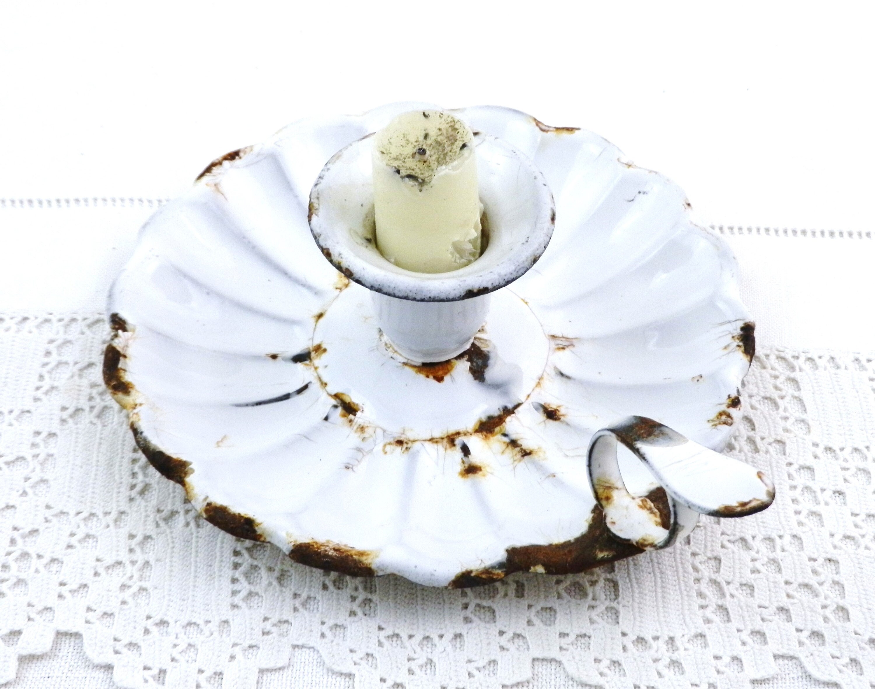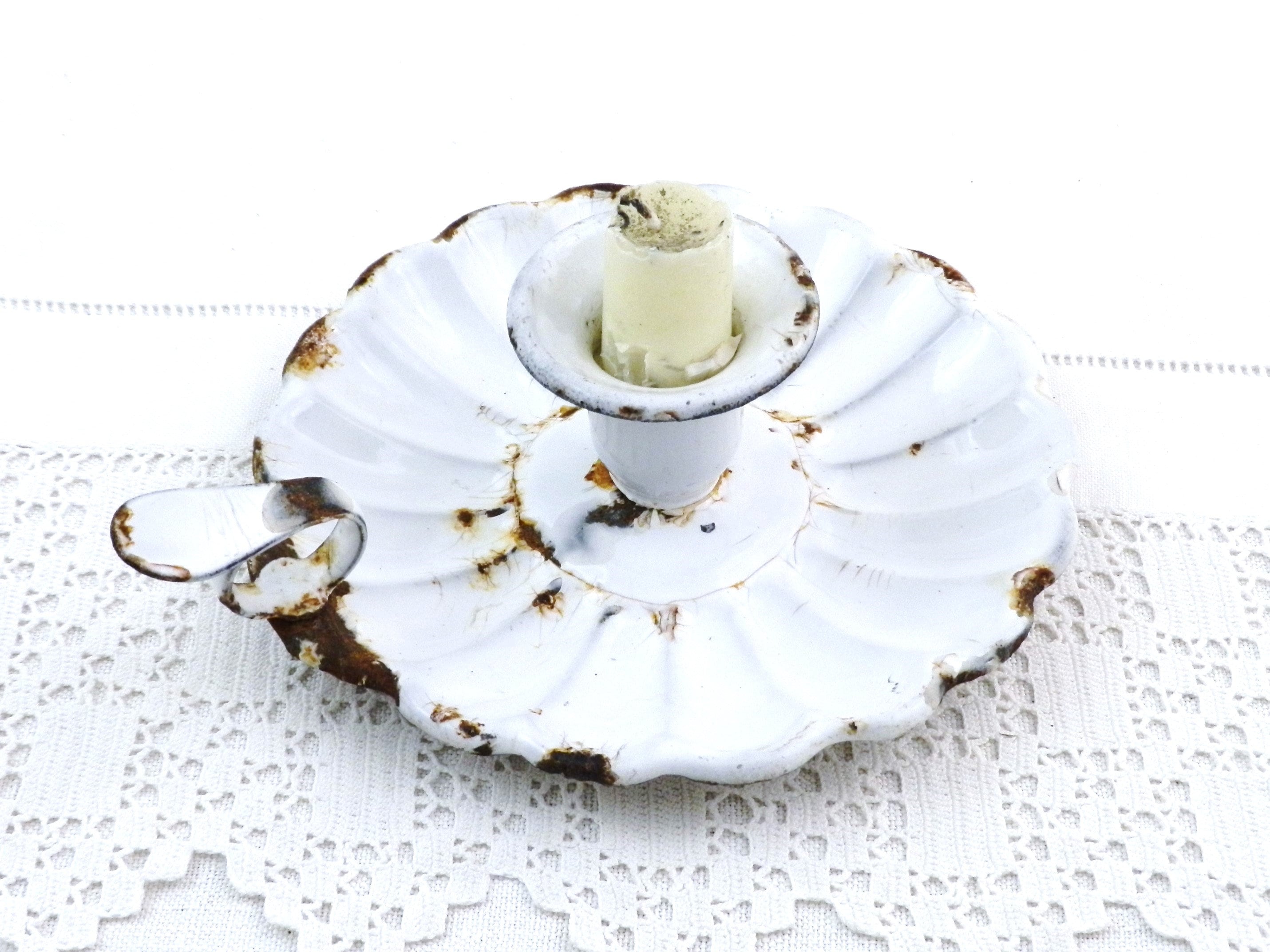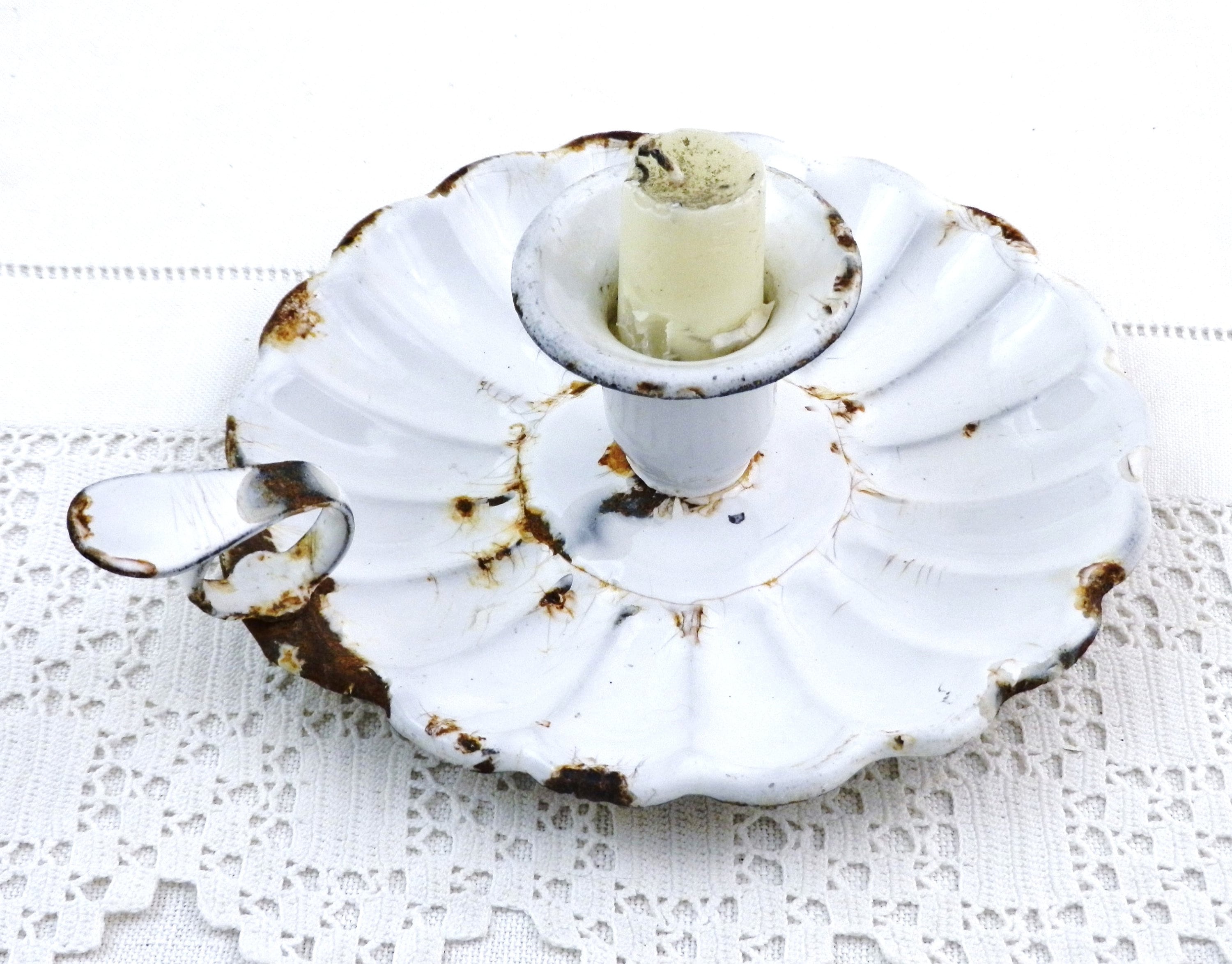 Antique French chippy enamel chamberstick candle holder. White enamel on metal with a scalloped base. Circa 1800s.