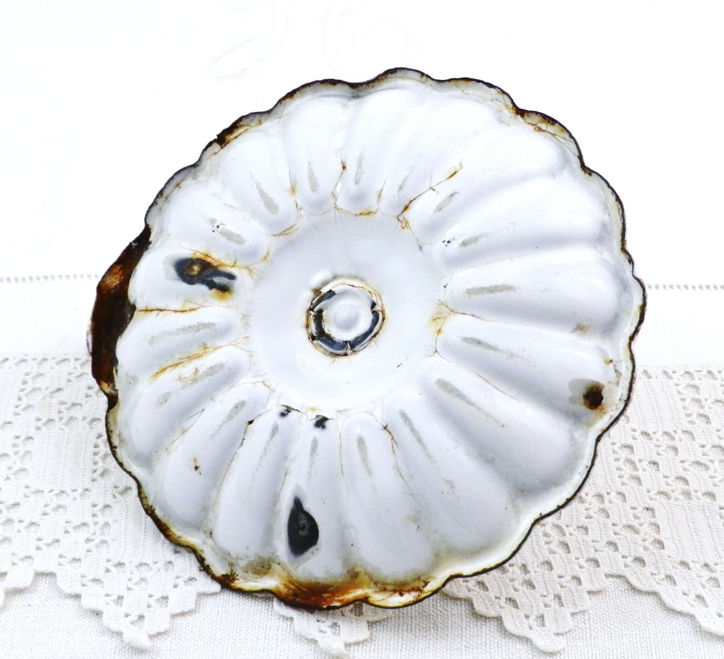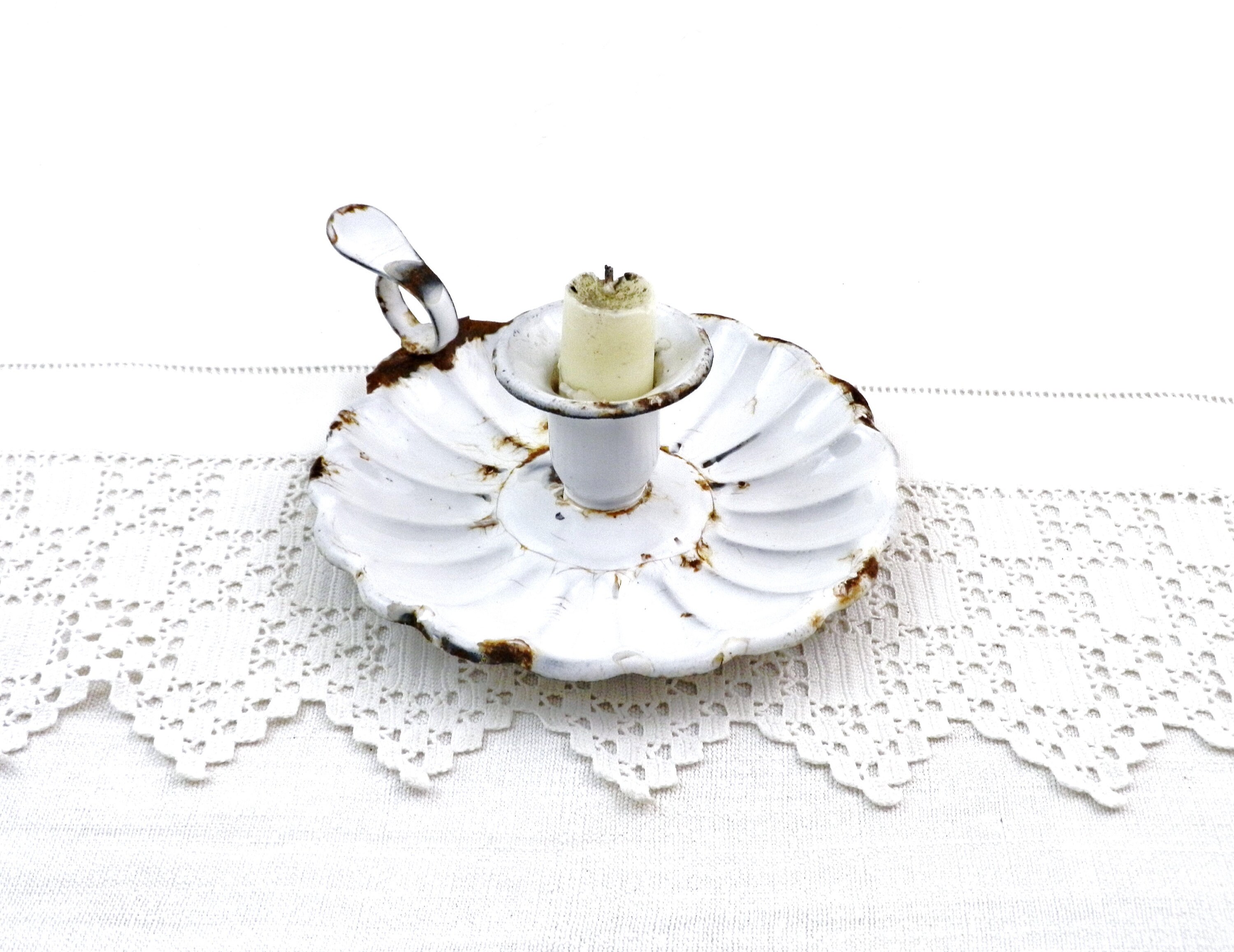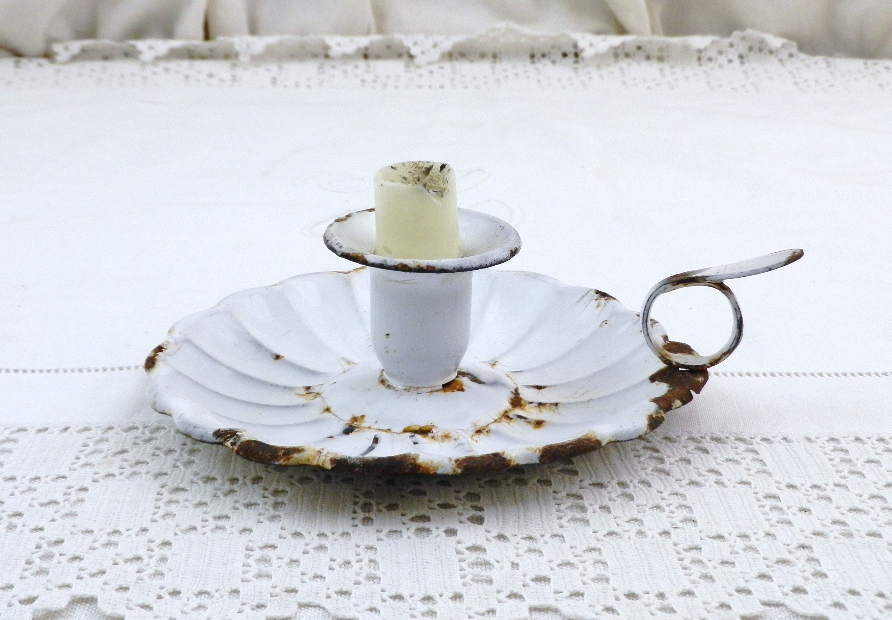 Antique French chippy enamel chamberstick candle holder. White enamel on metal with a scalloped base. Circa 1800s.