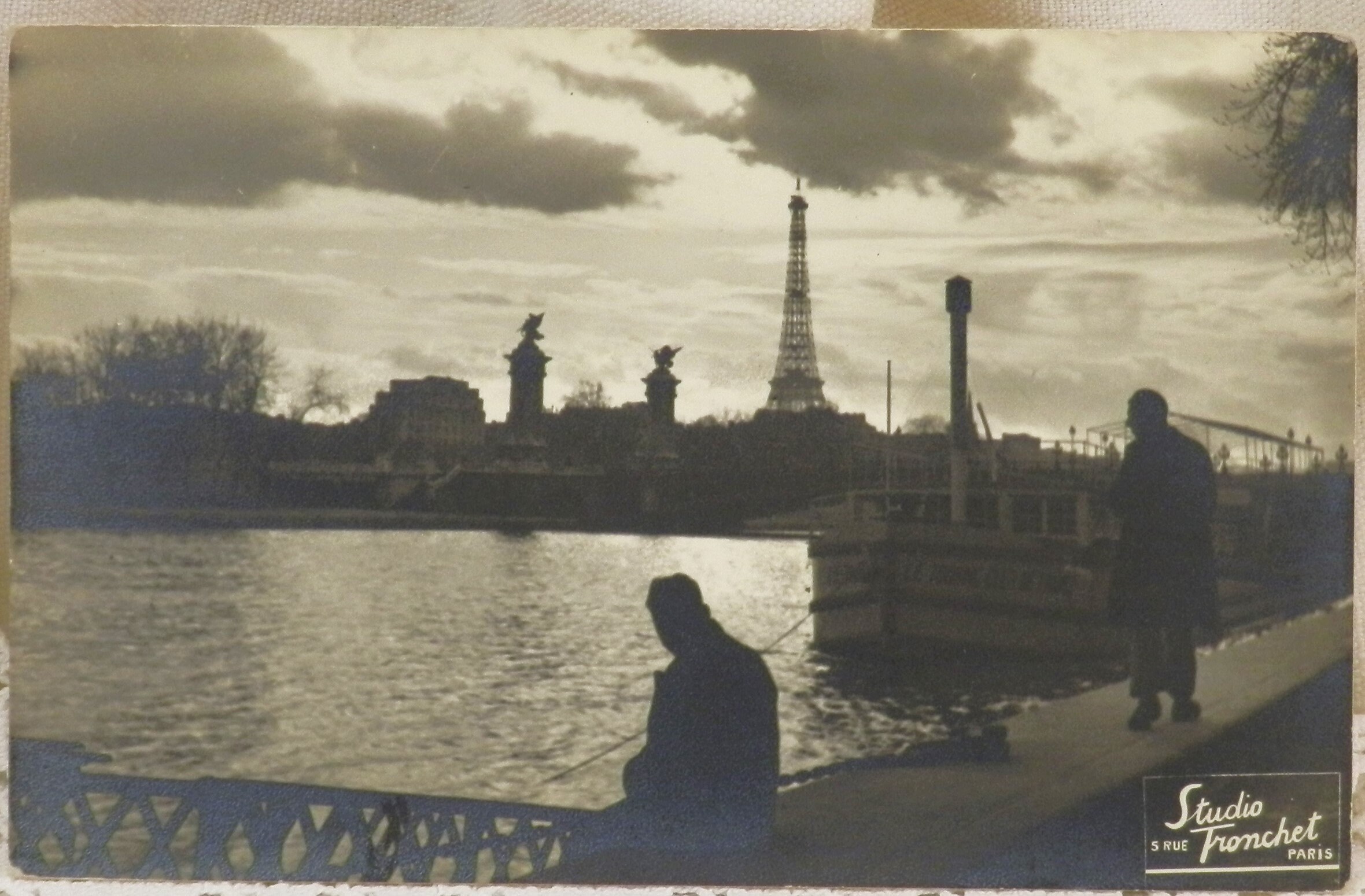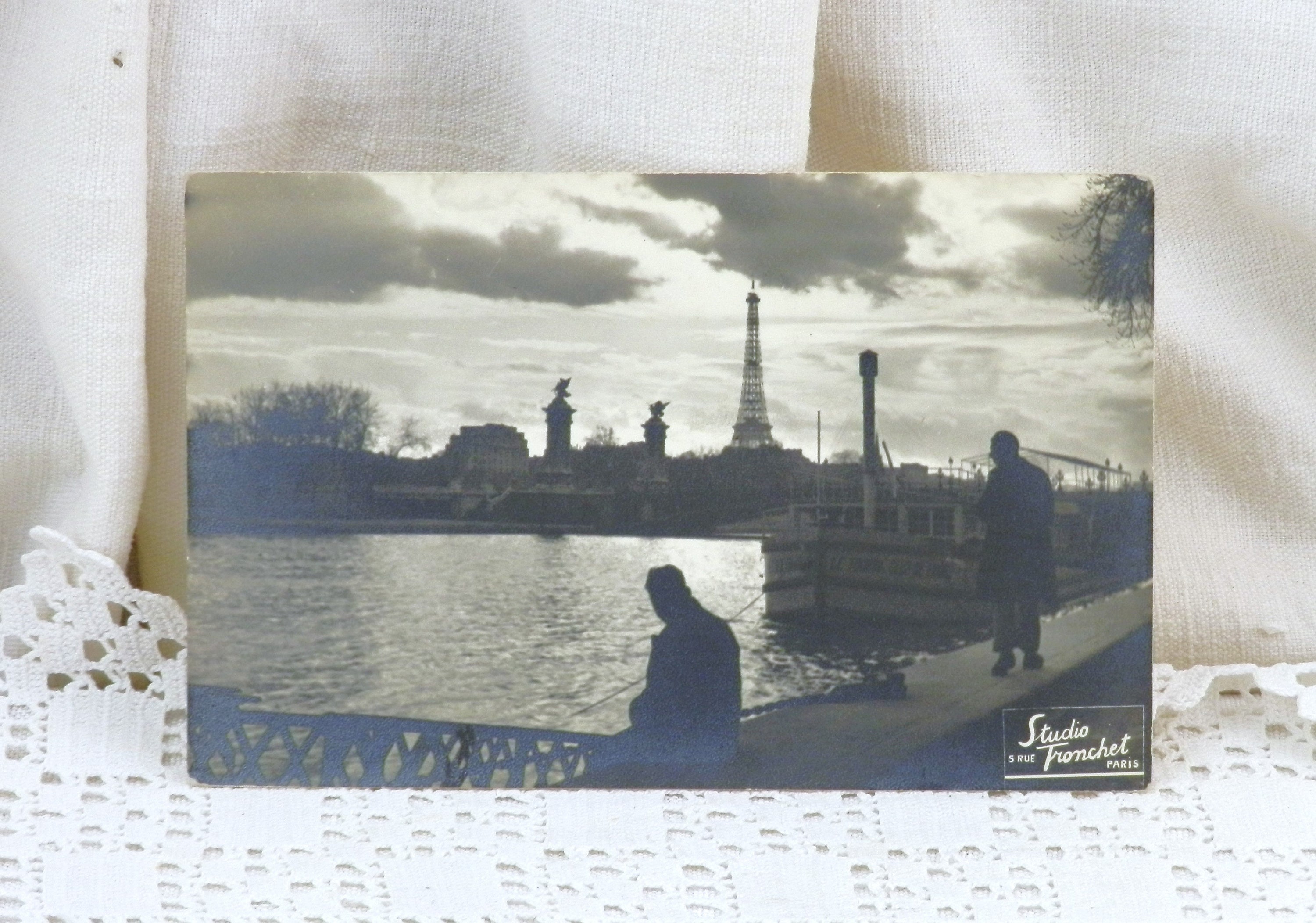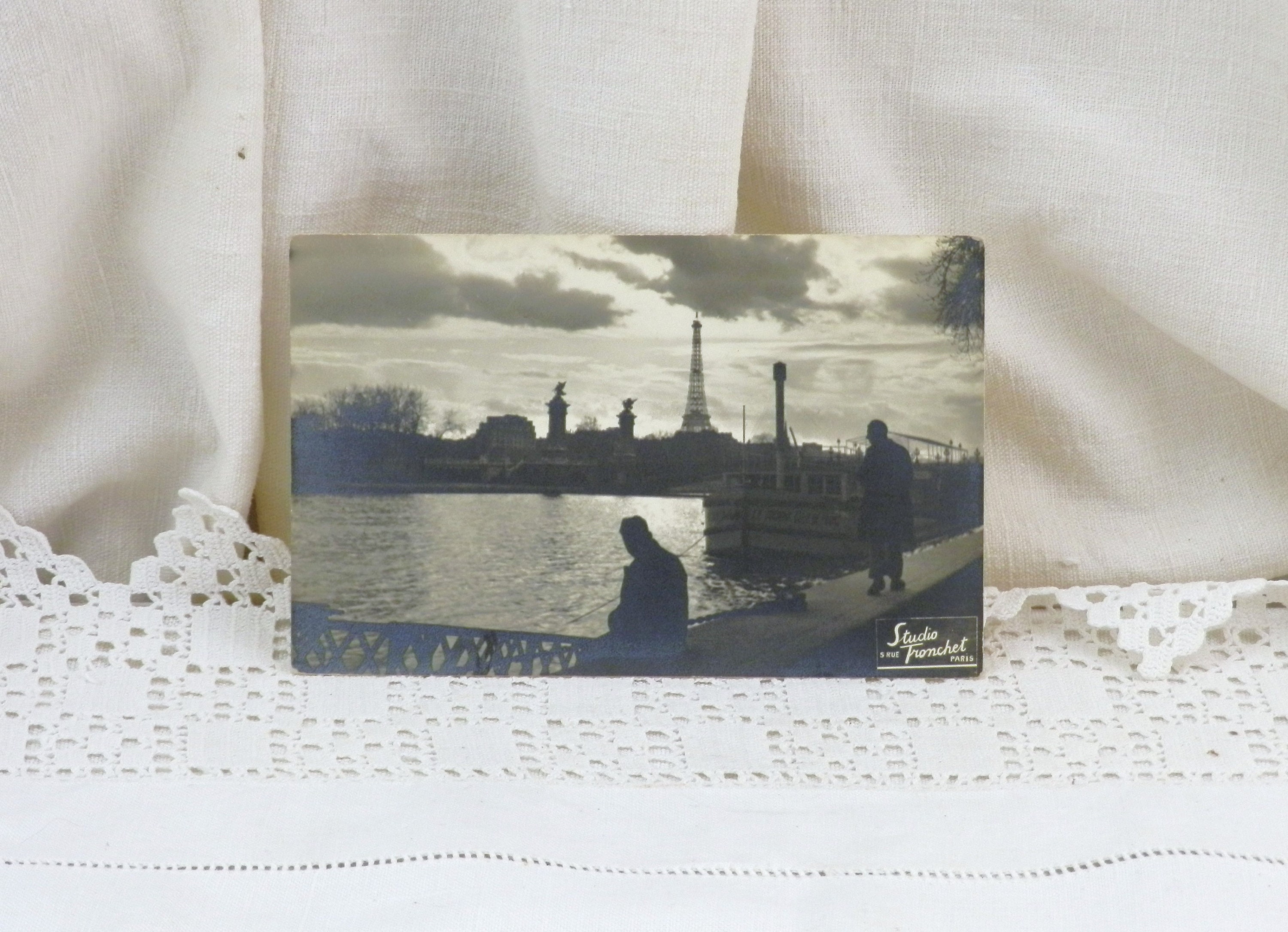 Antique French unused postcard of the River Seine in the foreground with the Eiffel in the background.