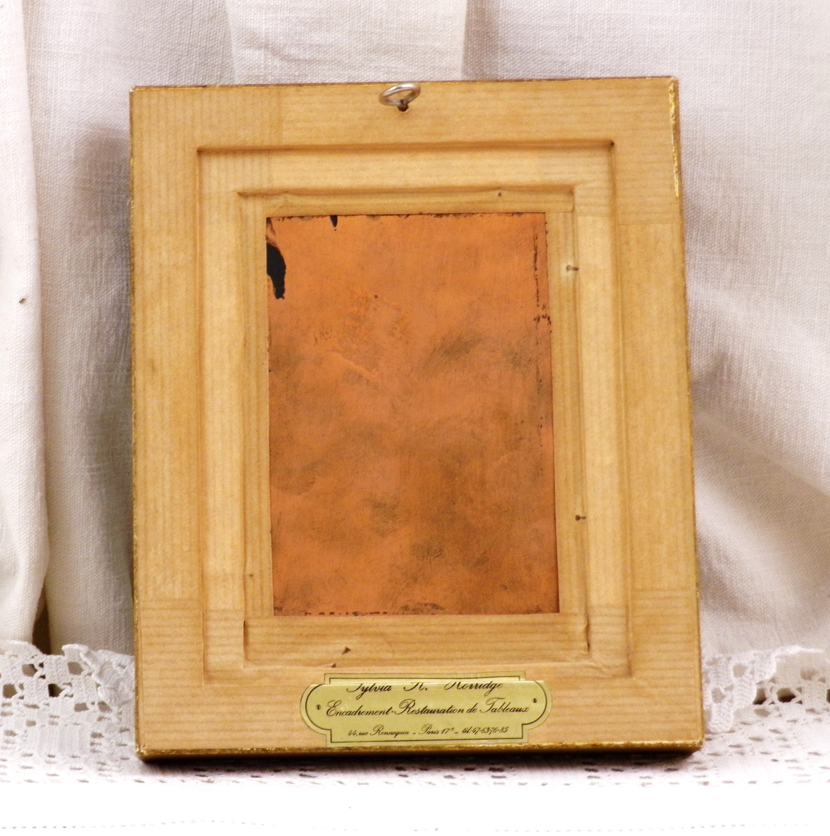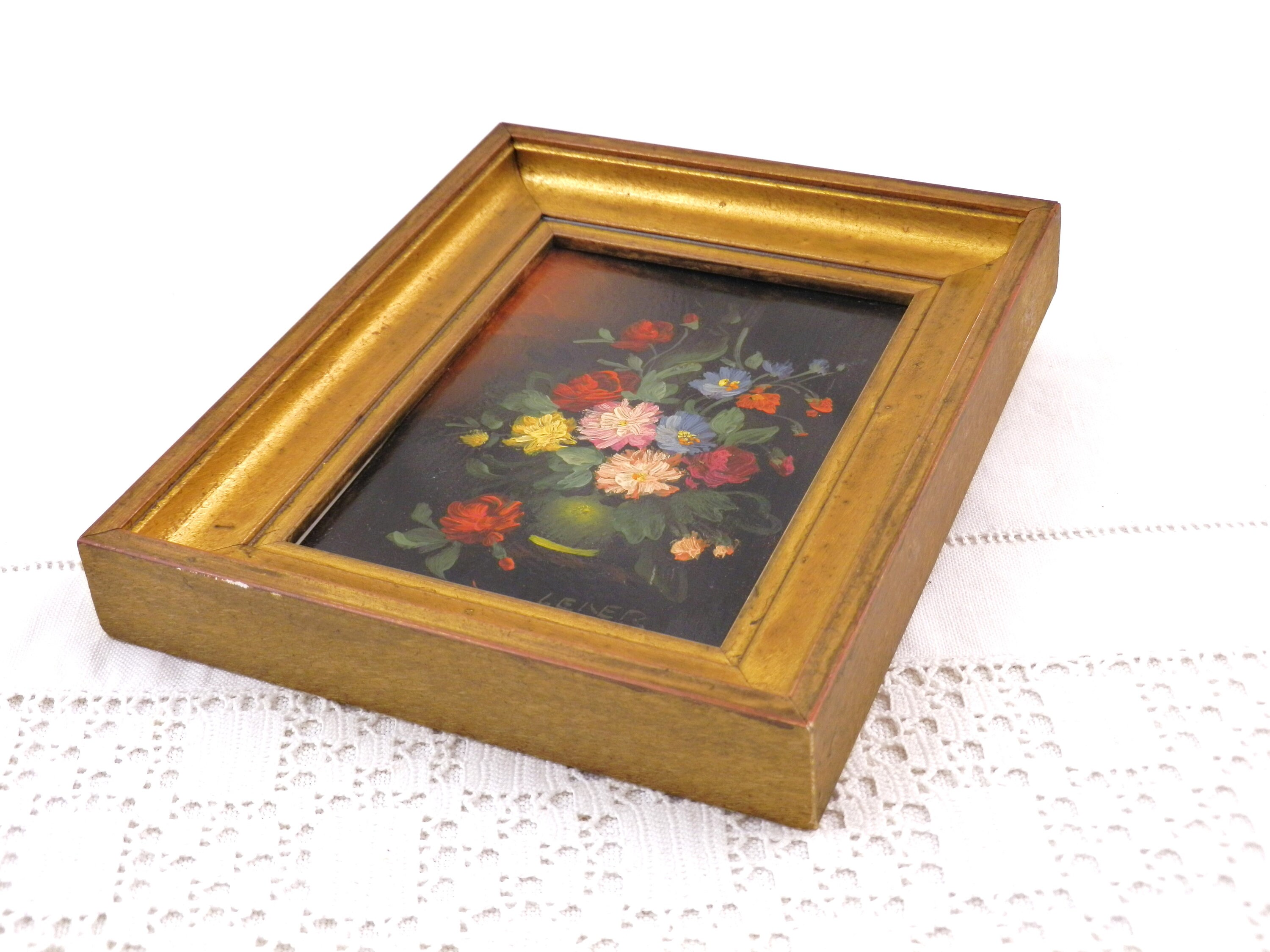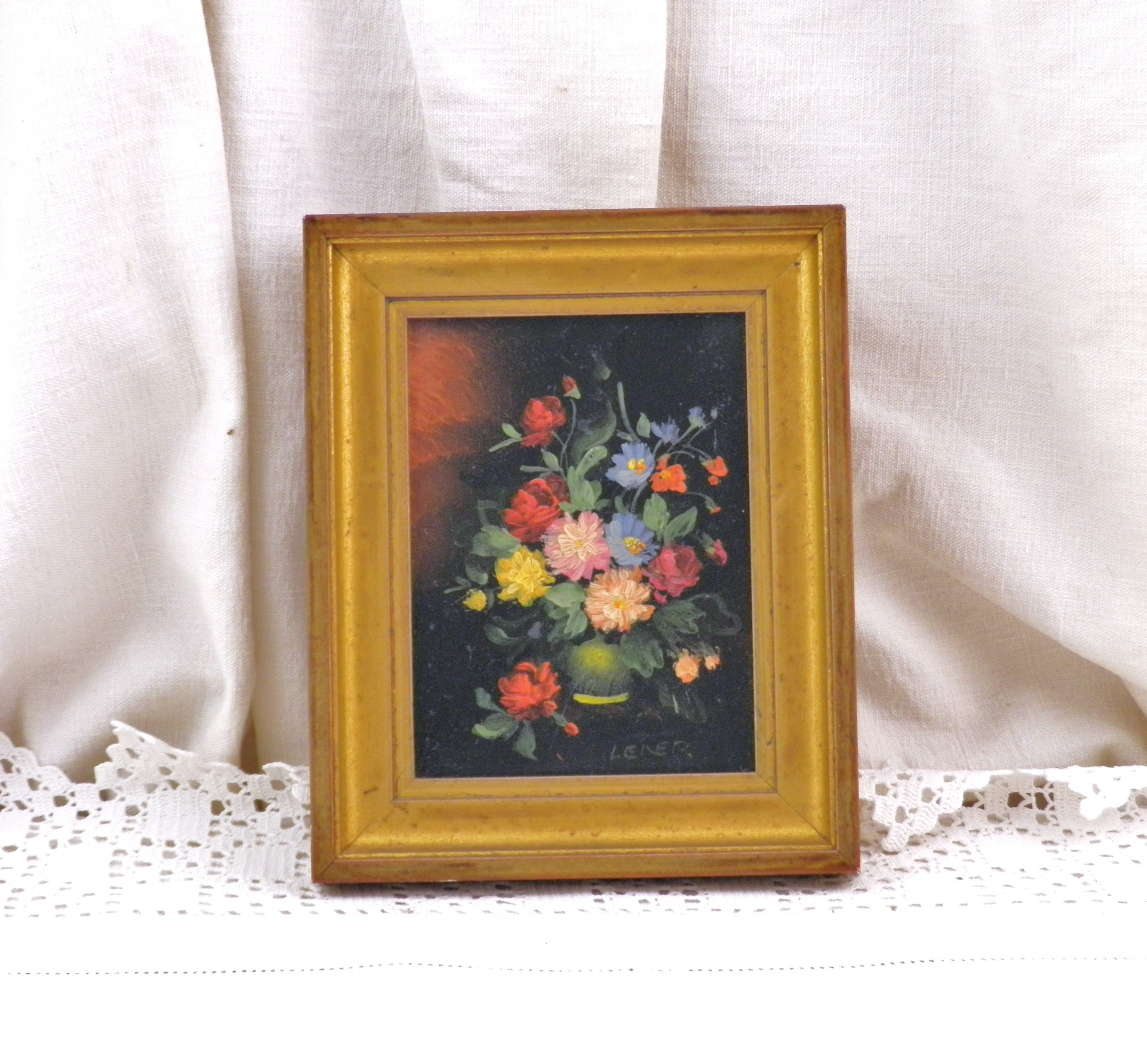 Small sized French antique hand painted oil painting on copper sheet. Floral composition with gold gilded wooden frame. Signed by the artist. Circa late 1800s, frame is more recent.