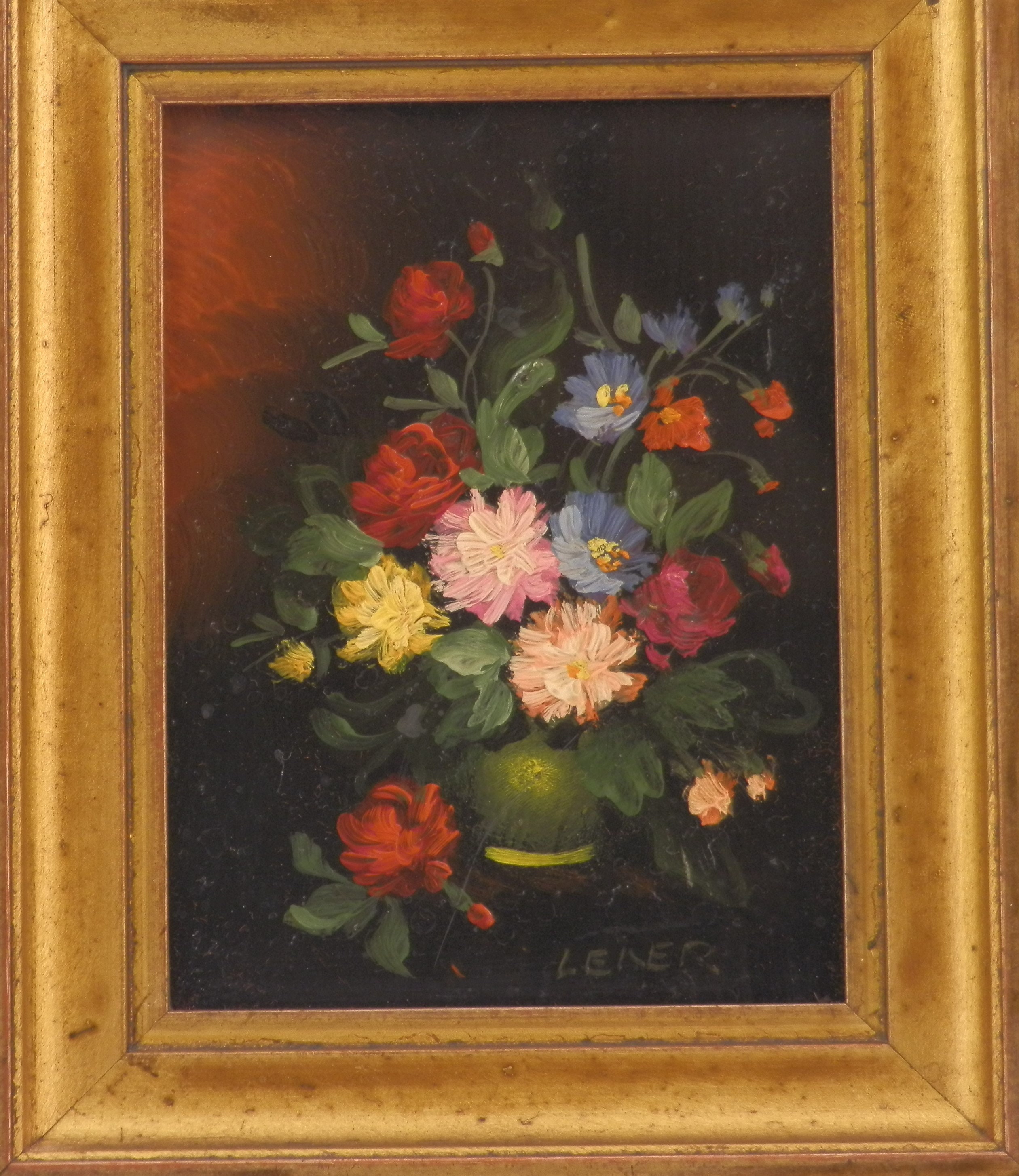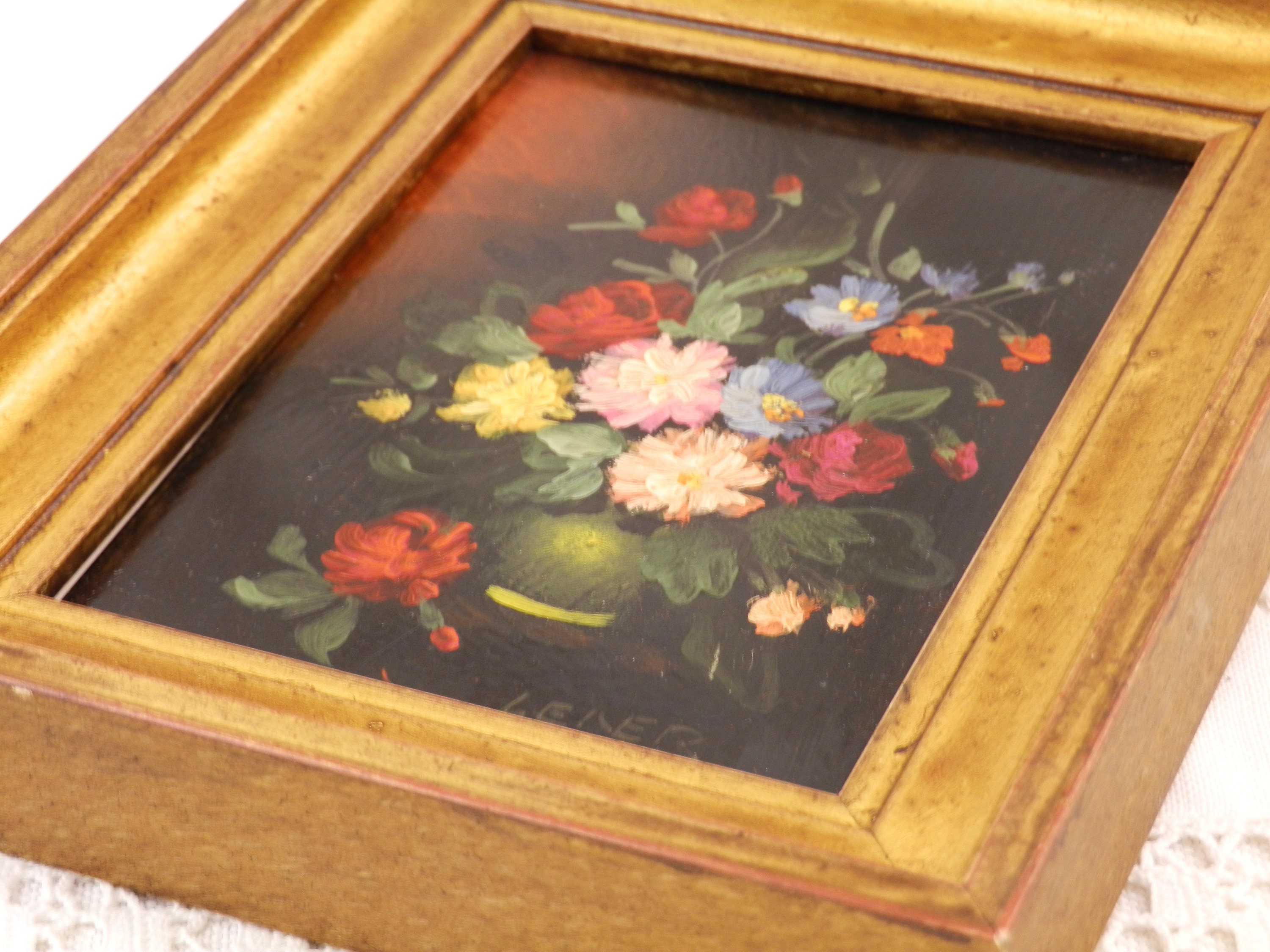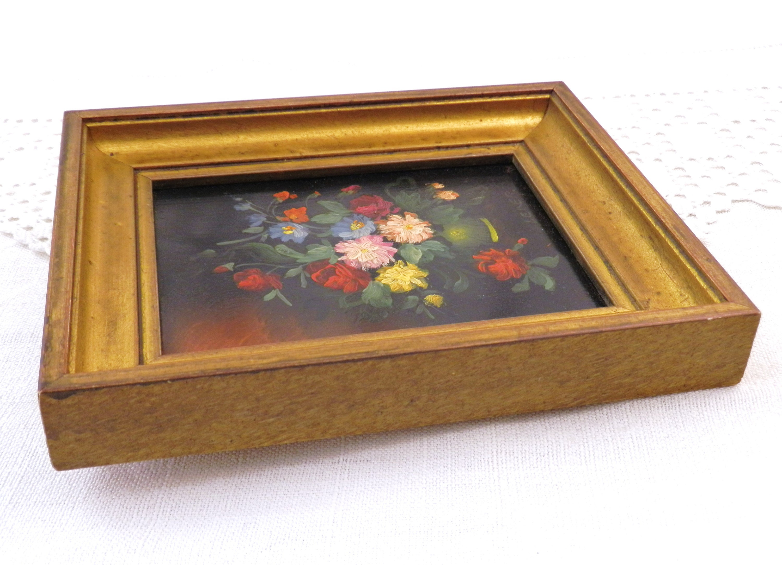 Small sized French antique hand painted oil painting on copper sheet. Floral composition with gold gilded wooden frame. Signed by the artist. Circa late 1800s, frame is more recent.