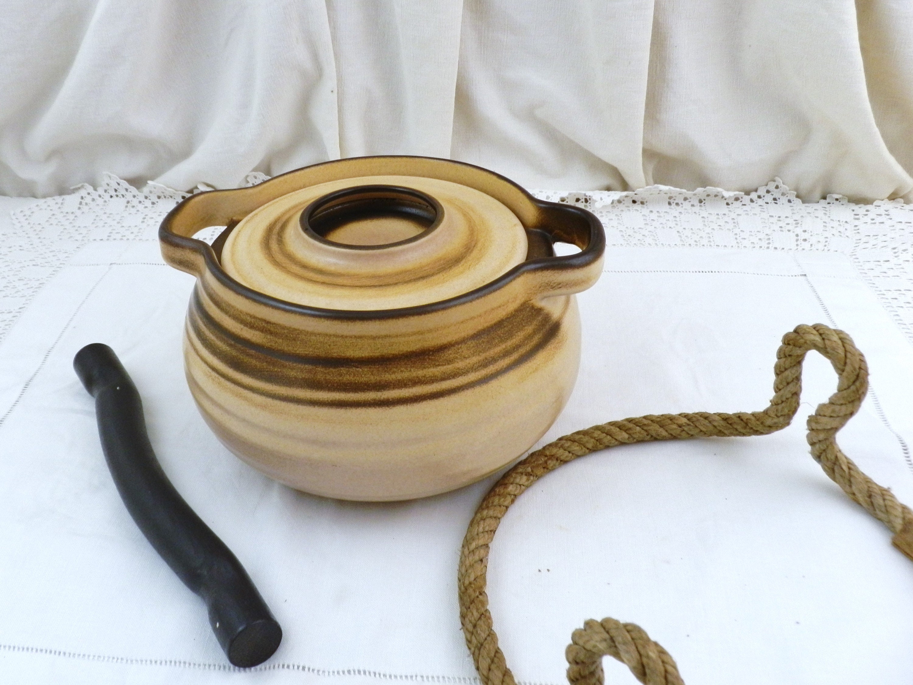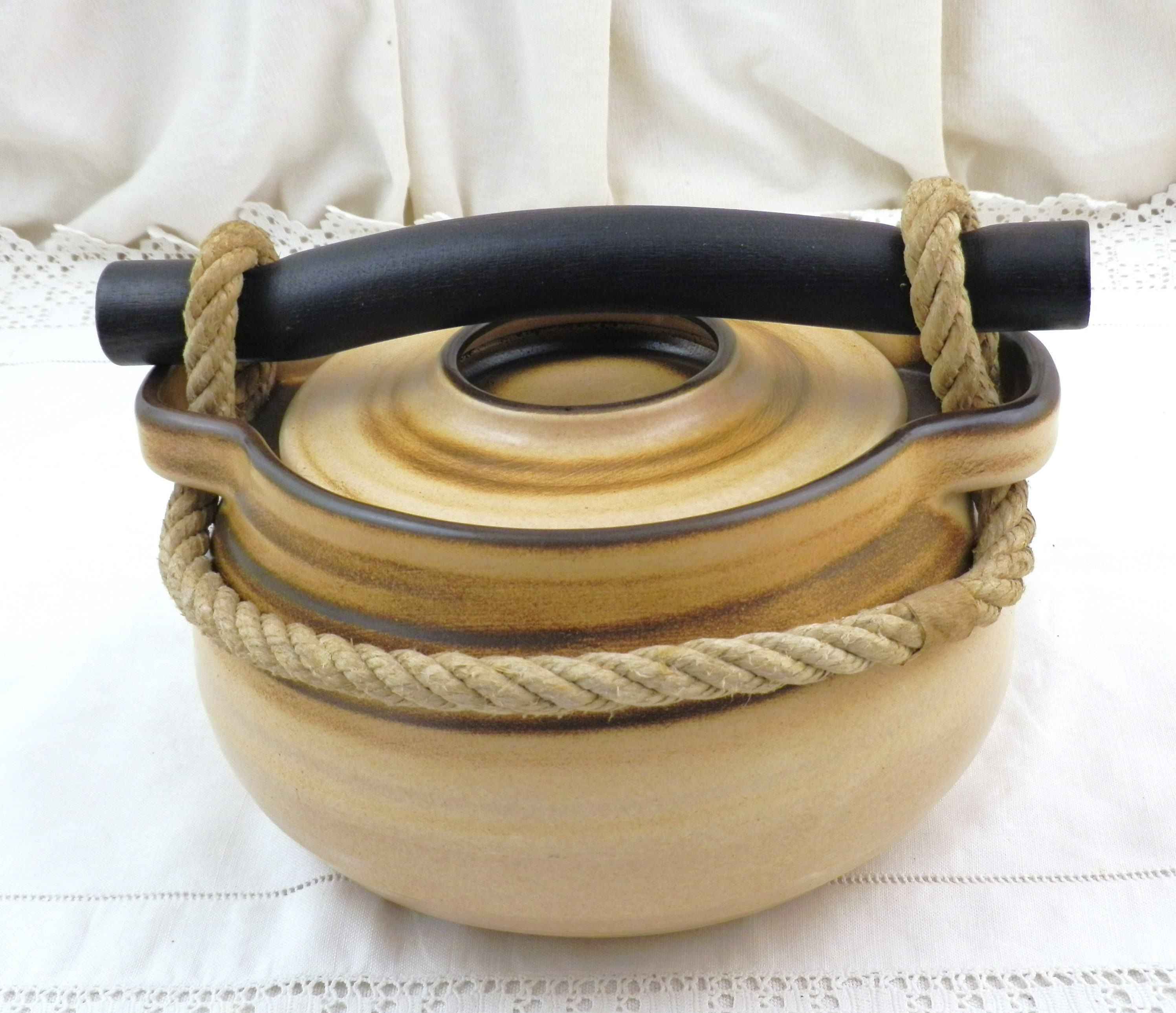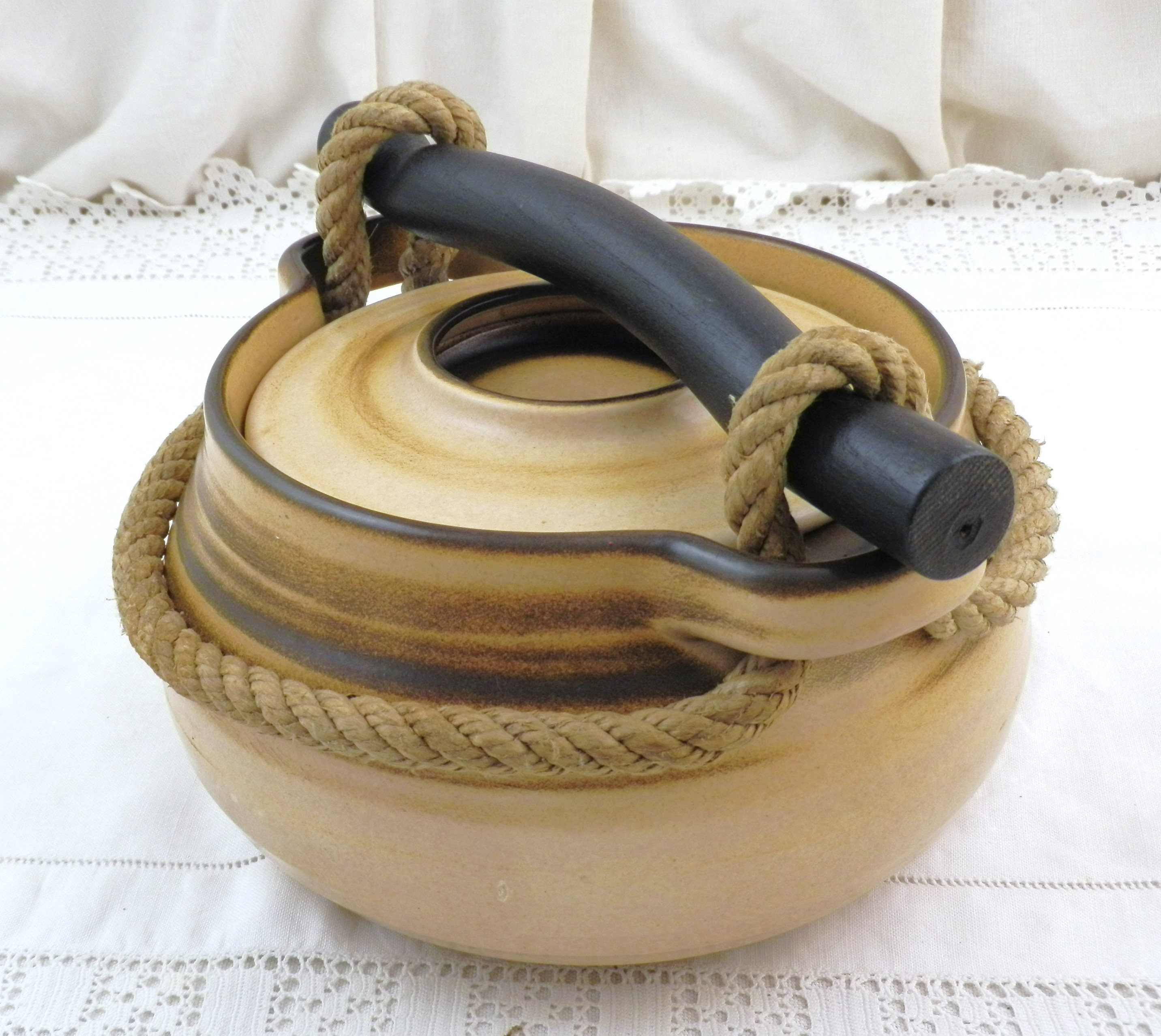 Vintage French ceramic cooking pot. Made by Salins, of pottery with rope and wooden handle. Circa 1970s.