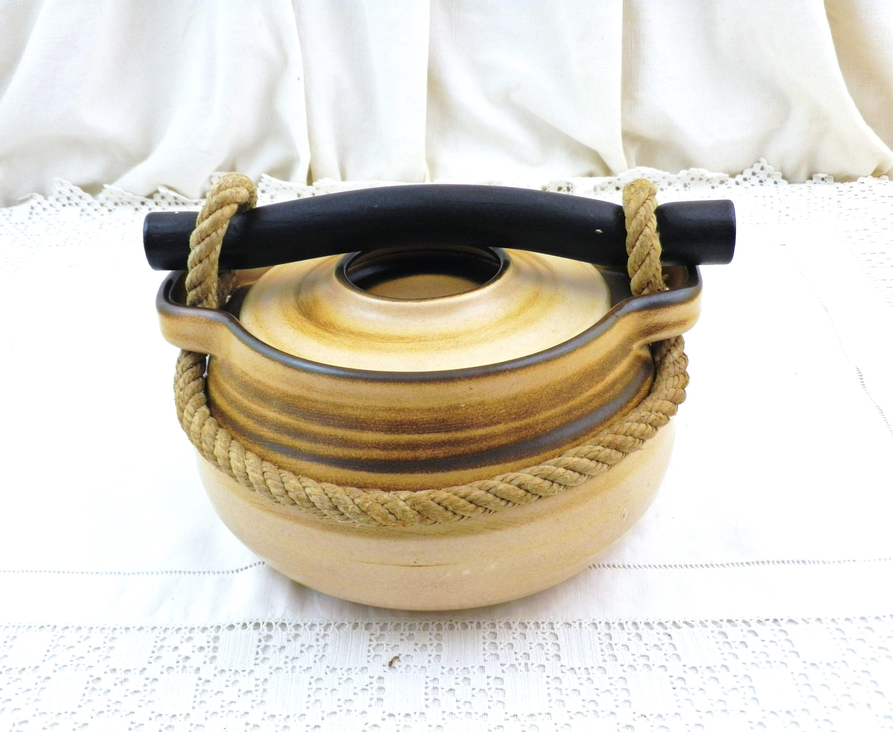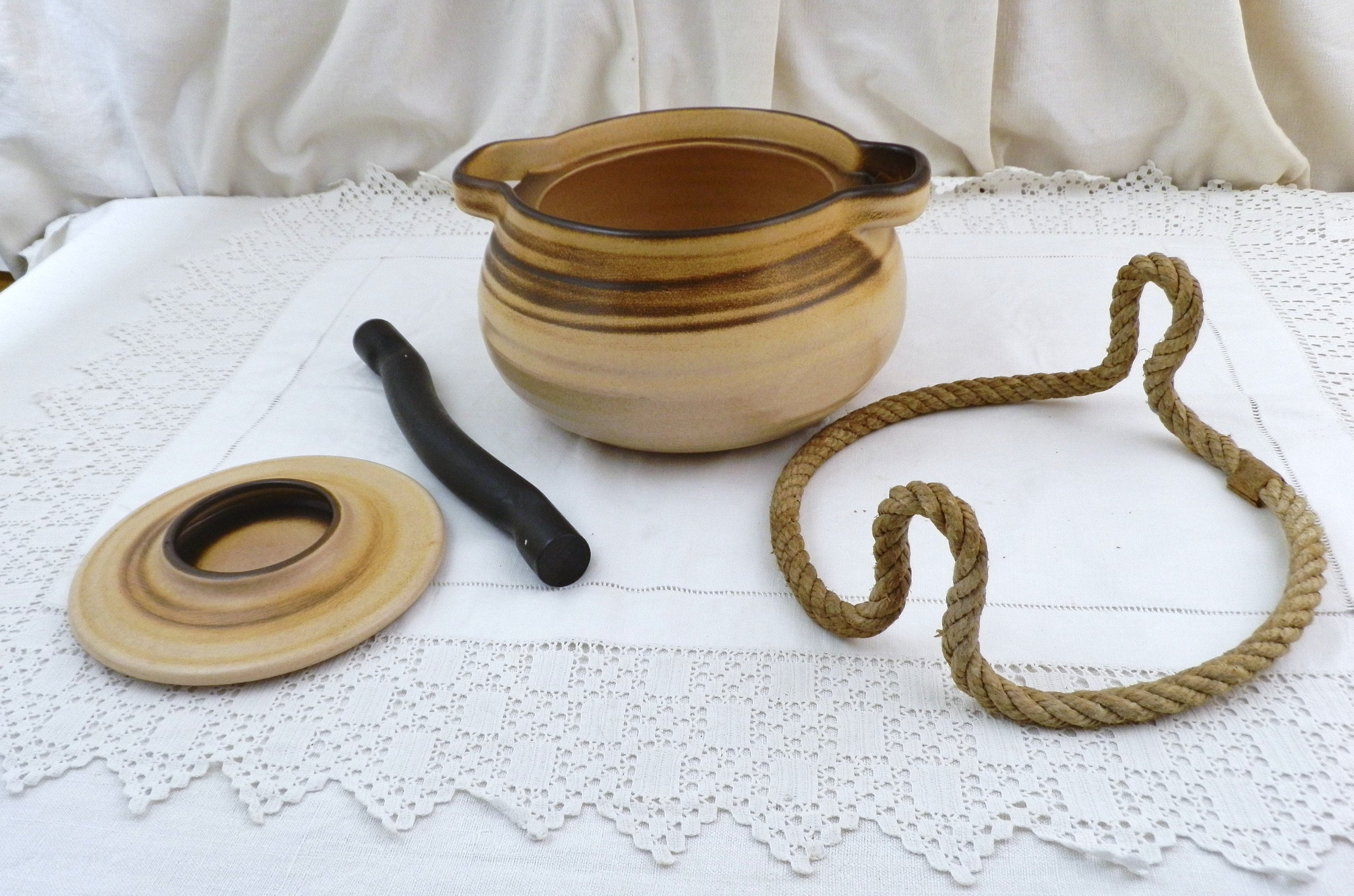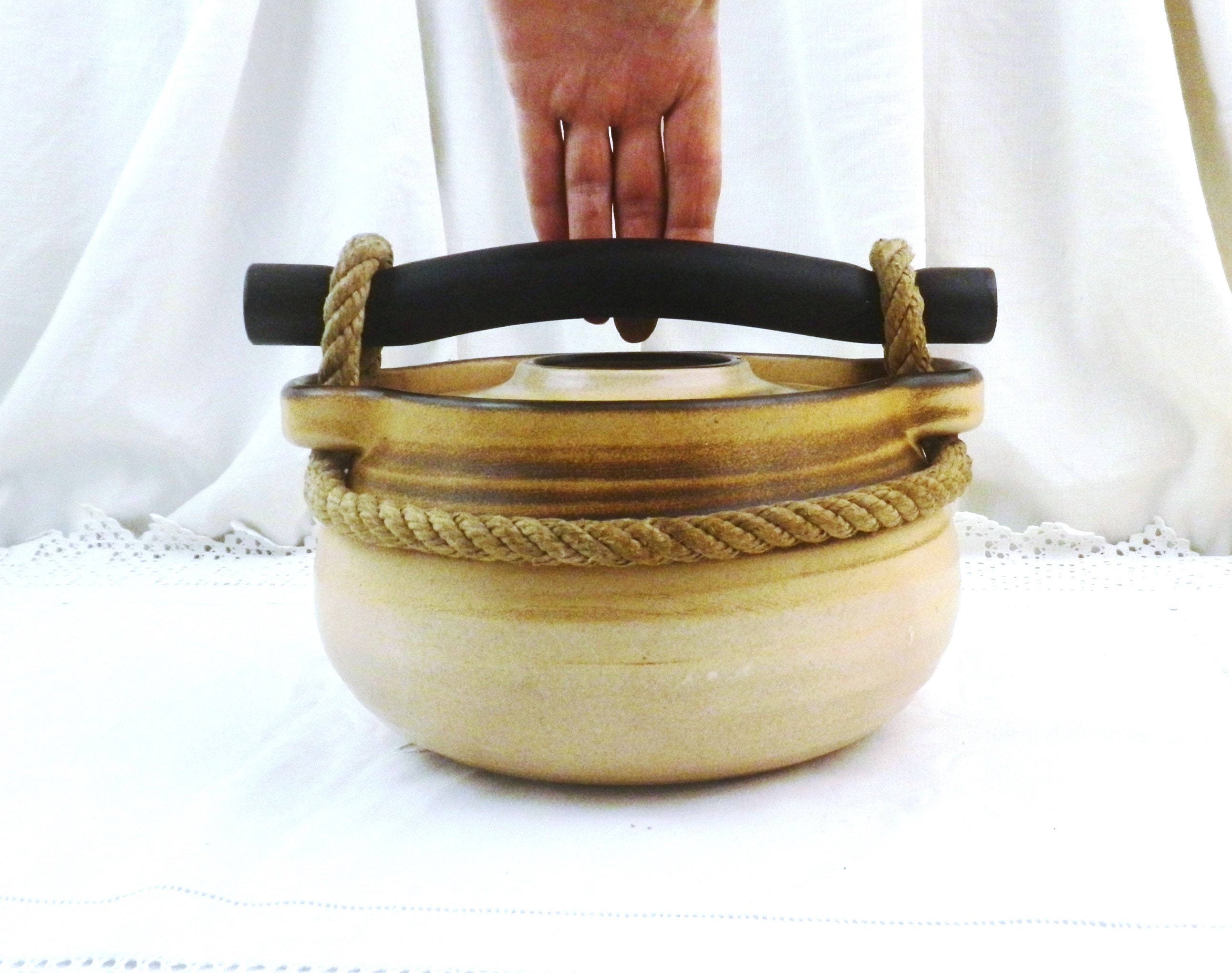 Vintage French ceramic cooking pot. Made by Salins, of pottery with rope and wooden handle. Circa 1970s.