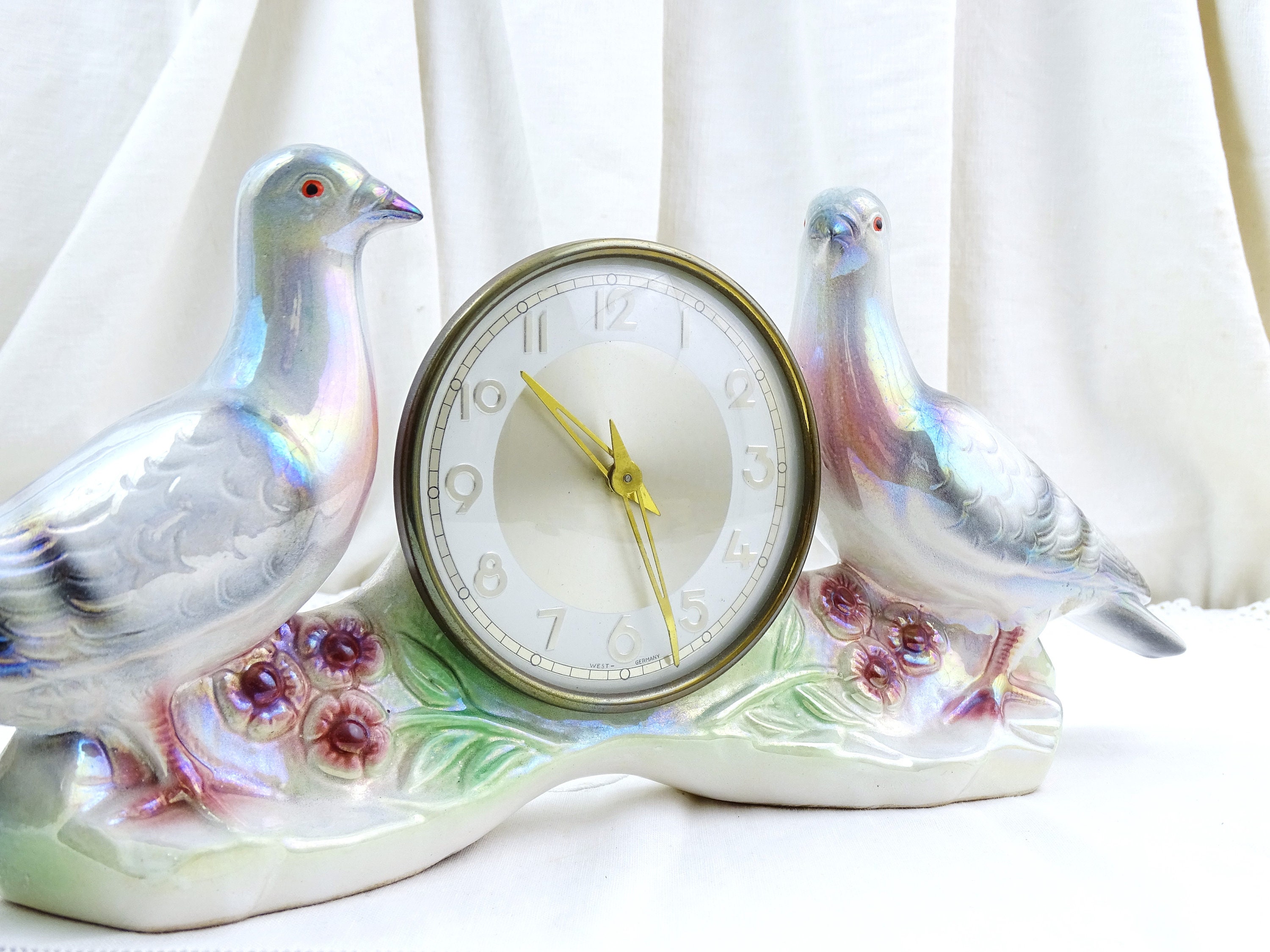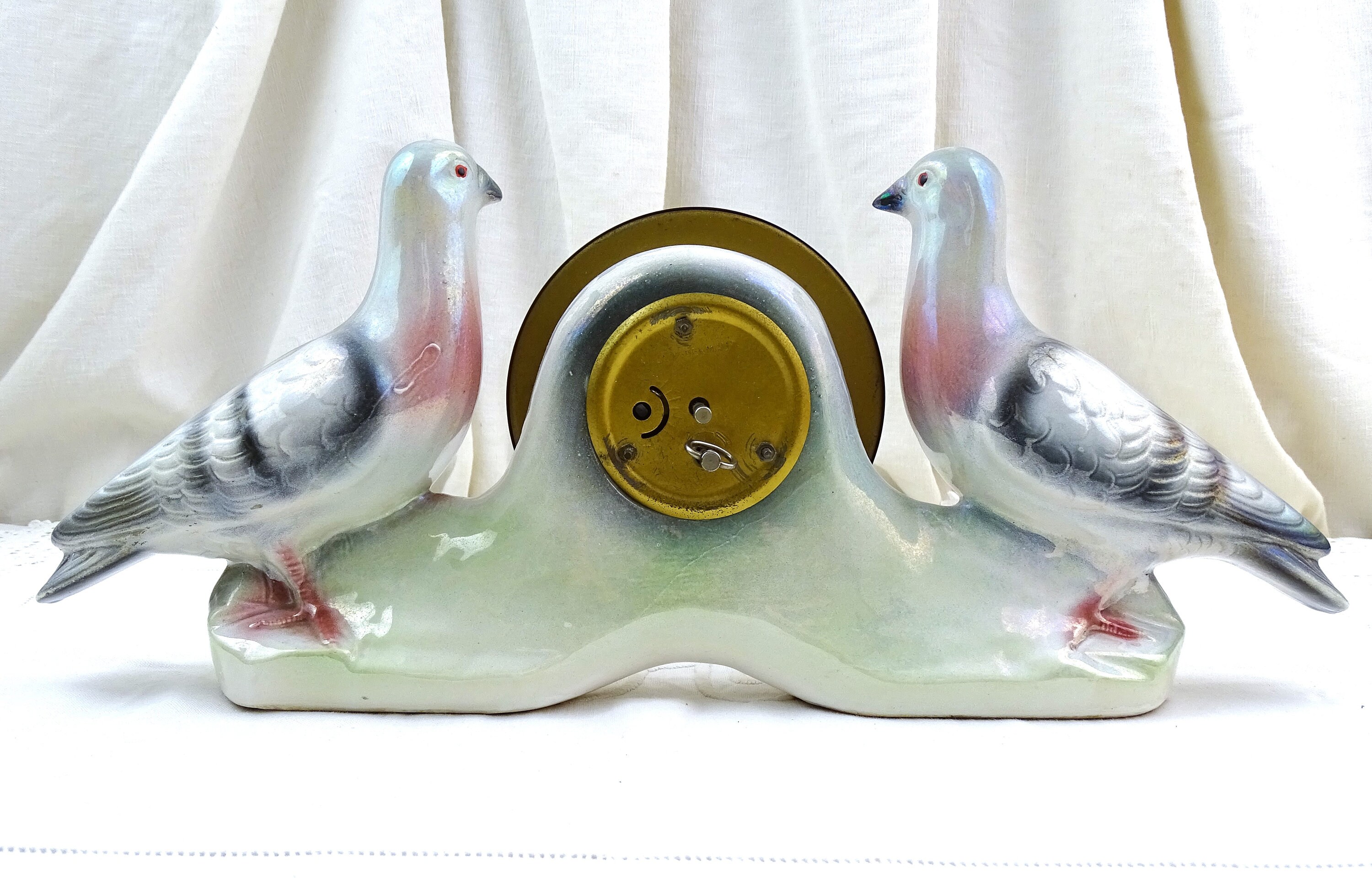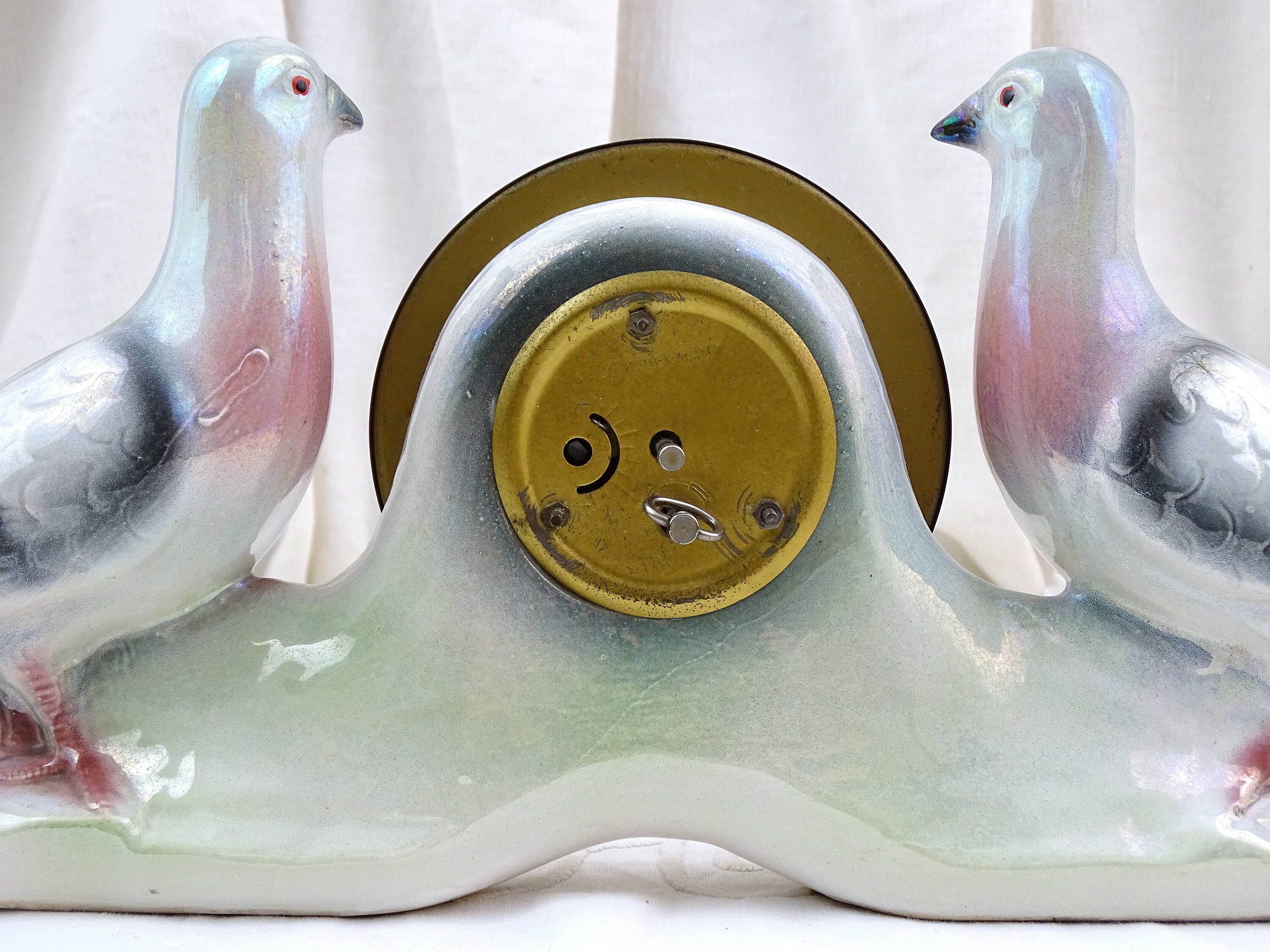 Vintage working mantle clock. Made of luster glazed ceramic by Jema Holland. 2 Pigeons on each side of the central clock face. Ca 1940s / 1950s.