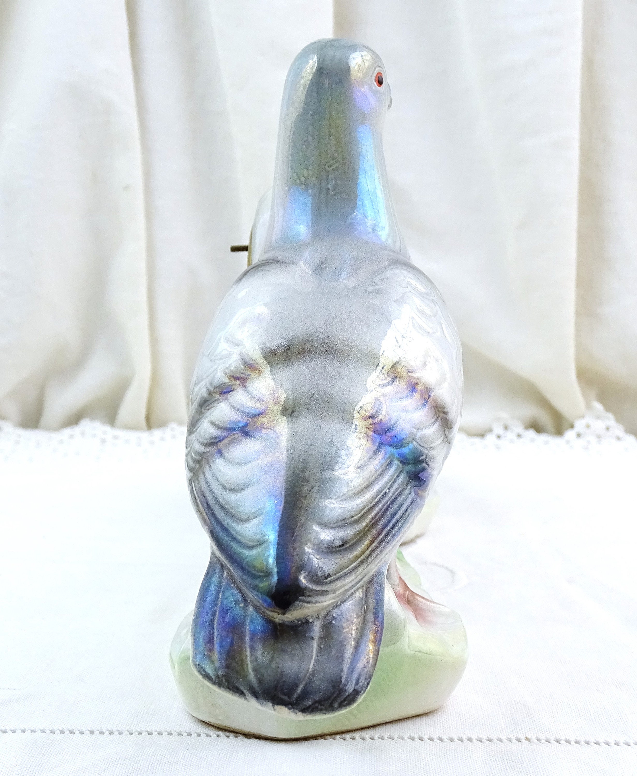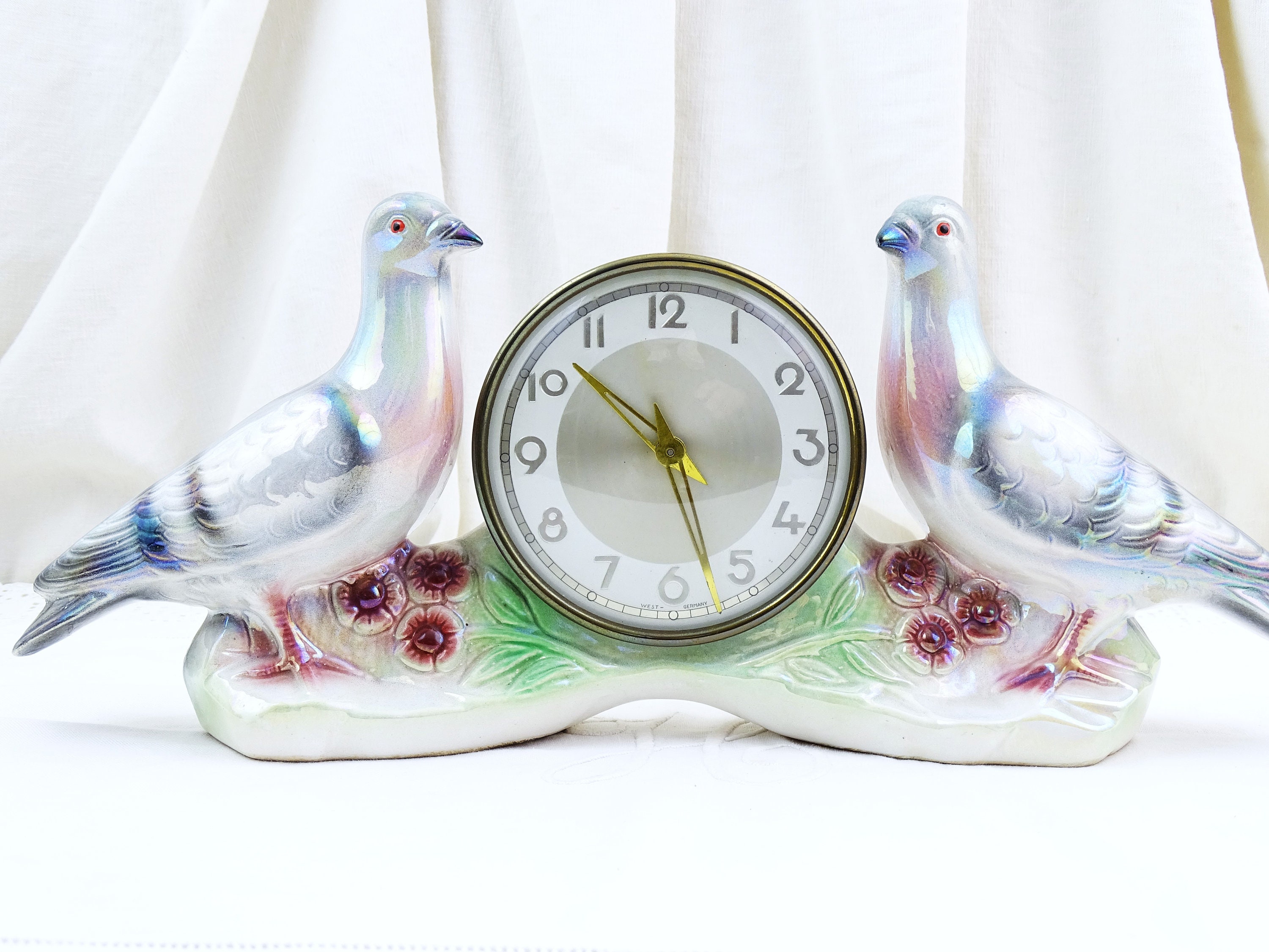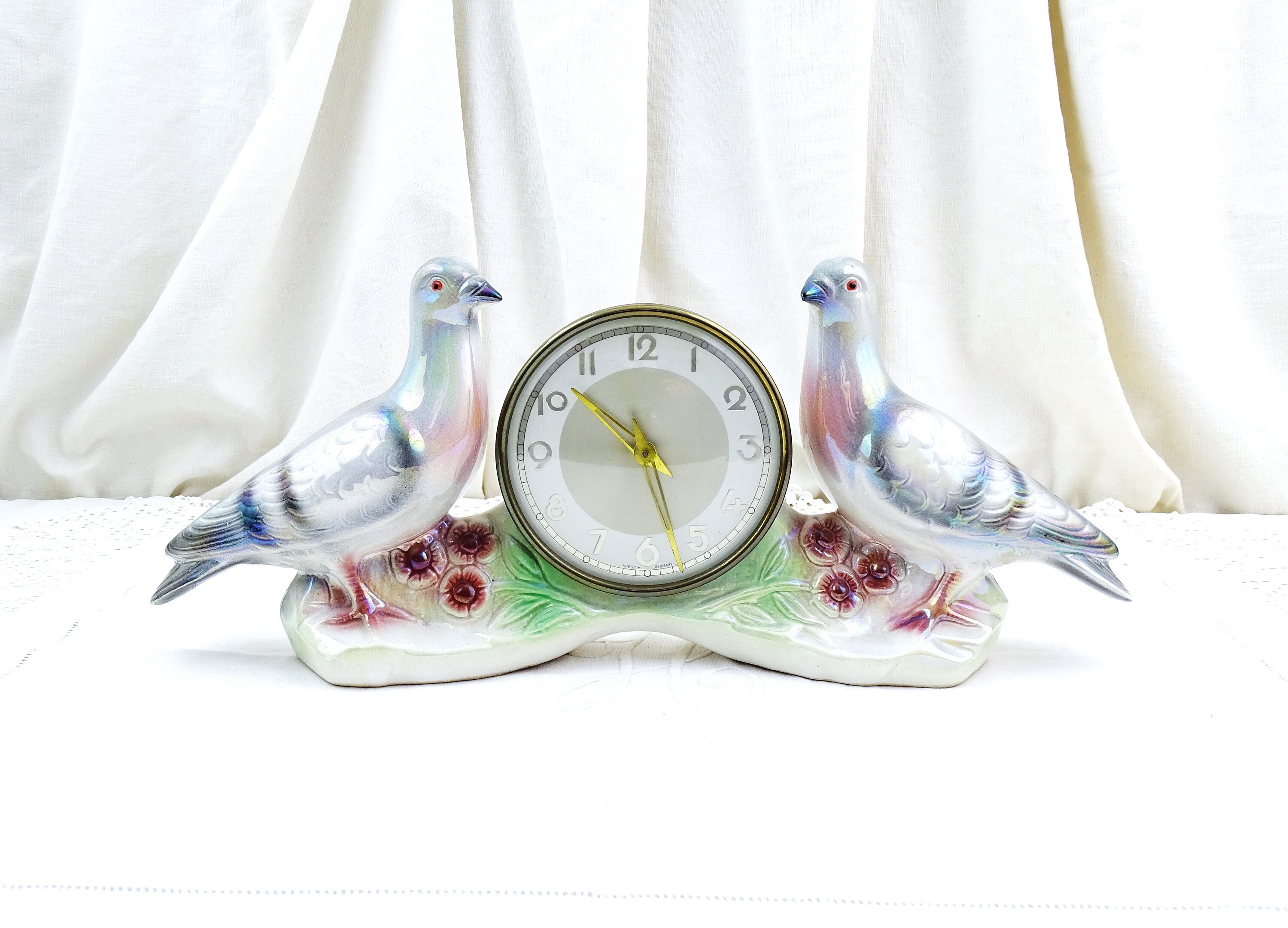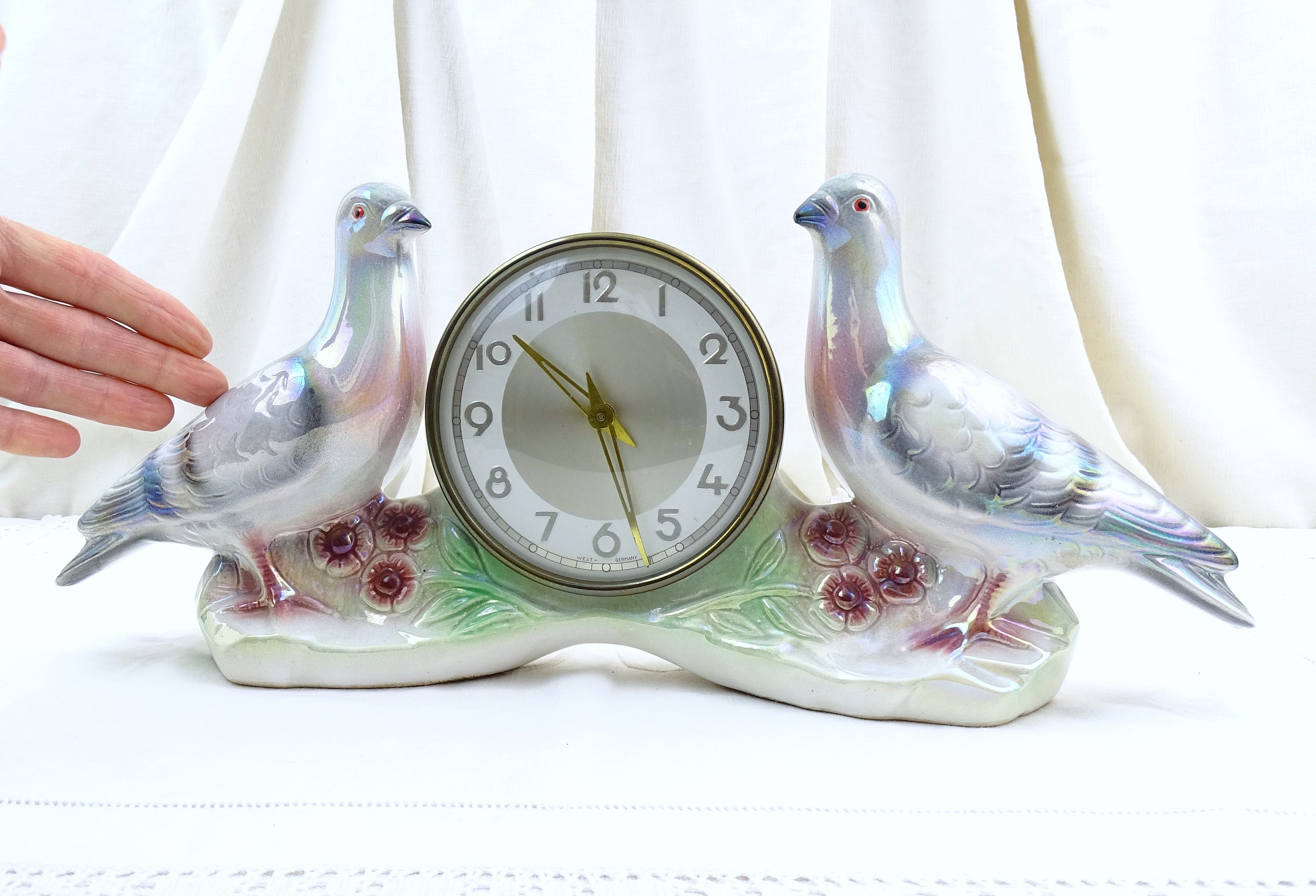 Vintage working mantle clock. Made of luster glazed ceramic by Jema Holland. 2 Pigeons on each side of the central clock face. Ca 1940s / 1950s.